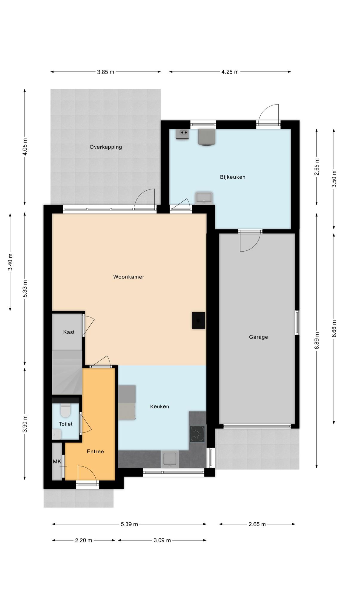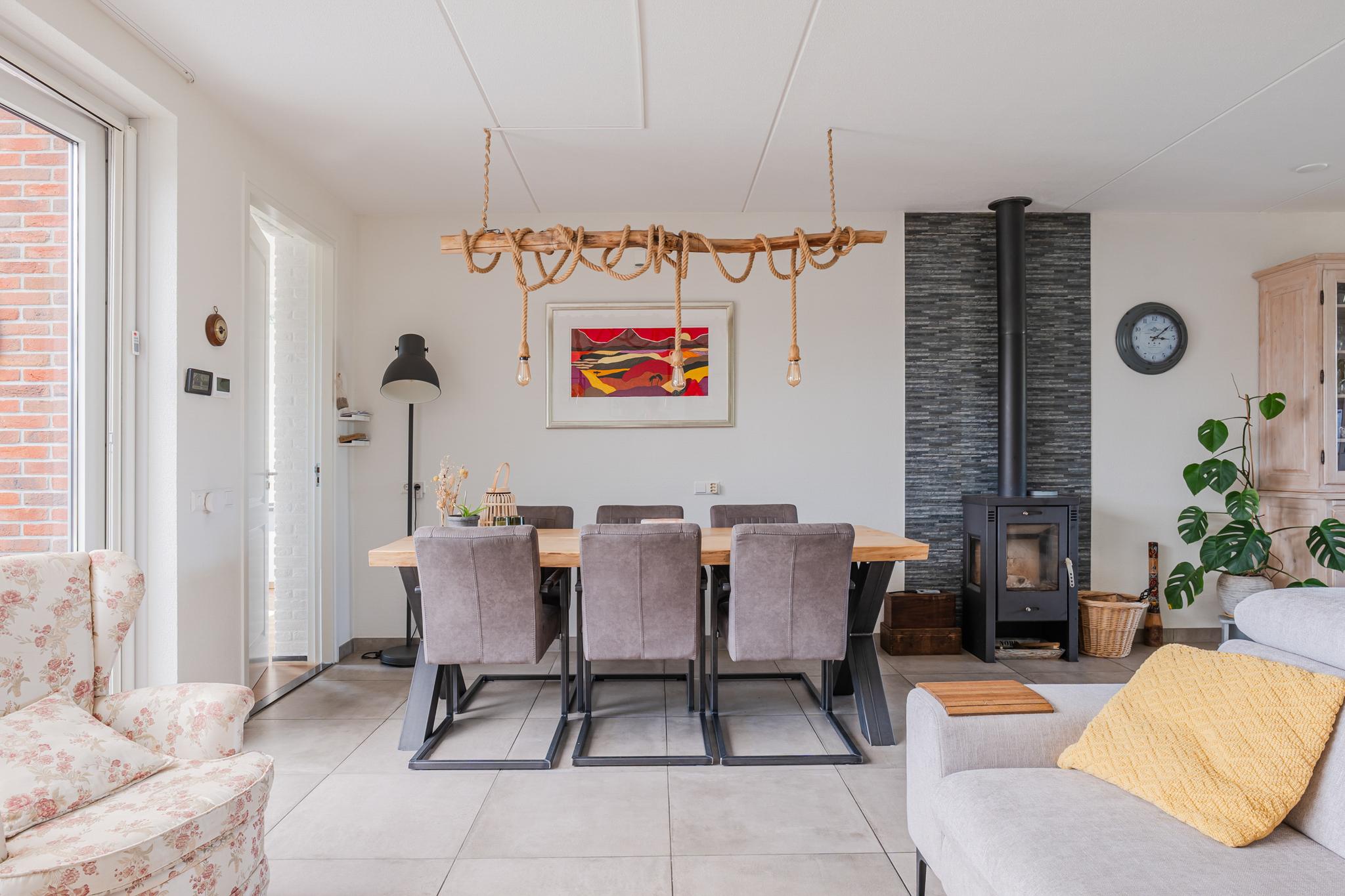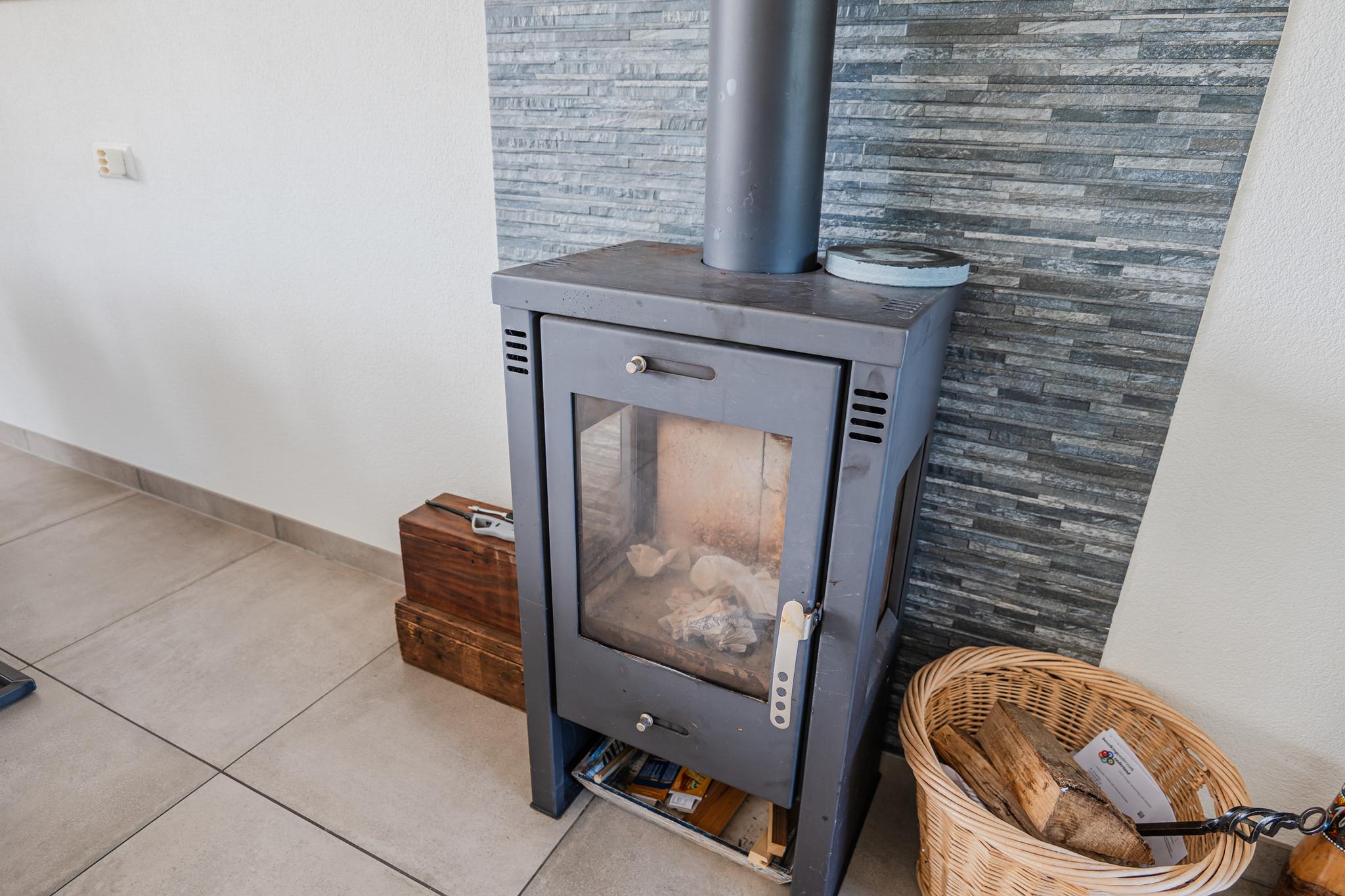 Entree/hal, meterkast, toiletruimte en trapopgang. Ruime woonkamer met veel zonlicht, tuindeur, vloerverwarming, houtkachel, trapkast en open keuken voorzien van al het wenselijk inbouwapparatuur.