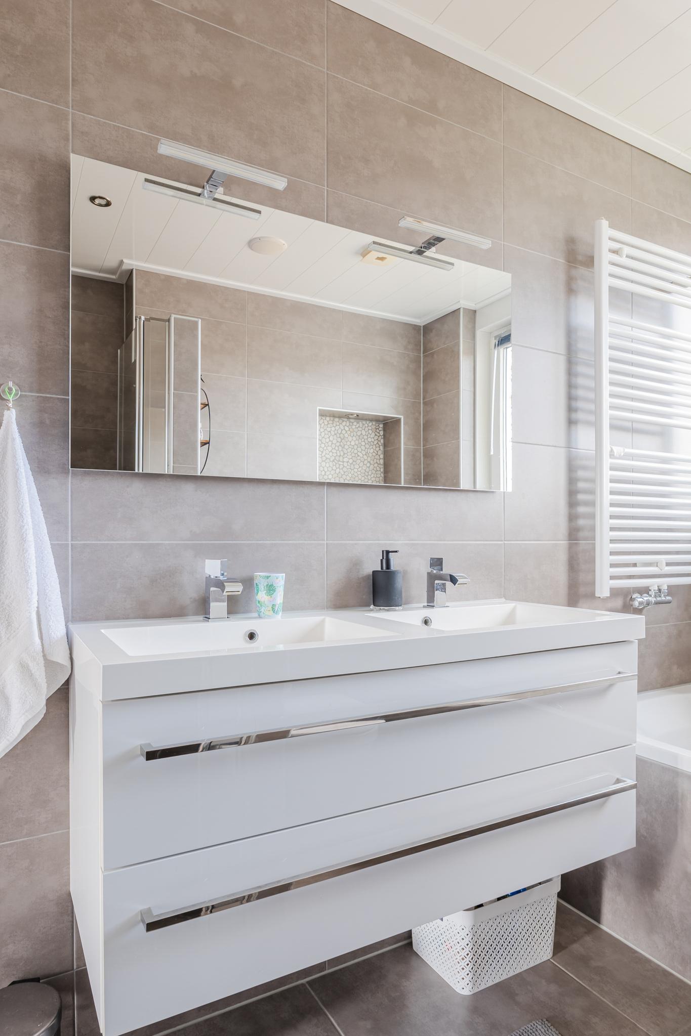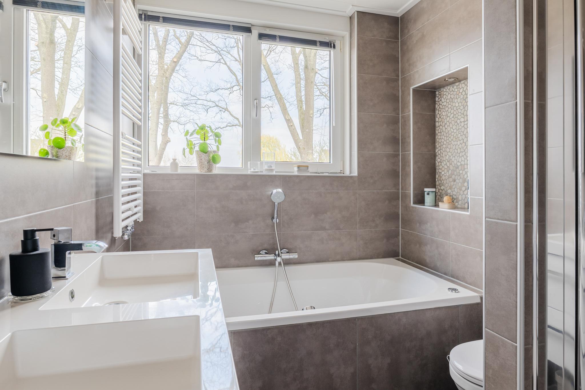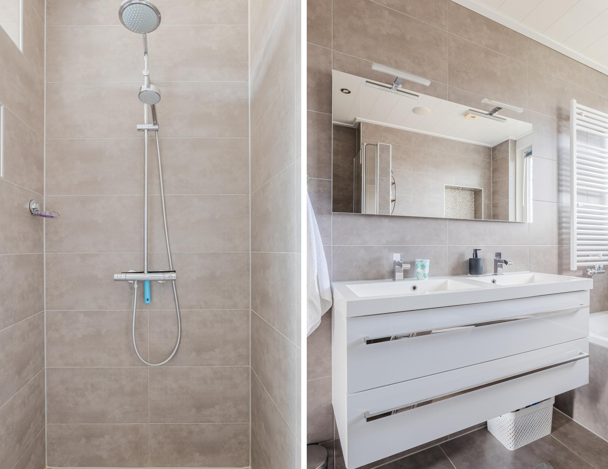 Overloop, drie slaapkamers en een moderne badkamer met inloopdouche, toilet, ligbad en dubbele wastafel.