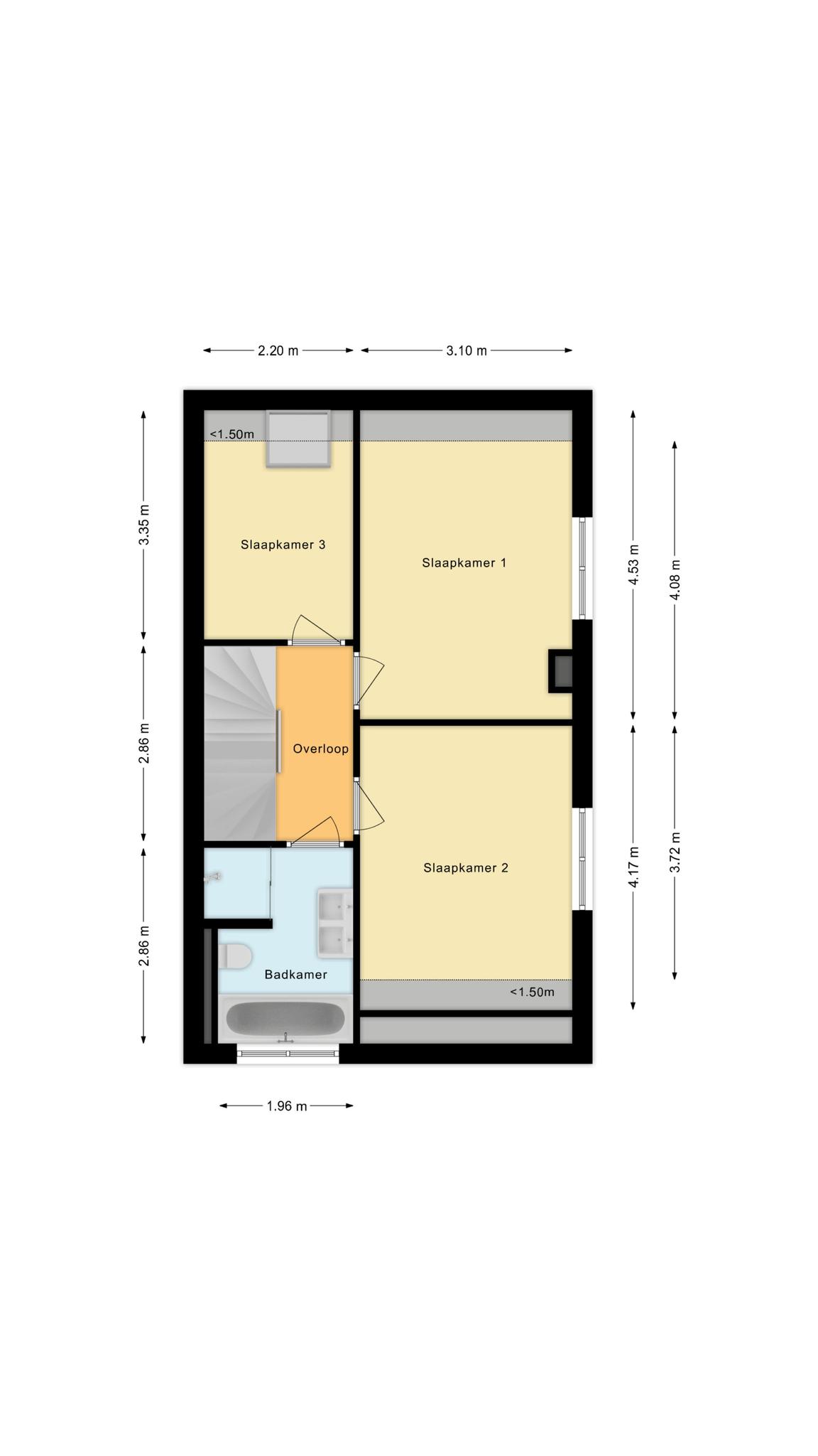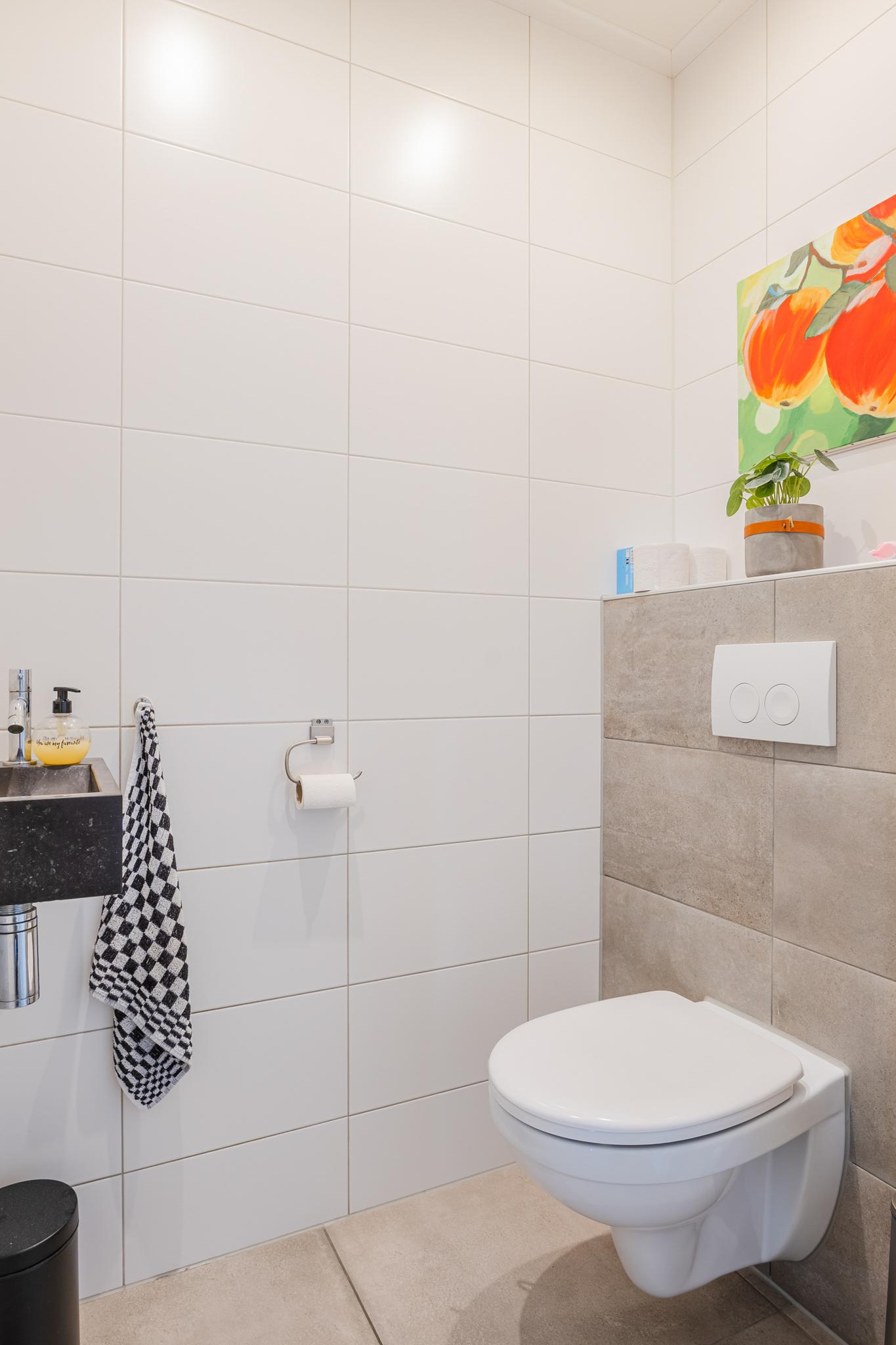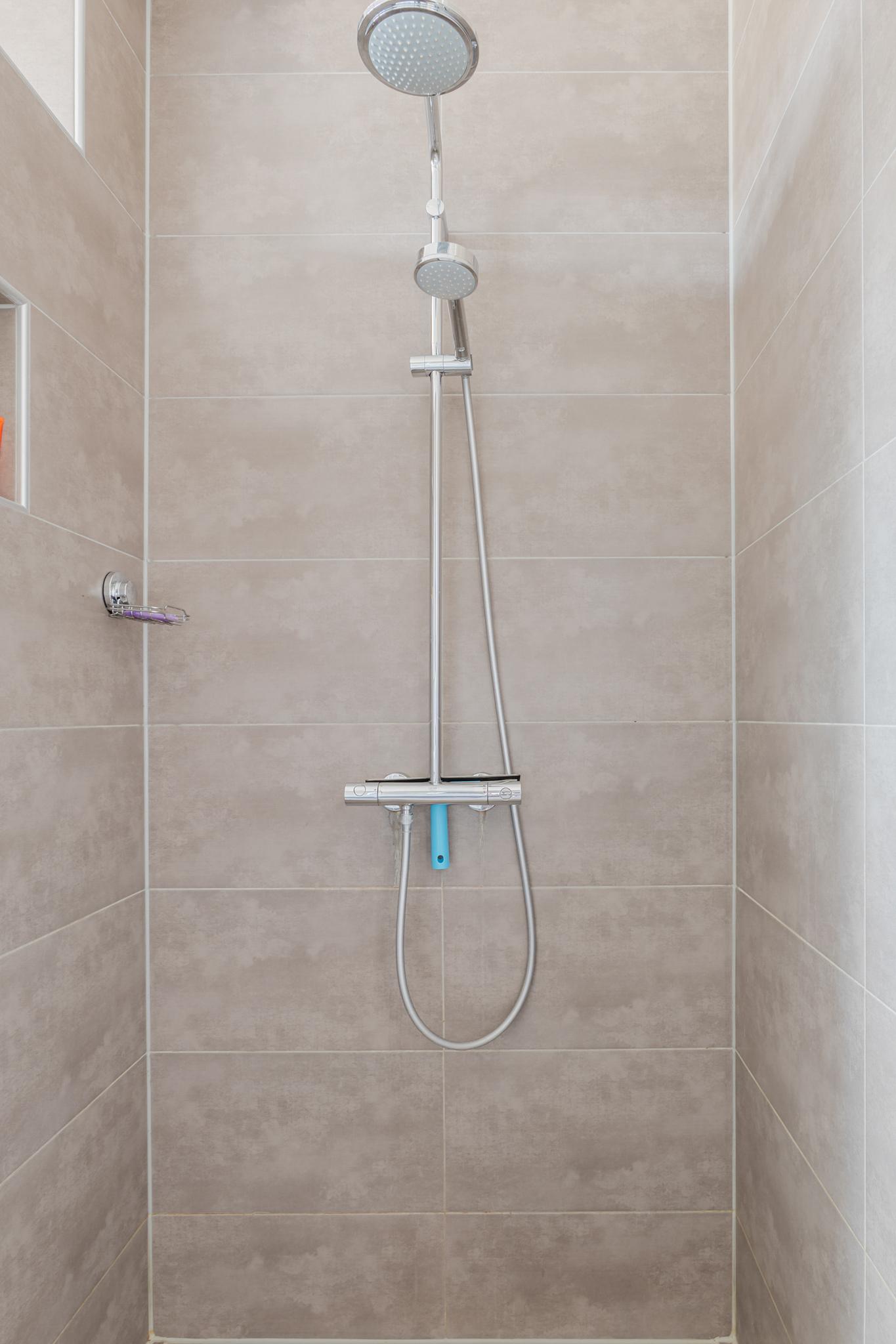 Overloop, drie slaapkamers en een moderne badkamer met inloopdouche, toilet, ligbad en dubbele wastafel.