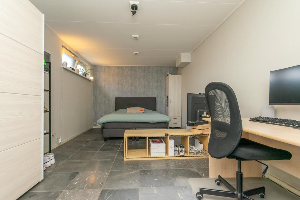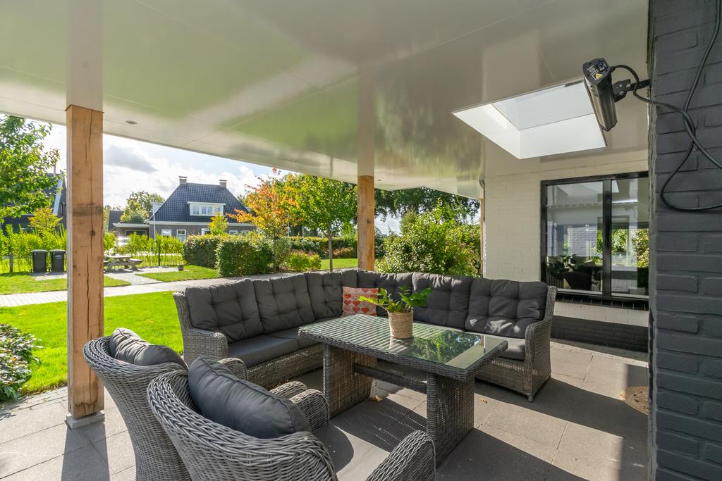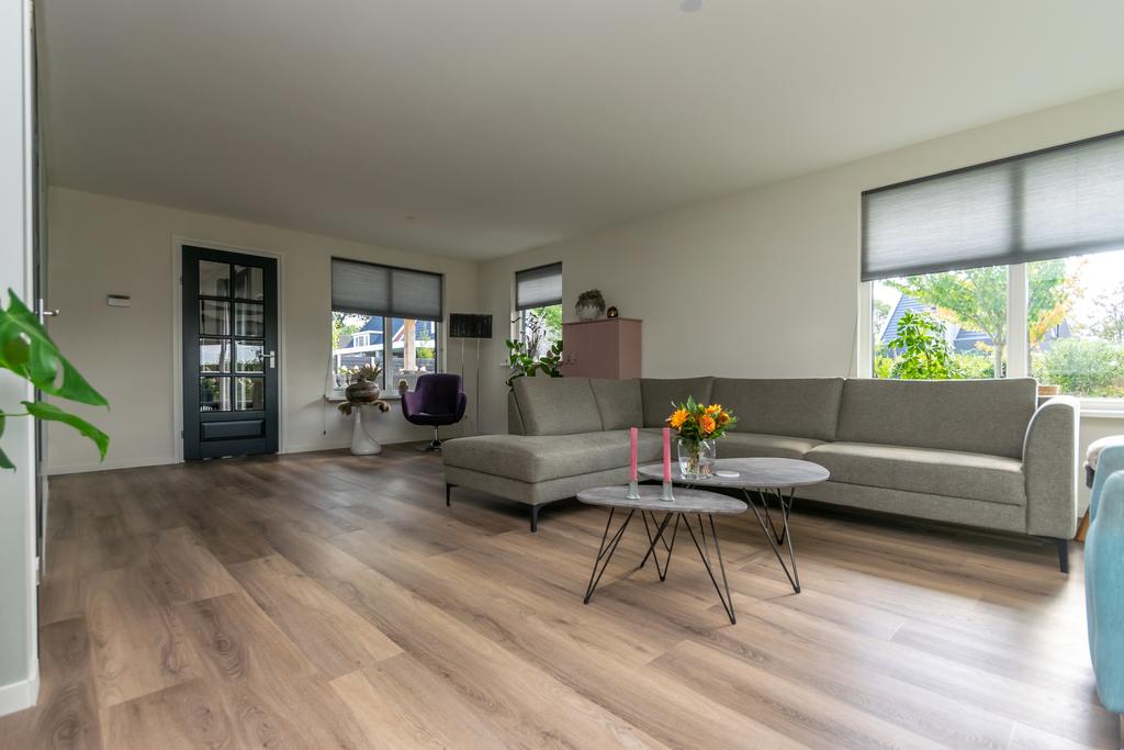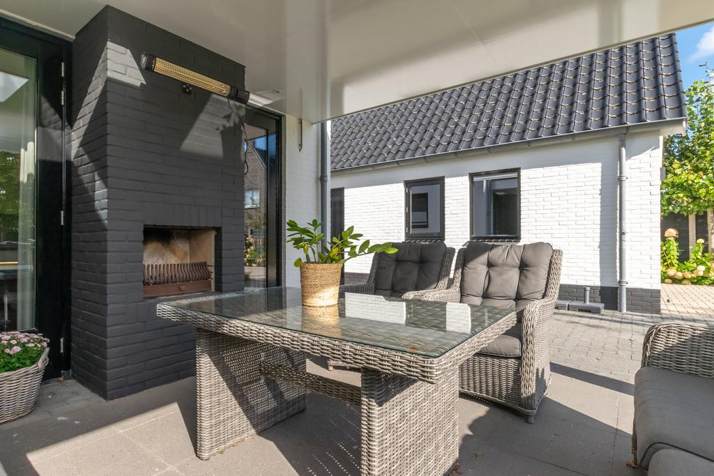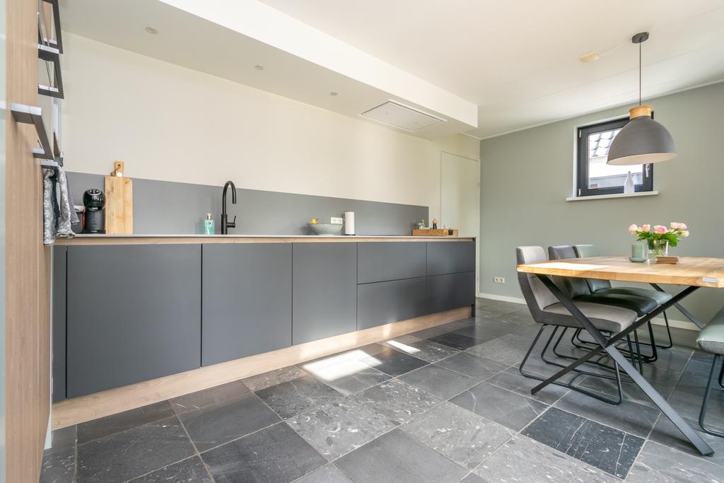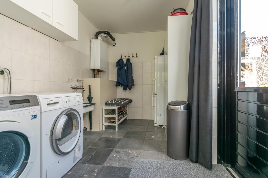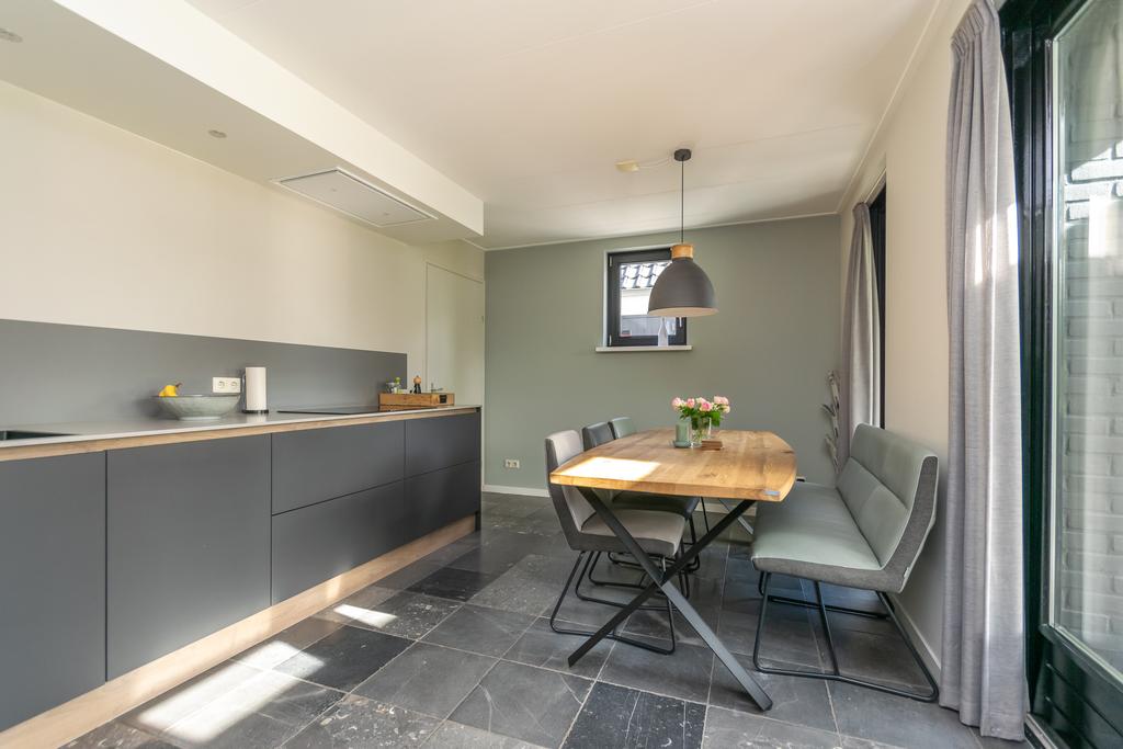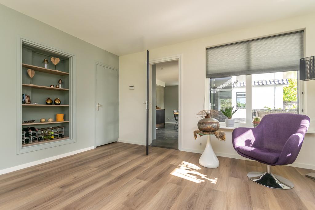 Ruime entree met toilet, kantoorruimte/slaapkamer van circa 20 m², trapopgang naar de verdieping en de meterkast. De woonkamer van circa 36 m² met erker is voorzien van vloerverwarming en een PVC-vloer en een sfeervolle gashaard. De woonkeuken (2020) is voorzien van alle wenselijke inbouwapparatuur zoals, Quooker, 5-pits inductiekookplaat, vaatwasser, combimagnetron met ovenfunctie, koelkast en een vriezer, allen van Siemens/Bosch. Vanuit de keuken kom je in de bijkeuken met witgoedaansluitingen en heb je met dubbele tuindeuren toegang tot het overdekte terras van ca. 26 m² met een buitenhaard.