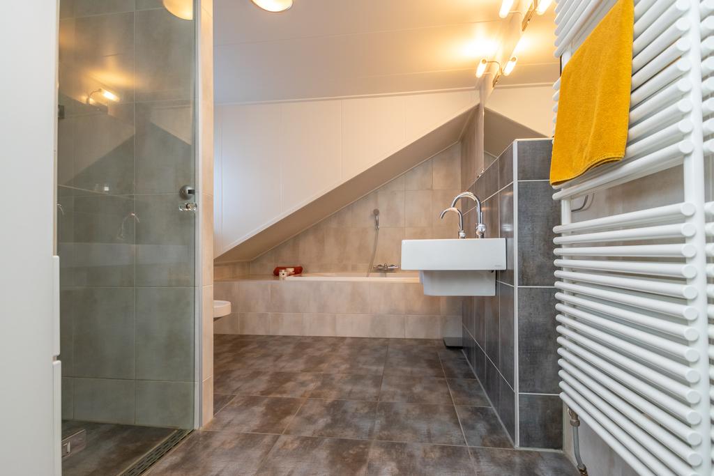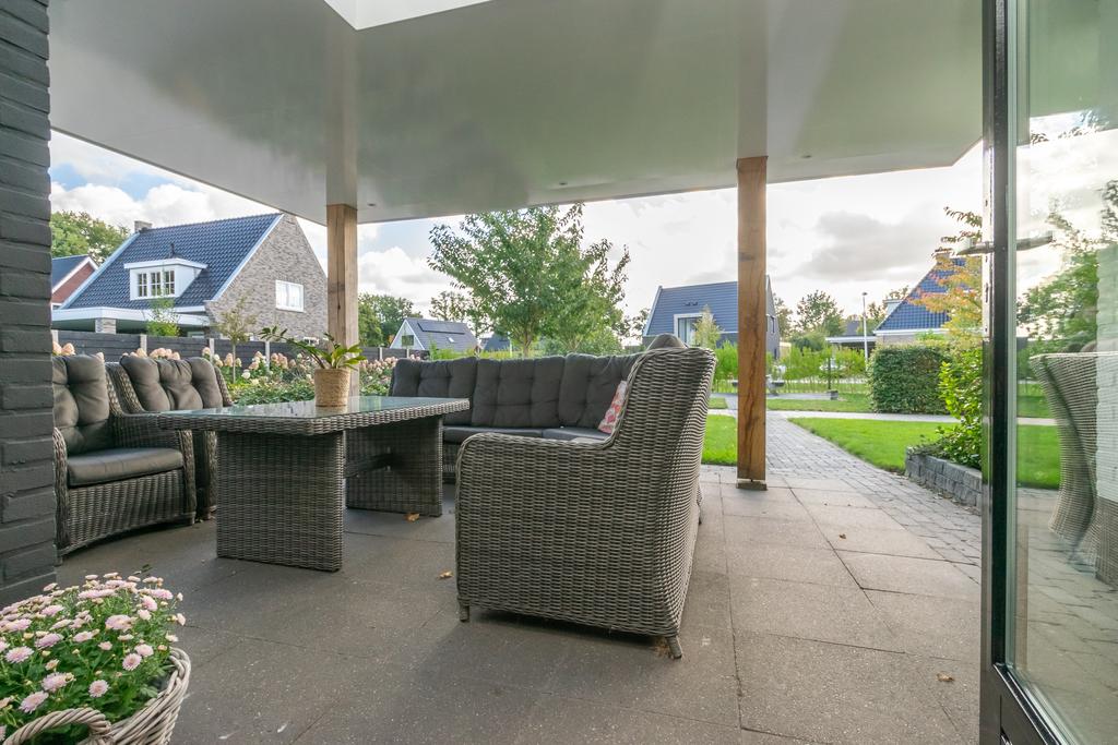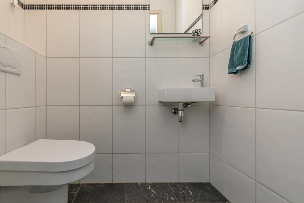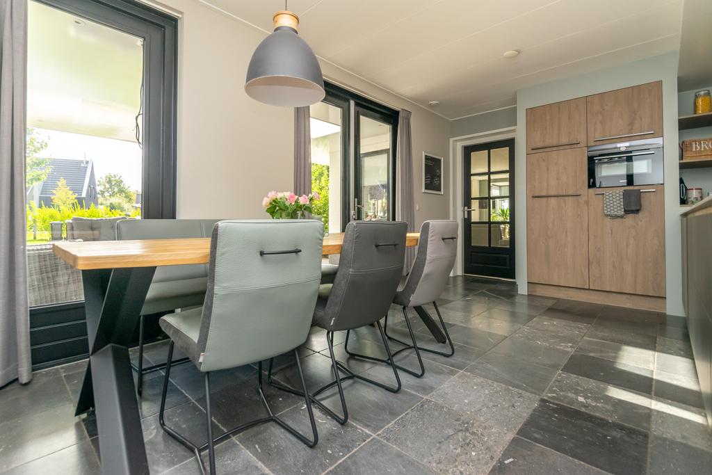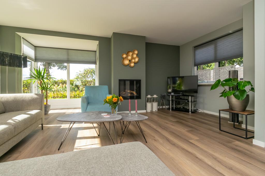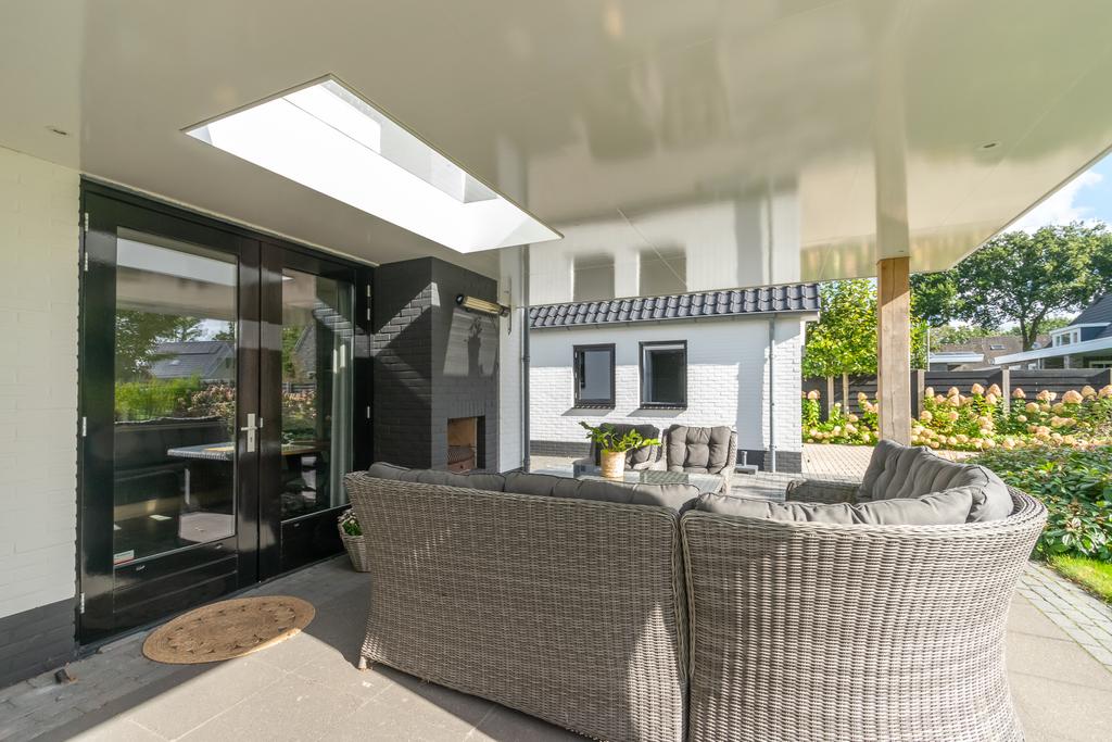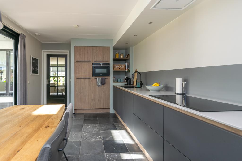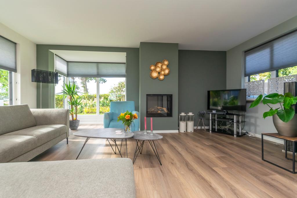Ruime entree met toilet, kantoorruimte/slaapkamer van circa 20 m², trapopgang naar de verdieping en de meterkast. De woonkamer van circa 36 m² met erker is voorzien van vloerverwarming en een PVC-vloer en een sfeervolle gashaard. De woonkeuken (2020) is voorzien van alle wenselijke inbouwapparatuur zoals, Quooker, 5-pits inductiekookplaat, vaatwasser, combimagnetron met ovenfunctie, koelkast en een vriezer, allen van Siemens/Bosch. Vanuit de keuken kom je in de bijkeuken met witgoedaansluitingen en heb je met dubbele tuindeuren toegang tot het overdekte terras van ca. 26 m² met een buitenhaard.