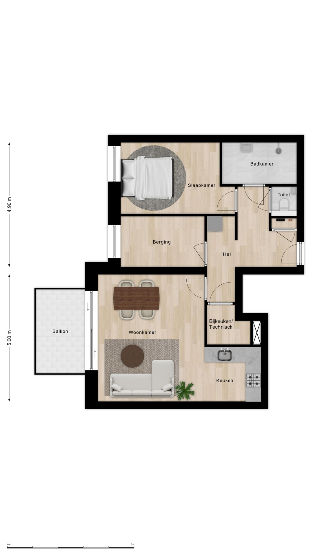 Entree met (separaat) toilet, badkamer, bijkeuken/berging, één slaapkamer, woonkamer, open keuken, technische ruimte en balkon