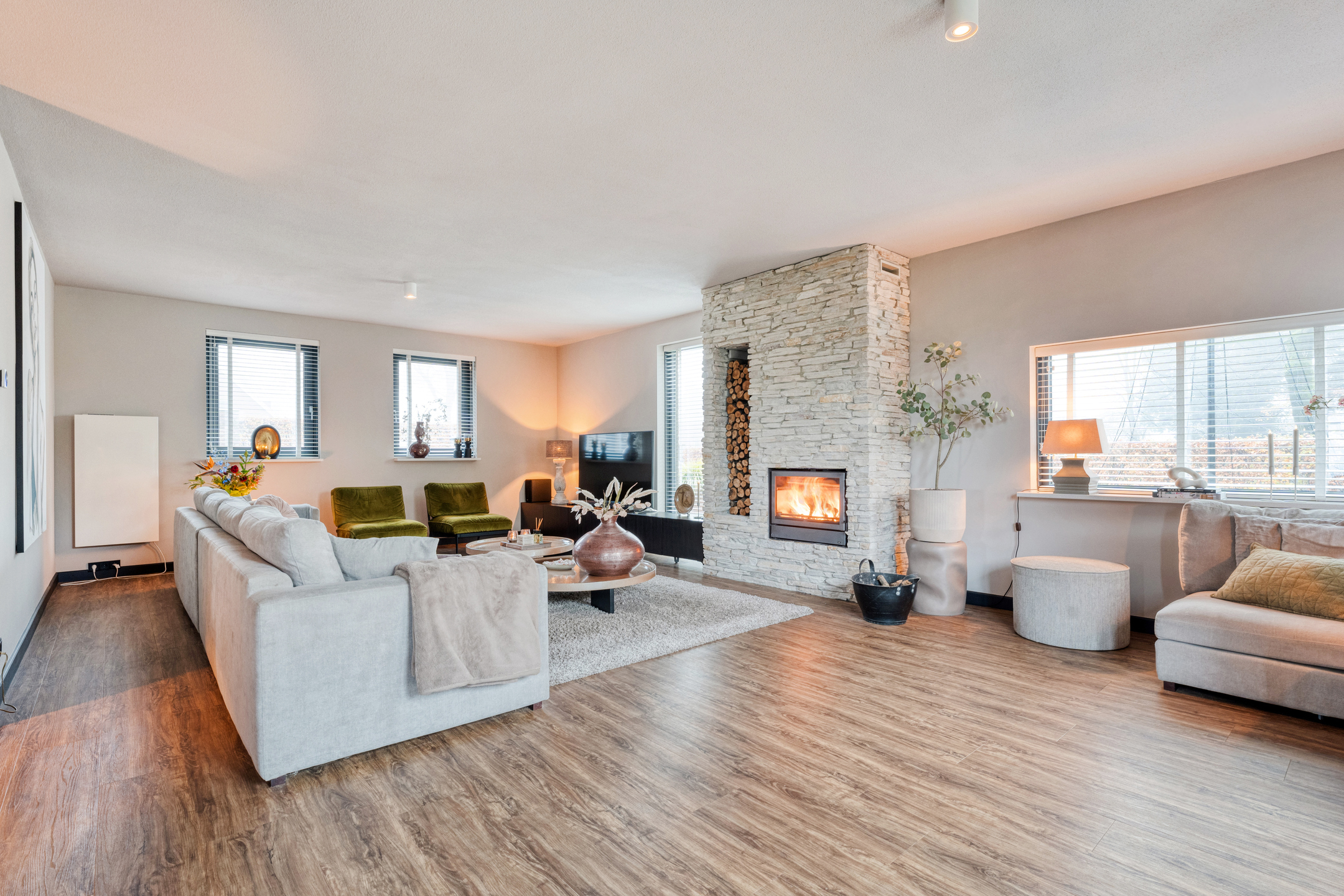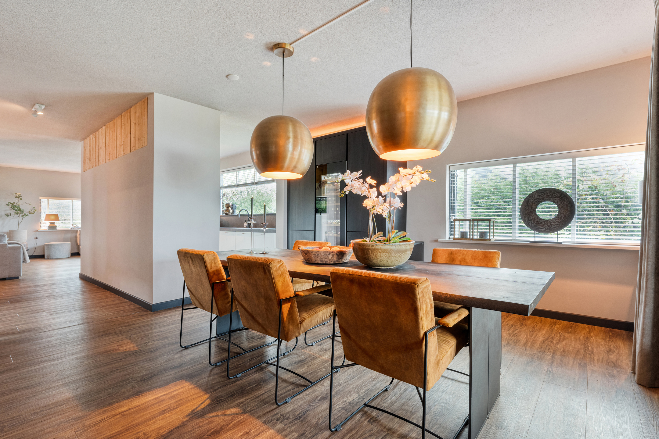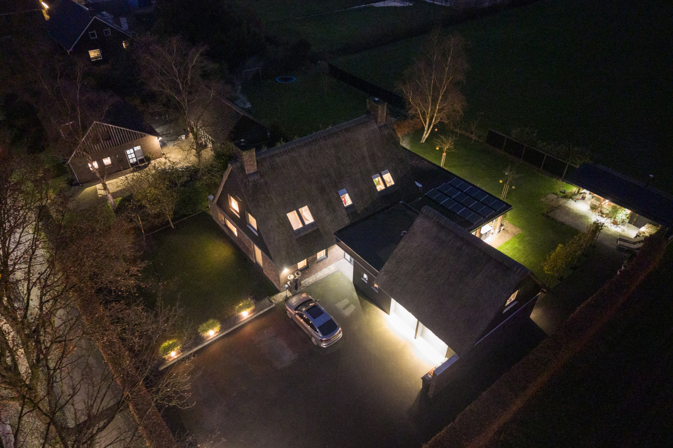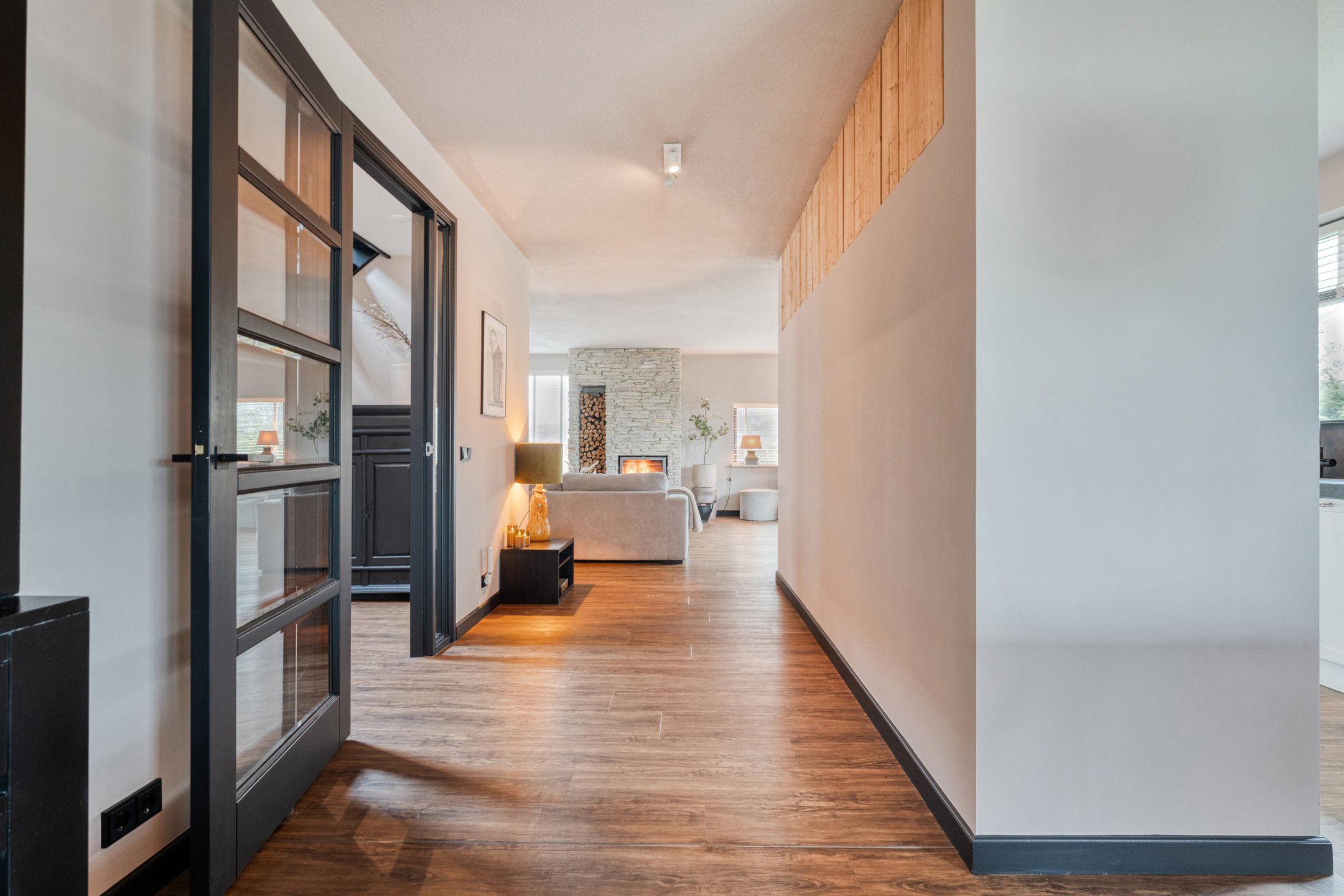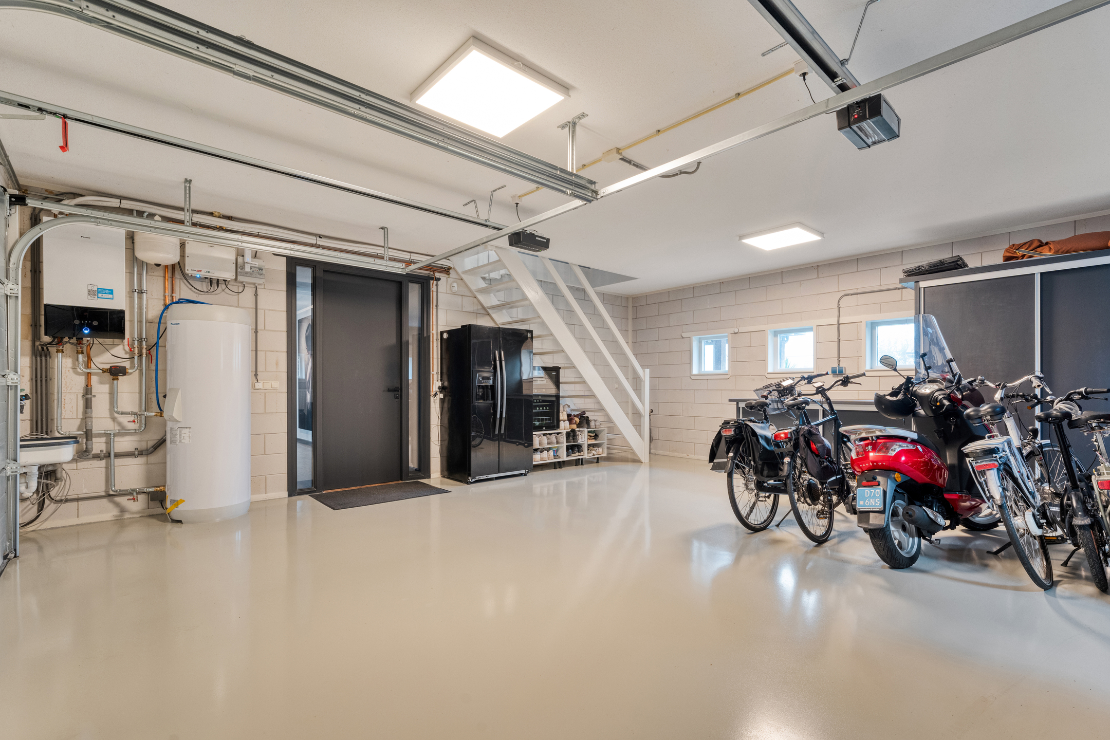 De statige entree straalt direct klasse en elegantie uit. De binnenkomst is ruim en licht, met trapopgang en vide en vormt een stijlvolle opmaat naar de rest van de woning. De sfeervolle woonkamer met houtkachel is een heerlijke plek om te verblijven. Dankzij de vele ramen en de openslaande deuren geniet u van een prachtige lichtinval en zicht op de tuin. Aangrenzend bevindt zich de luxueus uitgevoerde keuken, compleet met o.a.: een Quooker met gekoeld, bruisend én kokend water, 5-pits inductiekookplaat, grote oven, koelkast, vaatwasser, magnetron en een vaste kast met wijnkoeler (96 flessen). Hoogwaardige afwerking tot in detail. Een groot pluspunt is de ruime slaapkamer op de begane grond, met direct daarnaast de moderne en comfortabele badkamer met o.a. een royale inloopdouche, dubbele wastafel, ligbad en een toilet. Hiermee is de woning uitstekend geschikt voor zowel gezinnen als levensloopbestendig wonen. Daarnaast bevindt zich op de begane grond een luxe afgewerkte bijkeuken/wasruimte, voorzien van een keukenblok en boiler. De ruime garage is voorzien van dubbele elektrische deuren en een prachtige epoxy vloer (2025). Via een vaste trap bereikt u de royale zolderverdieping van de garage: momenteel in gebruik als werkkamer met airconditioning. Maar uitstekend geschikt voor extra slaapkamers, studioruimte of een thuiswerkplek.