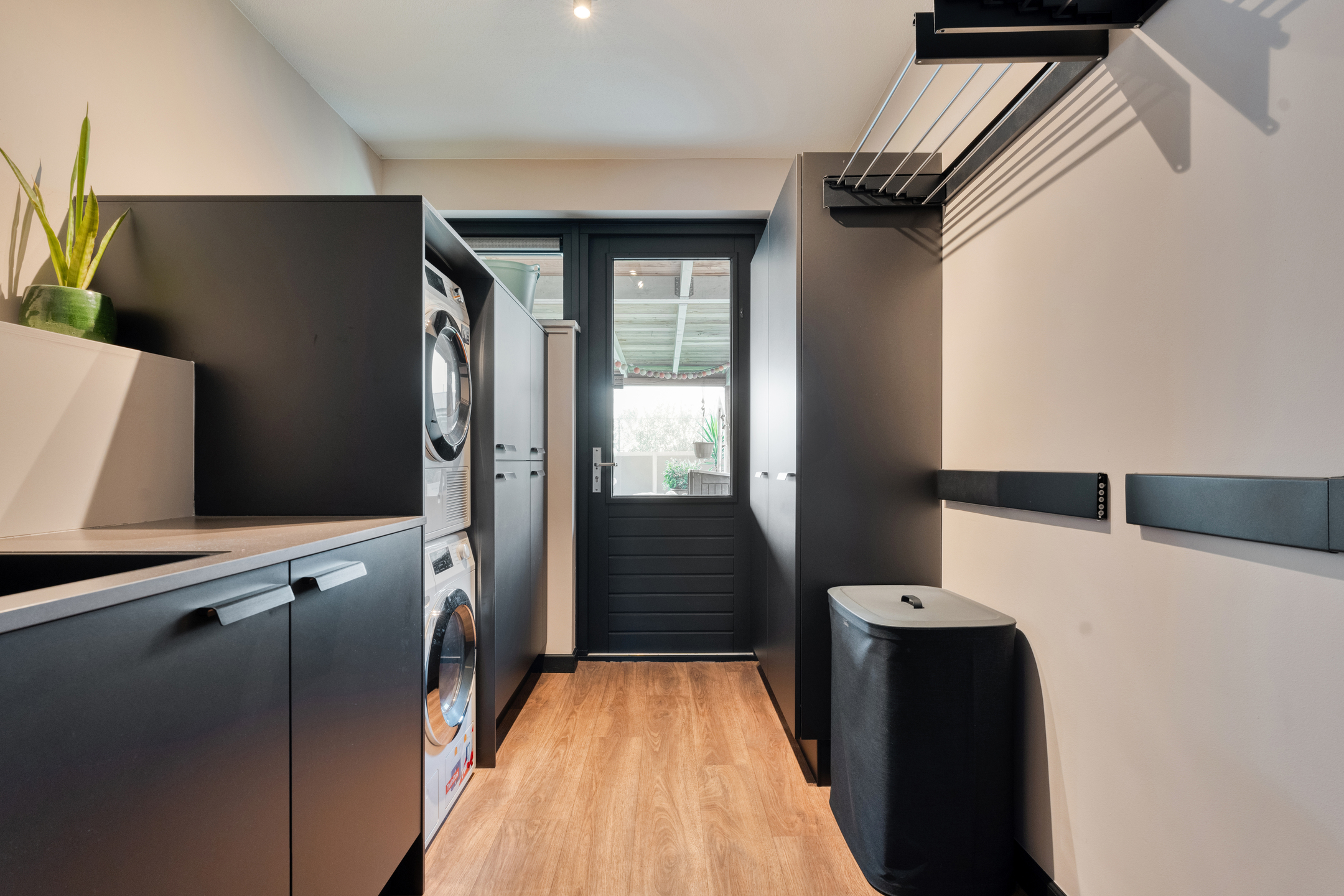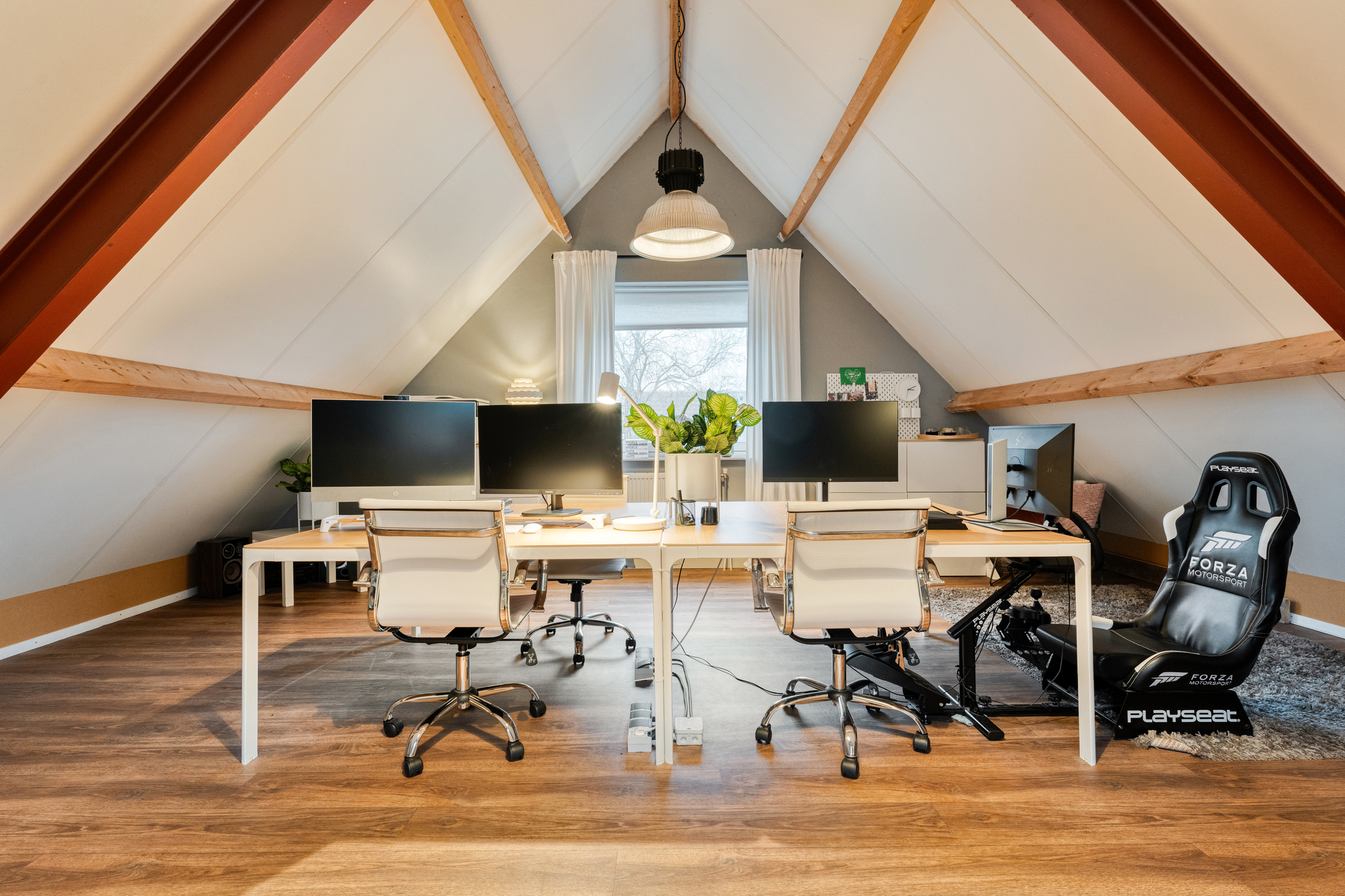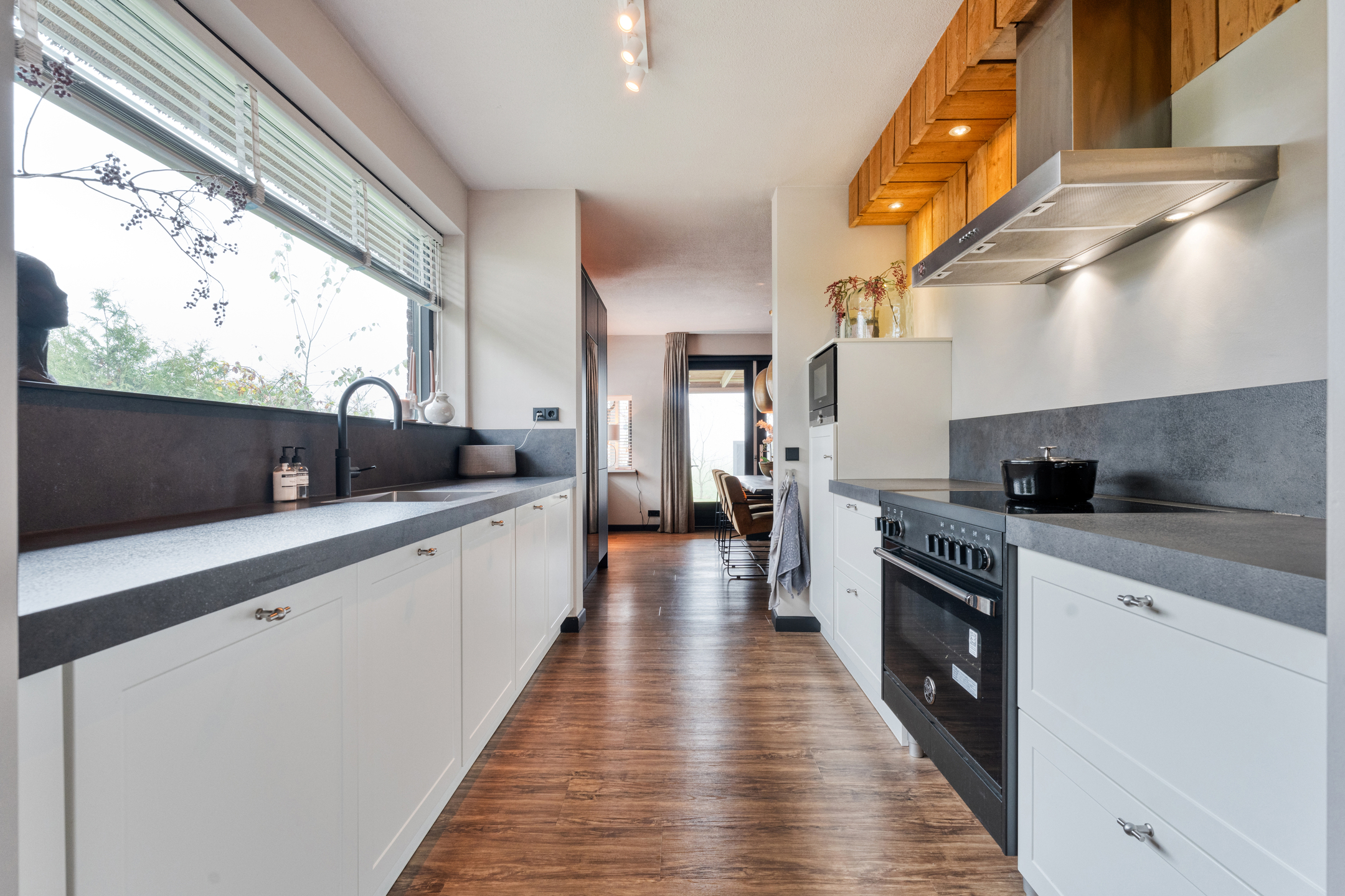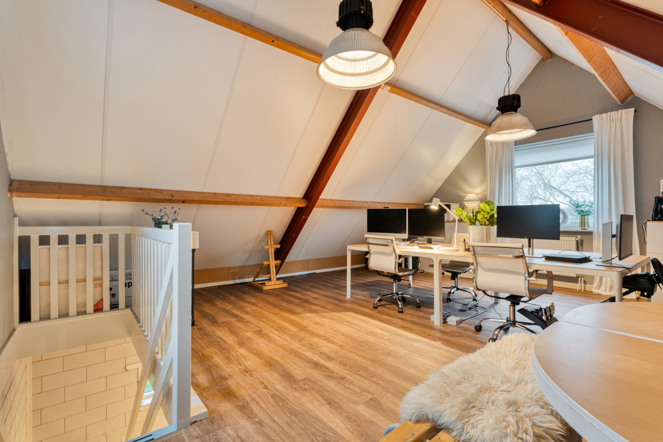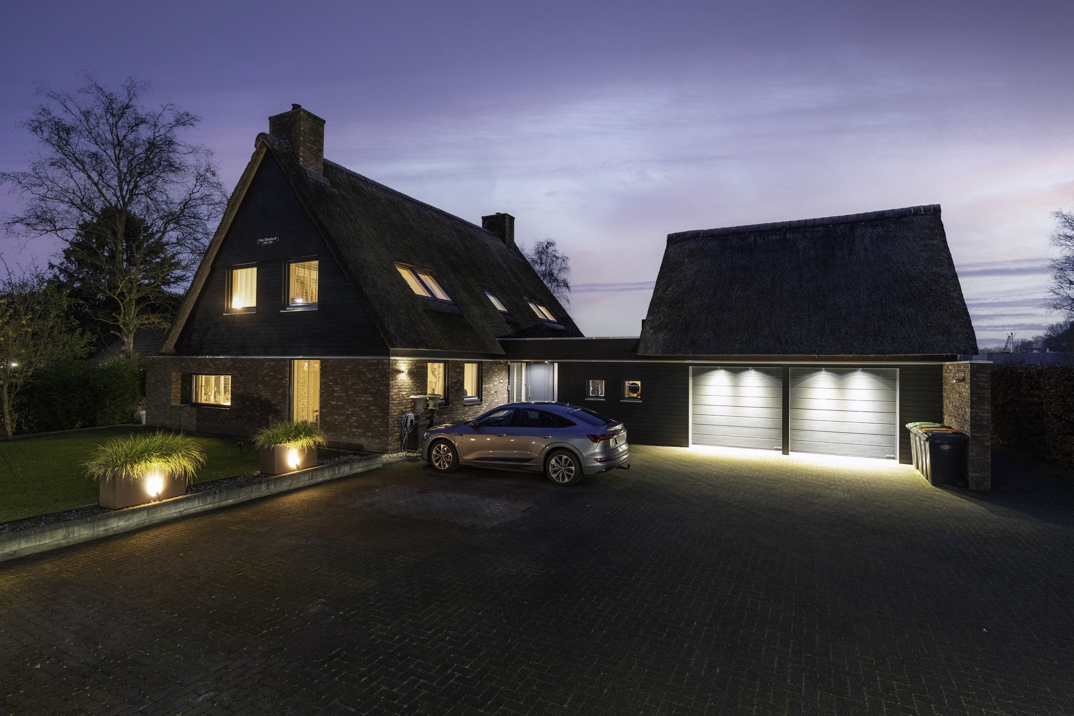 De statige entree straalt direct klasse en elegantie uit. De binnenkomst is ruim en licht, met trapopgang en vide en vormt een stijlvolle opmaat naar de rest van de woning. De sfeervolle woonkamer met houtkachel is een heerlijke plek om te verblijven. Dankzij de vele ramen en de openslaande deuren geniet u van een prachtige lichtinval en zicht op de tuin. Aangrenzend bevindt zich de luxueus uitgevoerde keuken, compleet met o.a.: een Quooker met gekoeld, bruisend én kokend water, 5-pits inductiekookplaat, grote oven, koelkast, vaatwasser, magnetron en een vaste kast met wijnkoeler (96 flessen). Hoogwaardige afwerking tot in detail. Een groot pluspunt is de ruime slaapkamer op de begane grond, met direct daarnaast de moderne en comfortabele badkamer met o.a. een royale inloopdouche, dubbele wastafel, ligbad en een toilet. Hiermee is de woning uitstekend geschikt voor zowel gezinnen als levensloopbestendig wonen. Daarnaast bevindt zich op de begane grond een luxe afgewerkte bijkeuken/wasruimte, voorzien van een keukenblok en boiler. De ruime garage is voorzien van dubbele elektrische deuren en een prachtige epoxy vloer (2025). Via een vaste trap bereikt u de royale zolderverdieping van de garage: momenteel in gebruik als werkkamer met airconditioning. Maar uitstekend geschikt voor extra slaapkamers, studioruimte of een thuiswerkplek.