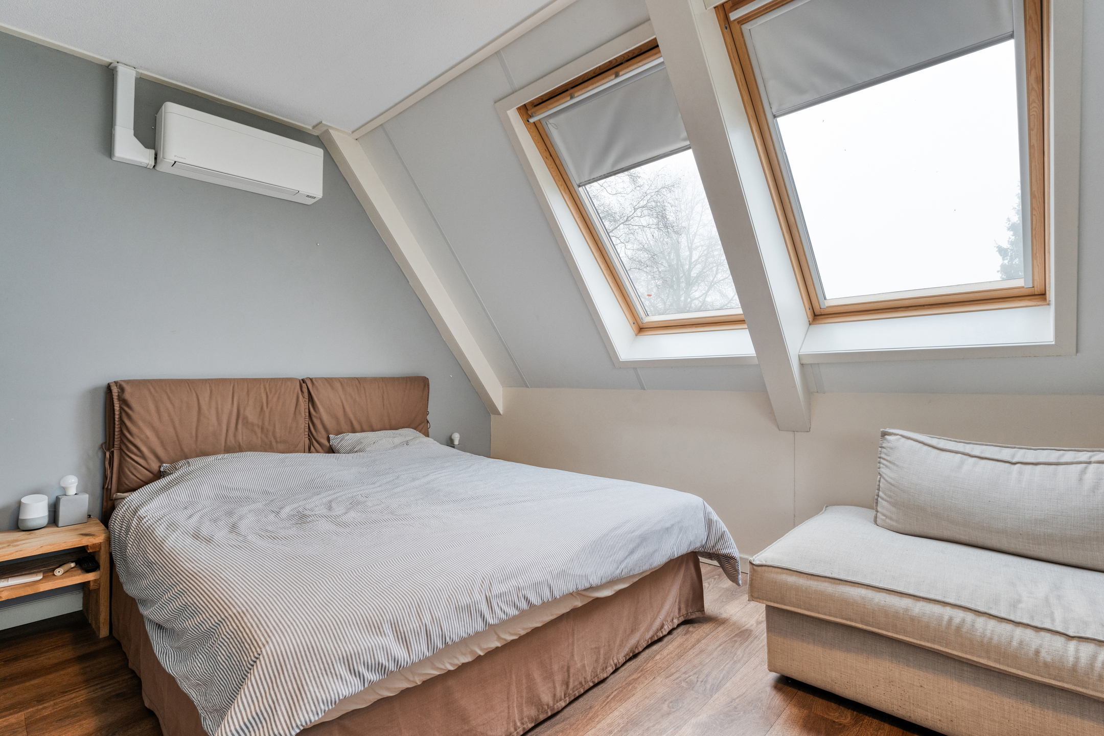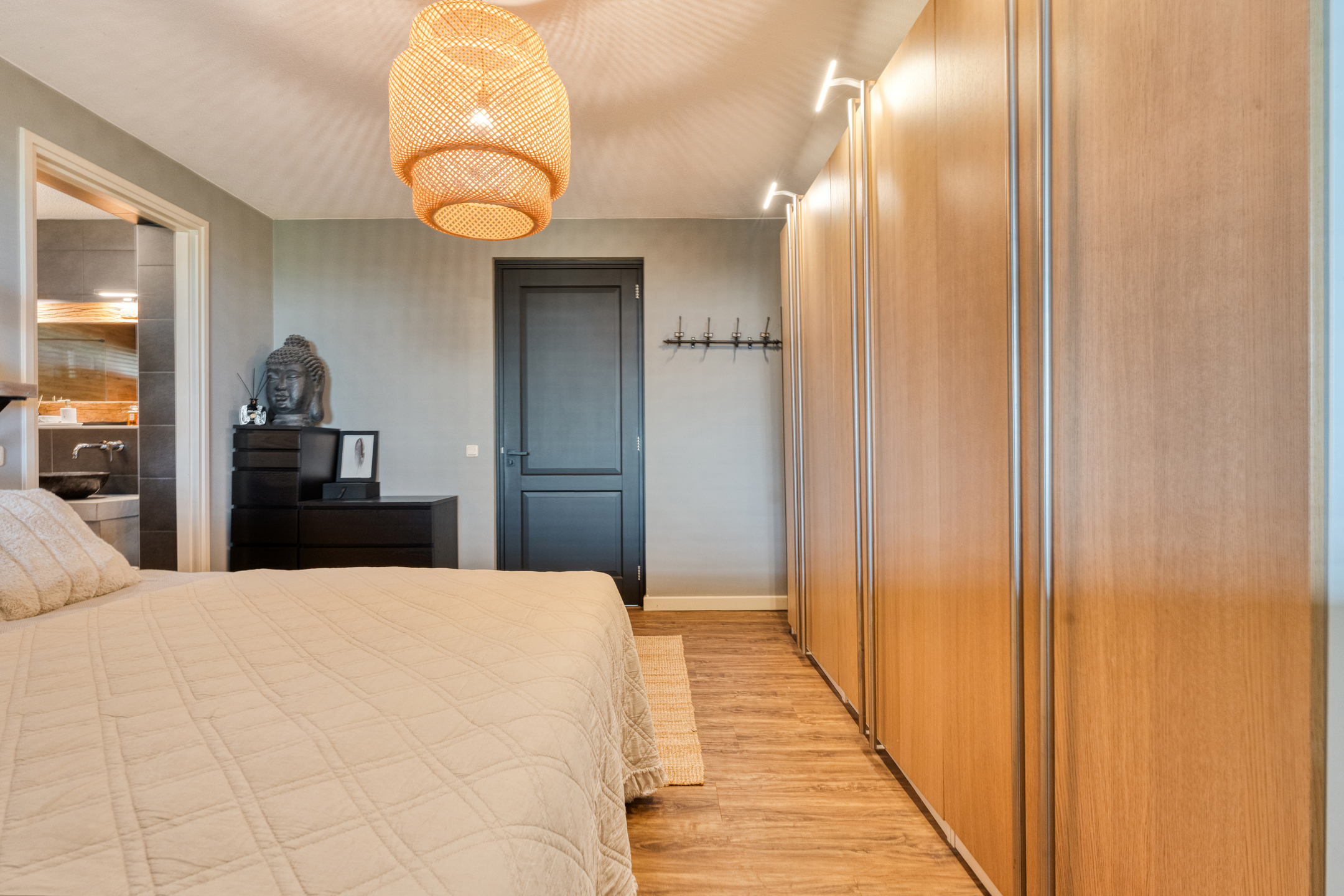 Op de eerste verdieping bevinden zich drie ruime slaapkamers met airconditioning en de mogelijkheid om eenvoudig een vierde slaapkamer te creëren. Via de overloop is de vlizotrap bereikbaar naar de tweede verdieping, waar zich veel bergruimte bevindt. De badkamer op de eerste verdieping is ook luxe uitgevoerd met een inloopdouche, dubbele wastafel en toilet.