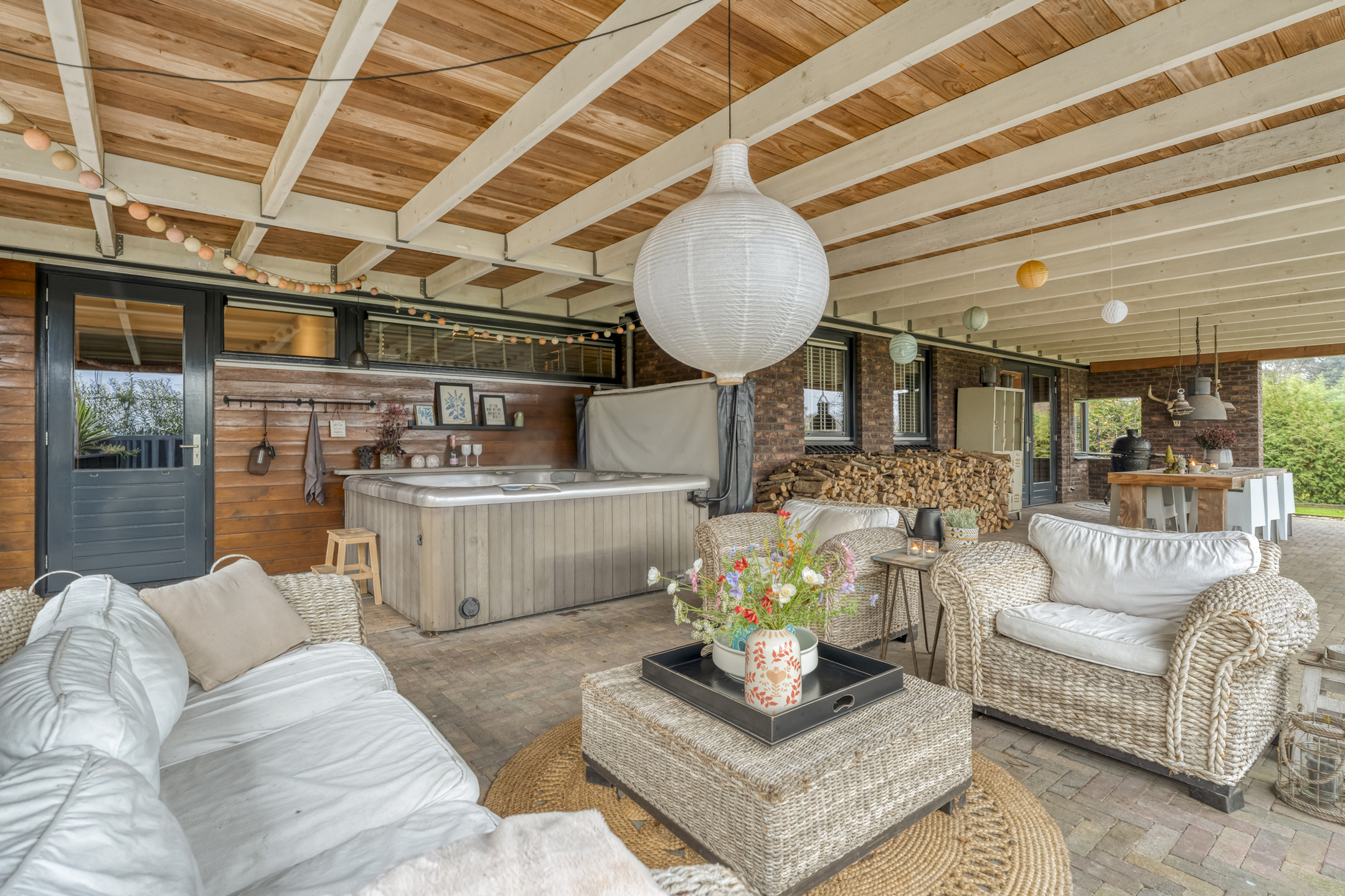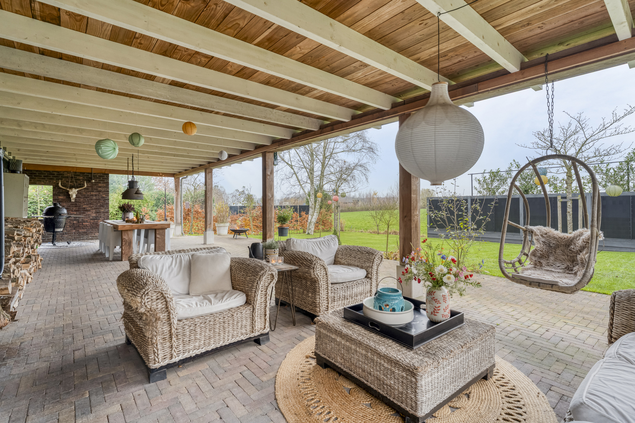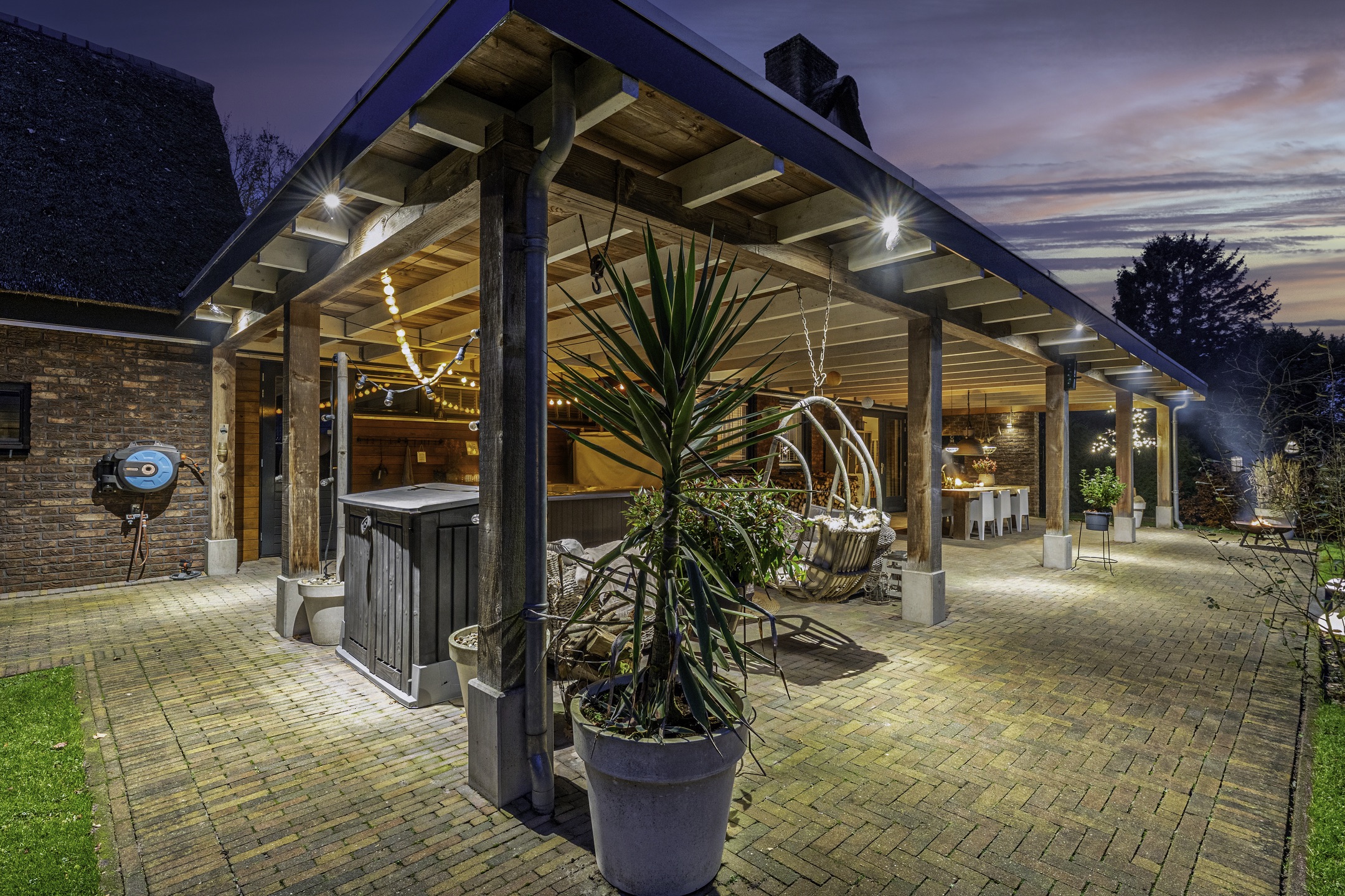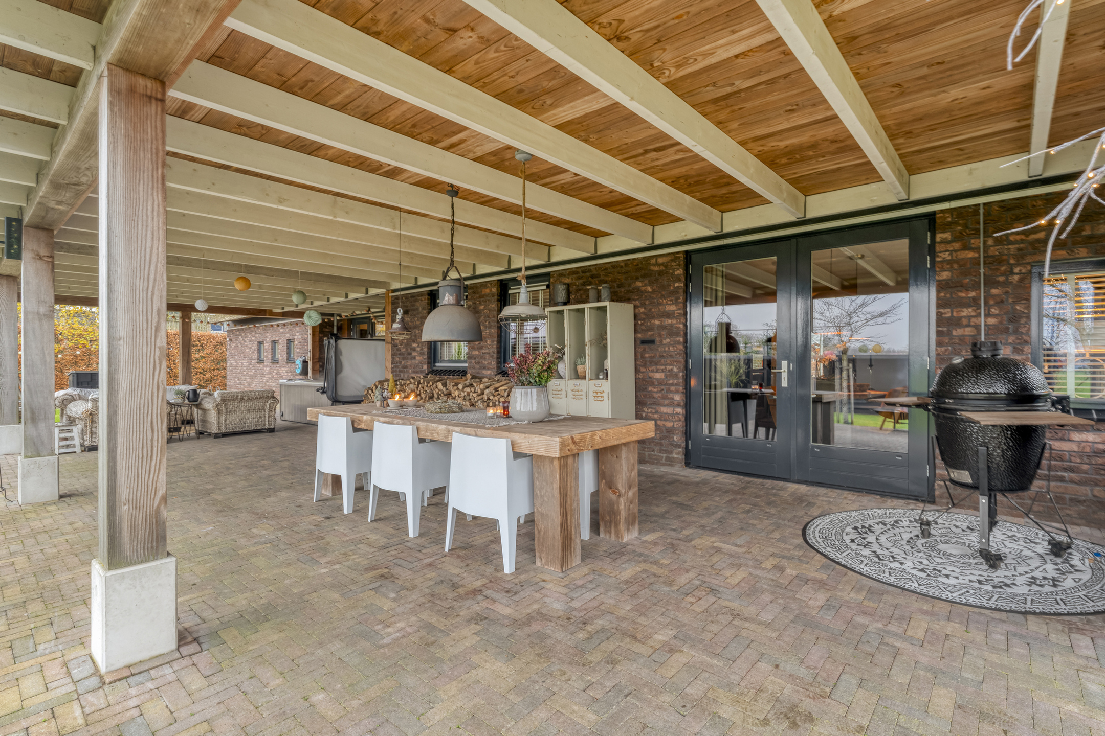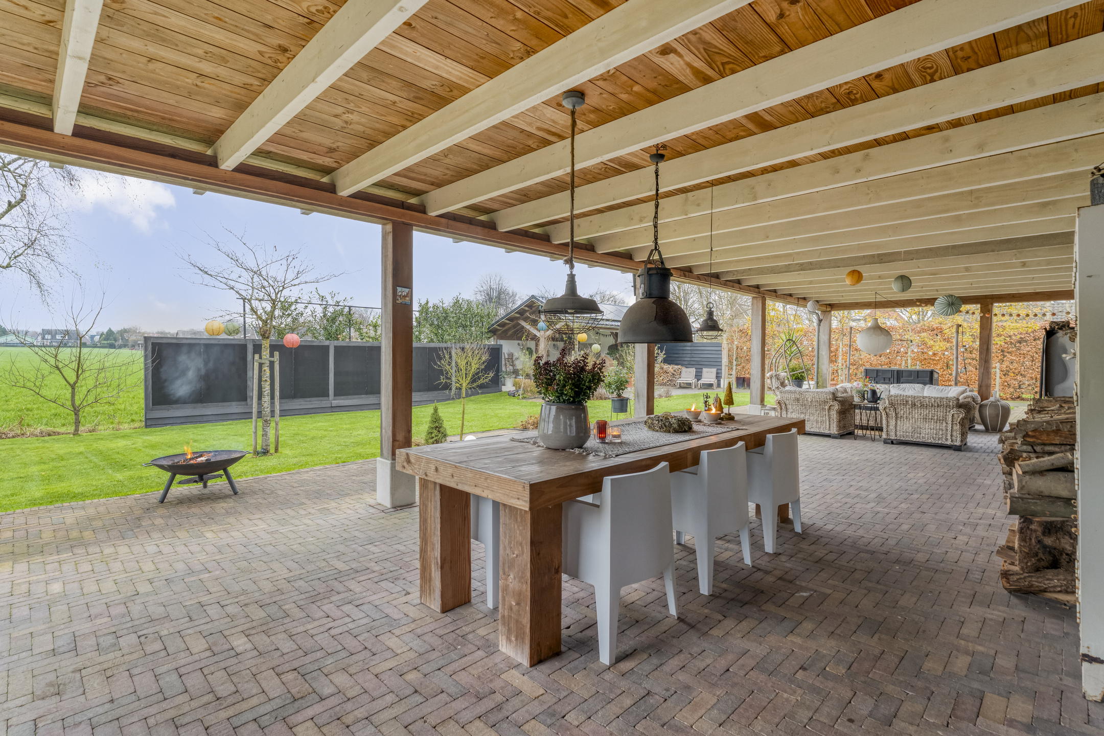 De tuin is werkelijk een buitenkans: volop privacy, prachtig aangelegd én met vrij uitzicht over de weilanden. Direct aan de woning bevindt zich een imposante overkapping van maar liefst 15 meter breed. Achter in de tuin staat nóg een sfeervolle overkapping met haard en extra schuur. Een heerlijke plek voor lange zomeravonden of gezellige wintermomenten.
