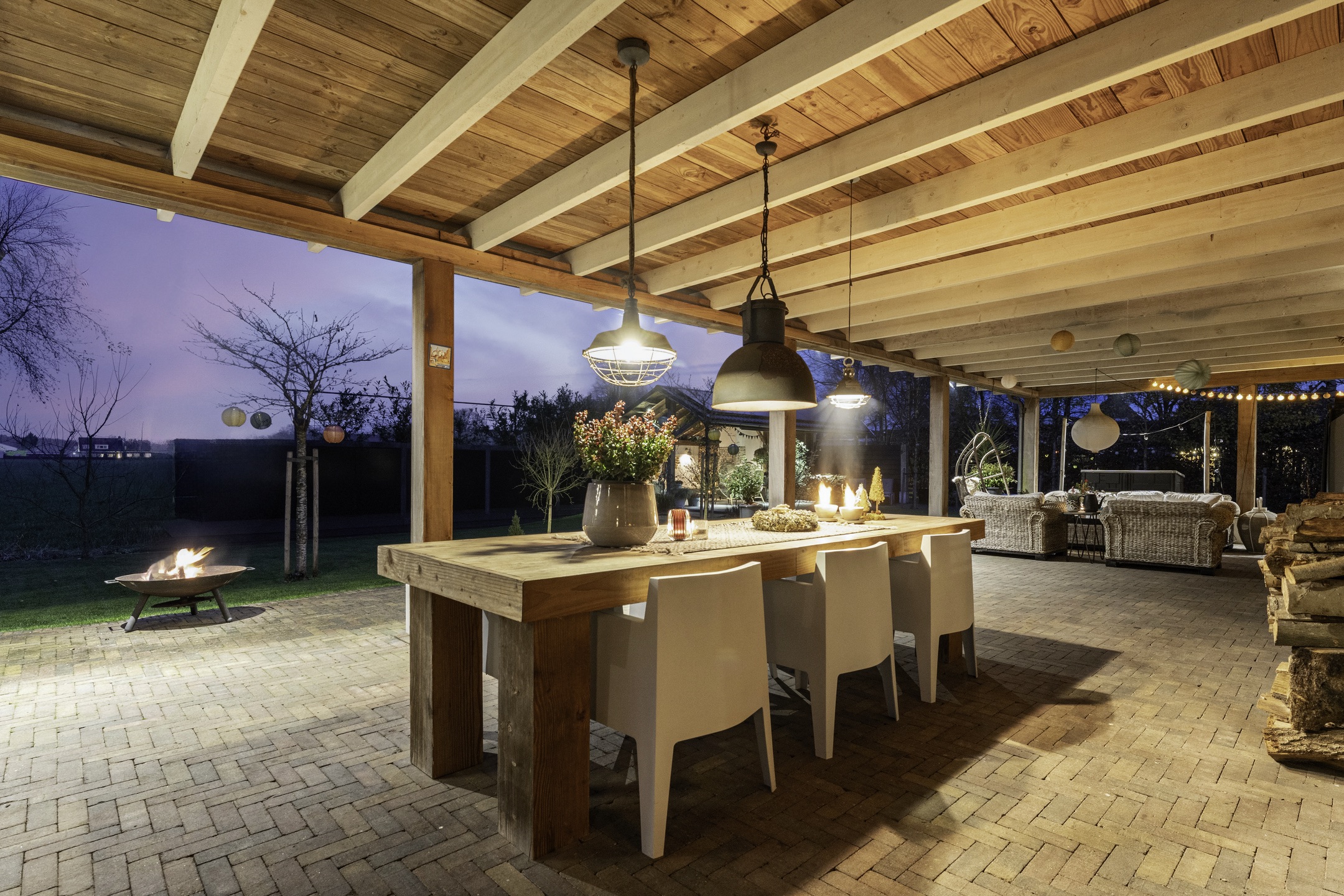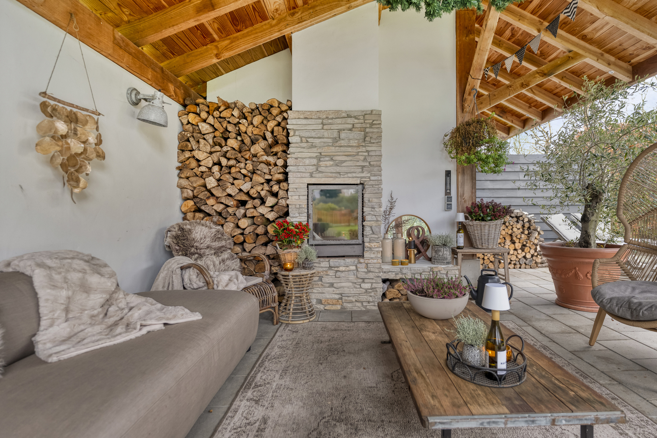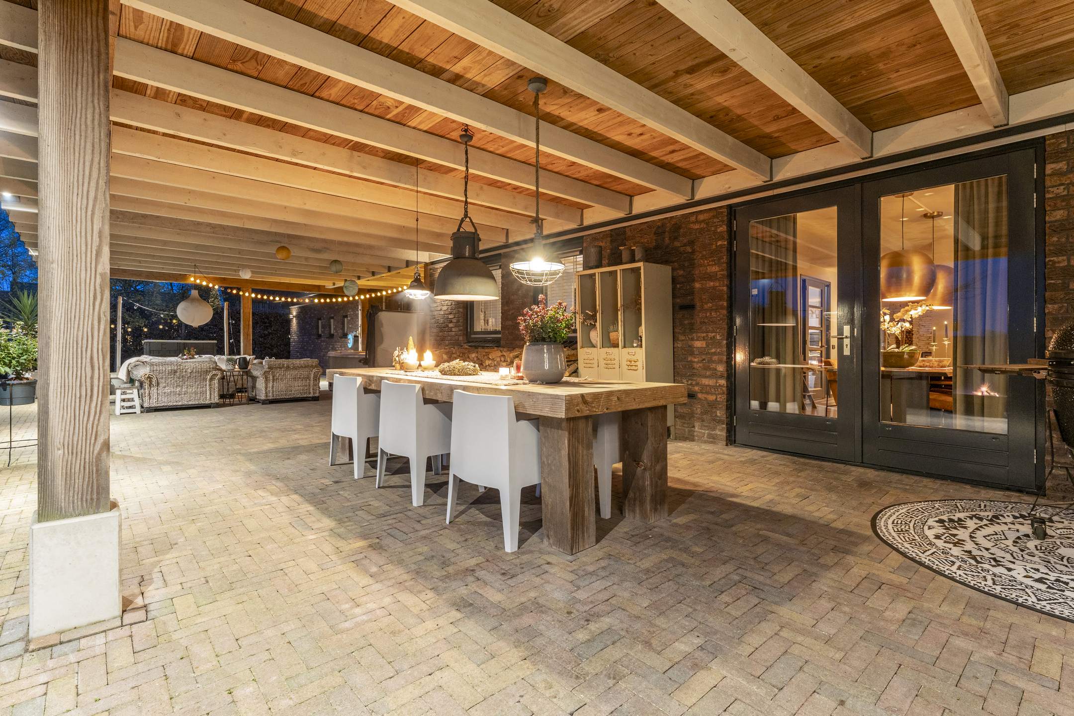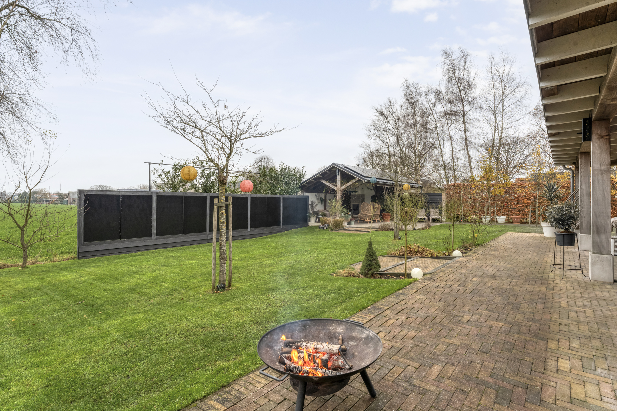 De tuin is werkelijk een buitenkans: volop privacy, prachtig aangelegd én met vrij uitzicht over de weilanden. Direct aan de woning bevindt zich een imposante overkapping van maar liefst 15 meter breed. Achter in de tuin staat nóg een sfeervolle overkapping met haard en extra schuur. Een heerlijke plek voor lange zomeravonden of gezellige wintermomenten.