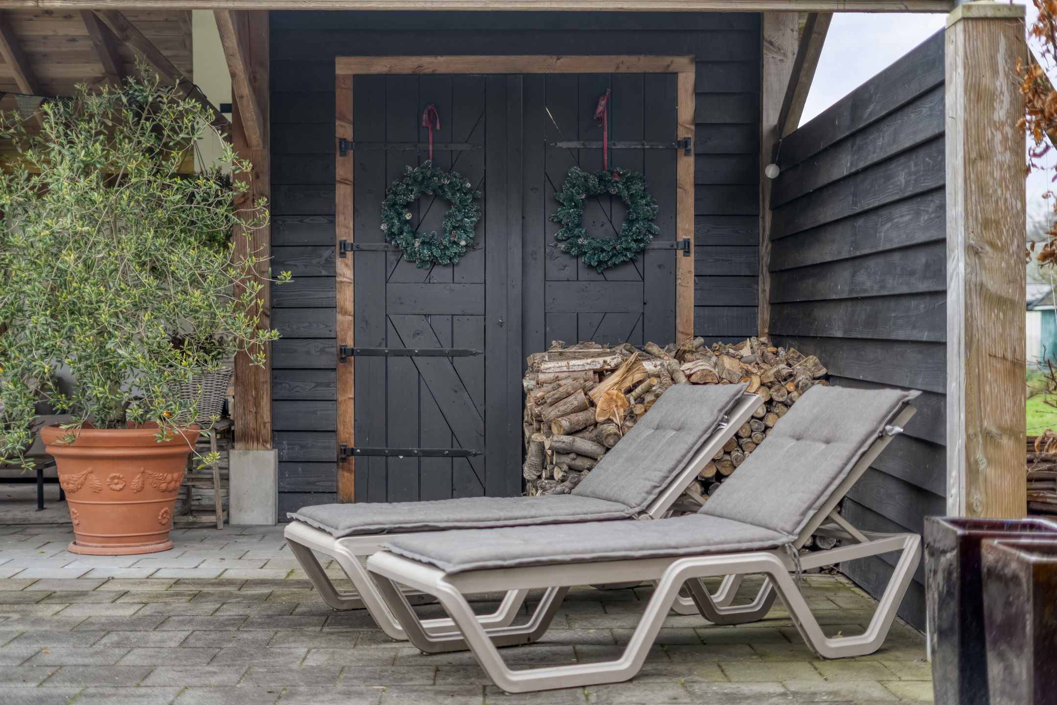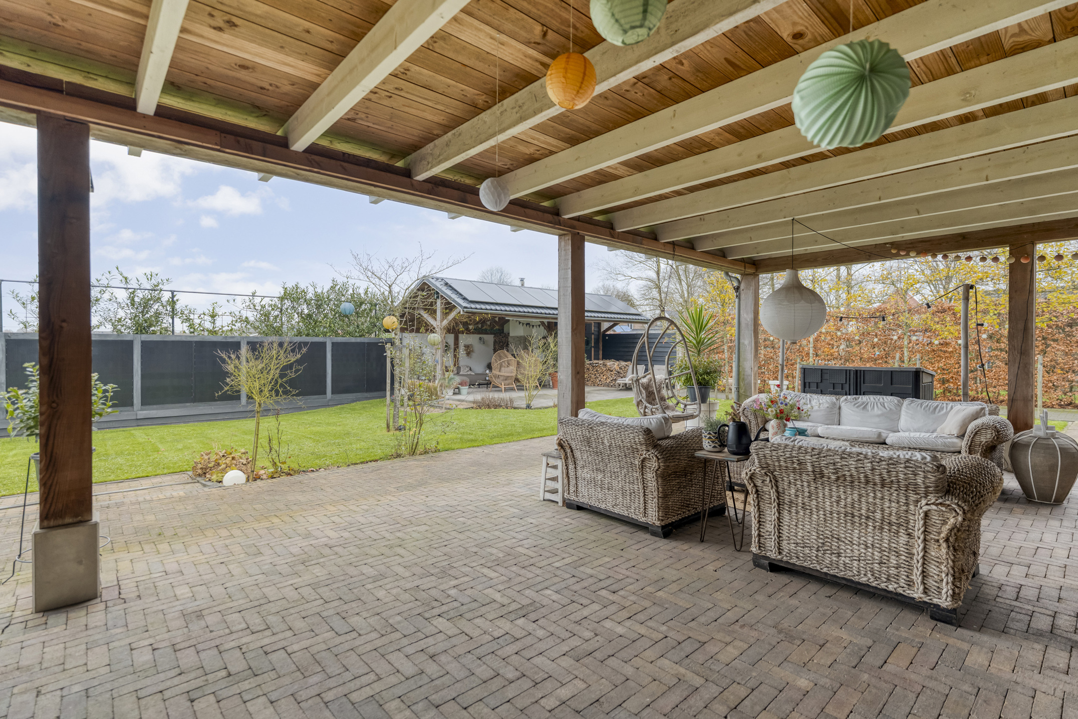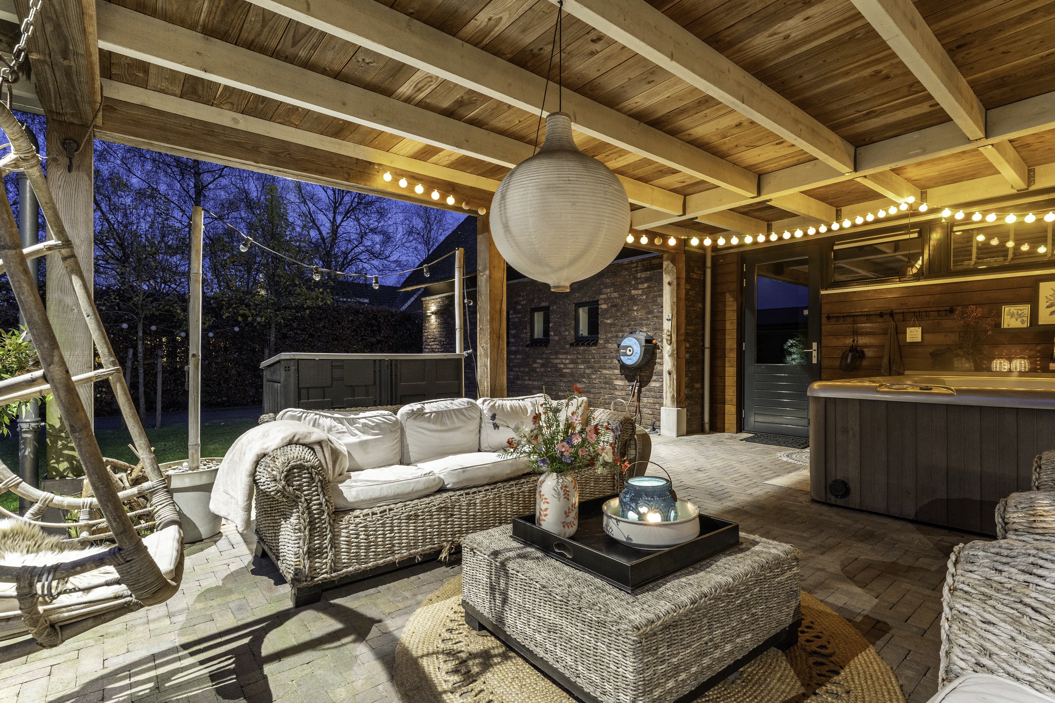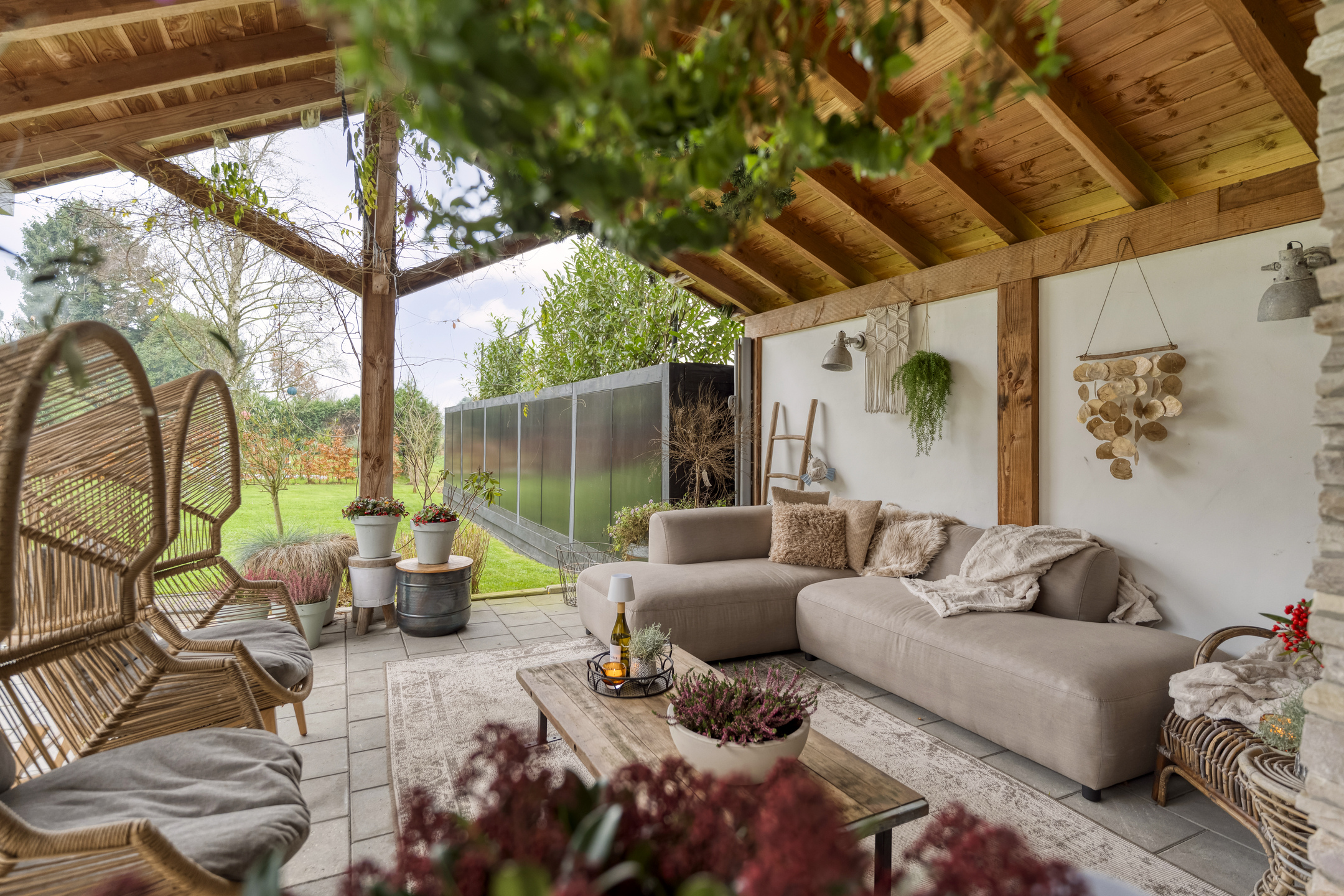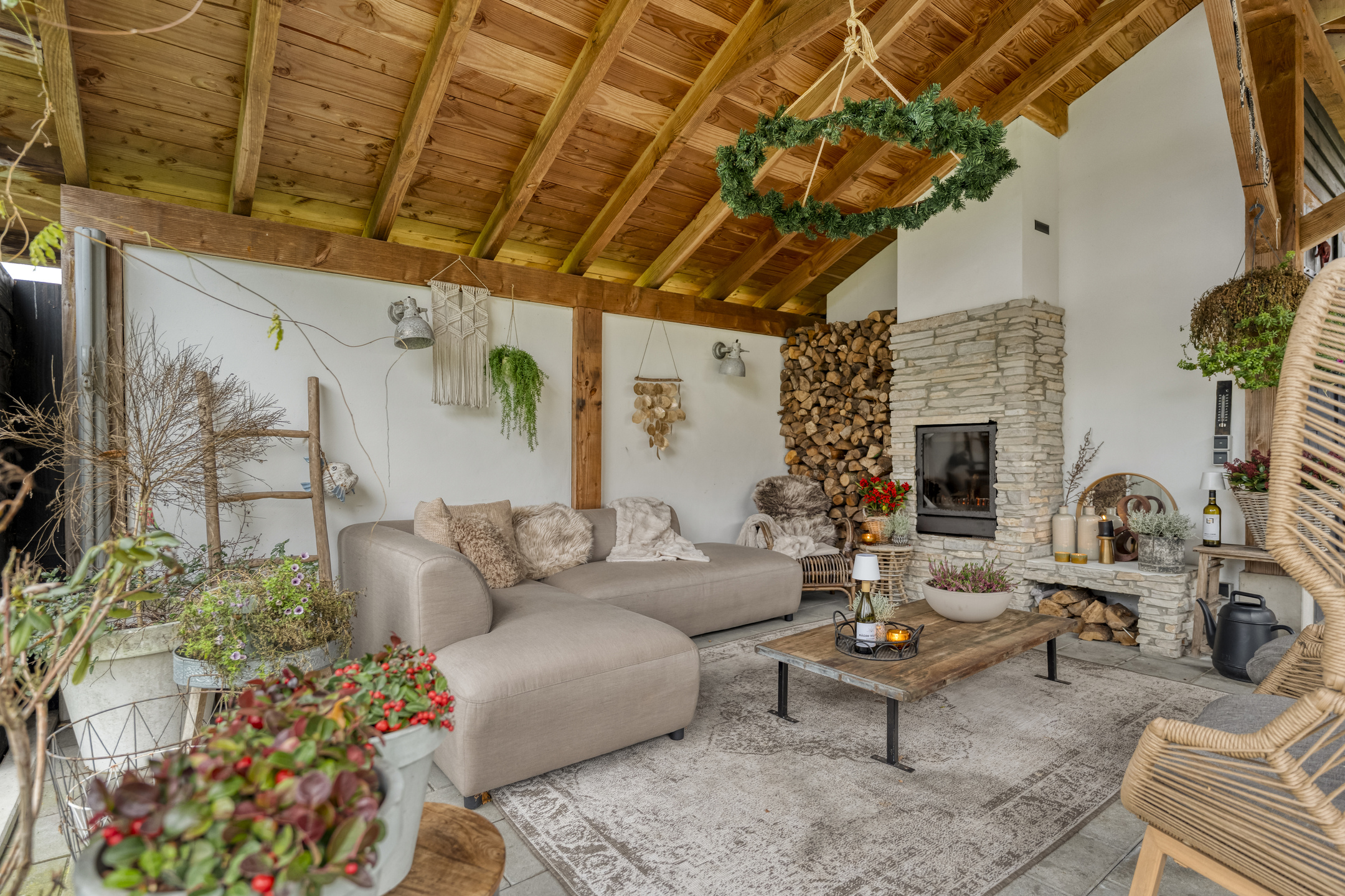 De tuin is werkelijk een buitenkans: volop privacy, prachtig aangelegd én met vrij uitzicht over de weilanden. Direct aan de woning bevindt zich een imposante overkapping van maar liefst 15 meter breed. Achter in de tuin staat nóg een sfeervolle overkapping met haard en extra schuur. Een heerlijke plek voor lange zomeravonden of gezellige wintermomenten.