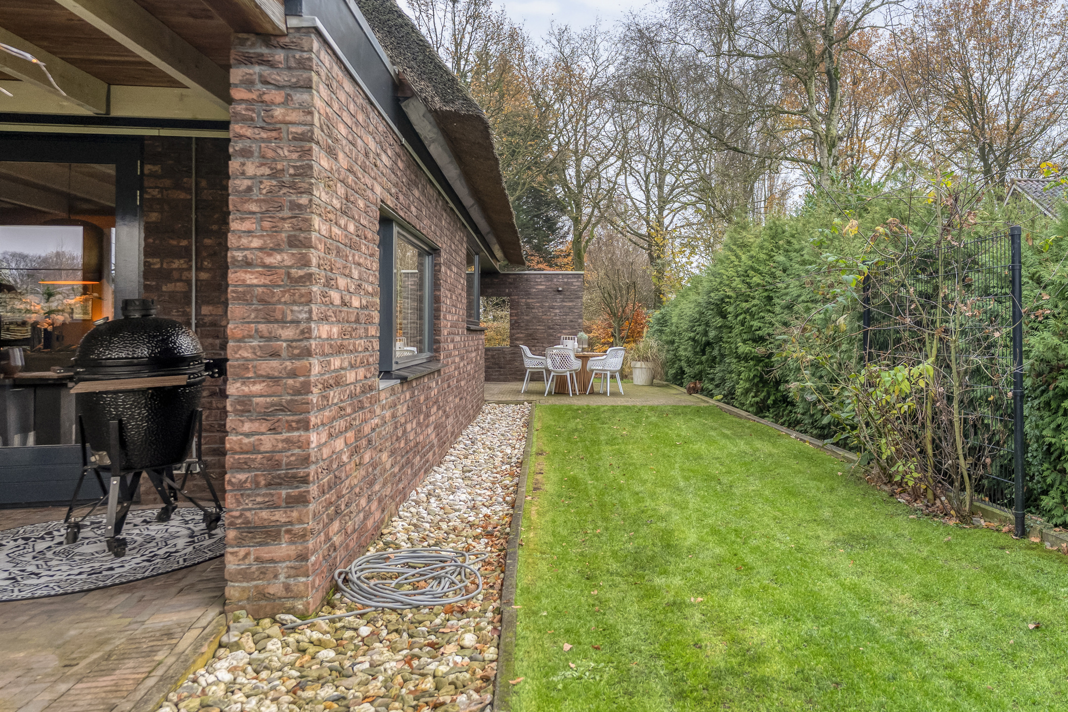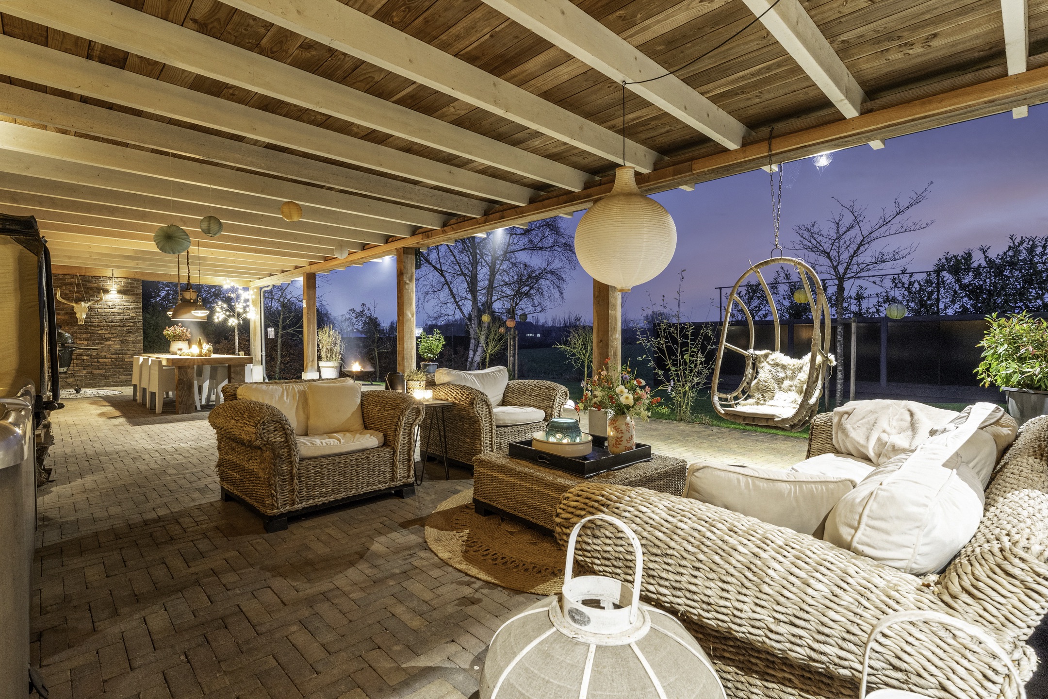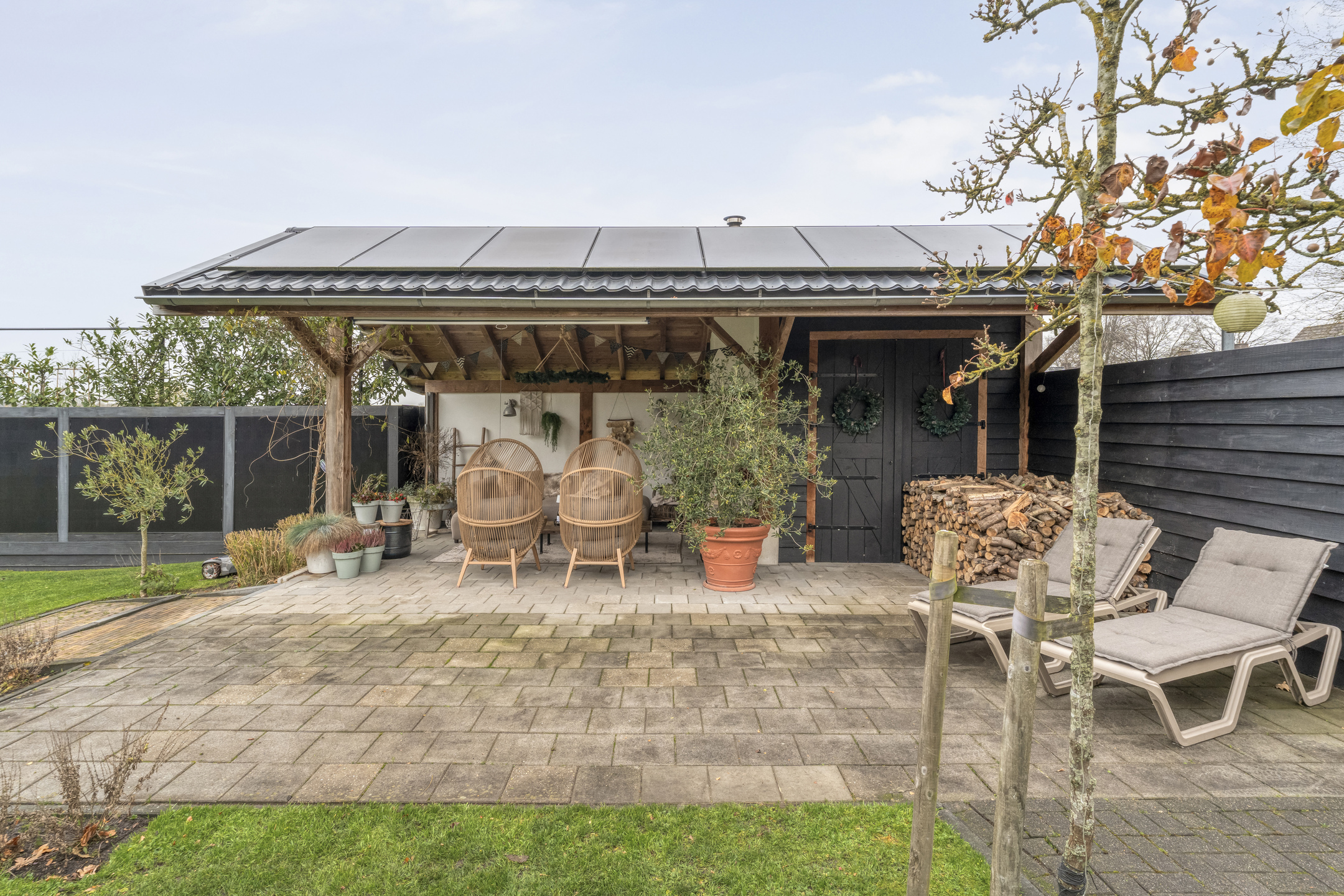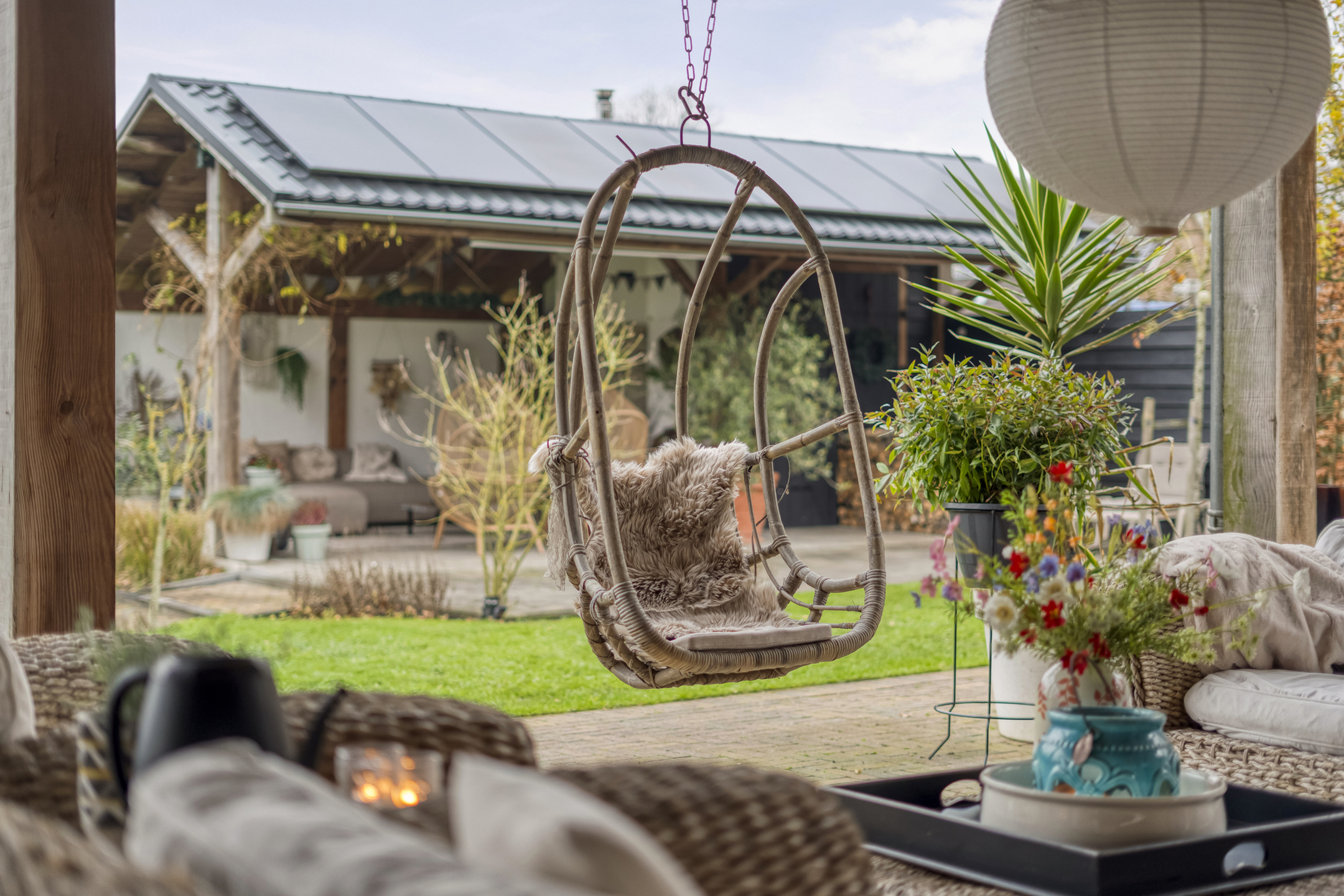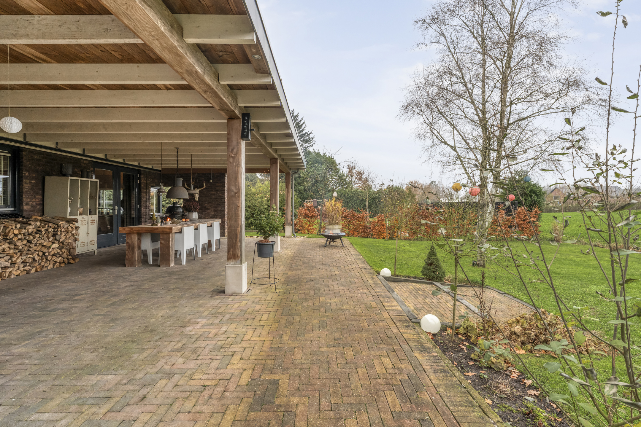 De tuin is werkelijk een buitenkans: volop privacy, prachtig aangelegd én met vrij uitzicht over de weilanden. Direct aan de woning bevindt zich een imposante overkapping van maar liefst 15 meter breed. Achter in de tuin staat nóg een sfeervolle overkapping met haard en extra schuur. Een heerlijke plek voor lange zomeravonden of gezellige wintermomenten.