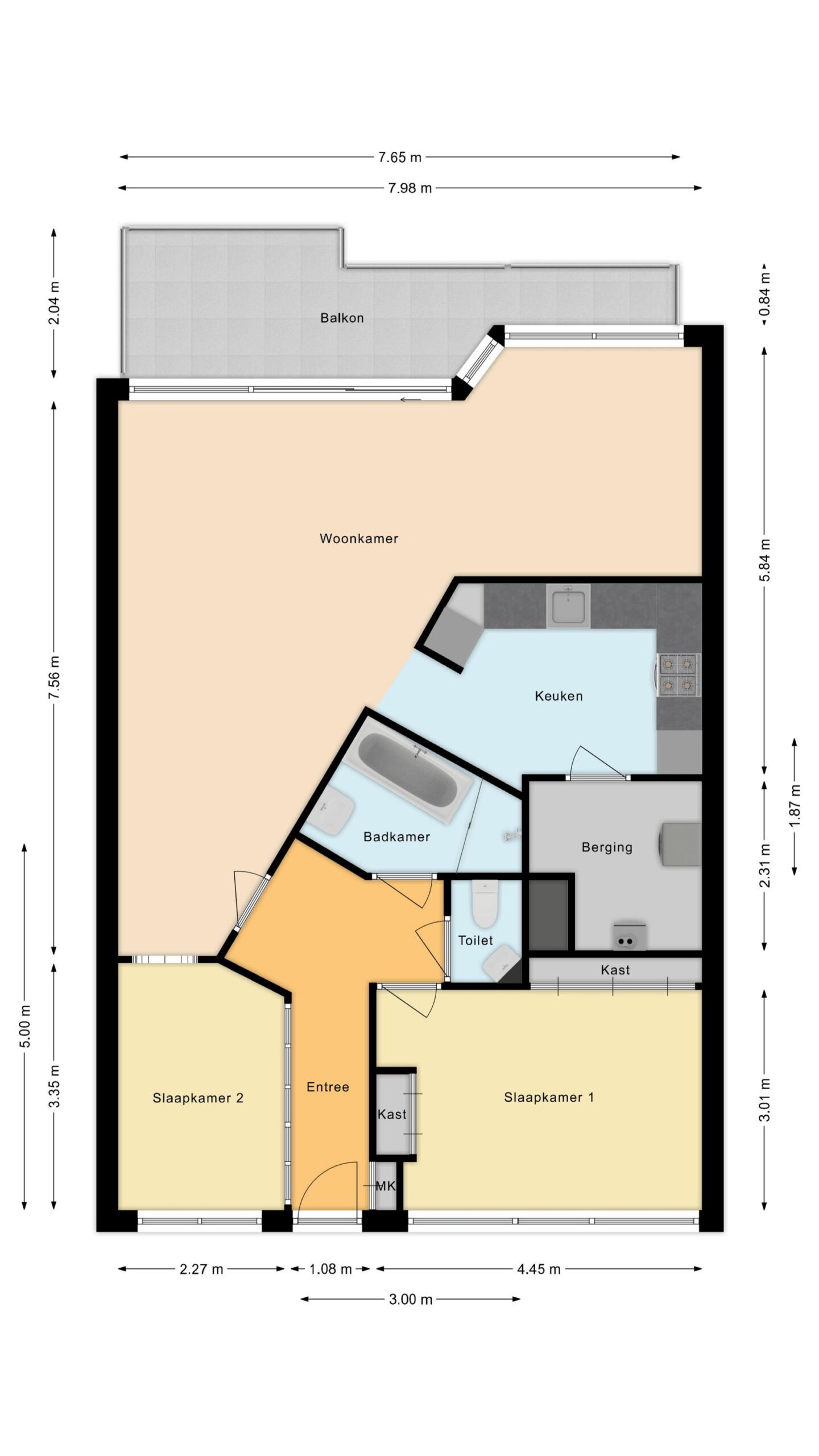 Entree met garderobe, lichte en ruim bemeten woonkamer met schuifpui naar het zonnige balkon, halfopen keuken met enige inbouwapparatuur, bijkeuken met witgoedaansluitingen en CV-ketel (2015), toilet, badkamer met een ligbad, inloopdouche en wastafel en een ruime slaapkamer.