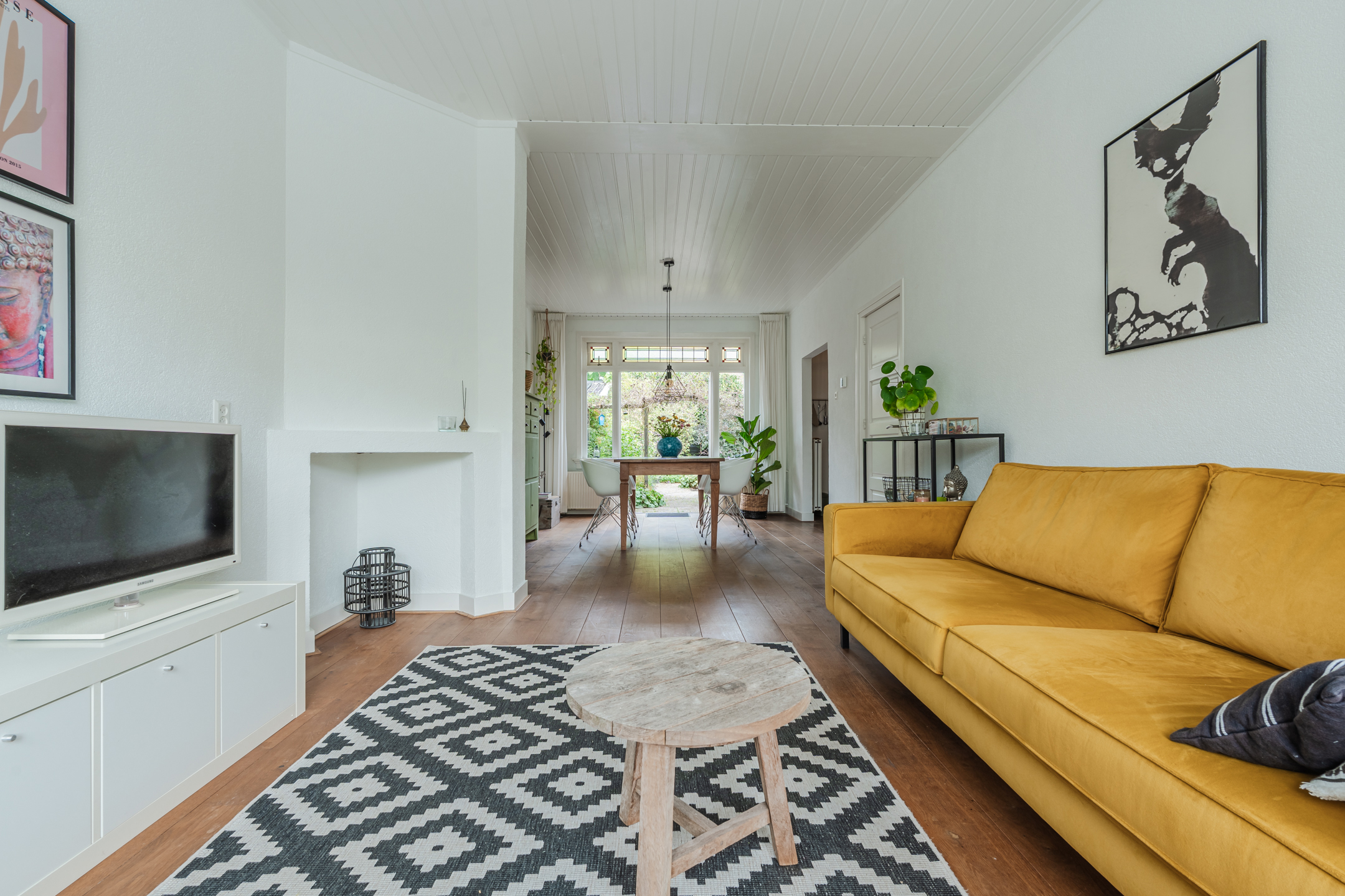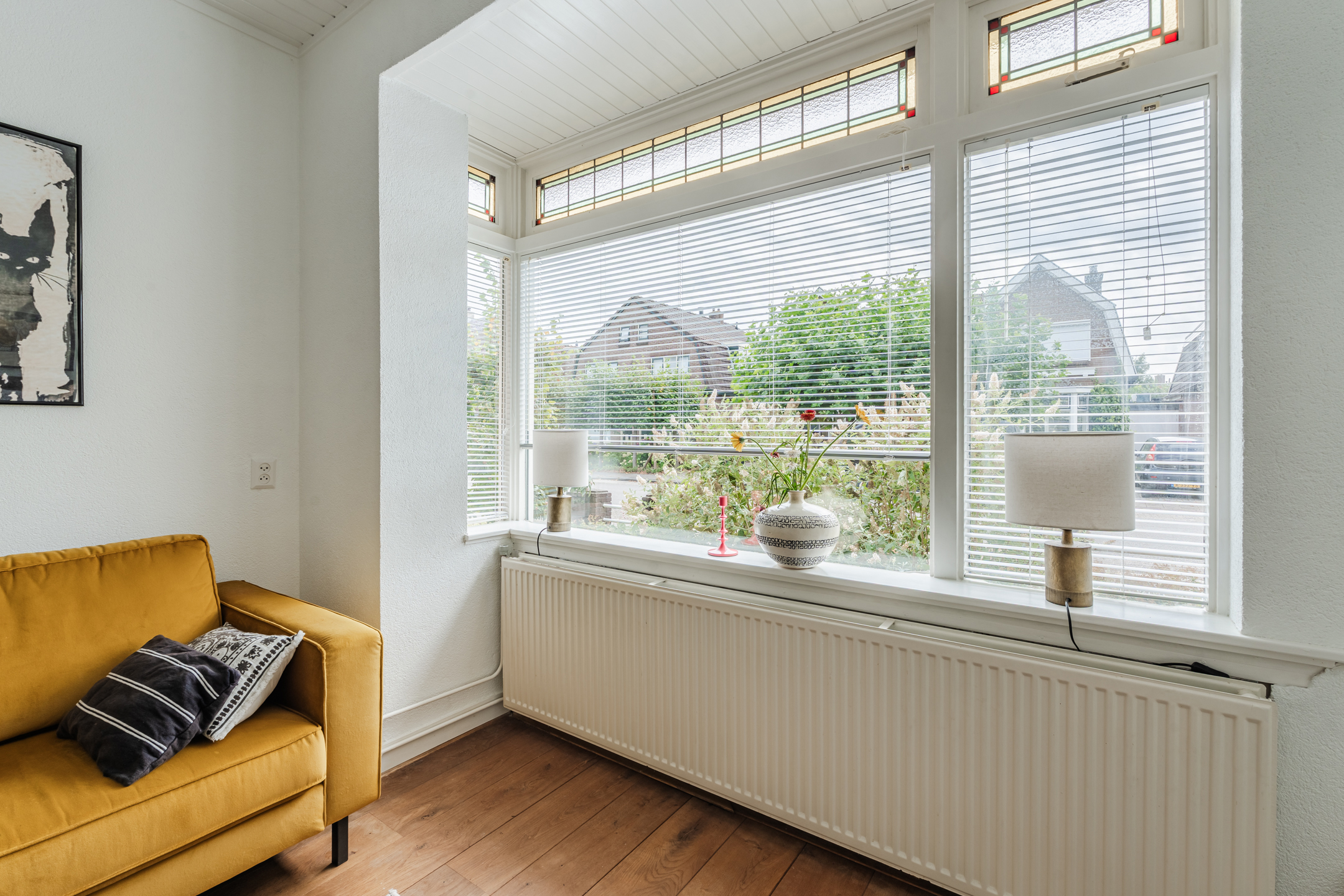 De woning beschikt nog over authentieke details, waaronder prachtige glas-in-loodramen, houten vloer, dubbele schouw en een erker aan de voorzijde.