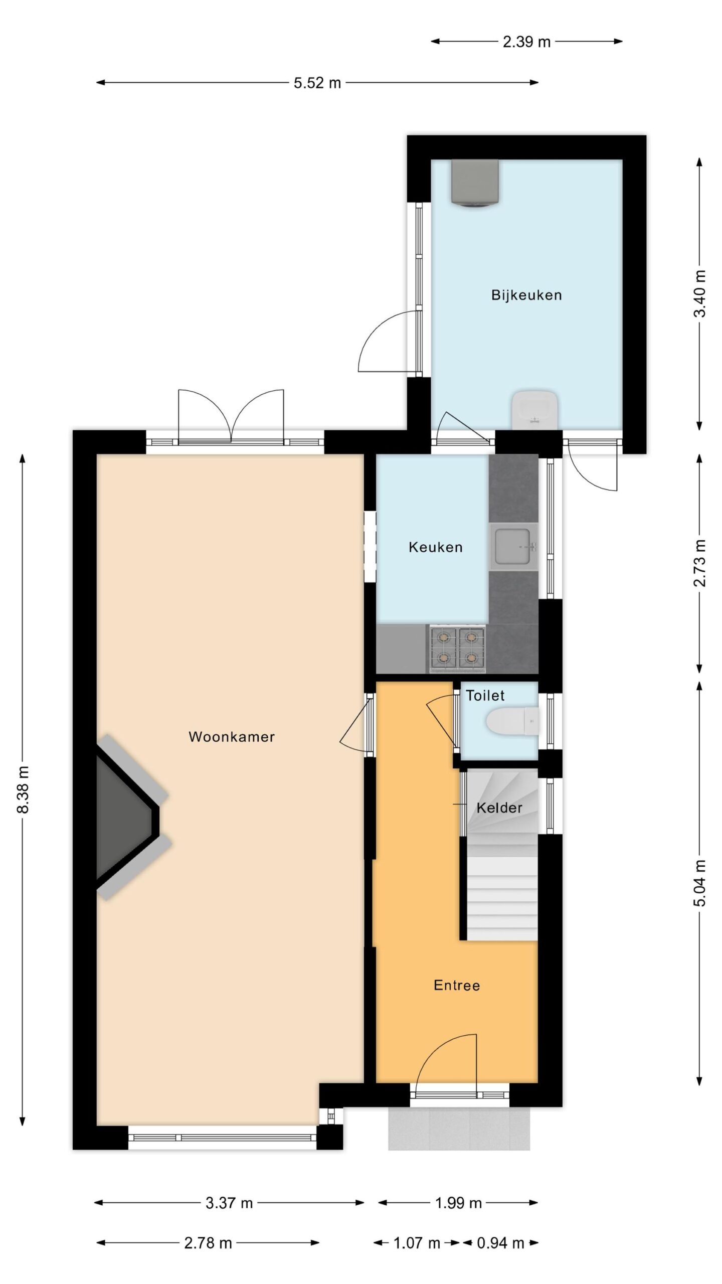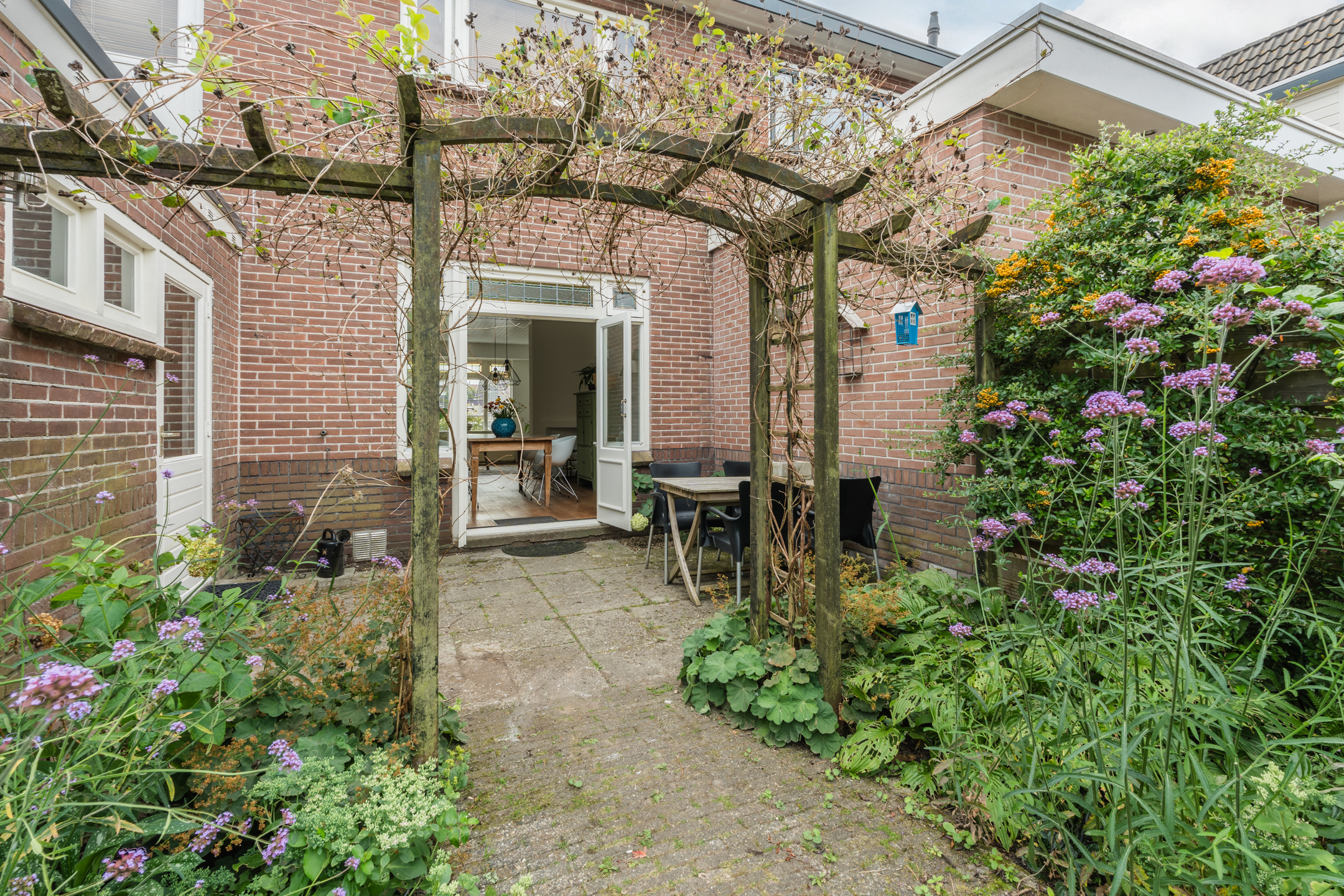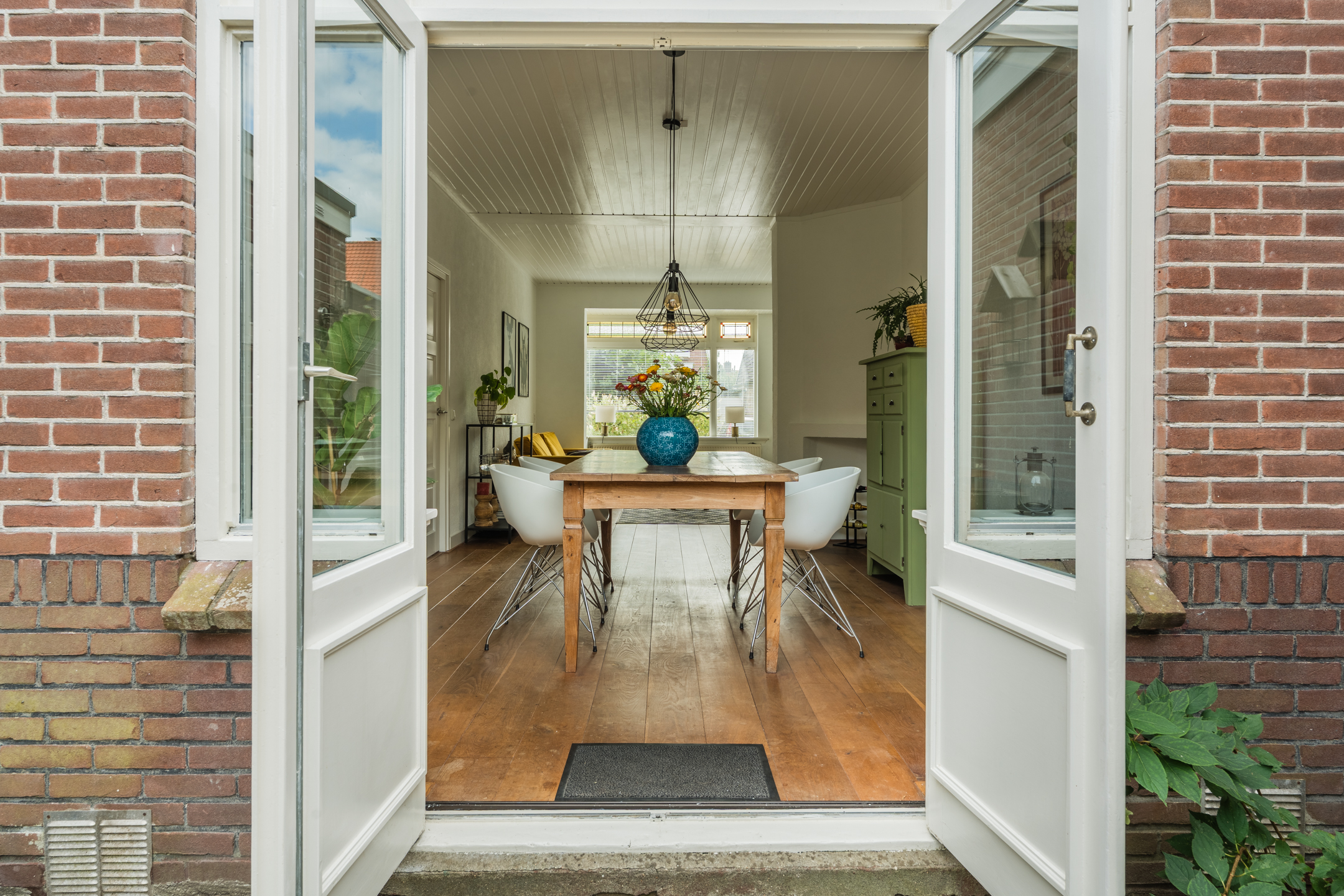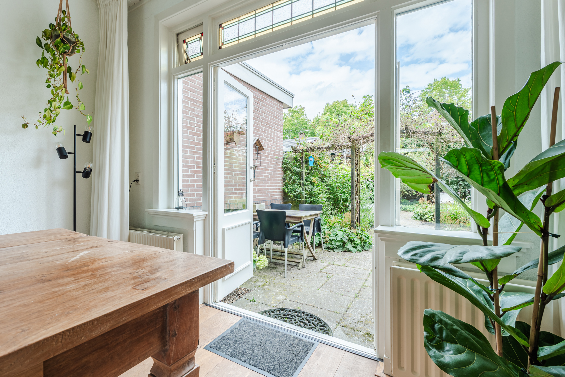 Entree met hal, toilet en toegang tot de kelder. Gezellige woonkamer met een dubbele schouw, erker, openslaande deuren en veel lichtinval. Vanuit de keuken heb je toegang tot de bijkeuken. Vanuit zowel de woonkamer als bijkeuken bereik je de zonnige tuin met veel groen en houten berging.