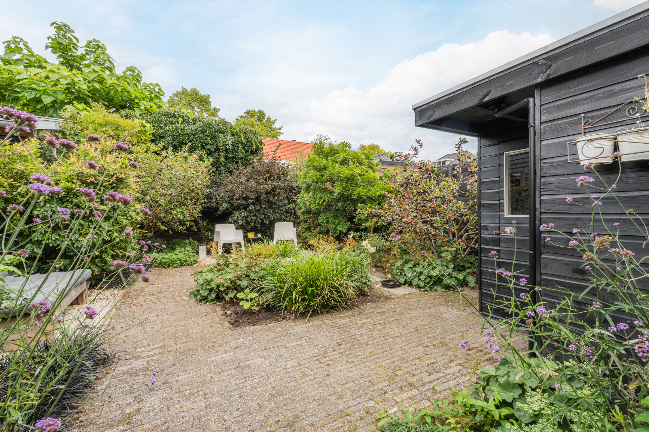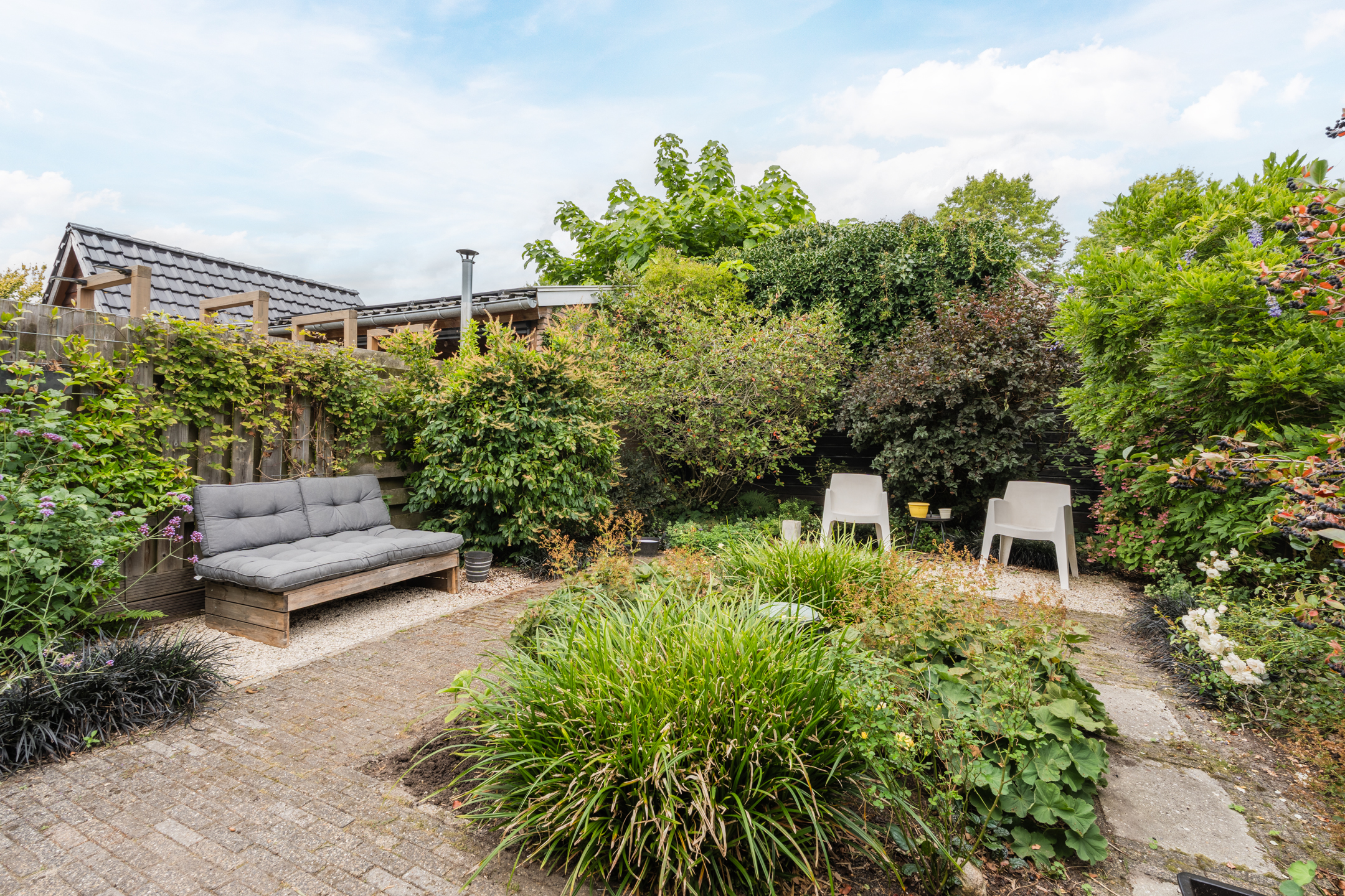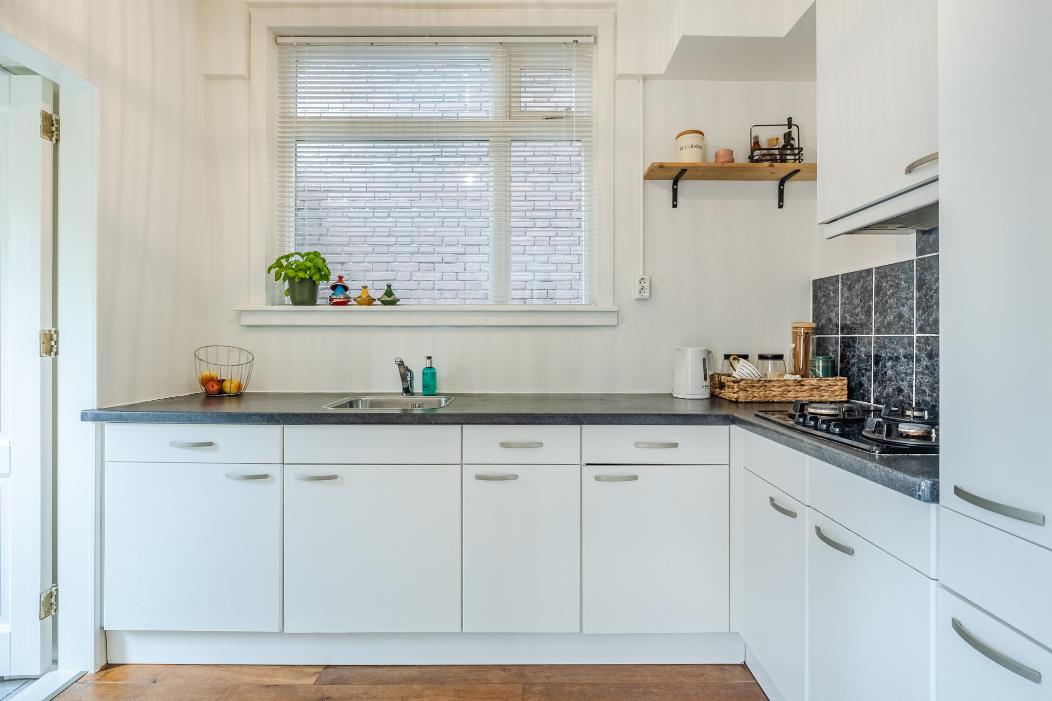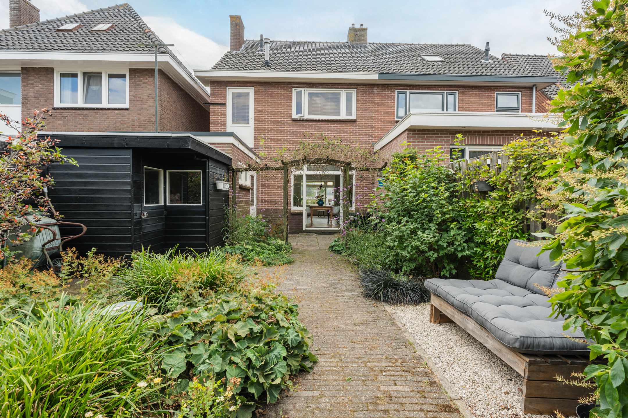 Entree met hal, toilet en toegang tot de kelder. Gezellige woonkamer met een dubbele schouw, erker, openslaande deuren en veel lichtinval. Vanuit de keuken heb je toegang tot de bijkeuken. Vanuit zowel de woonkamer als bijkeuken bereik je de zonnige tuin met veel groen en houten berging.