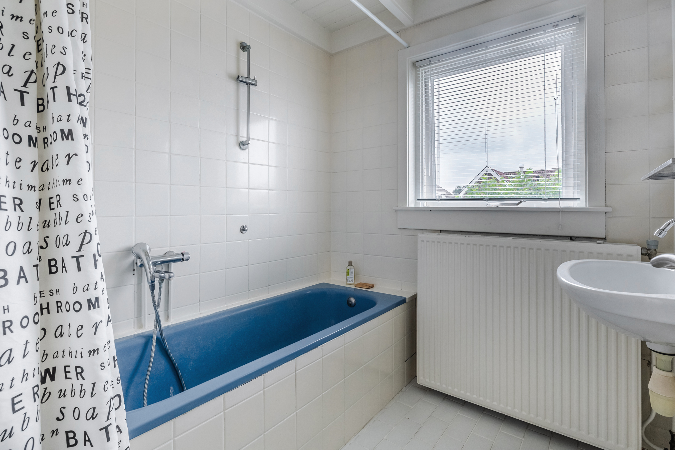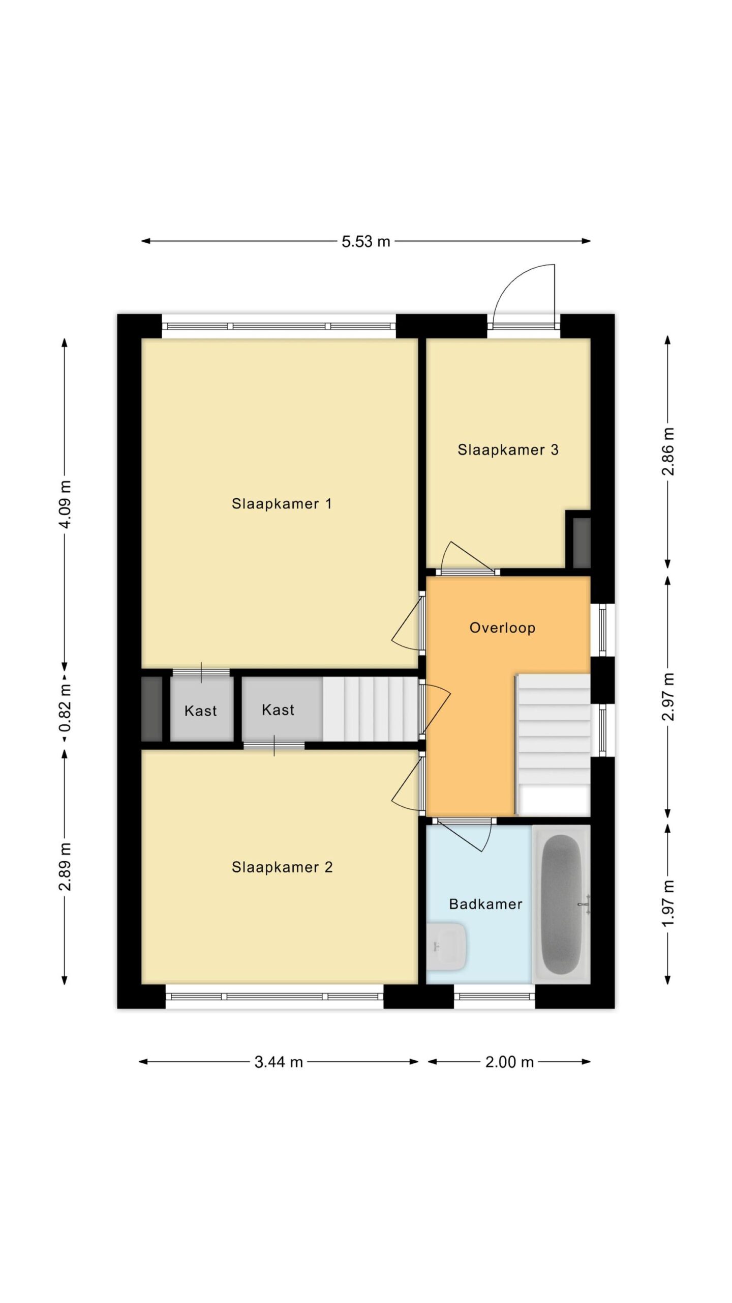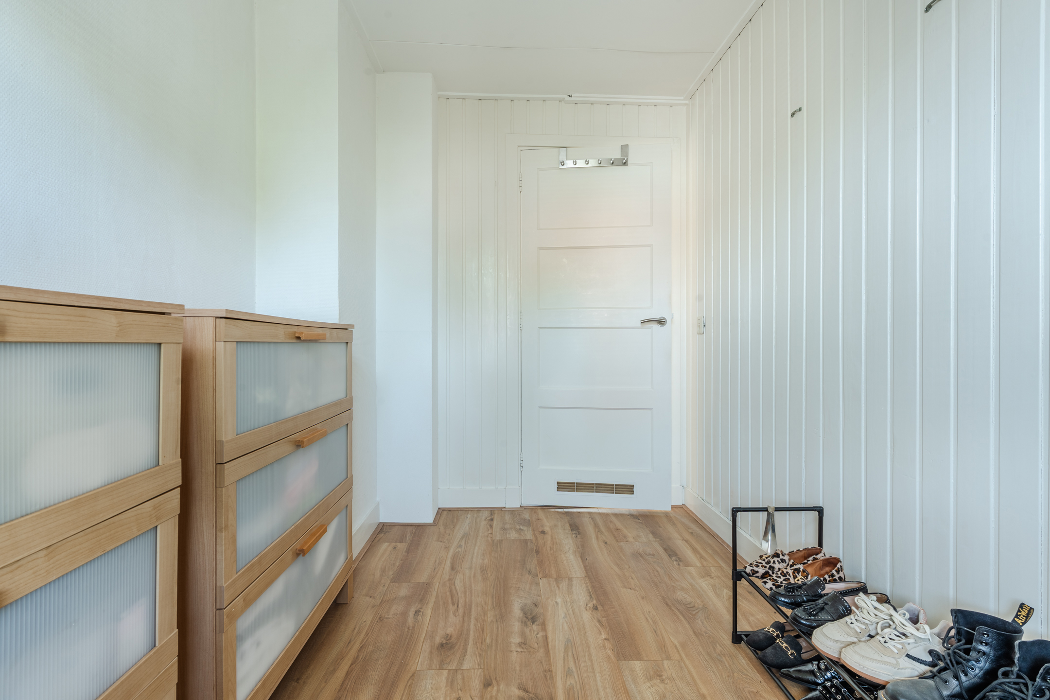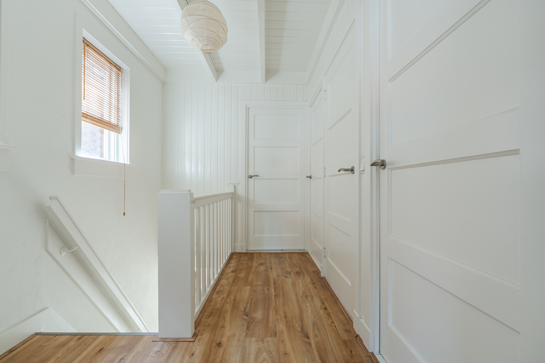 Overloop met drie slaapkamers, waarvan twee voorzien van vaste kasten. Eén slaapkamer heeft toegang tot een mogelijk dakterras. De badkamer is voorzien van een douche-badcombinatie en een wastafel.