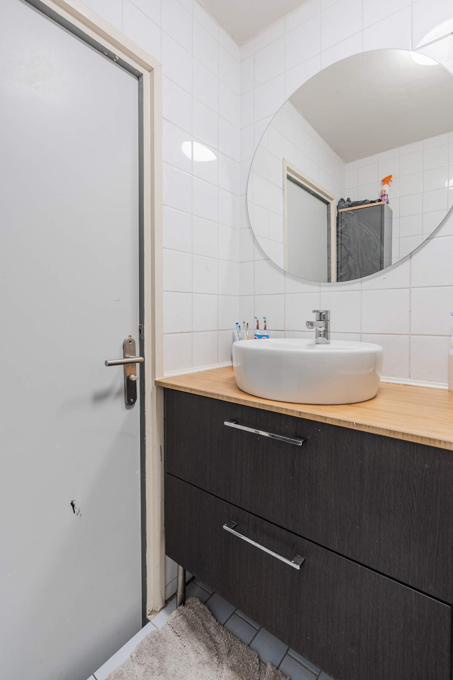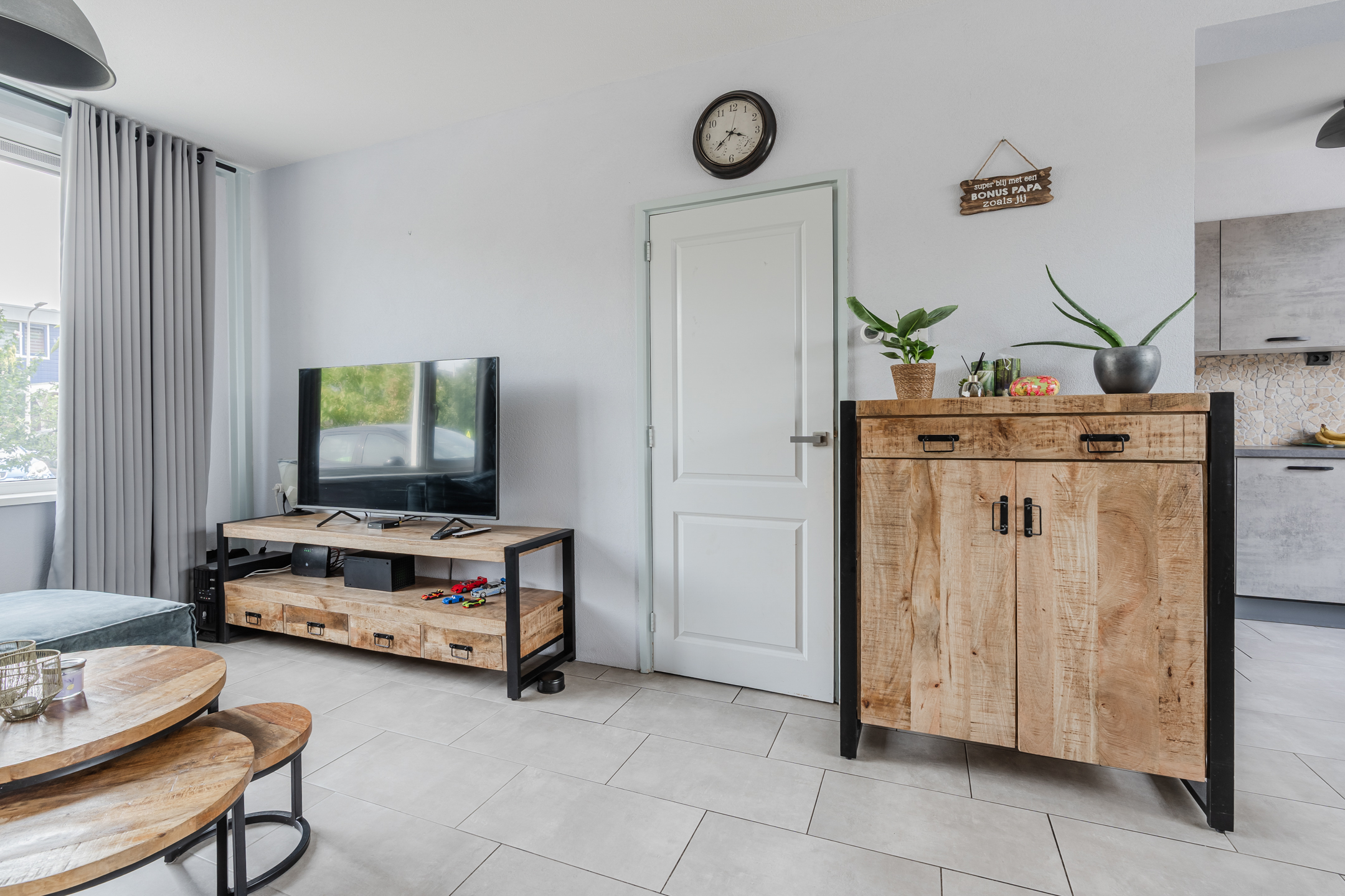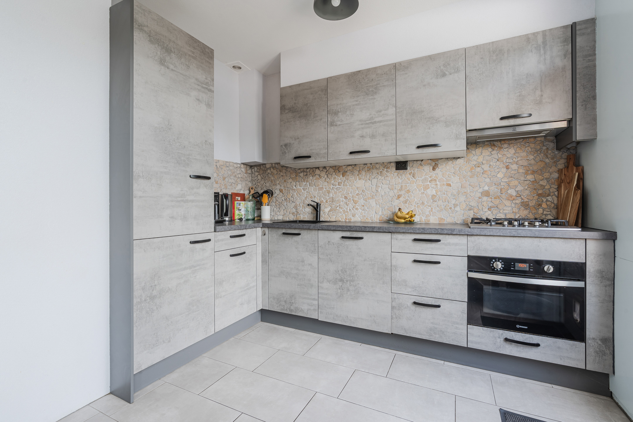 Entree met toilet en fontein, meterkast en trapopgang. De lichte woonkamer met open keuken uit 2021 is voorzien van al het hedendaags inbouwapparatuur zoals een koelkast, diepvries, vaatwasser, combioven, gasfornuis en afzuigkap.