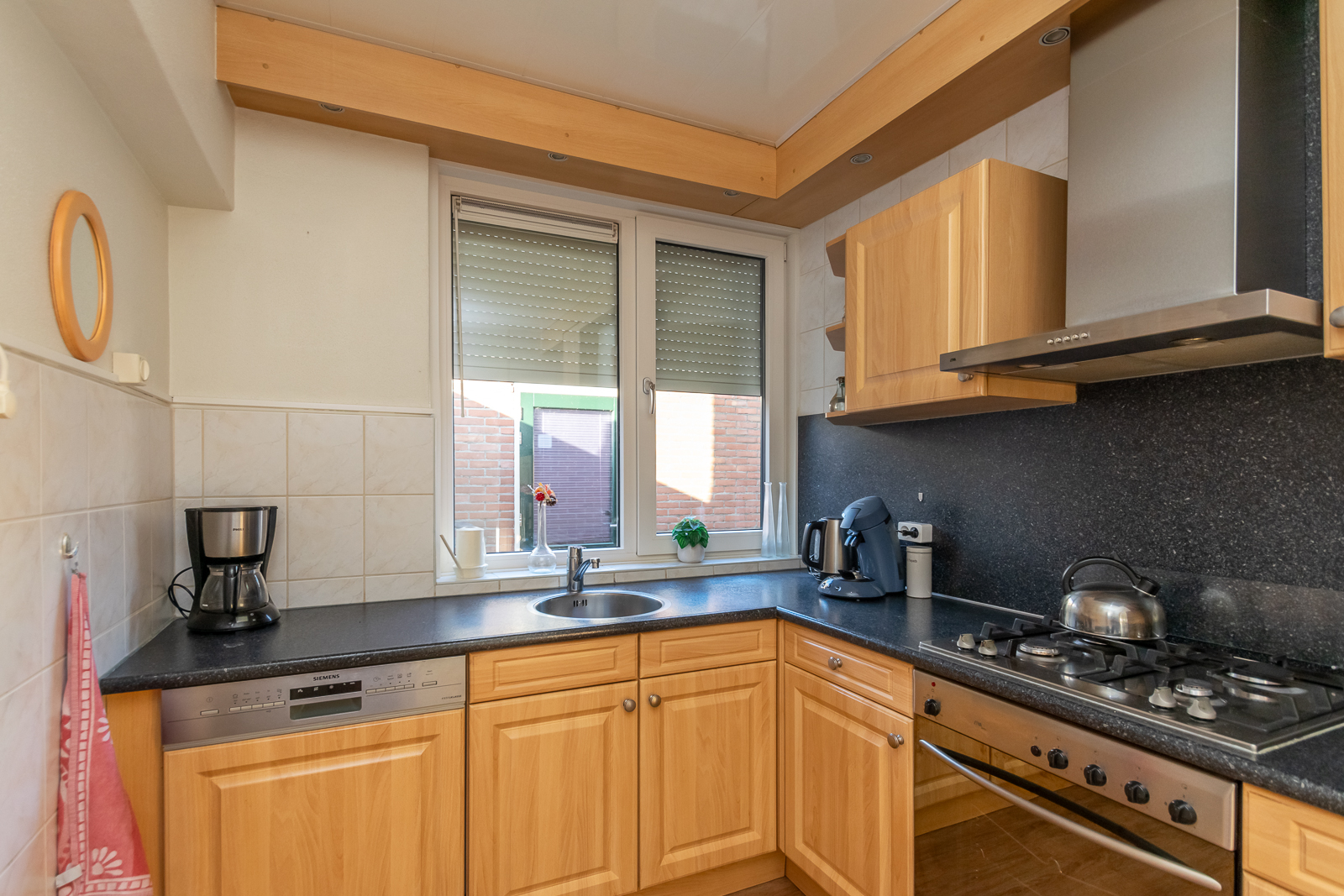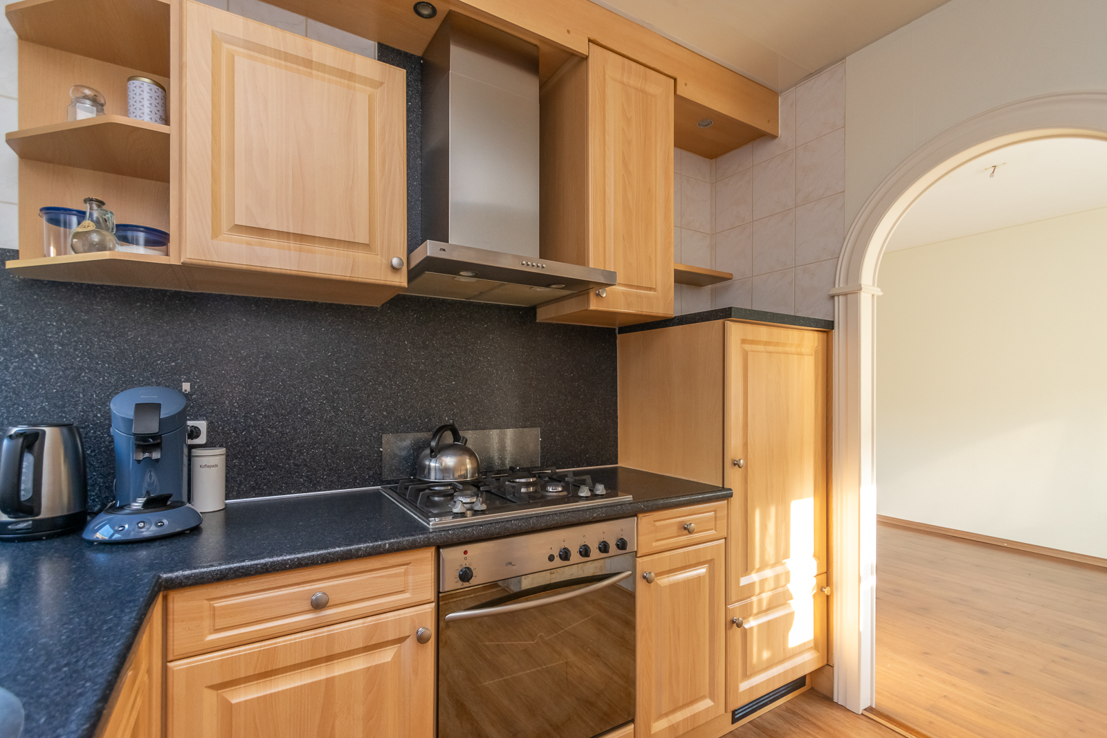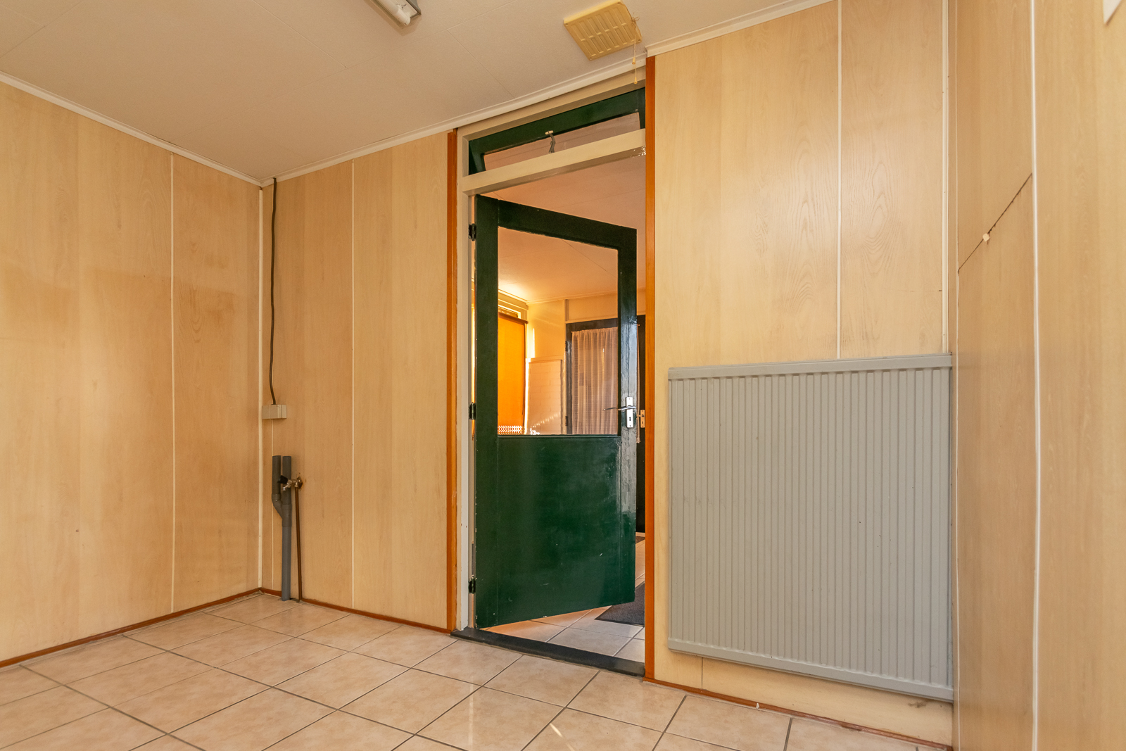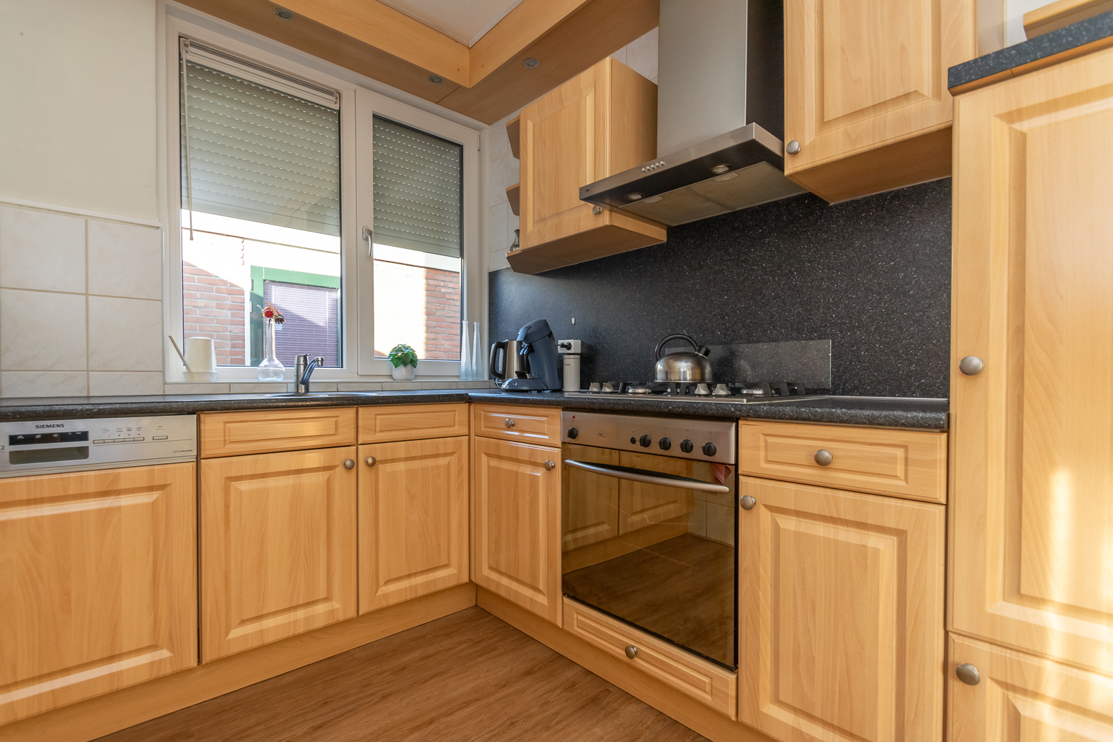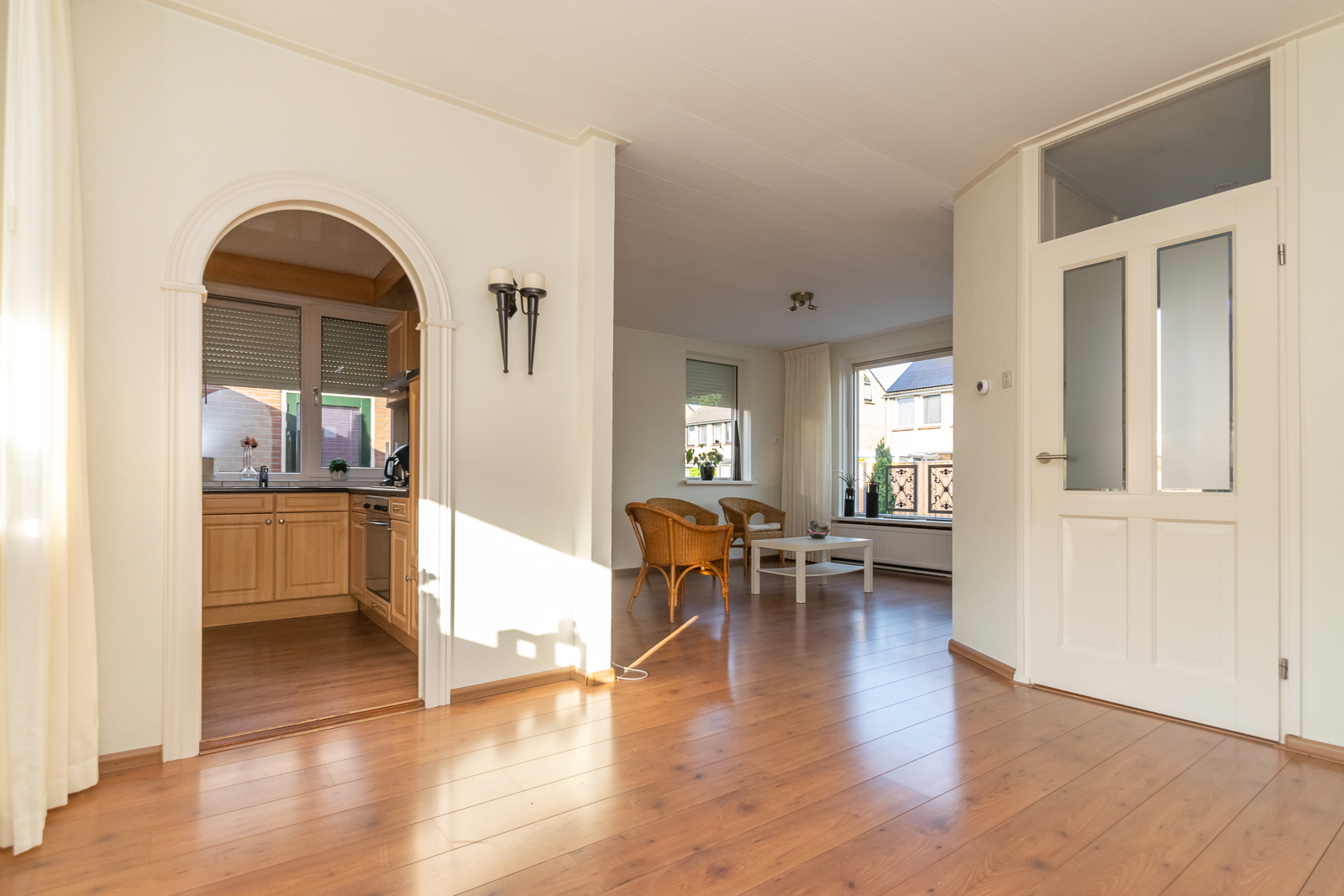 Woonkamer, halfopen keuken met enig inbouwapparatuur, bijkeuken met witgoedaansluiting en CV combiketel, hal en binnendoor naar de extra ruime garage van ca. 36m² met elektrische roldeur.