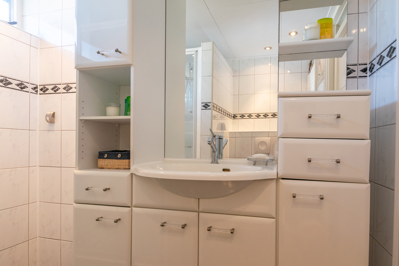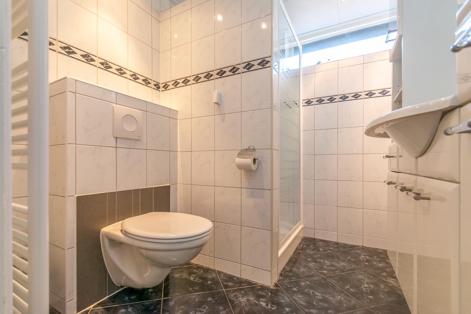 Overloop, 3 slaapkamers waarvan 1 met airco en badkamer met toilet, douche en wasmeubel.