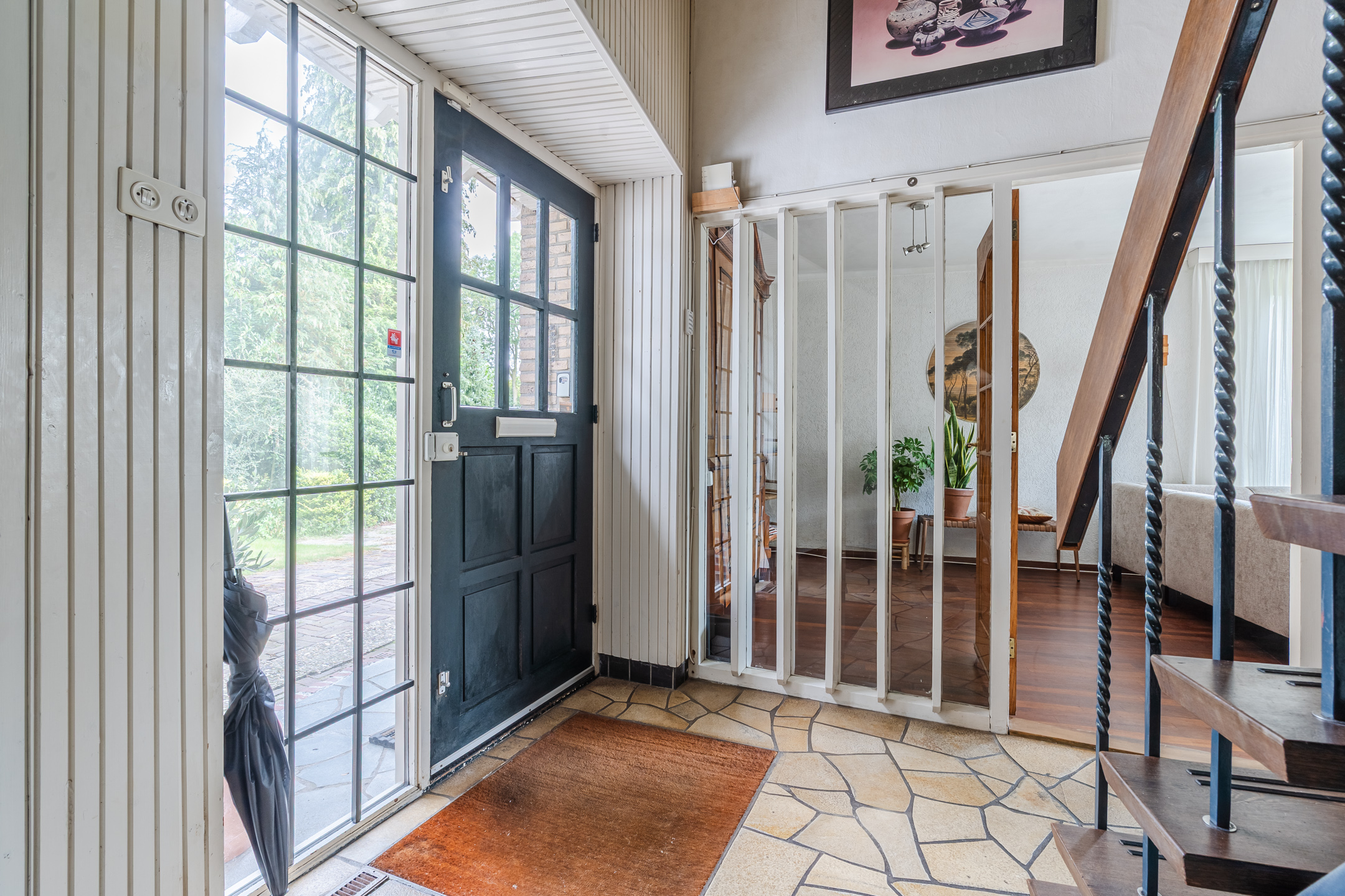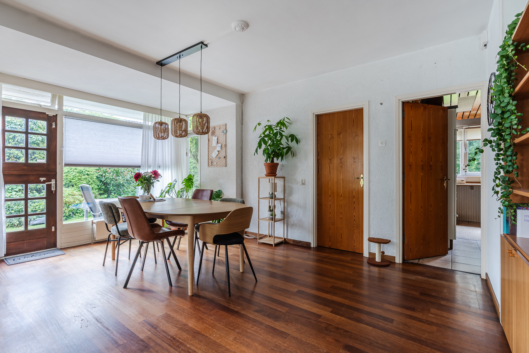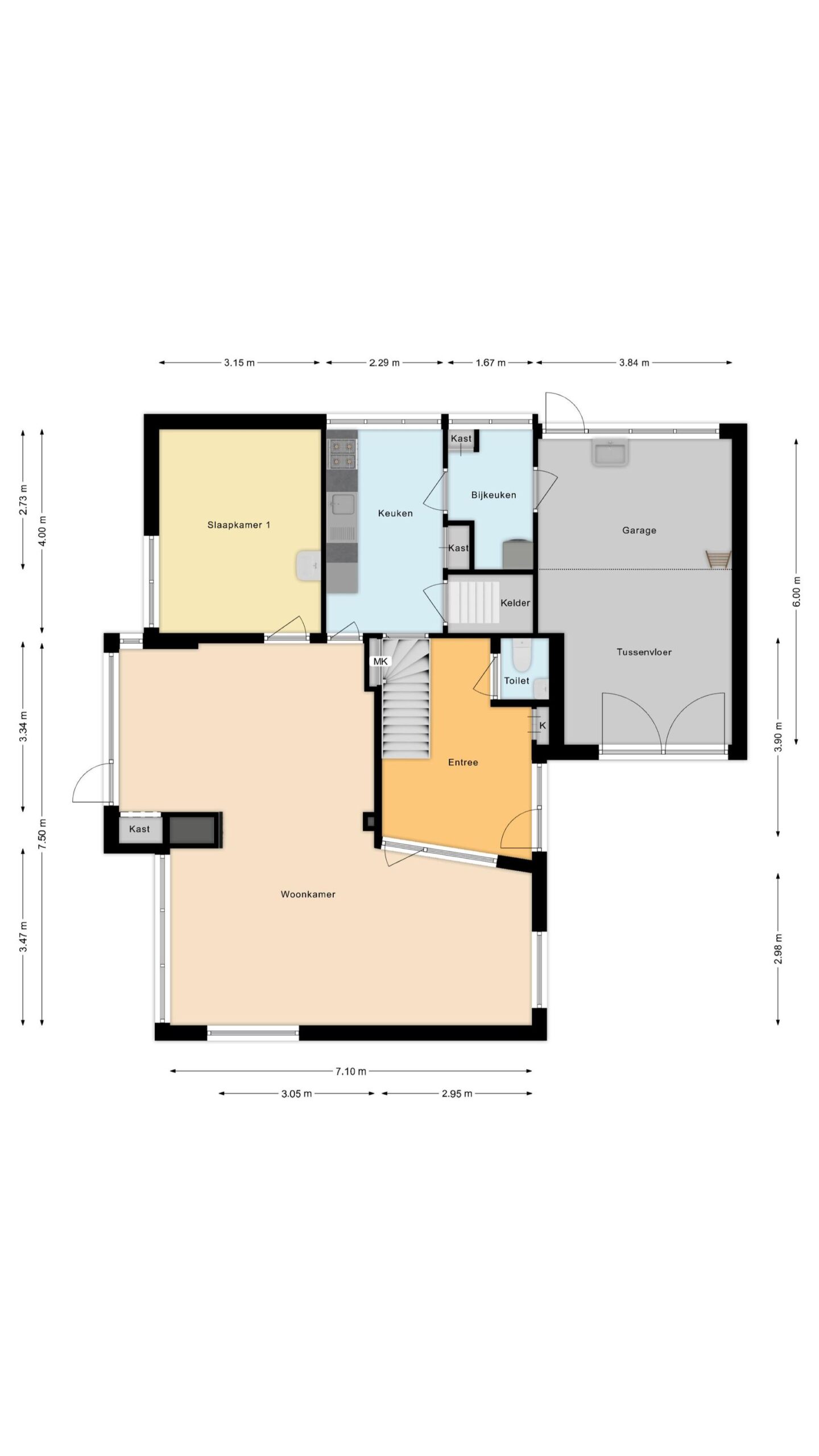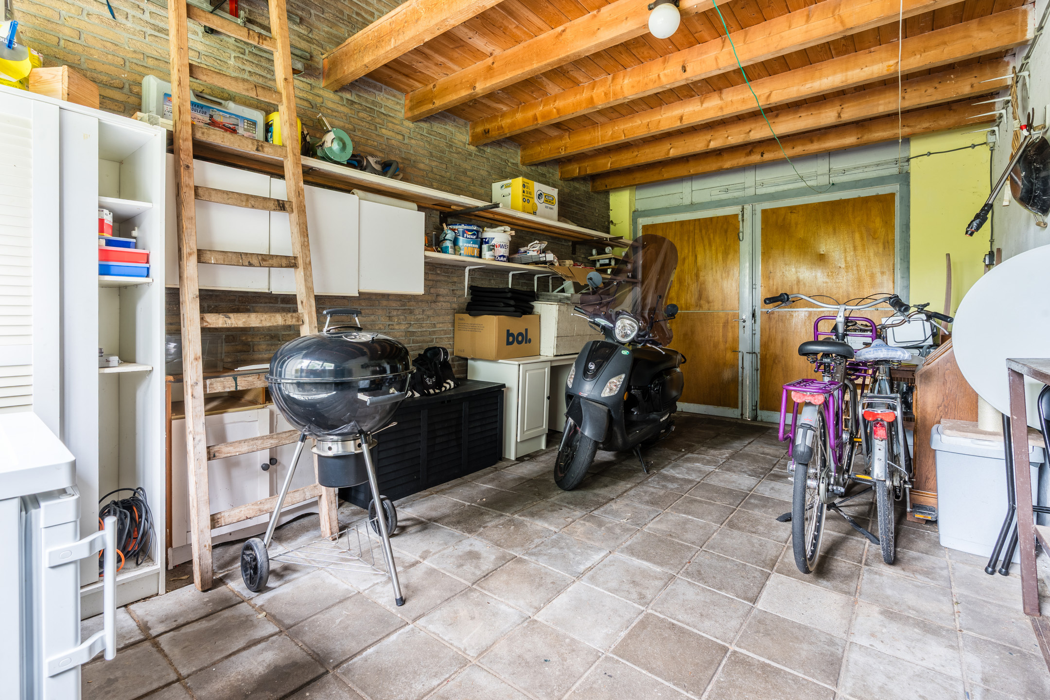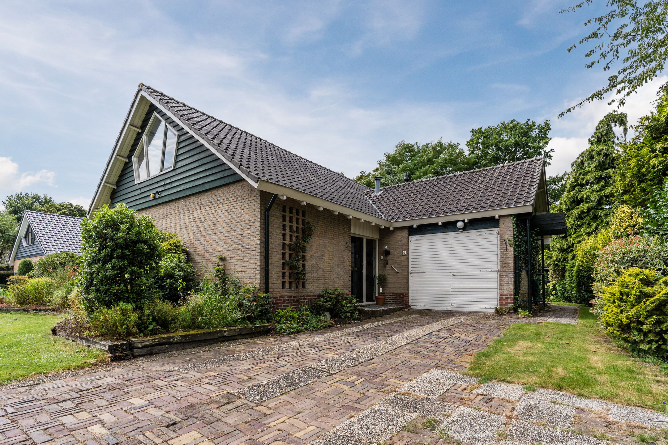 Ruime entree met toilet, gaderobekast en een vide, lichte L-vormige woonkamer met een erker en gashaard, slaapkamer met wastafel, eenvoudige dichte keuken met een provisiekelder en een doorgang naar de bijkeuken met witgoedaansluitingen en een doorgang naar de ruime inpandige garage met beloopbare bergzolder.