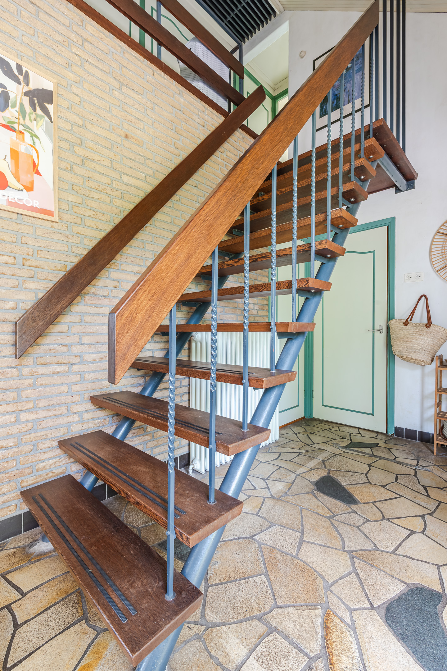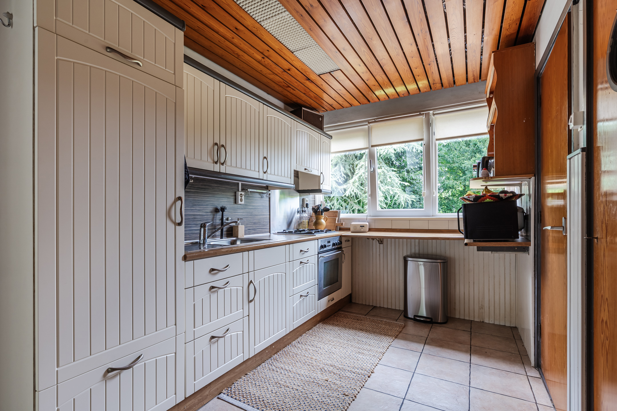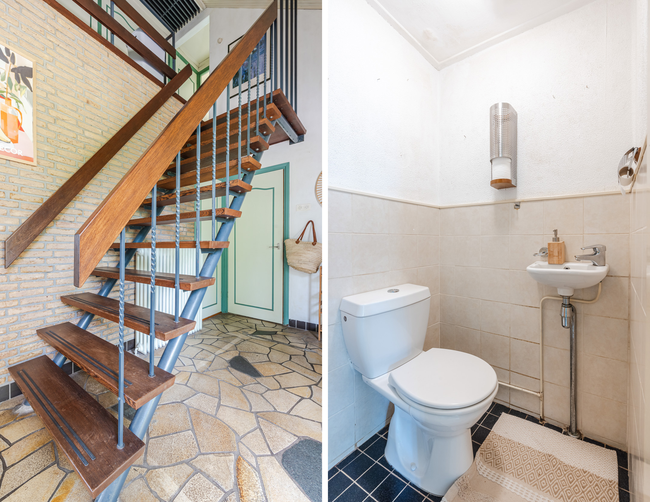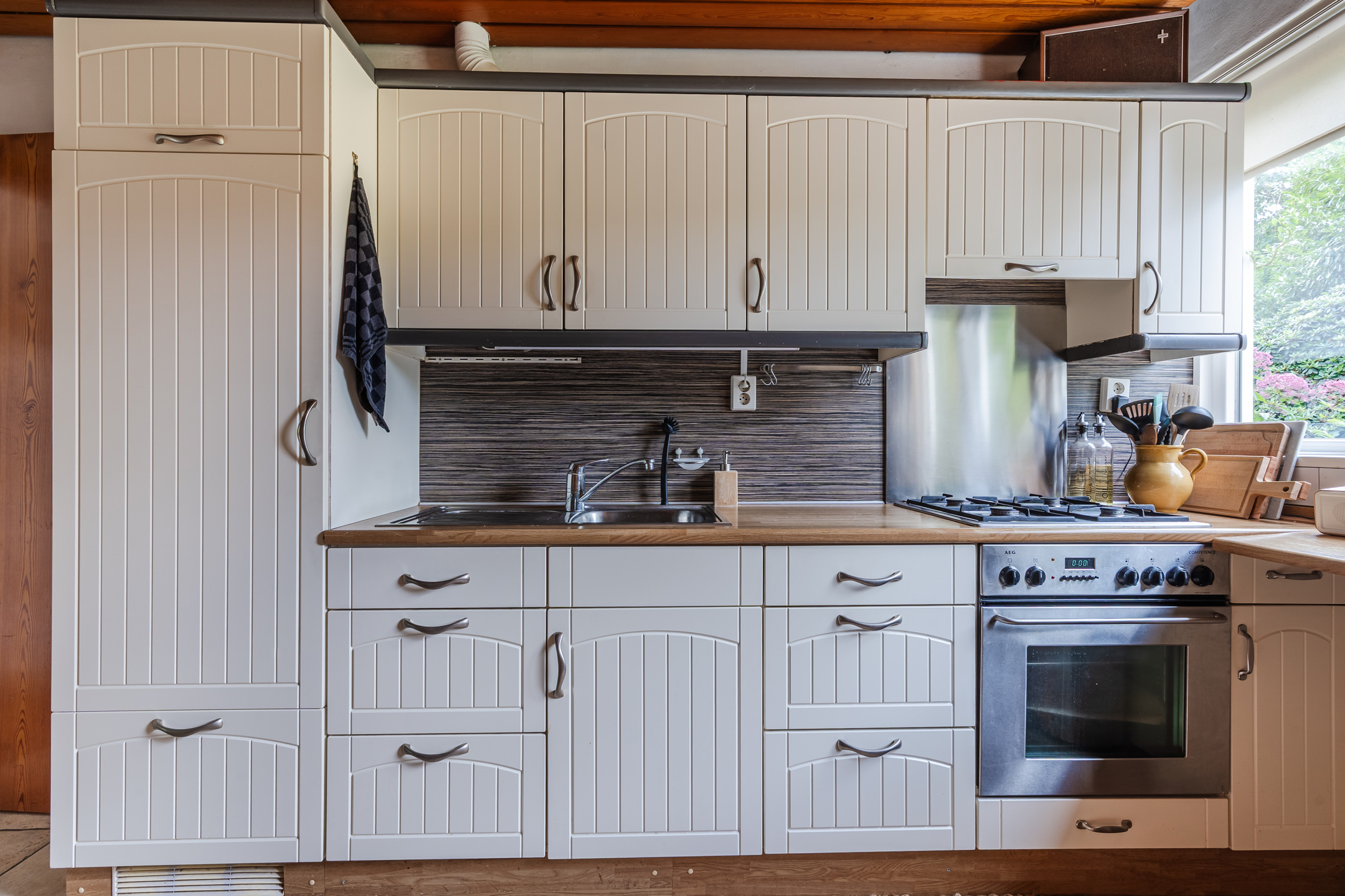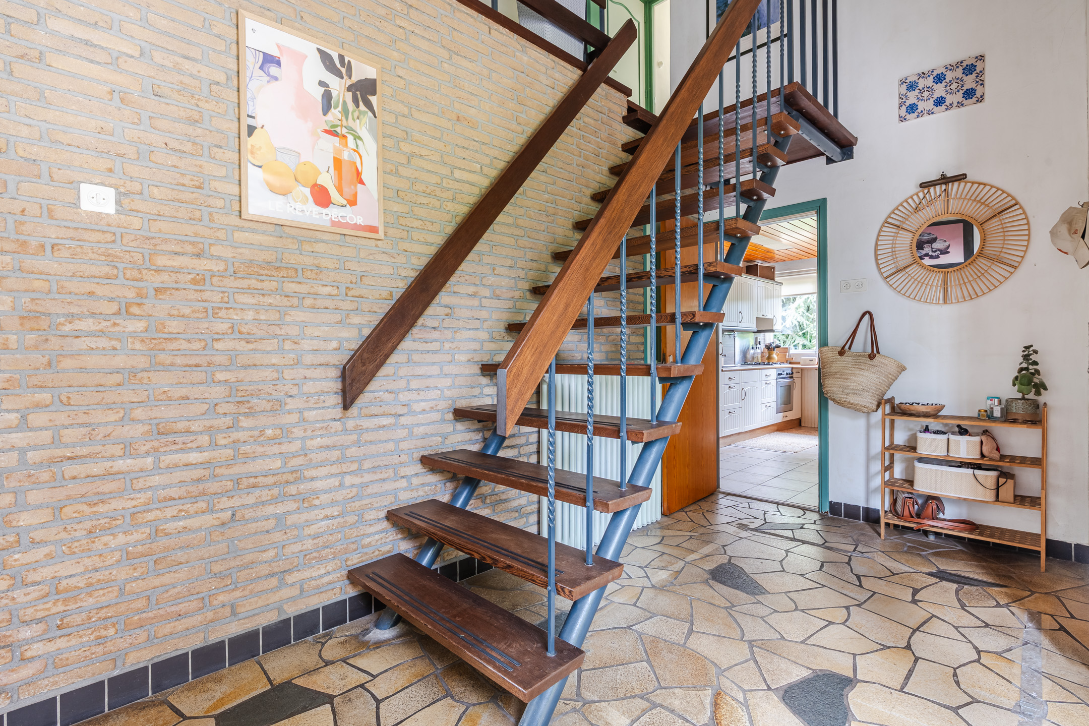 Ruime entree met toilet, gaderobekast en een vide, lichte L-vormige woonkamer met een erker en gashaard, slaapkamer met wastafel, eenvoudige dichte keuken met een provisiekelder en een doorgang naar de bijkeuken met witgoedaansluitingen en een doorgang naar de ruime inpandige garage met beloopbare bergzolder.