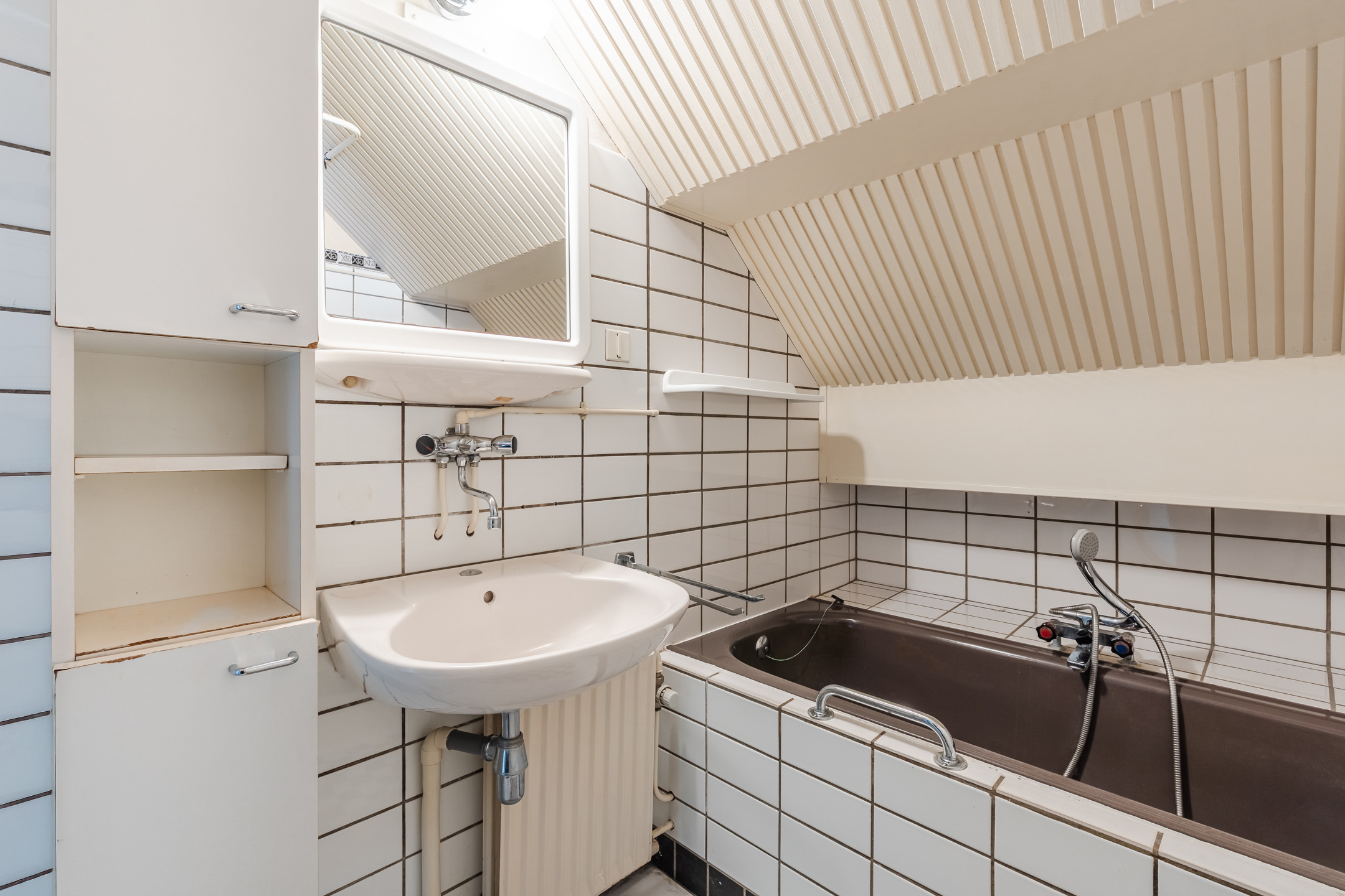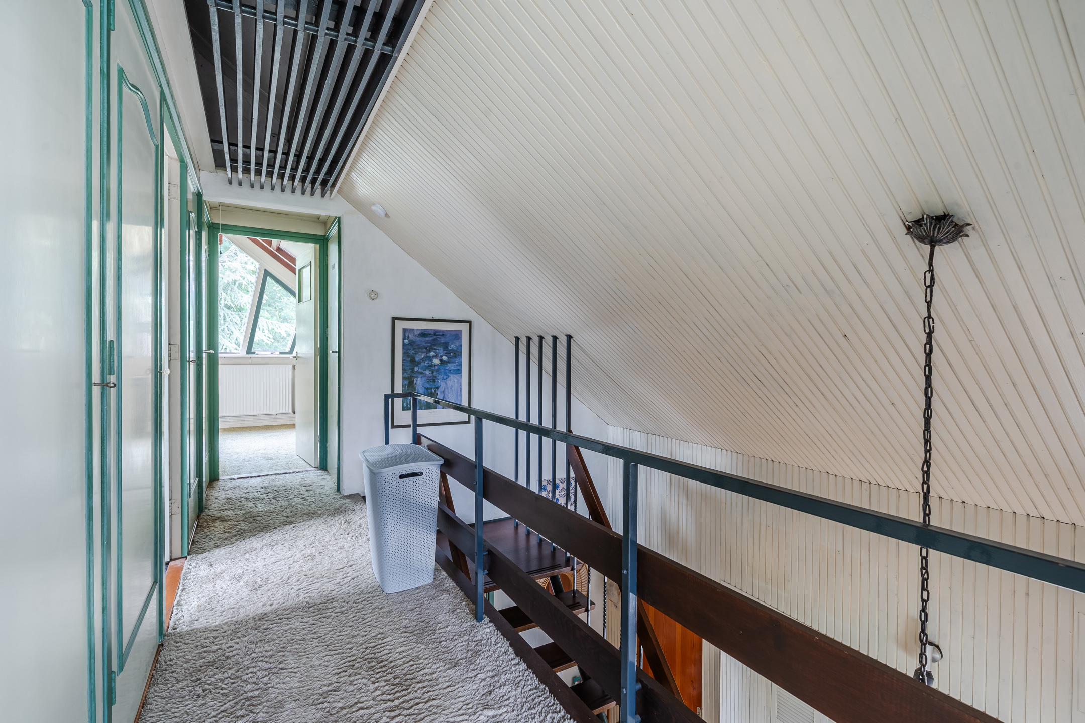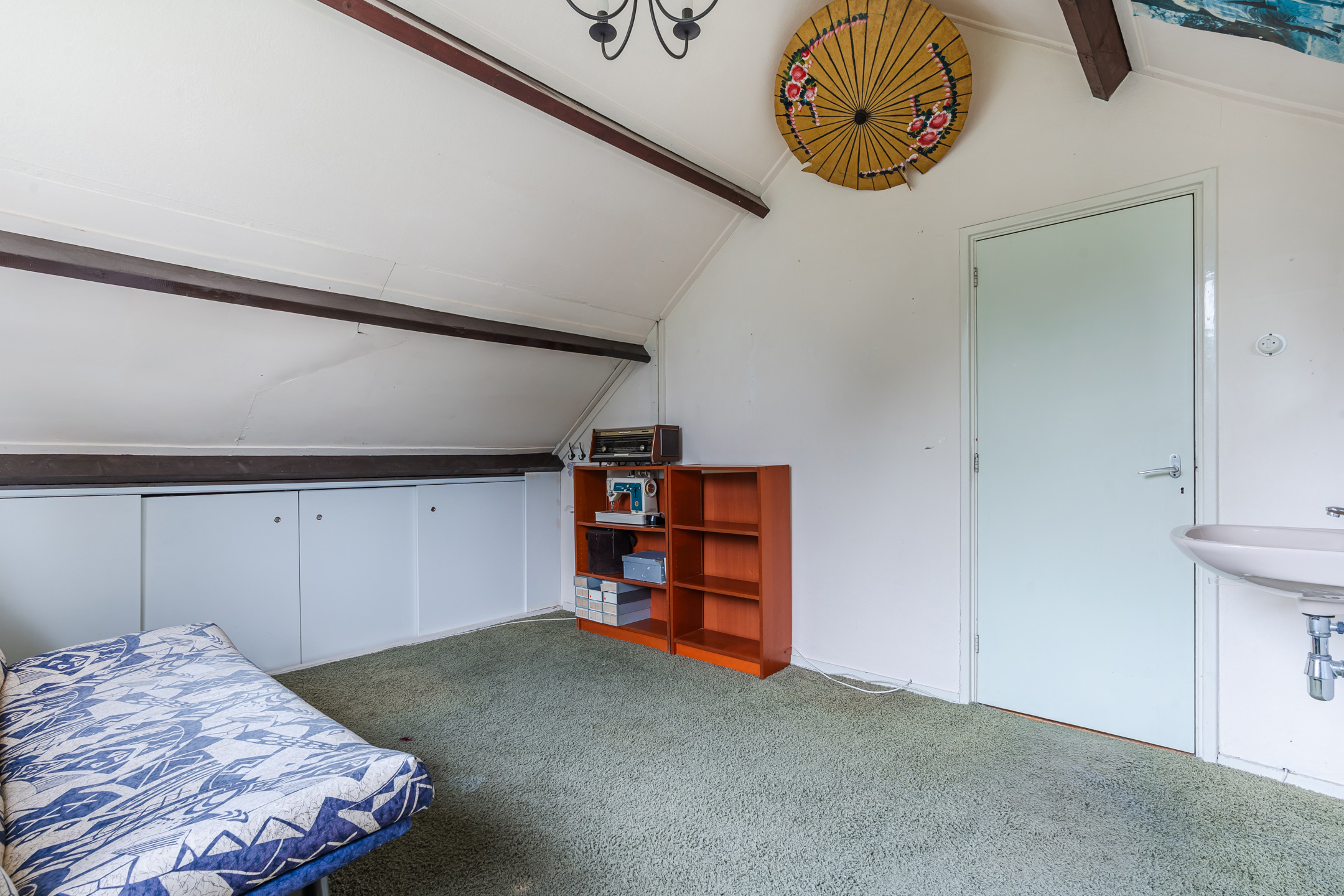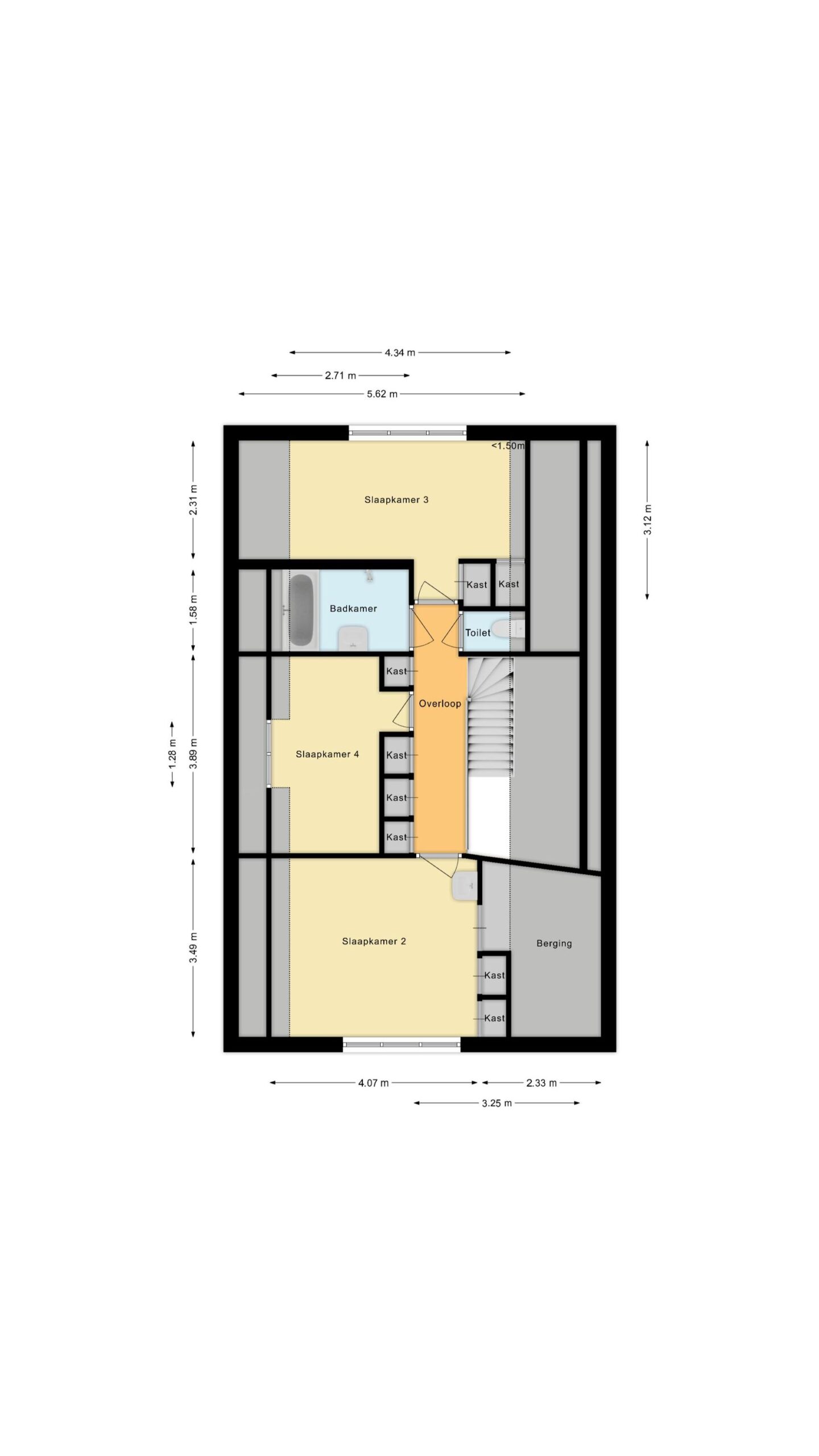Overloop met 4 vaste kasten en een toilet (sanibroyeur), 3 slaapkamers waarvan een met een dakkapel, badkamer met ligbad, douche en wastafel en een berging met CV-ketel.