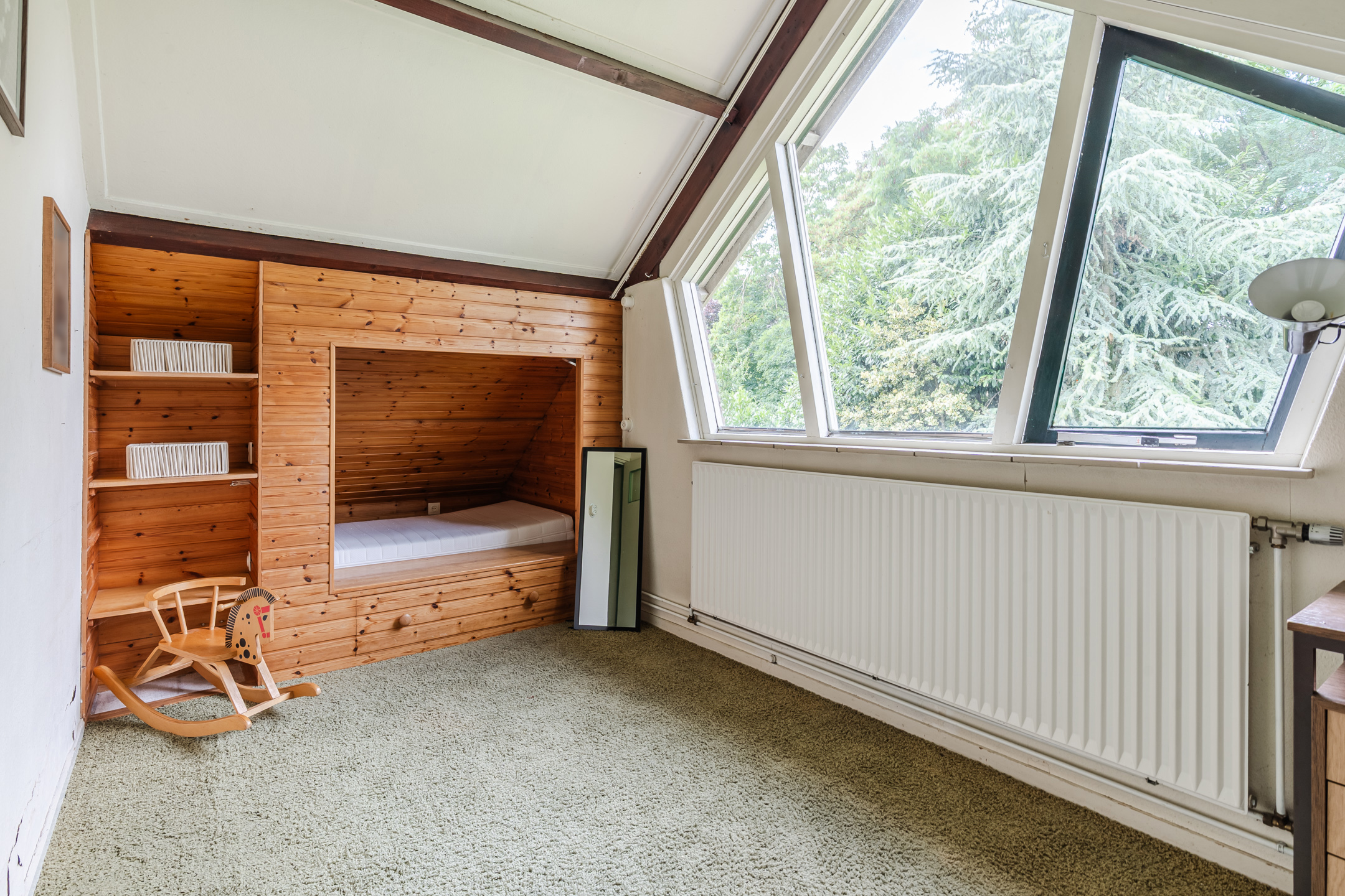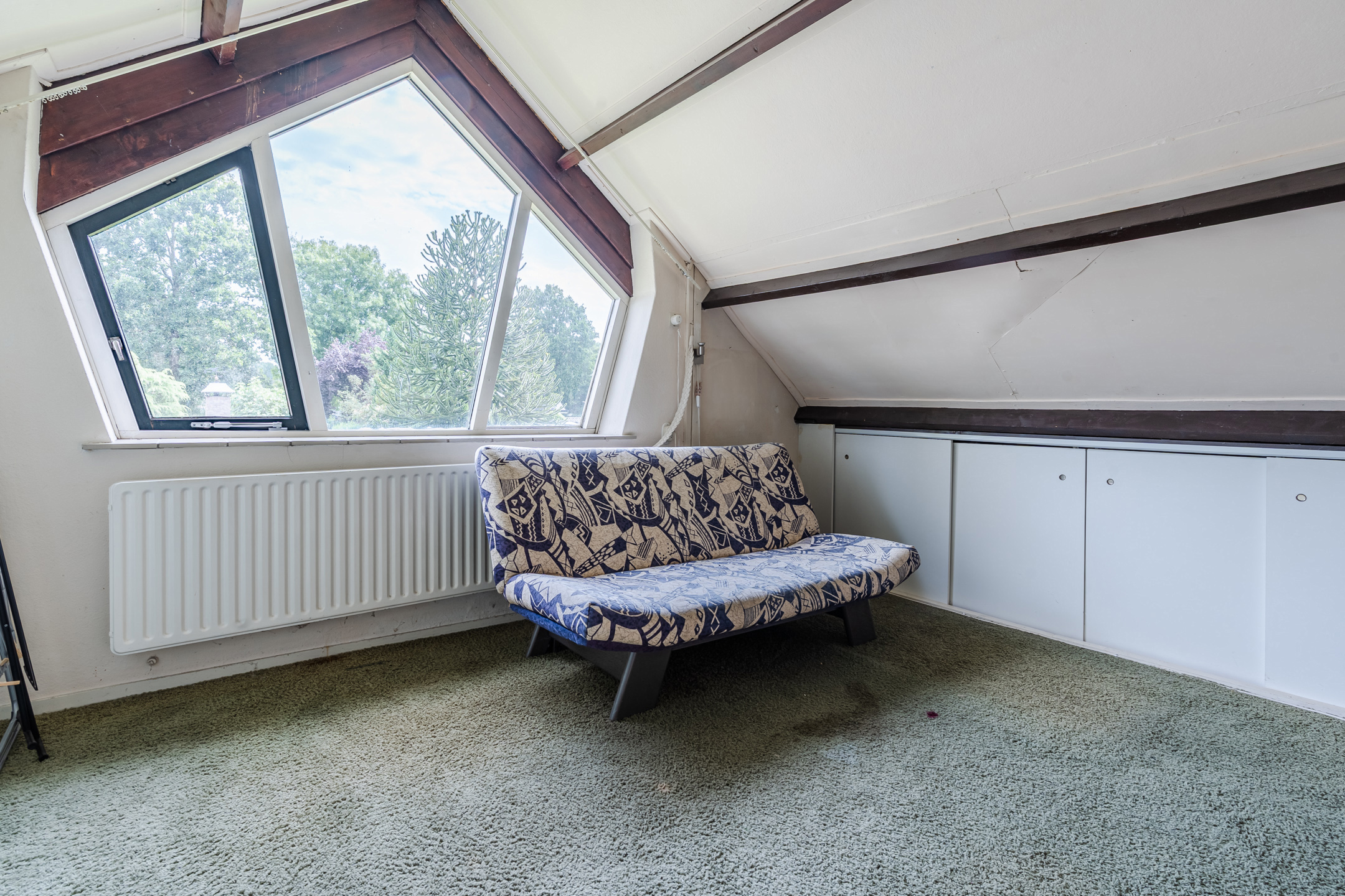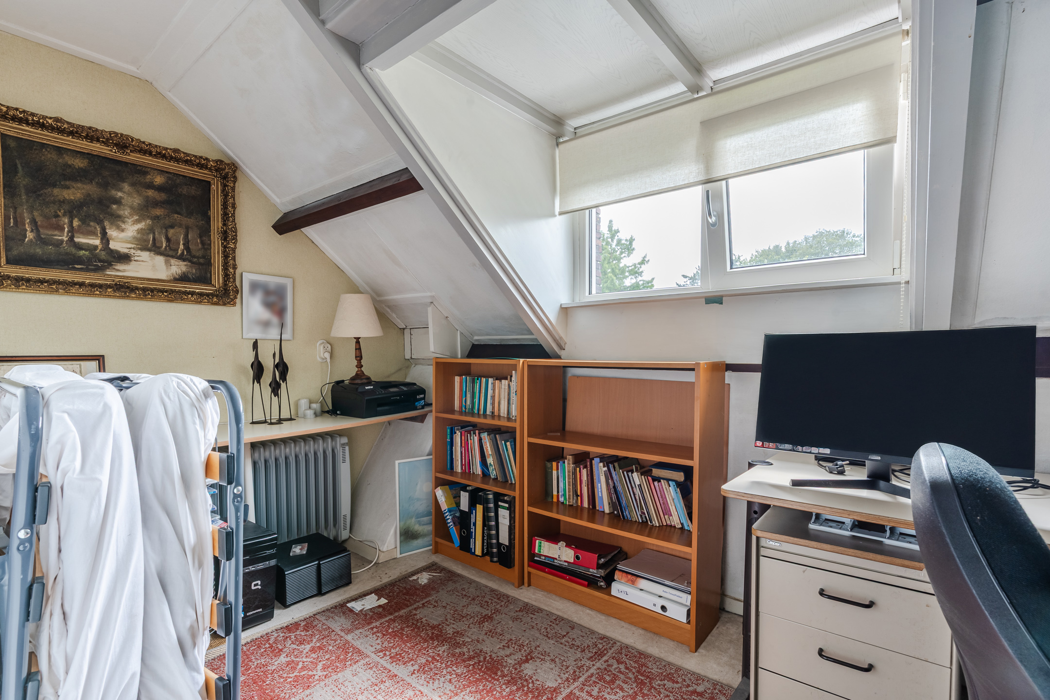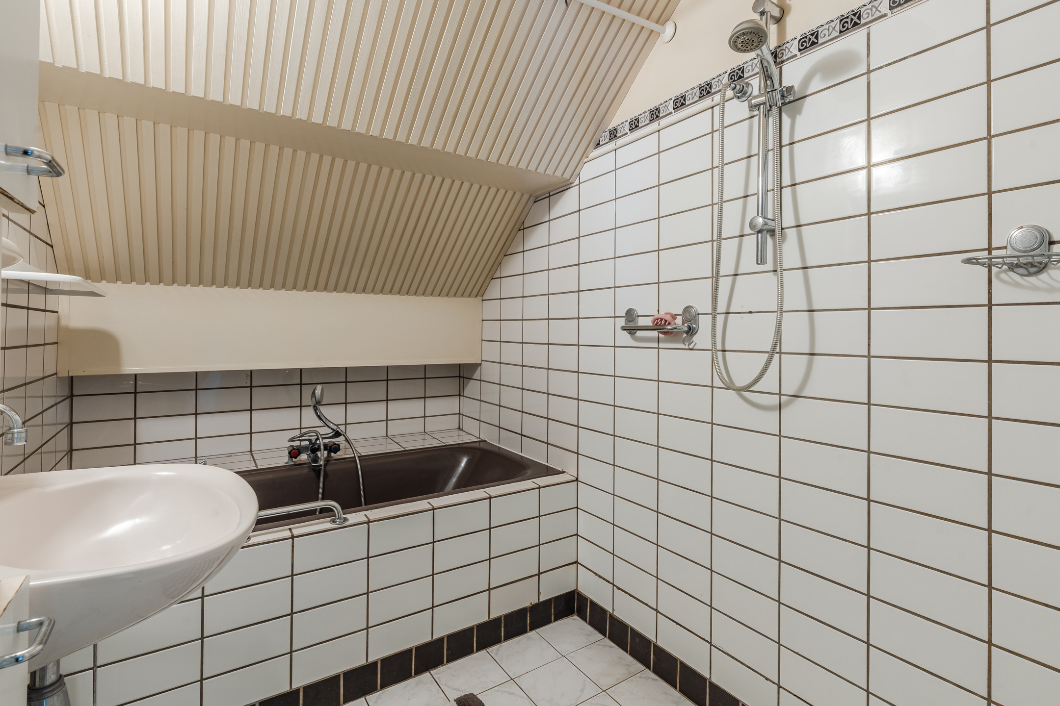 Overloop met 4 vaste kasten en een toilet (sanibroyeur), 3 slaapkamers waarvan een met een dakkapel, badkamer met ligbad, douche en wastafel en een berging met CV-ketel.