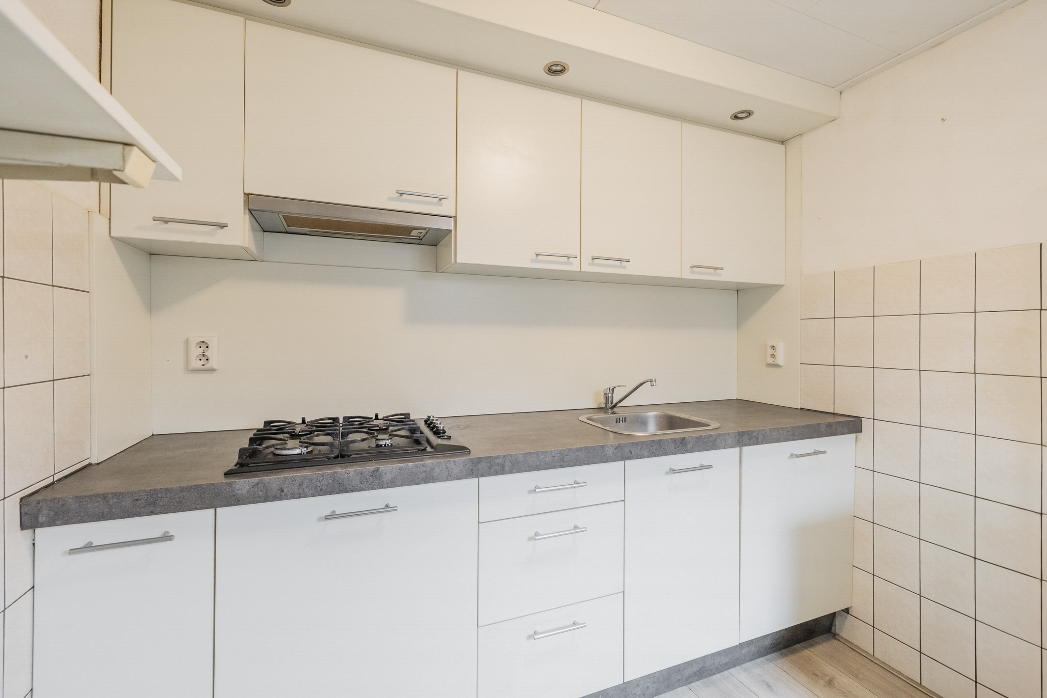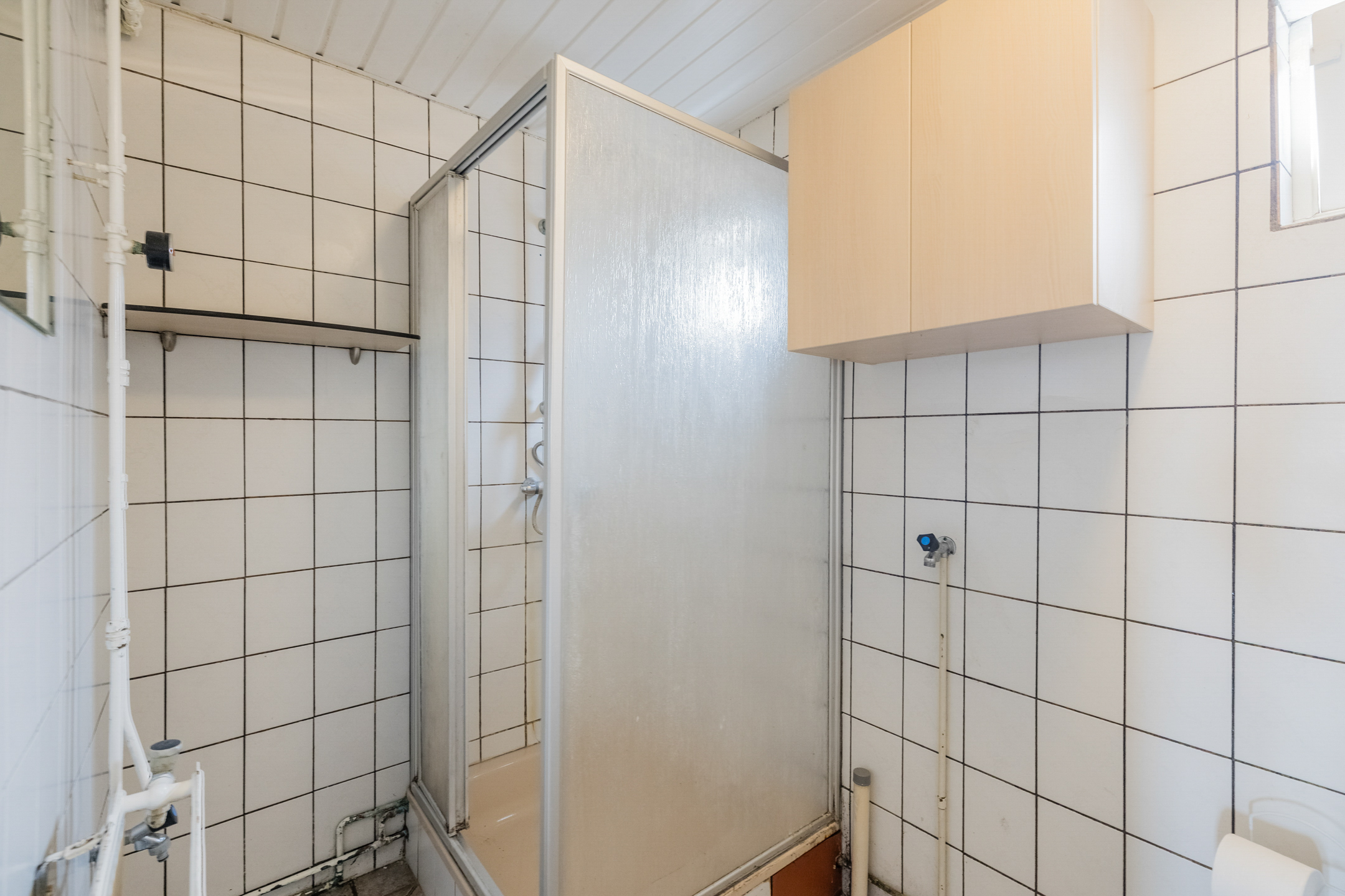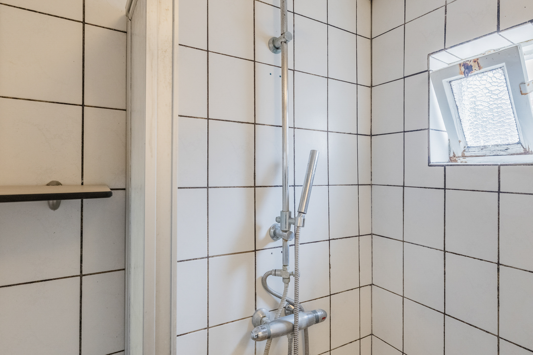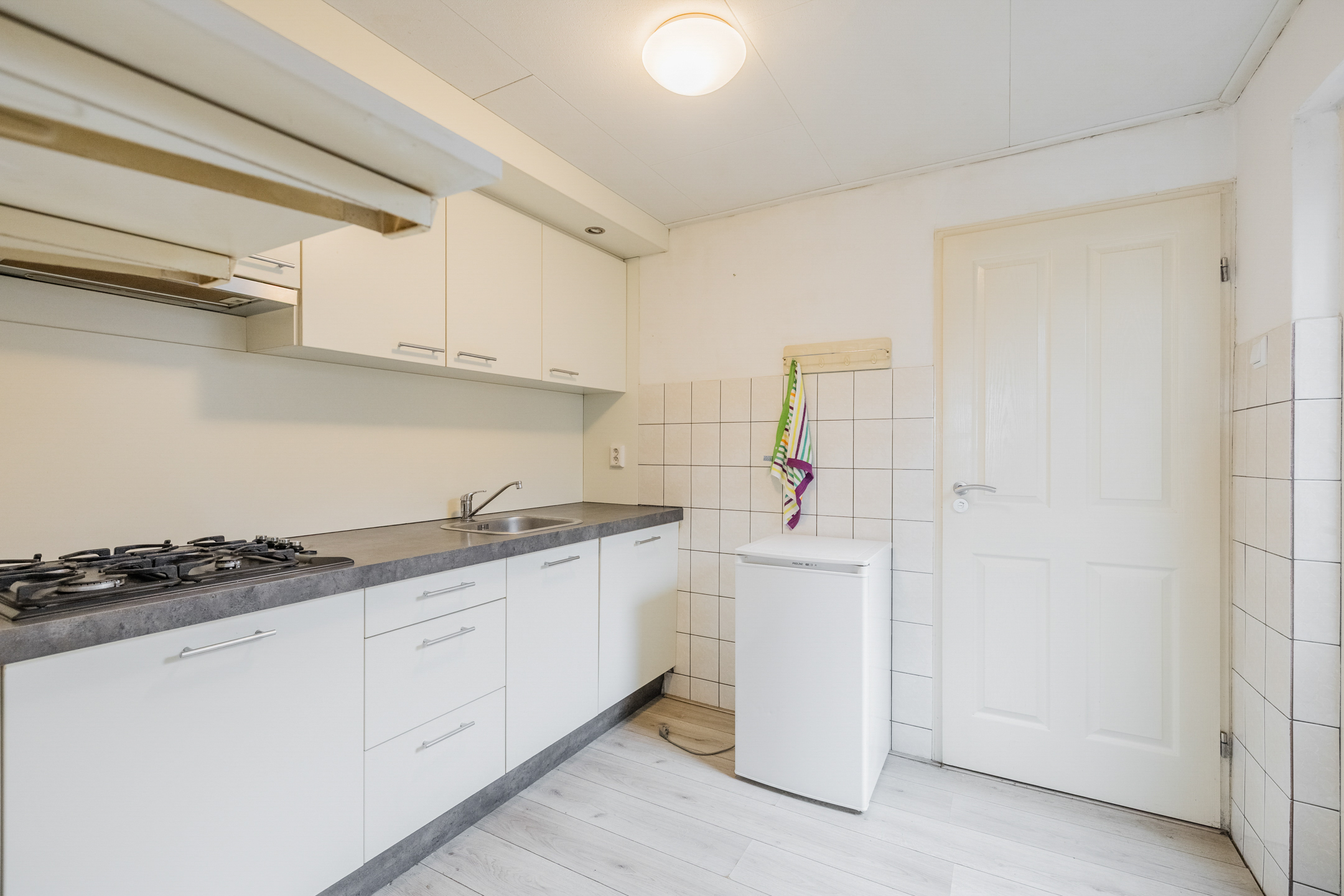 Entree, lichte woonkamer met trapkast, eenvoudige keuken met enig inbouwapparatuur maar biedt voldoende ruimte om naar eigen smaak te moderniseren en badkamer met douche en toilet.