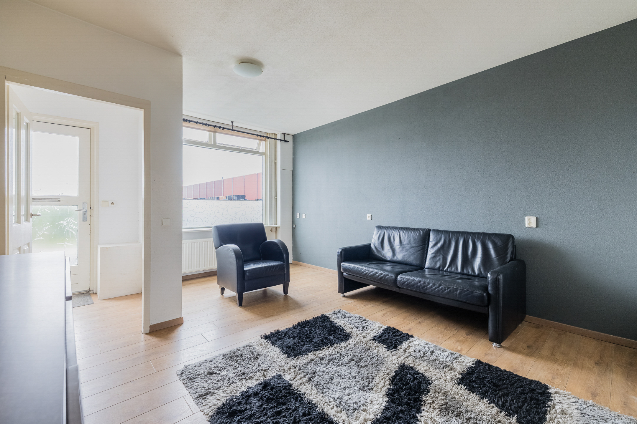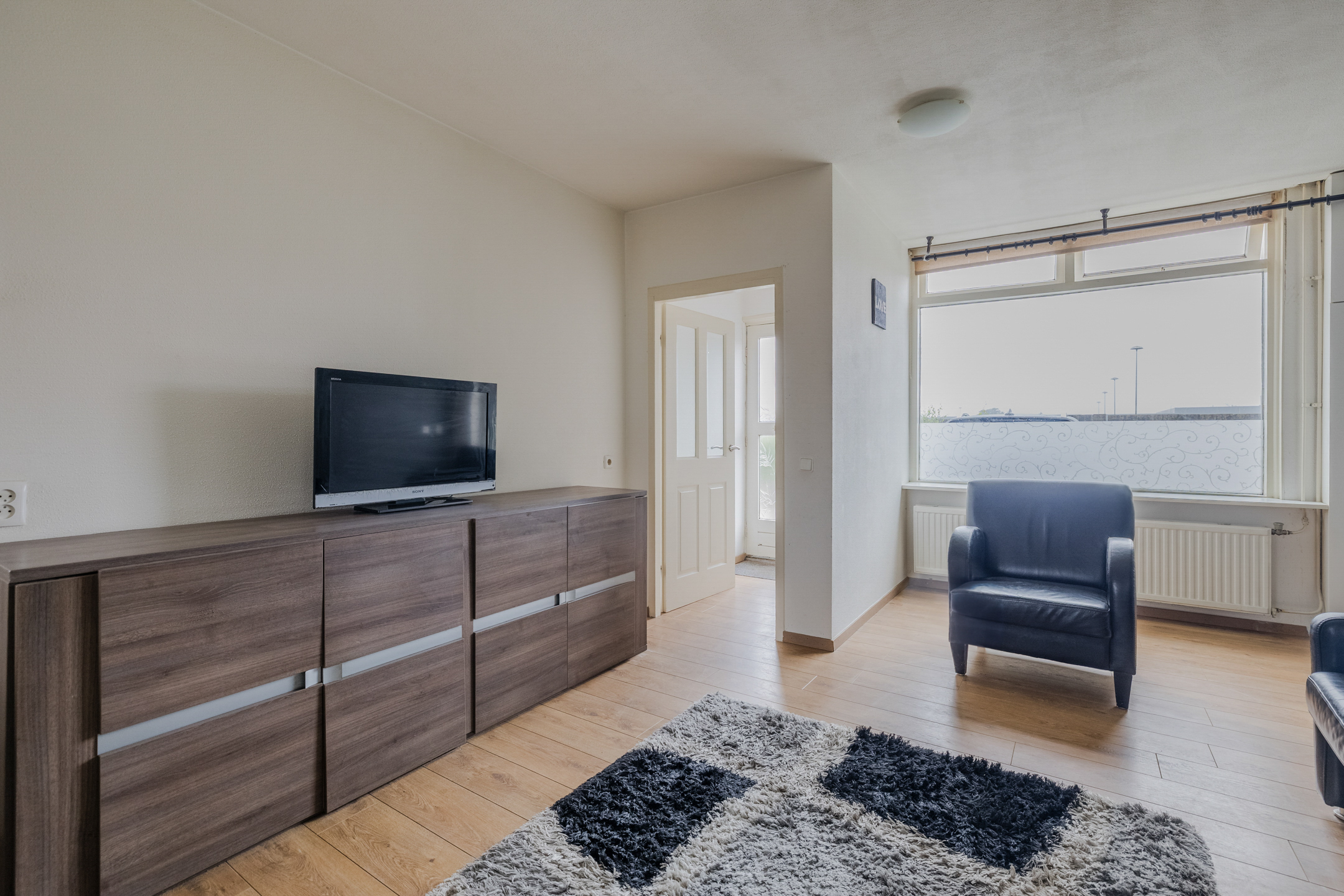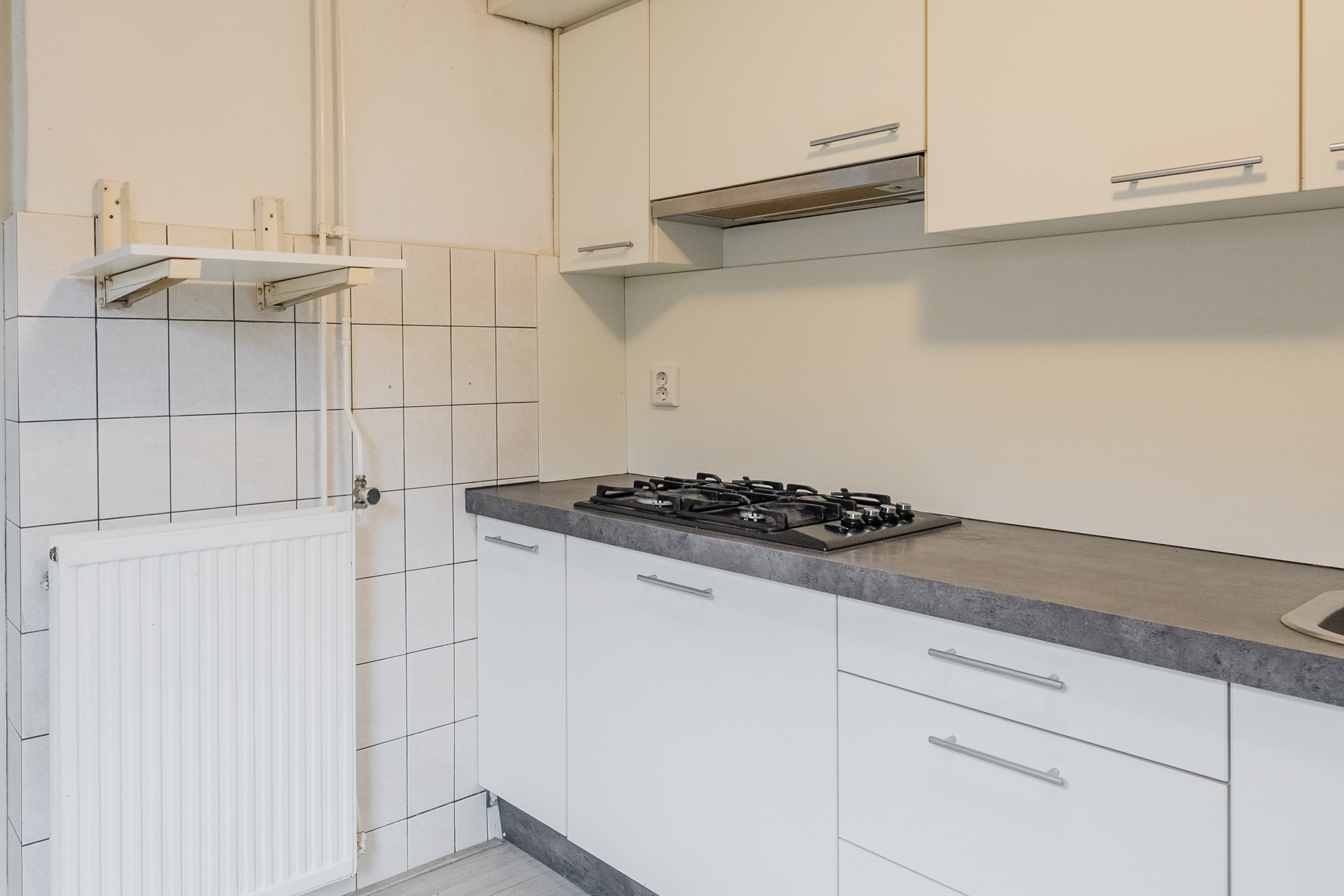 Entree, lichte woonkamer met trapkast, eenvoudige keuken met enig inbouwapparatuur maar biedt voldoende ruimte om naar eigen smaak te moderniseren en badkamer met douche en toilet.