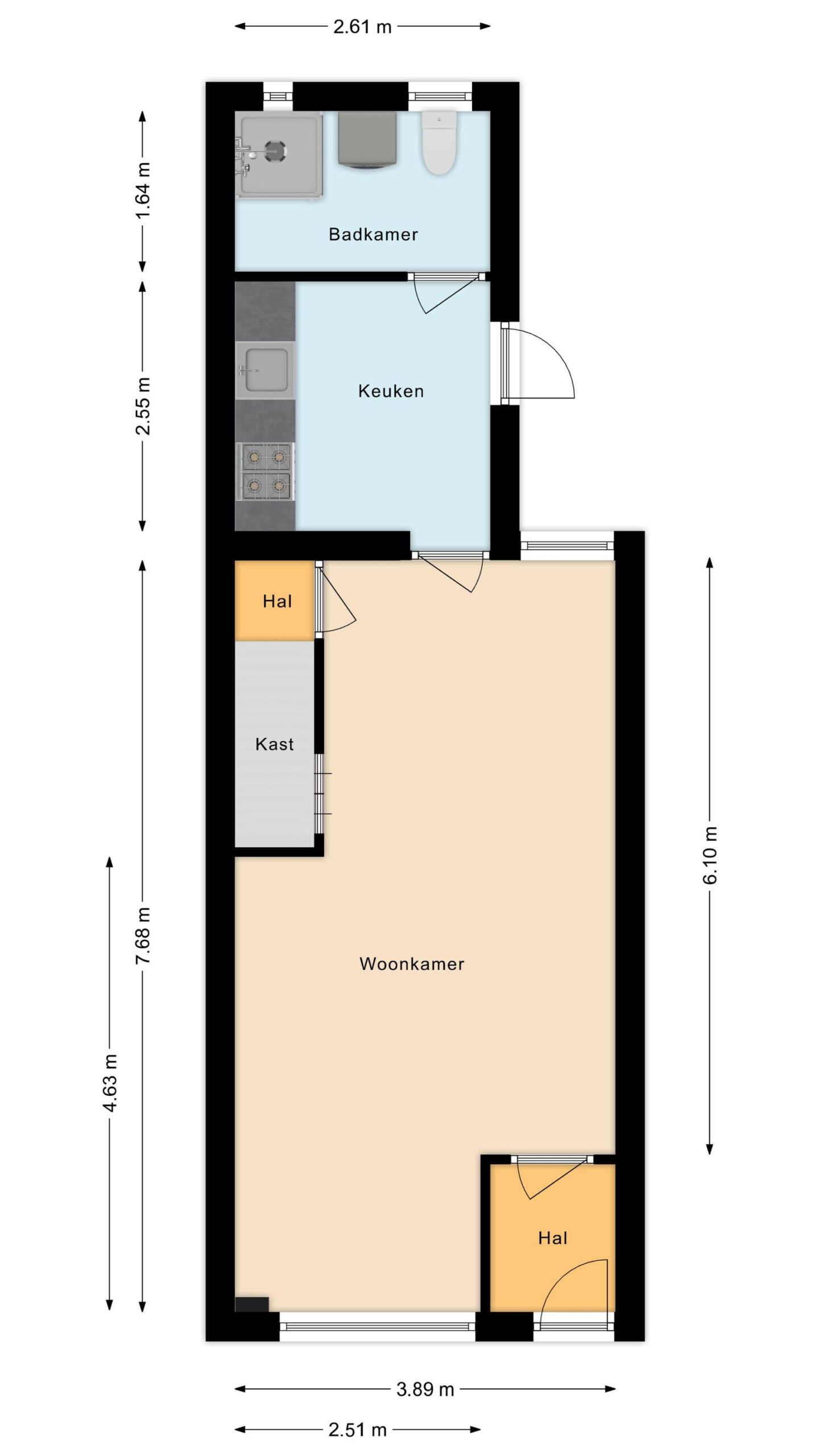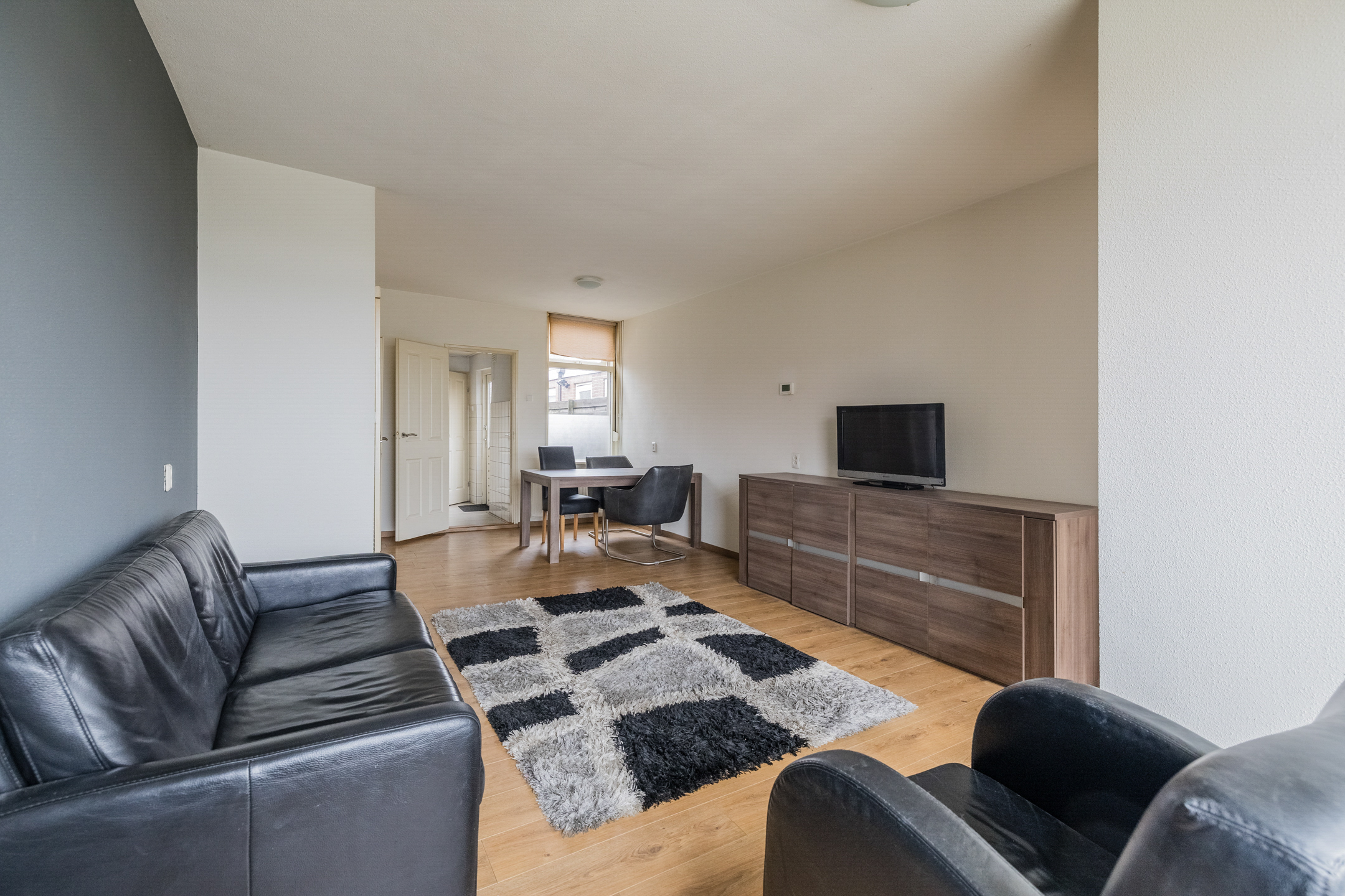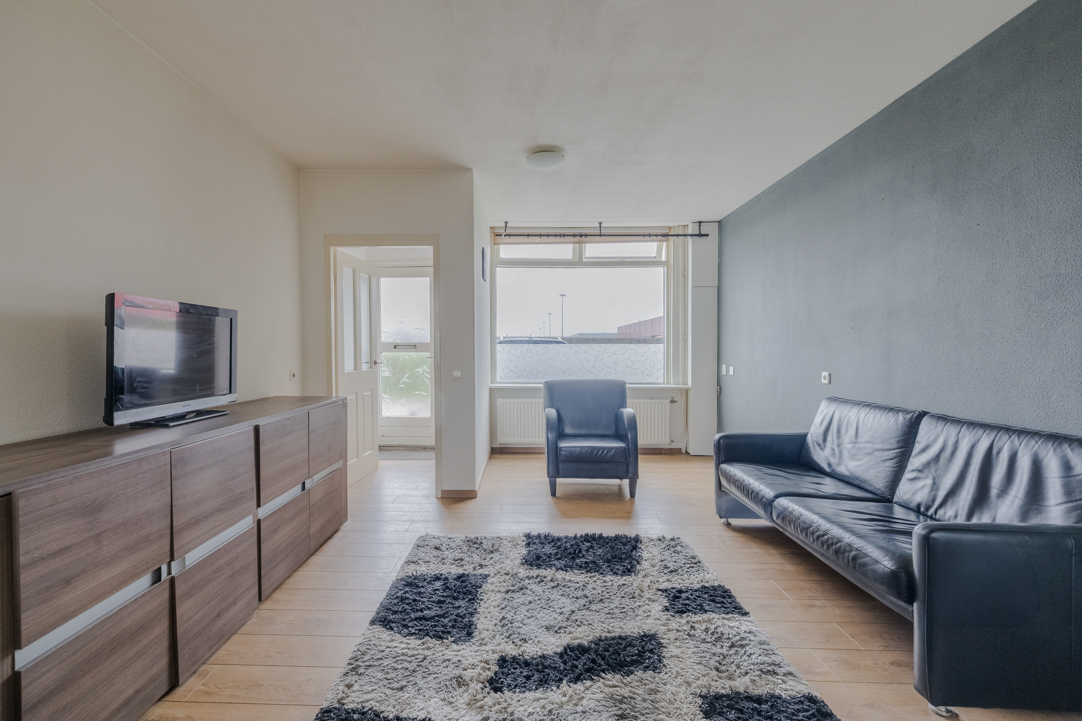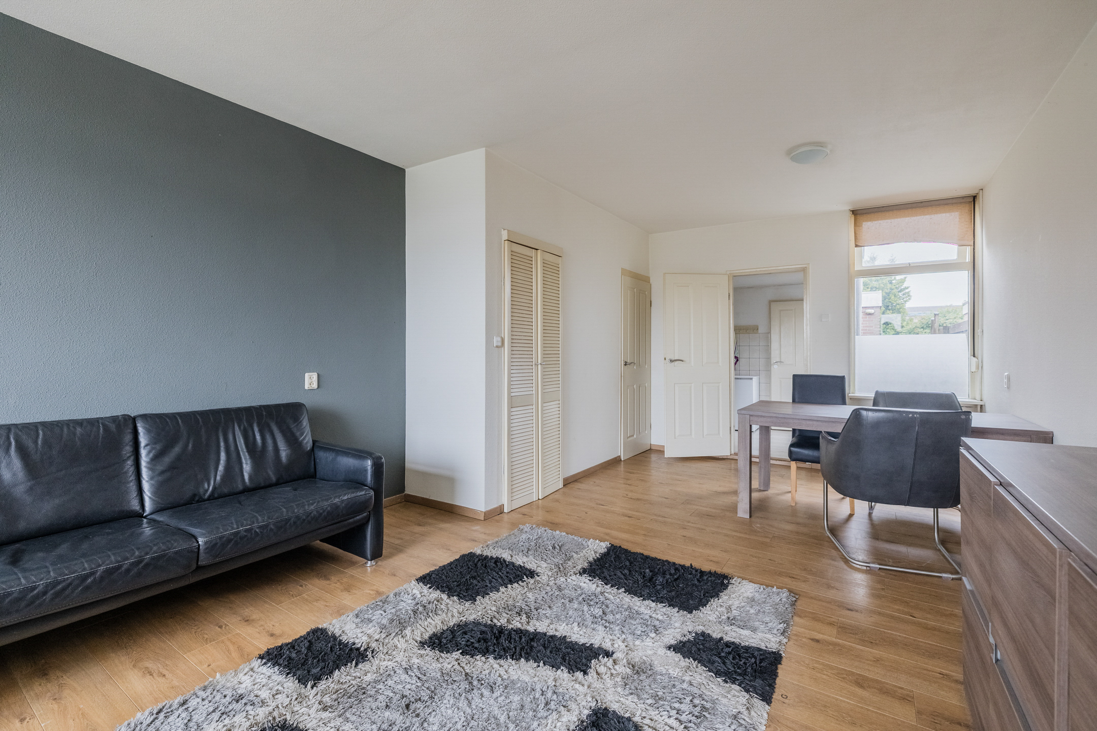 Entree, lichte woonkamer met trapkast, eenvoudige keuken met enig inbouwapparatuur maar biedt voldoende ruimte om naar eigen smaak te moderniseren en badkamer met douche en toilet.