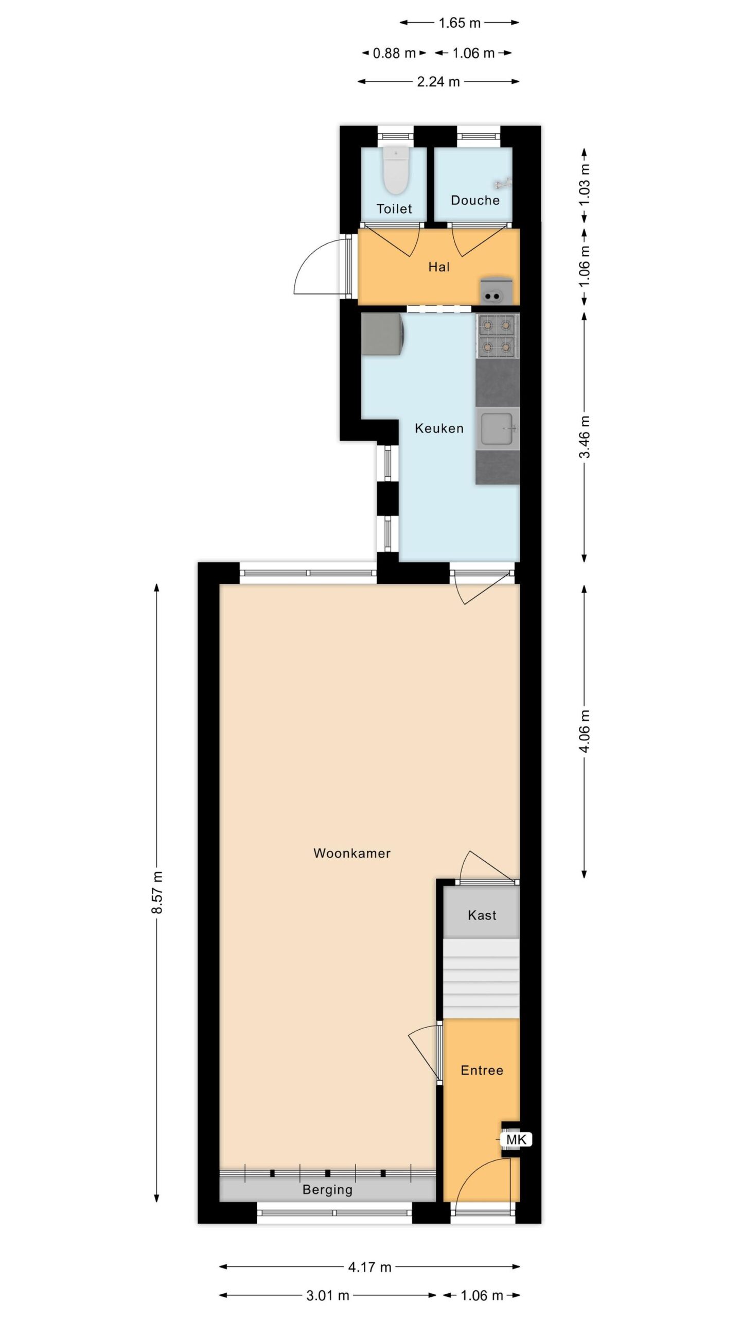 Entree met meterkast en trapopgang. Sfeervolle woonkamer met trapkast, gesloten keuken met enig inbouwapparatuur, achter entree met cv opstelling, badkamer met douche en separaat toilet.