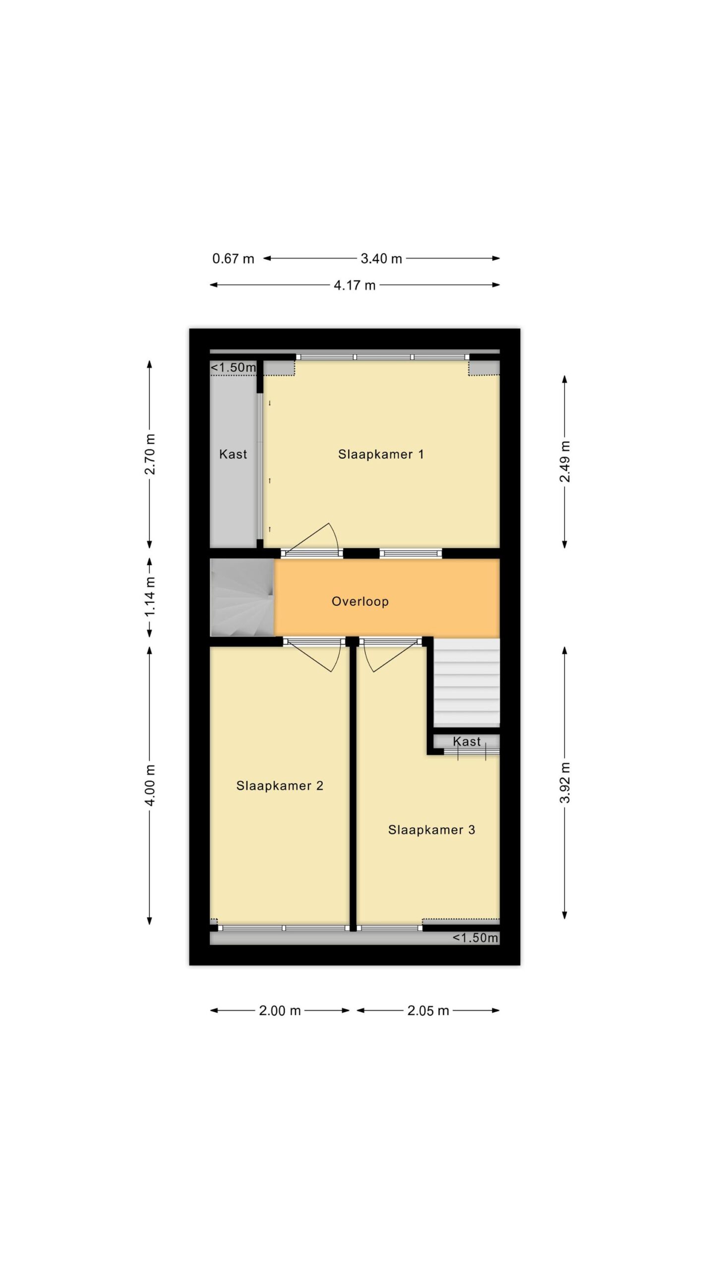 Overloop en 3 slaapkamers waarvan 1 met vaste kast.