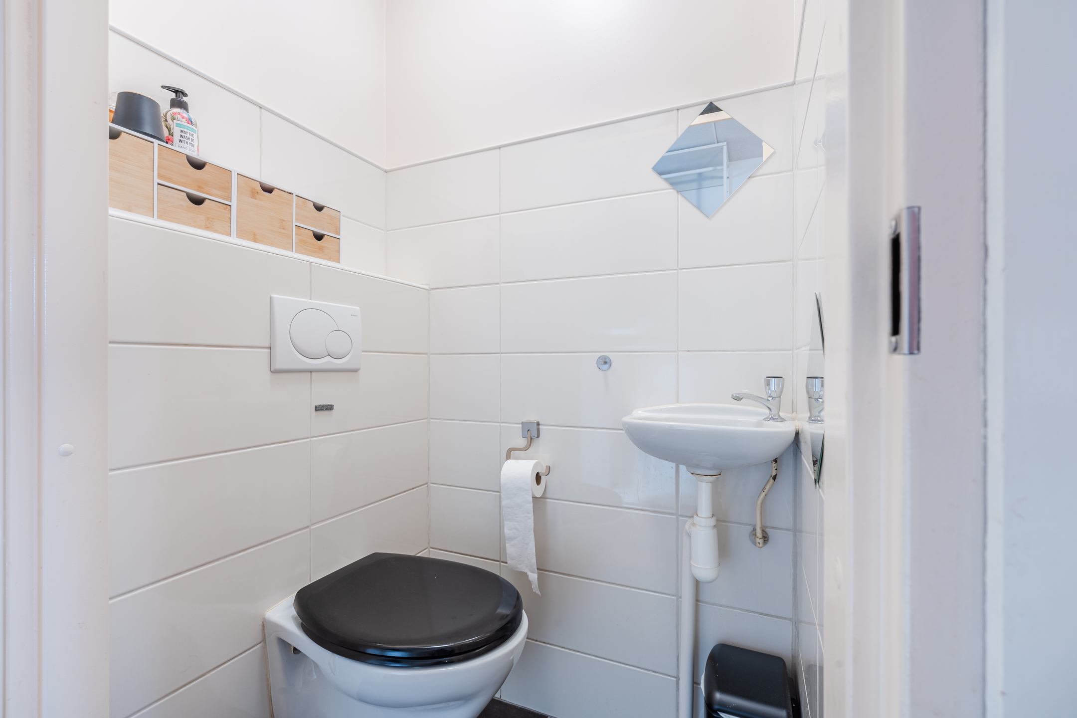 Entree in de garage met bergzolder, hal met vernieuwde meterkast (2023), toiletruimte met fontein en trapopgang.