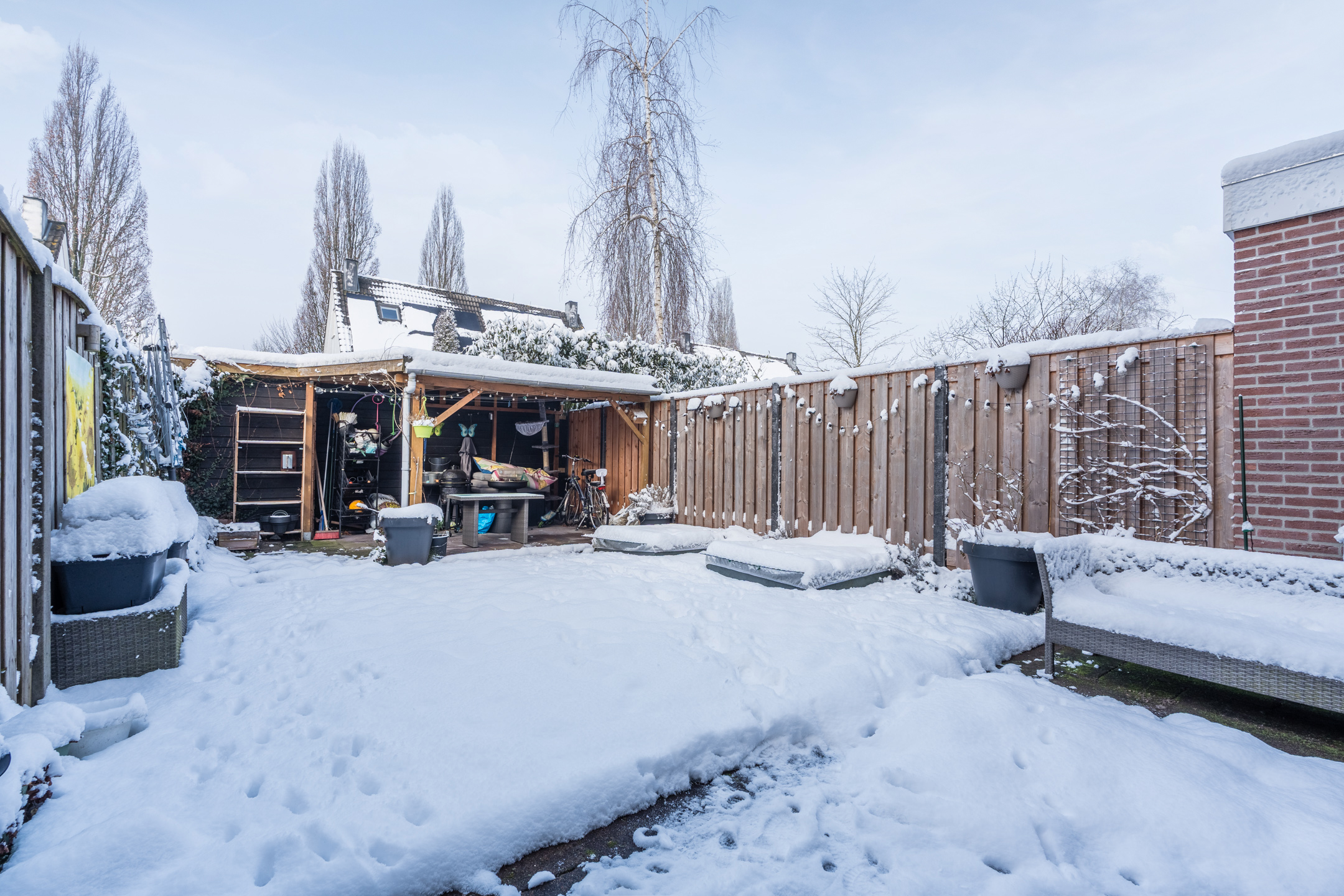 Vanuit de woonkamer en doormiddel van een achterom heb je toegang tot de op het westen gelegen tuin met een overkapping en een praktische/ kleine houten berging.