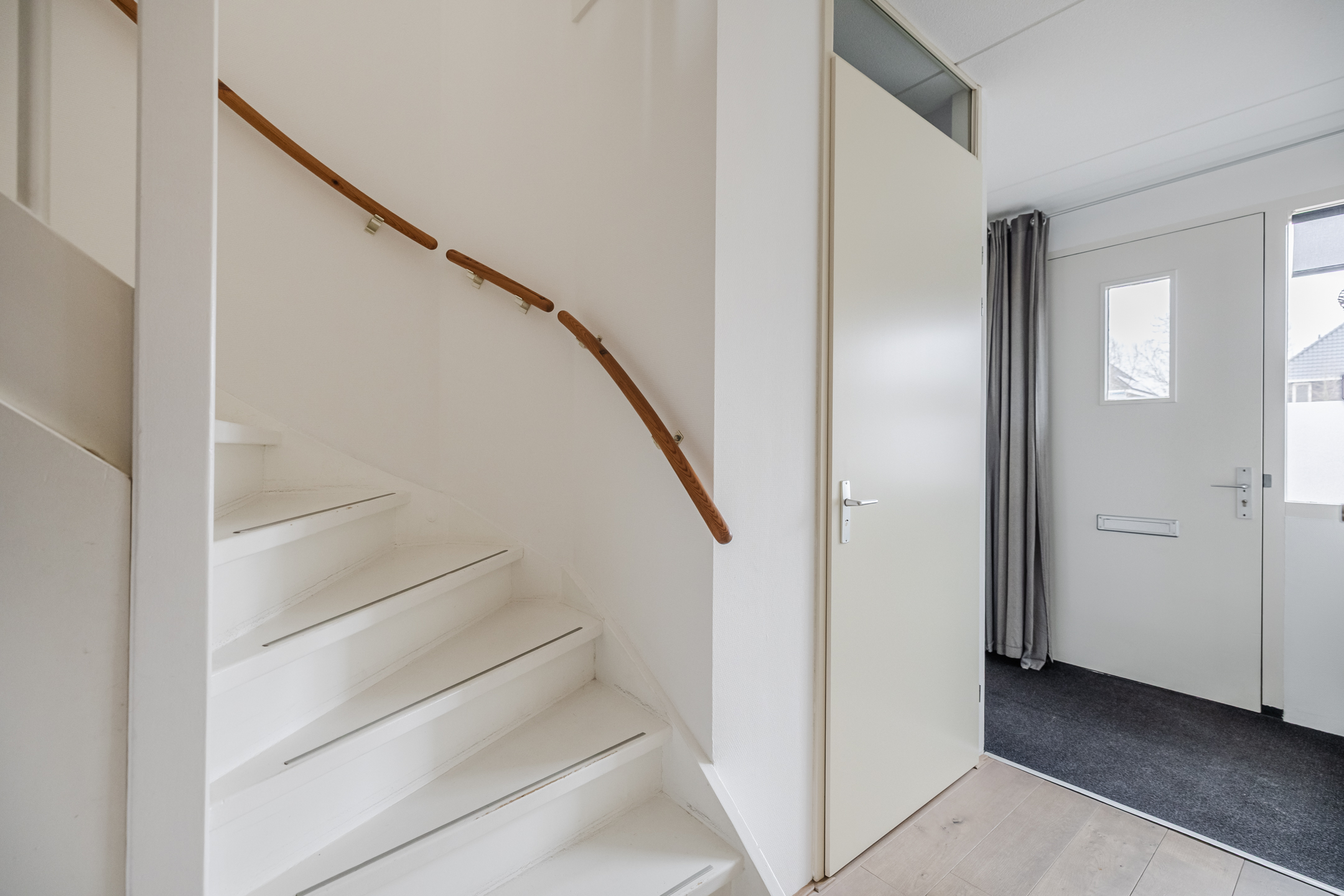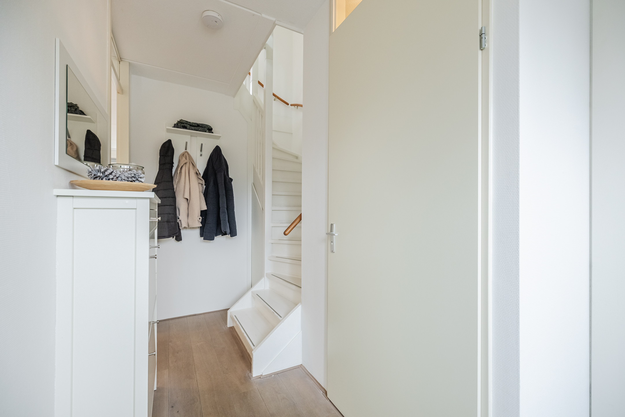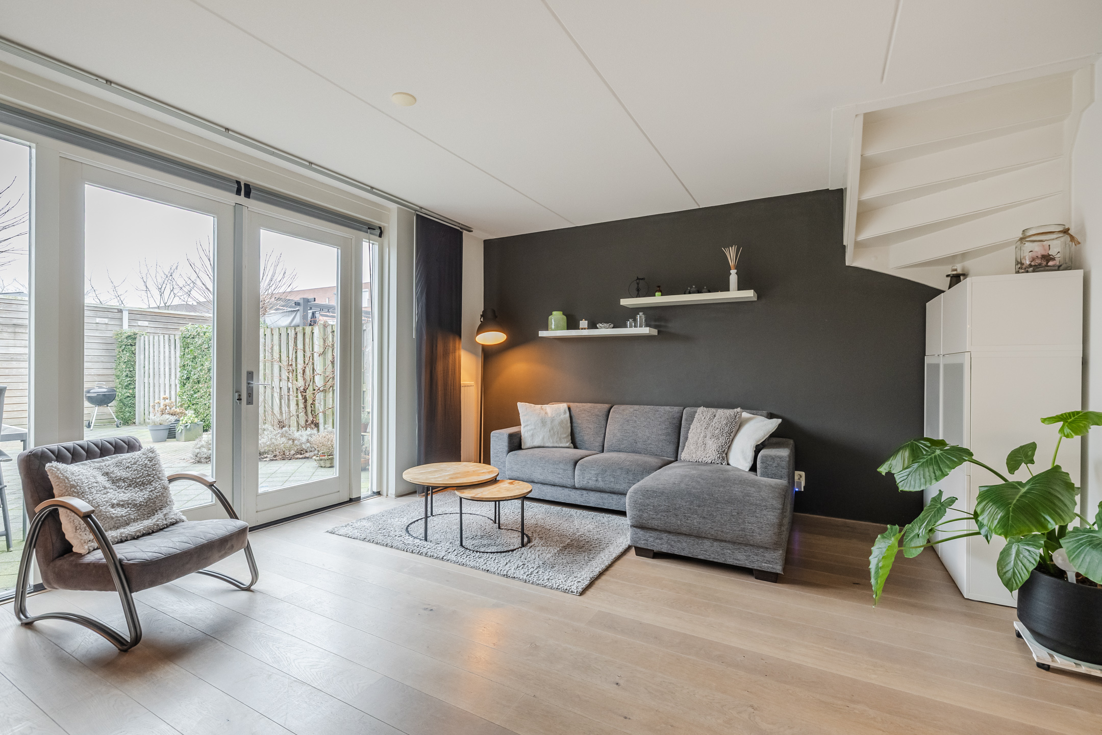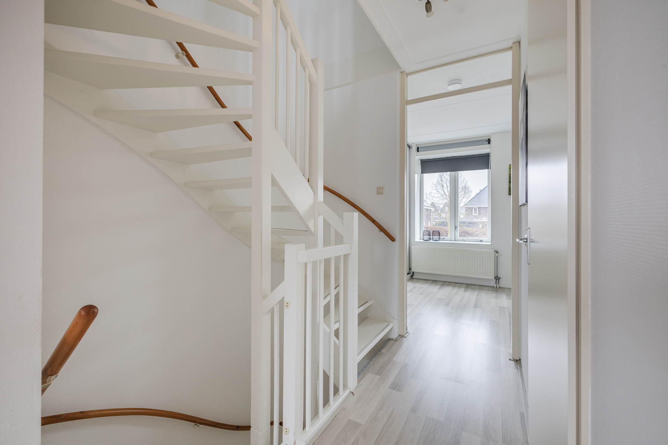 Entree met toilet, meterkast en trapopgang. De lichte en tuingerichte woonkamer is voorzien van een praktische trapkast, fraaie houten vloer en openslaande deuren naar de achtertuin met zonnescherm, achterom en berging.
