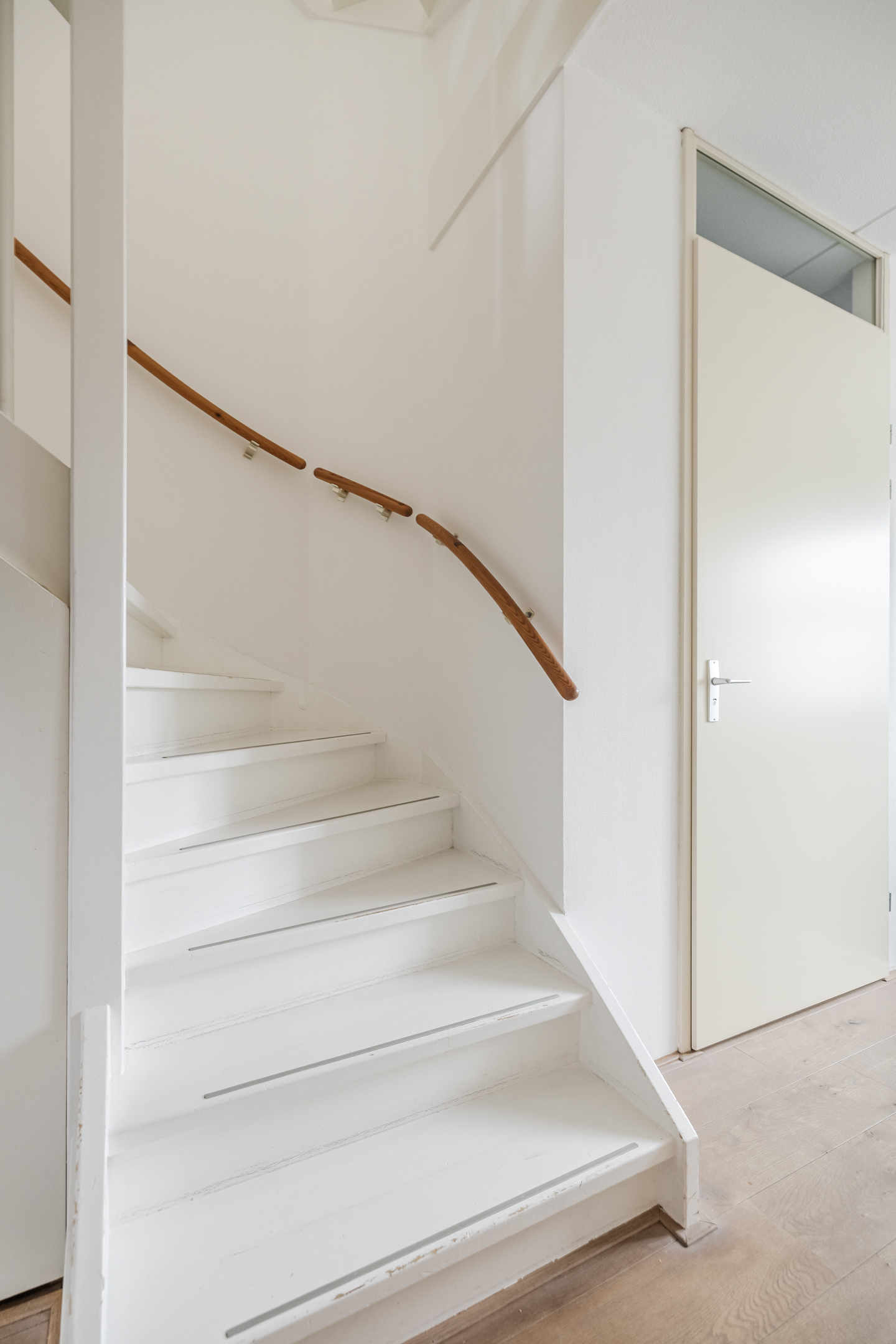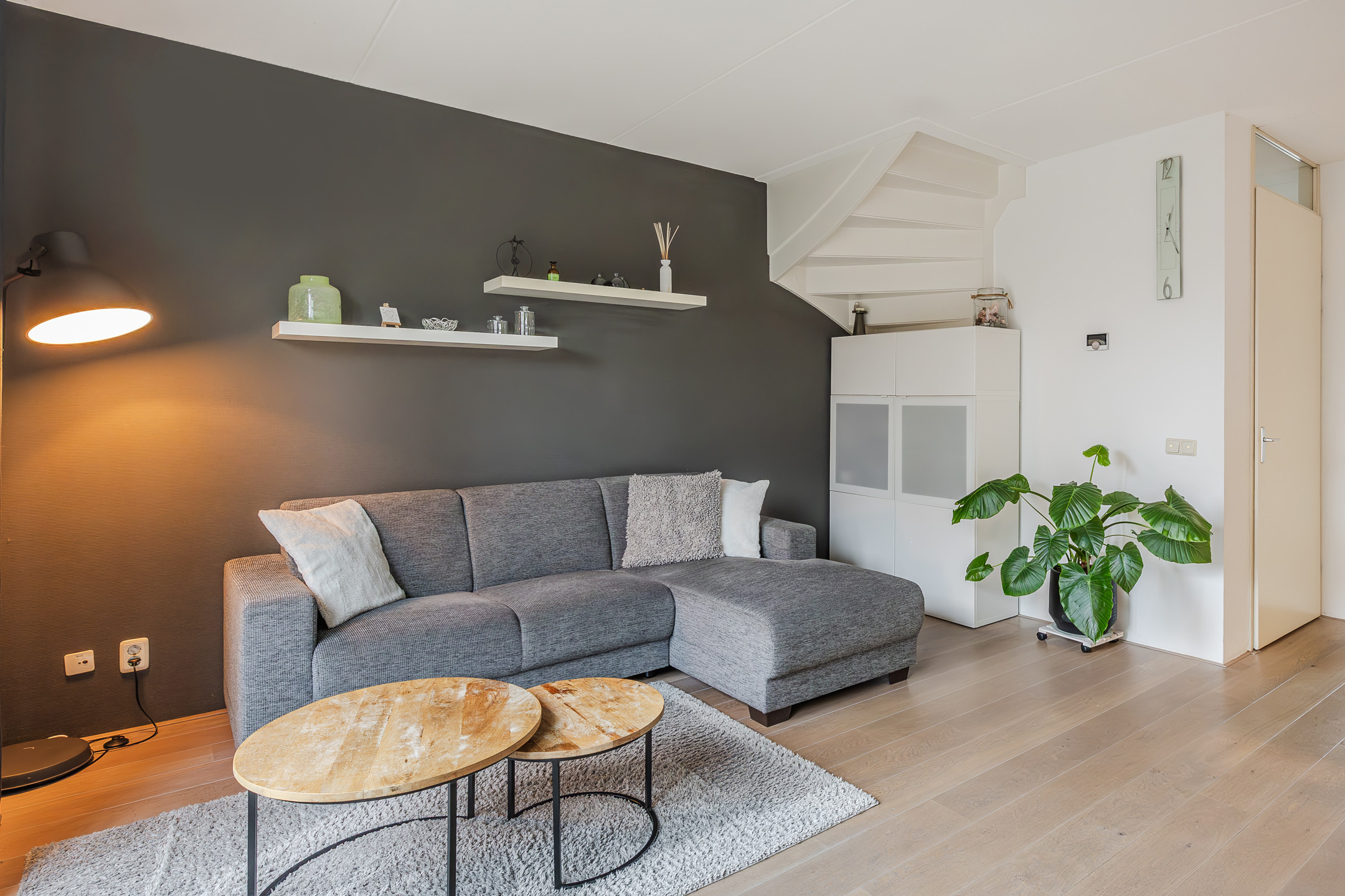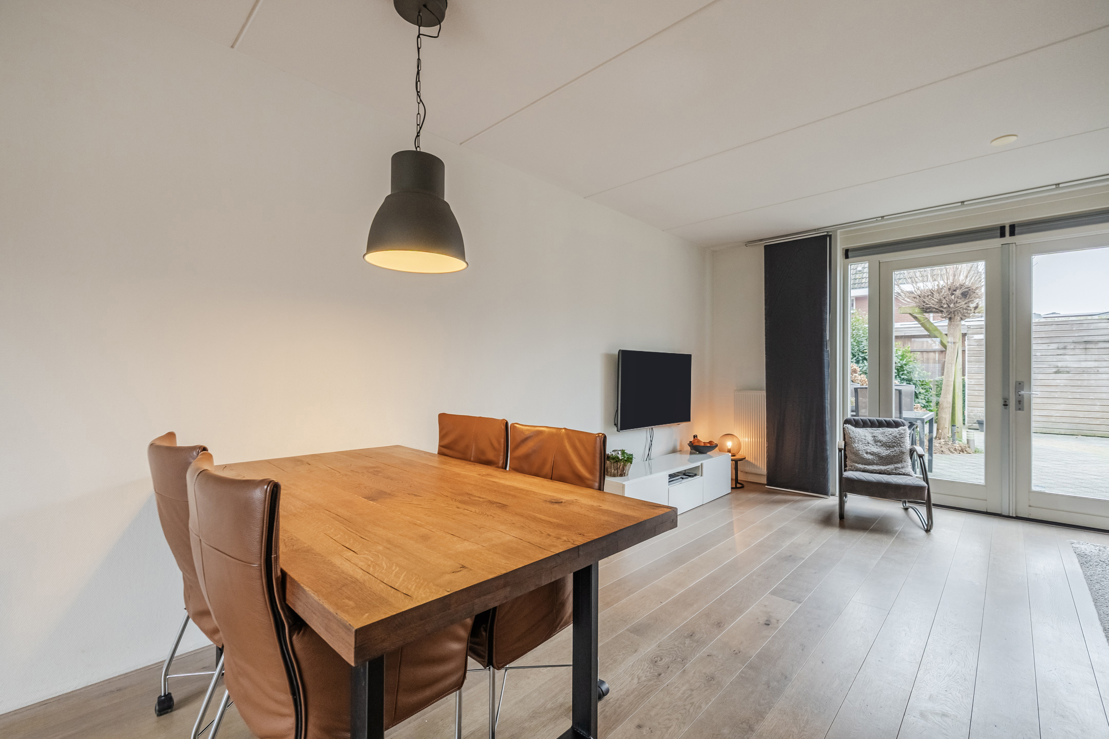 Entree met toilet, meterkast en trapopgang. De lichte en tuingerichte woonkamer is voorzien van een praktische trapkast, fraaie houten vloer en openslaande deuren naar de achtertuin met zonnescherm, achterom en berging.