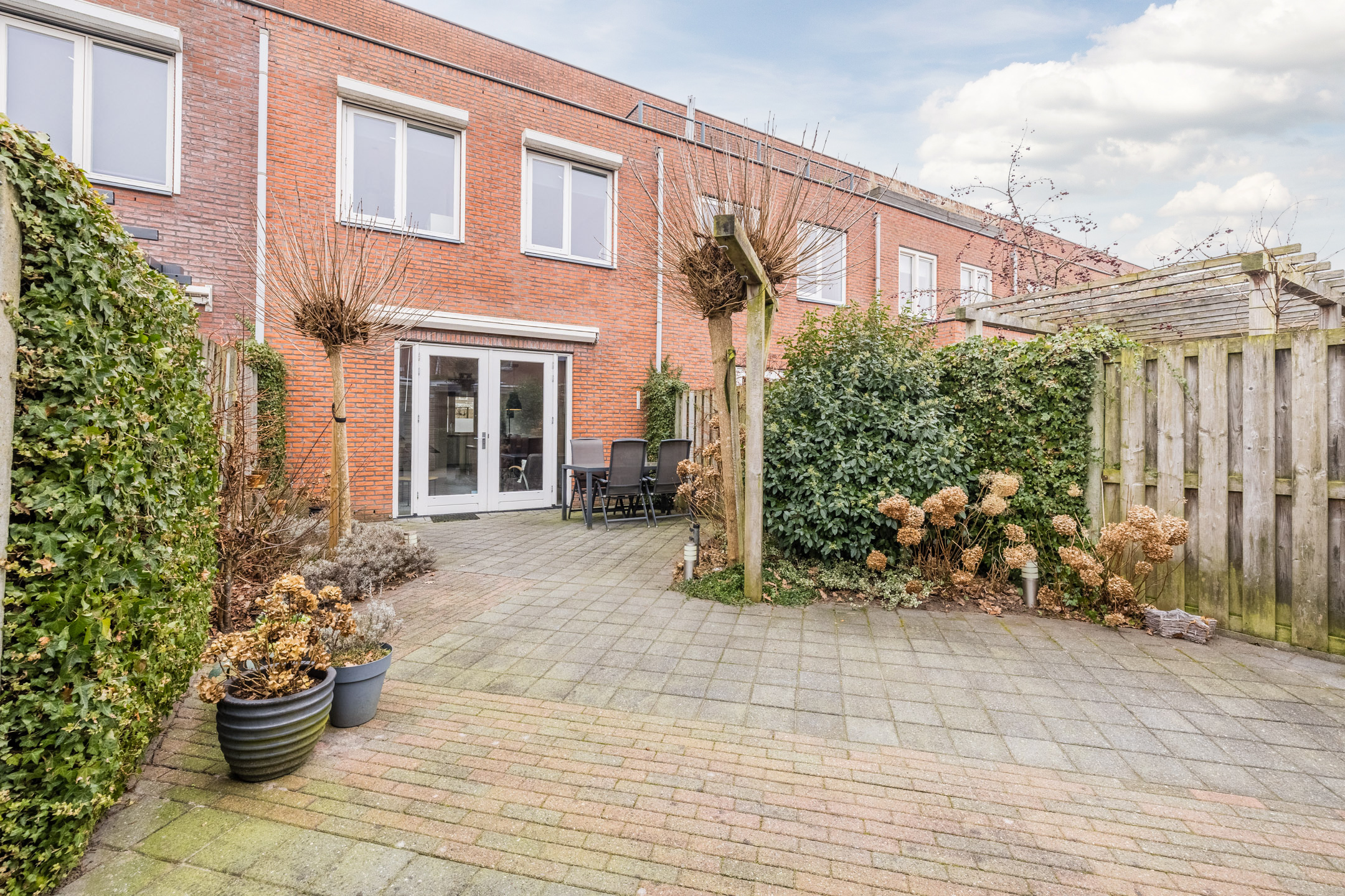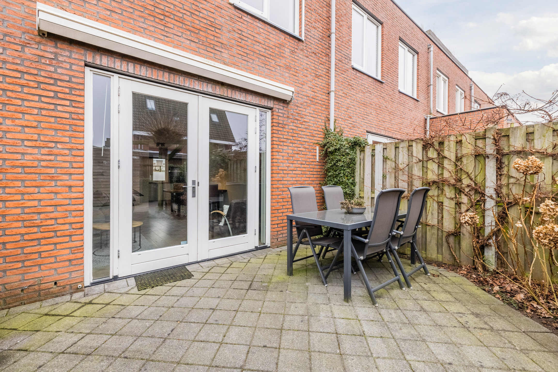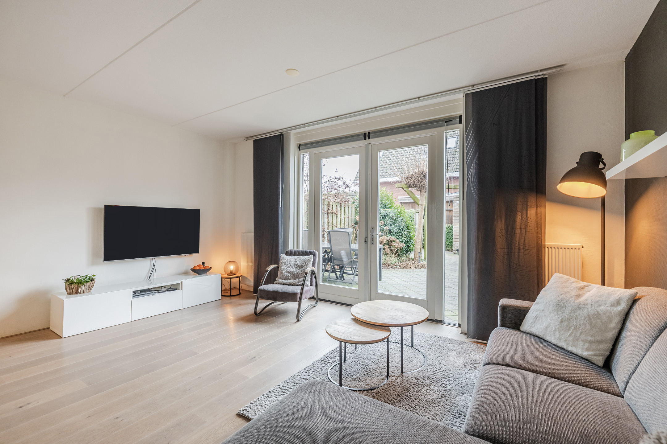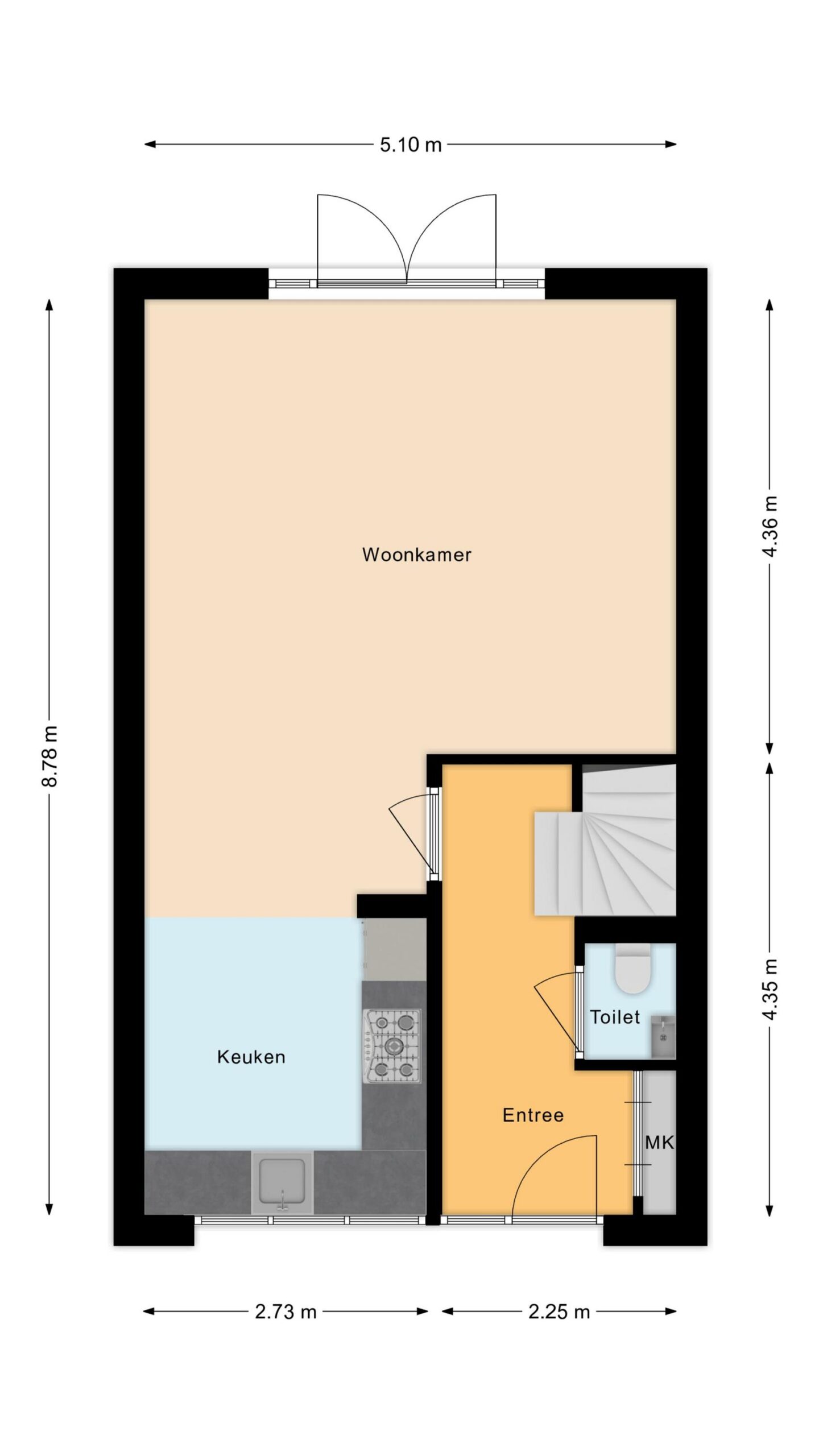 Entree met toilet, meterkast en trapopgang. De lichte en tuingerichte woonkamer is voorzien van een praktische trapkast, fraaie houten vloer en openslaande deuren naar de achtertuin met zonnescherm, achterom en berging.