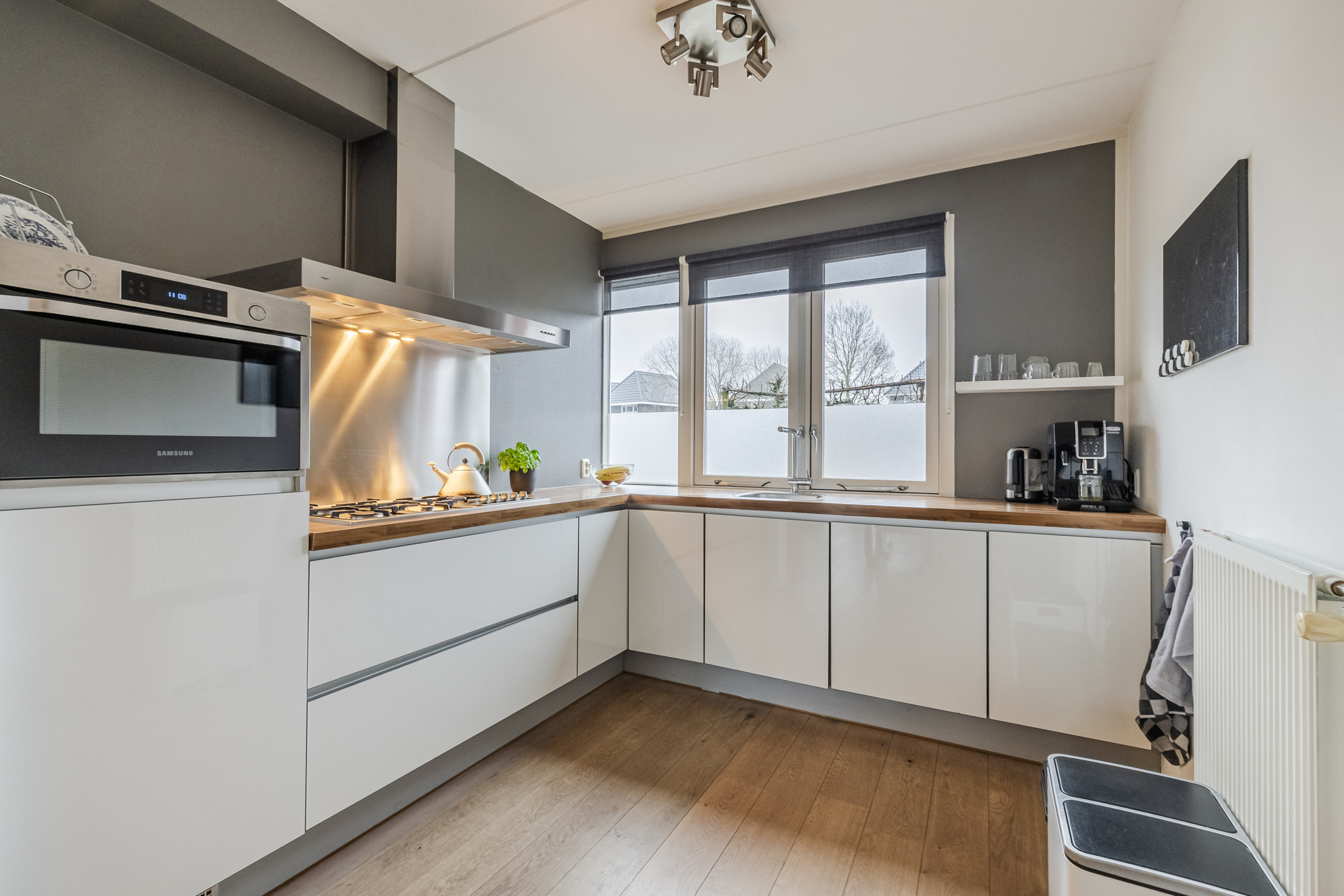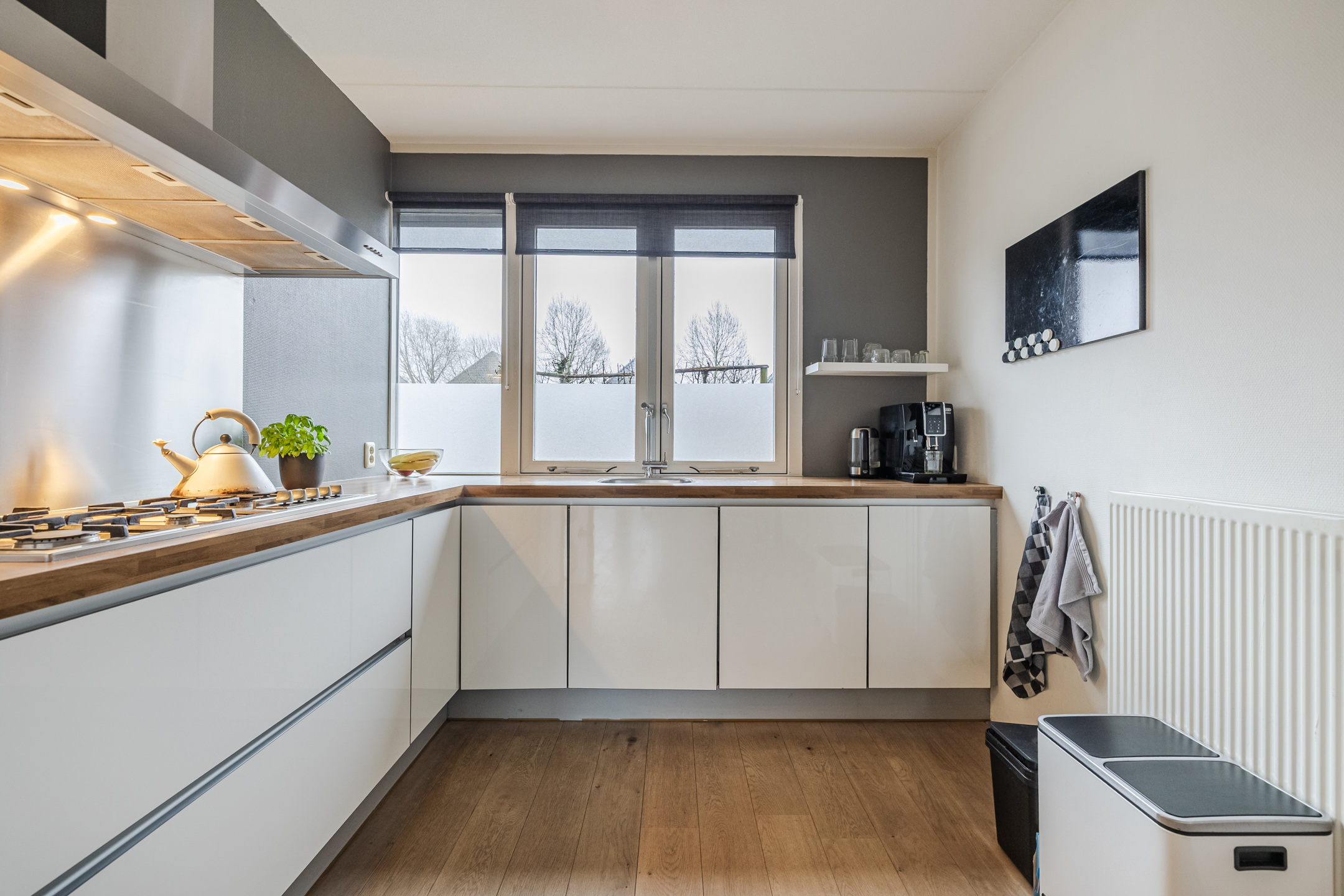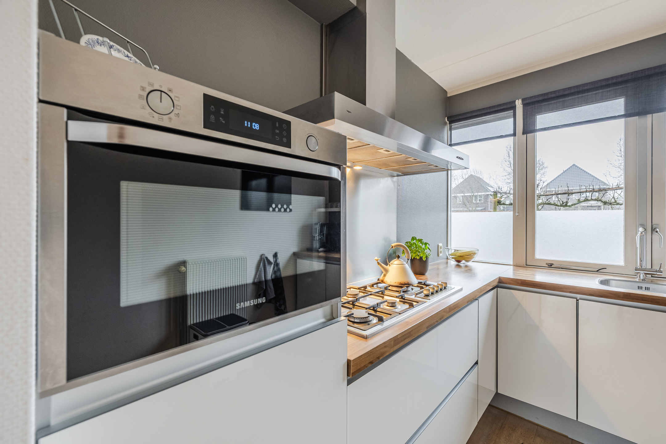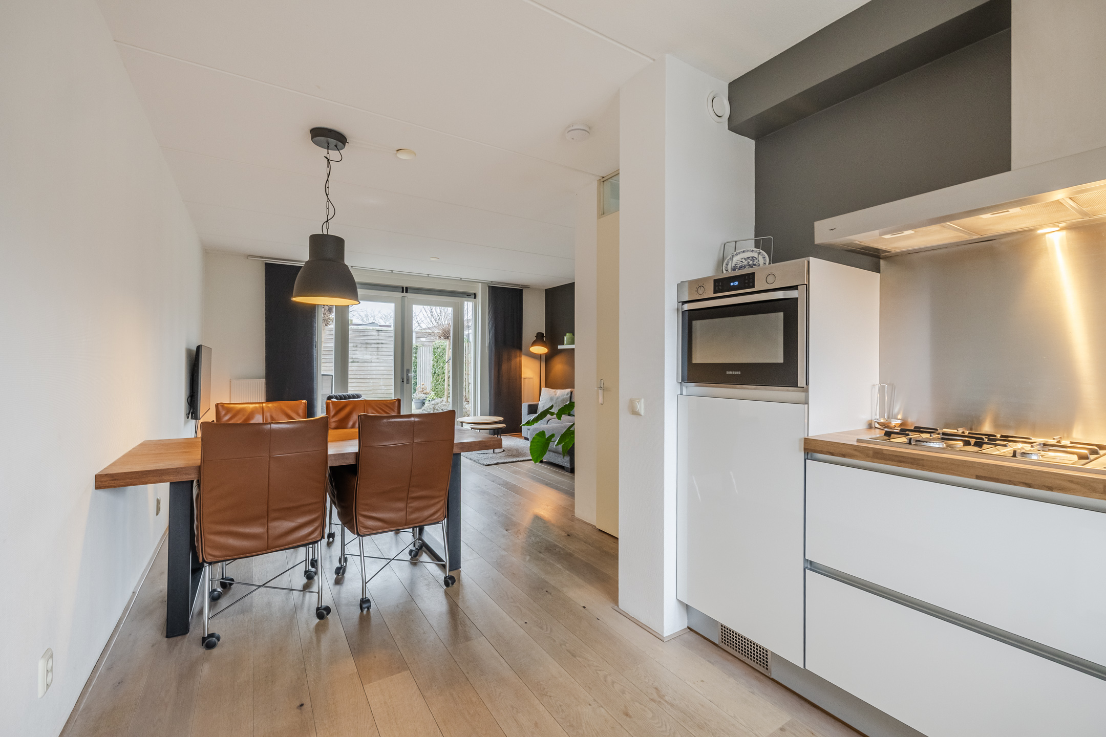 Aan de voorzijde bevindt zich de nette open keuken, uitgerust met diverse inbouwapparatuur, waaronder een vaatwasser, 5-pits gaskookplaat, combi-oven en afzuigkap.
