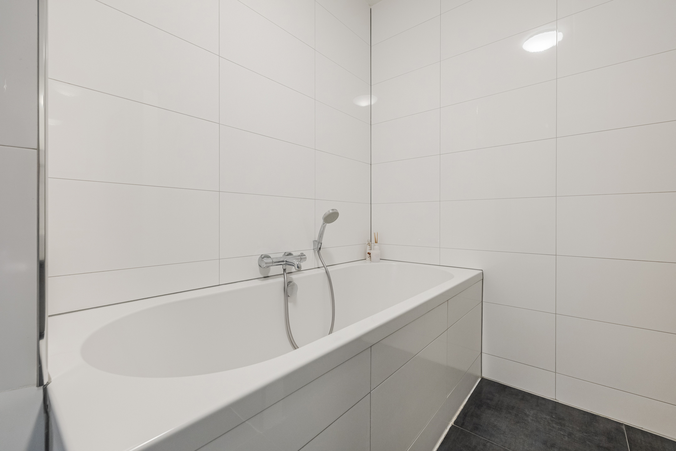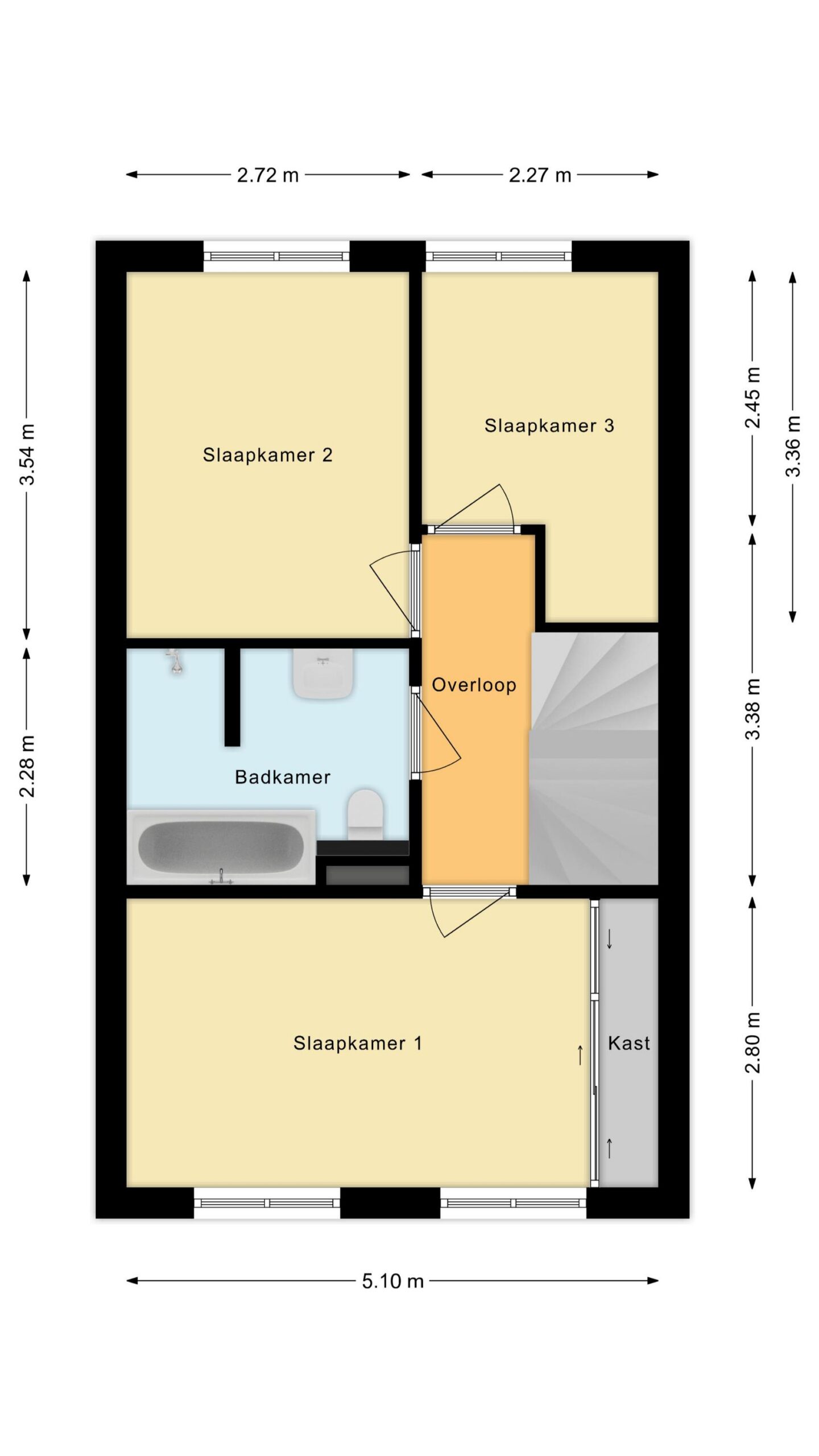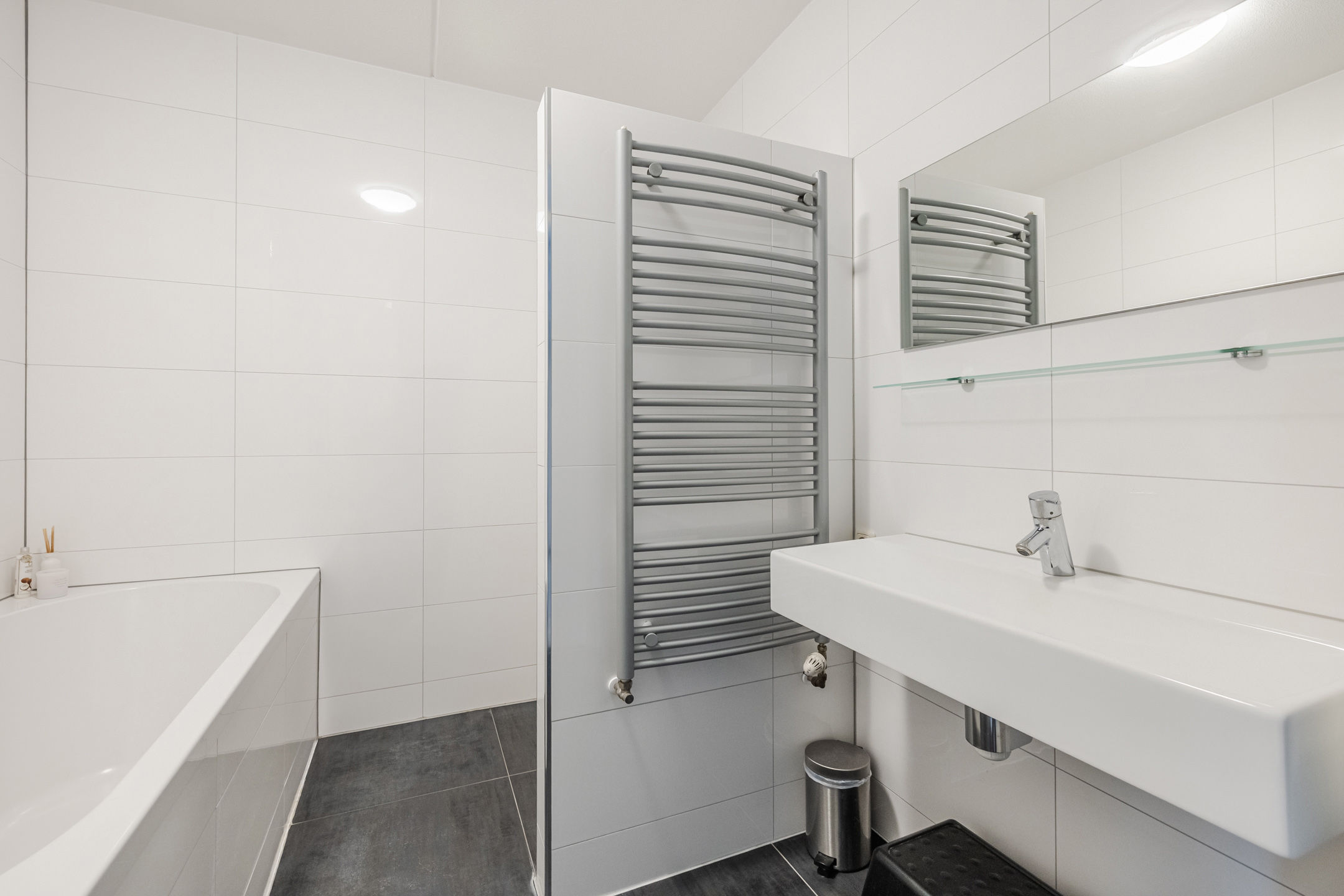 Overloop met toegang tot drie slaapkamers en de badkamer, welke is ingericht met een ligbad, inloopdouche, toilet en wastafelmeubel.