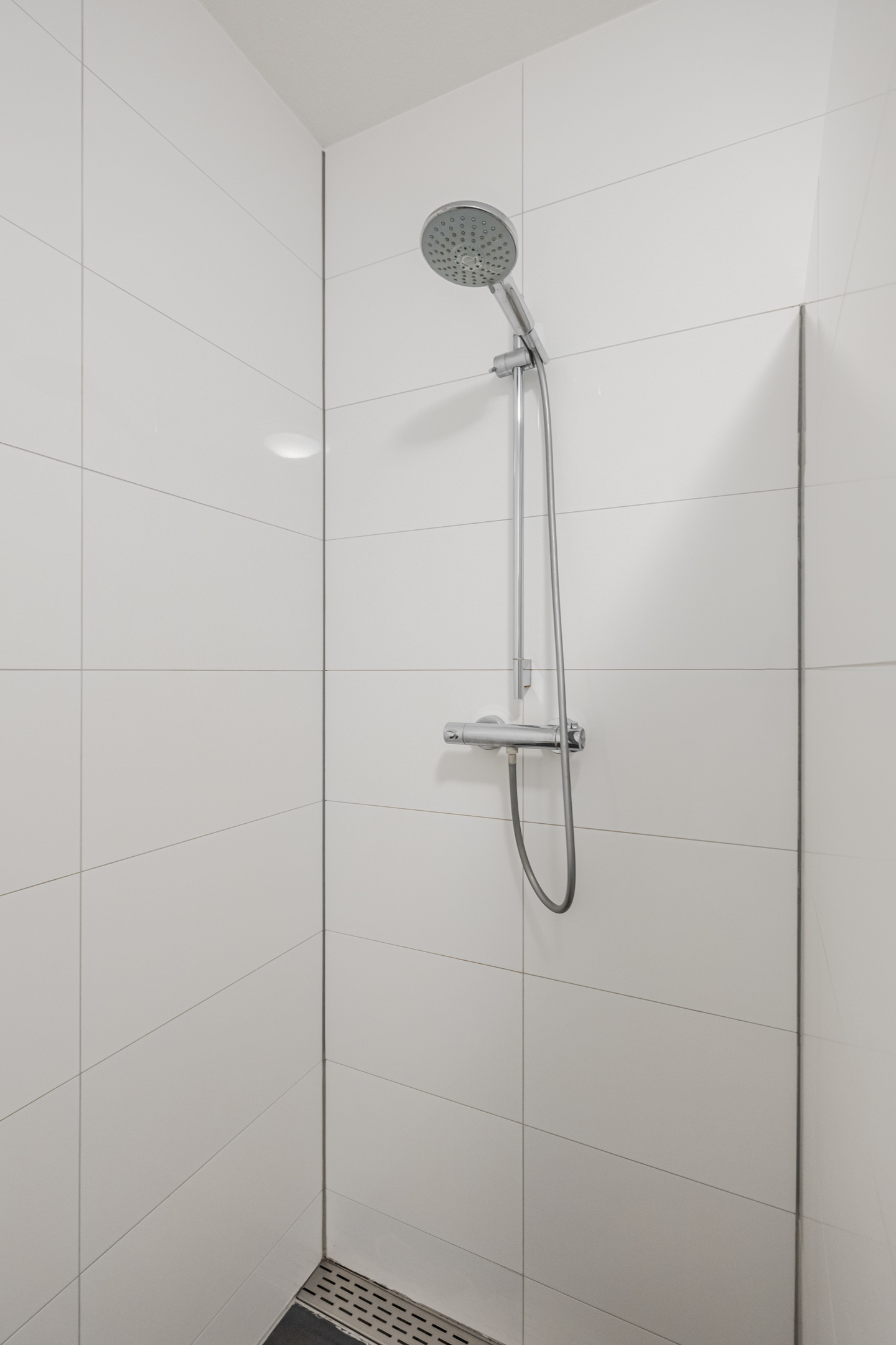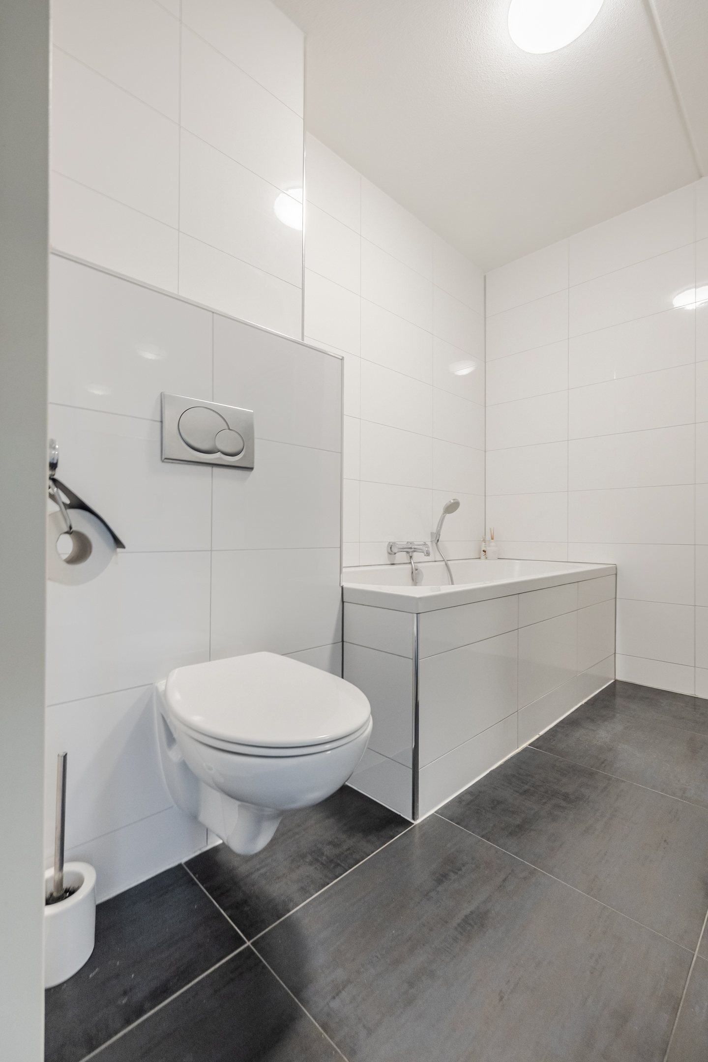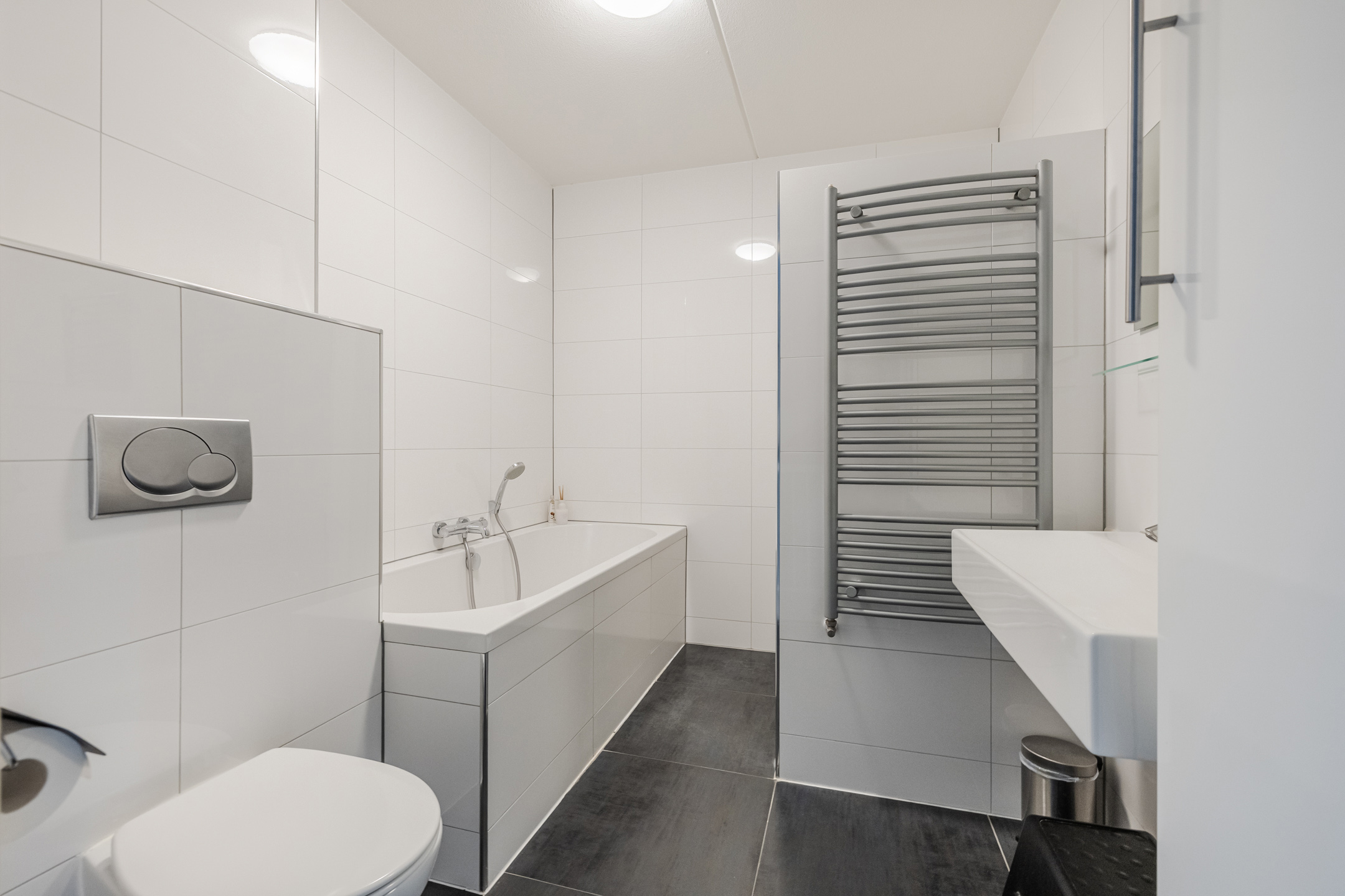 Overloop met toegang tot drie slaapkamers en de badkamer, welke is ingericht met een ligbad, inloopdouche, toilet en wastafelmeubel.