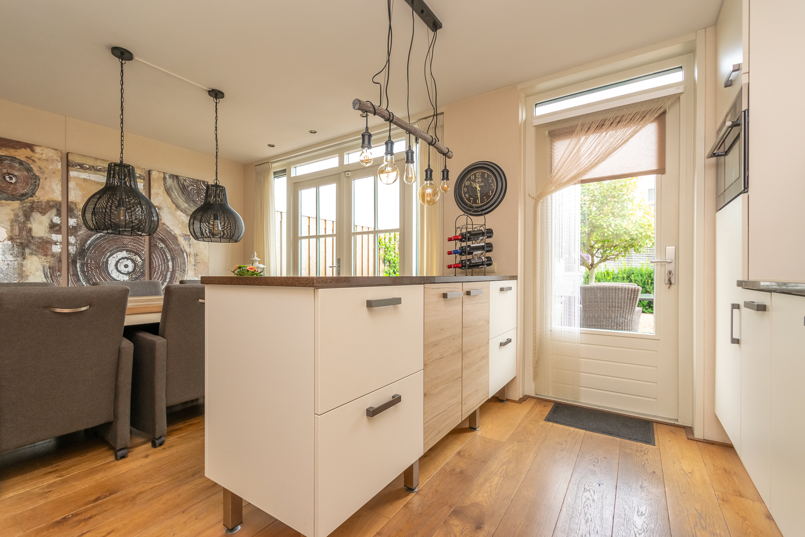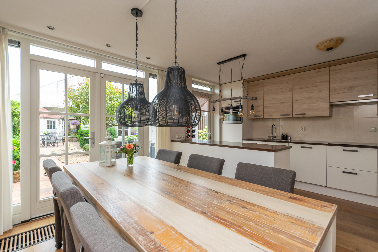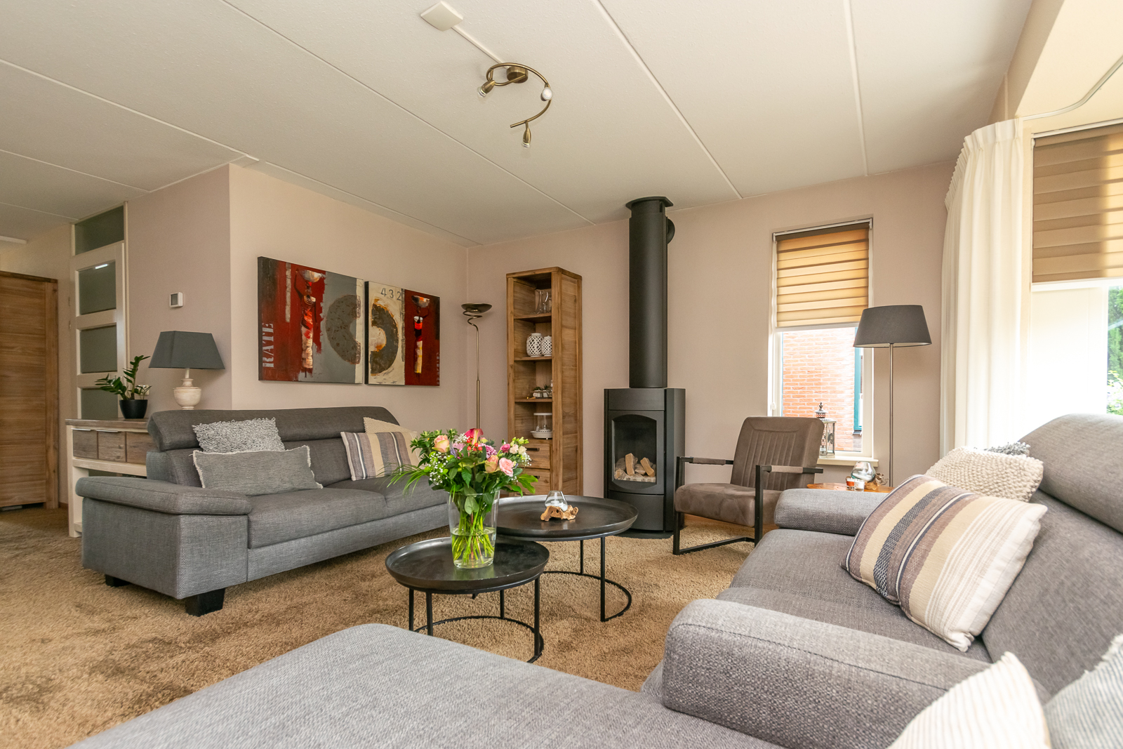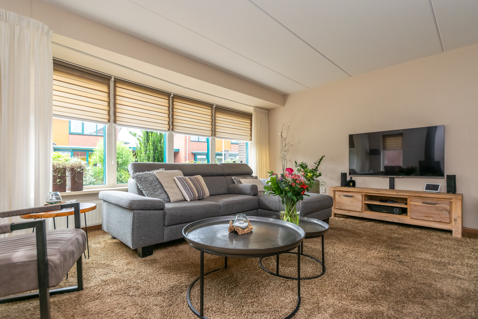 Entree met vernieuwd toilet (2021) en trapopgang naar de verdieping, ruime woonkamer met erker en een sfeervolle gaskachel en een uitgebouwde en complete leefkeuken met alle wenselijke inbouwapparatuur en dubbele tuindeur naar de zonnige tuin. De woonkamer heeft aan de voorzijde screens en bij het terras aan de keukenzijde een groot uitvalscherm.