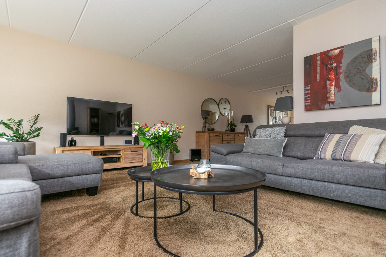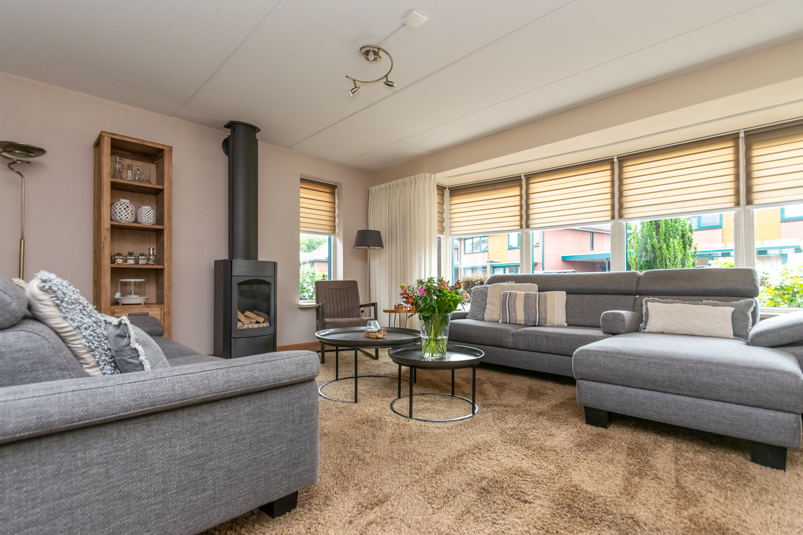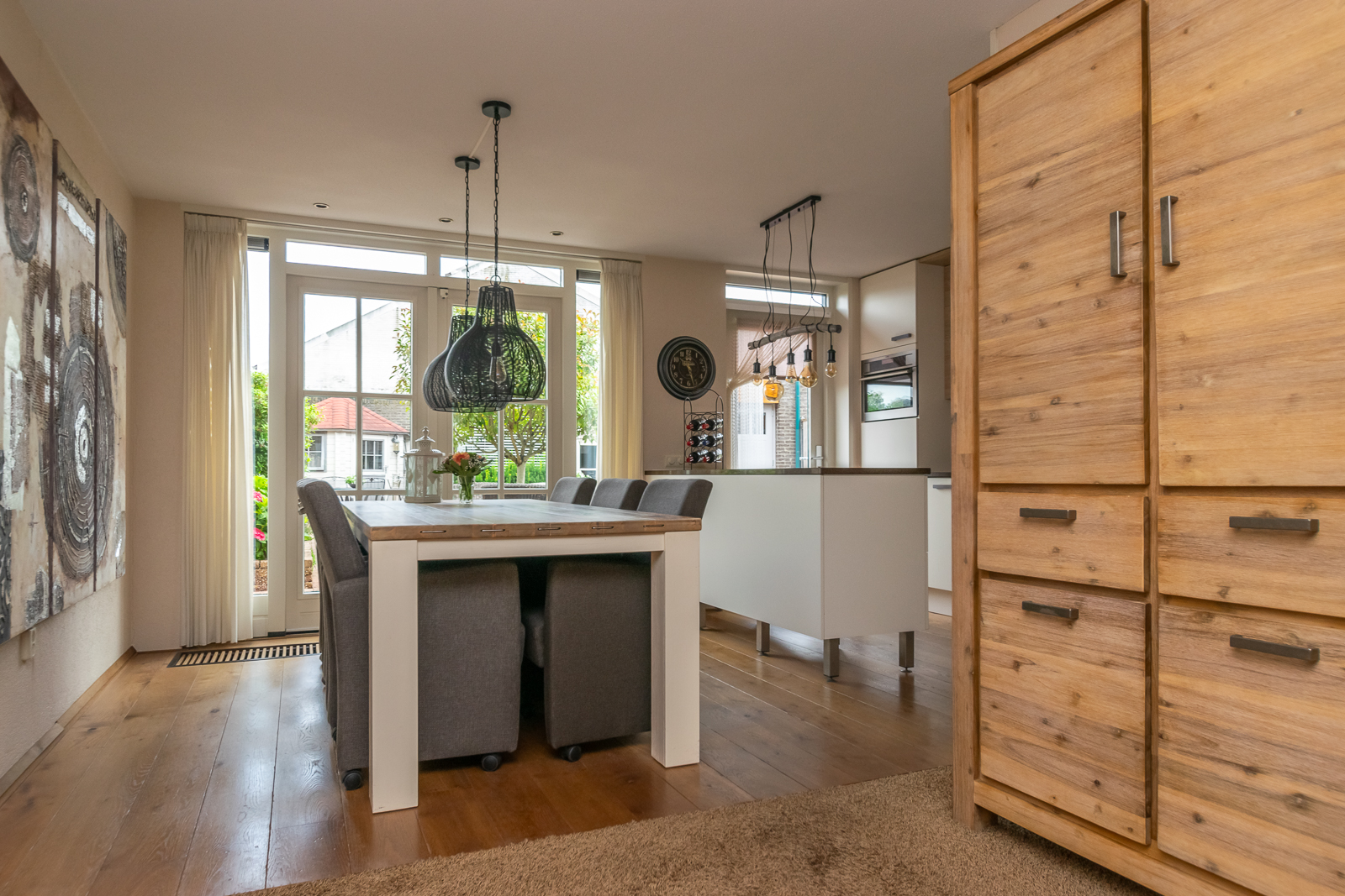 Entree met vernieuwd toilet (2021) en trapopgang naar de verdieping, ruime woonkamer met erker en een sfeervolle gaskachel en een uitgebouwde en complete leefkeuken met alle wenselijke inbouwapparatuur en dubbele tuindeur naar de zonnige tuin. De woonkamer heeft aan de voorzijde screens en bij het terras aan de keukenzijde een groot uitvalscherm.