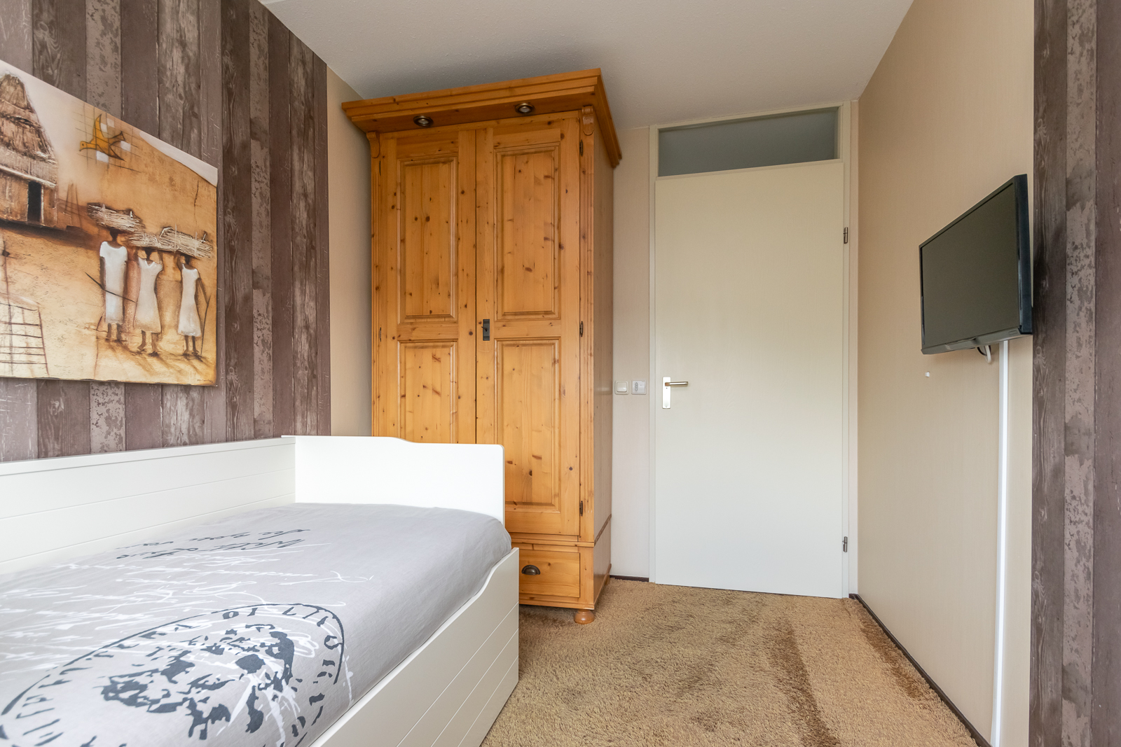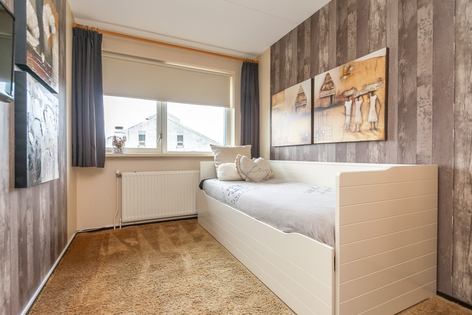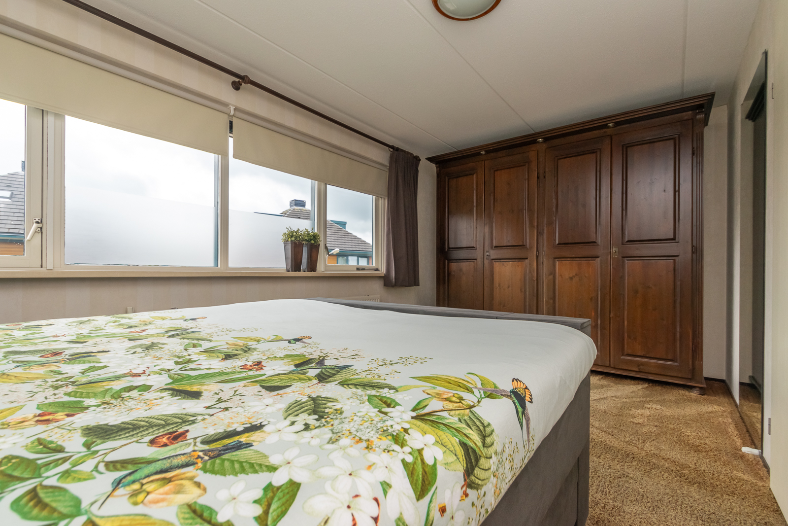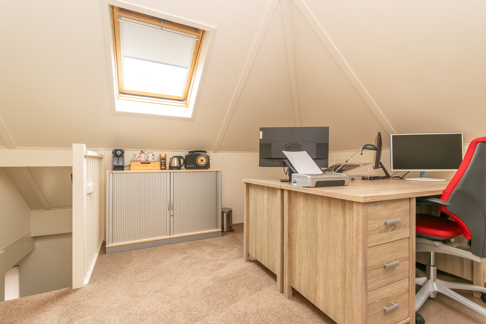 Bereikbaar met vaste trap, royale overloop met een ruime werkplek en witgoedopstelling en een grote slaapkamer met dakkapel. Verder is er airco aanwezig en zit er veel bergruimte achter de knieschotten.