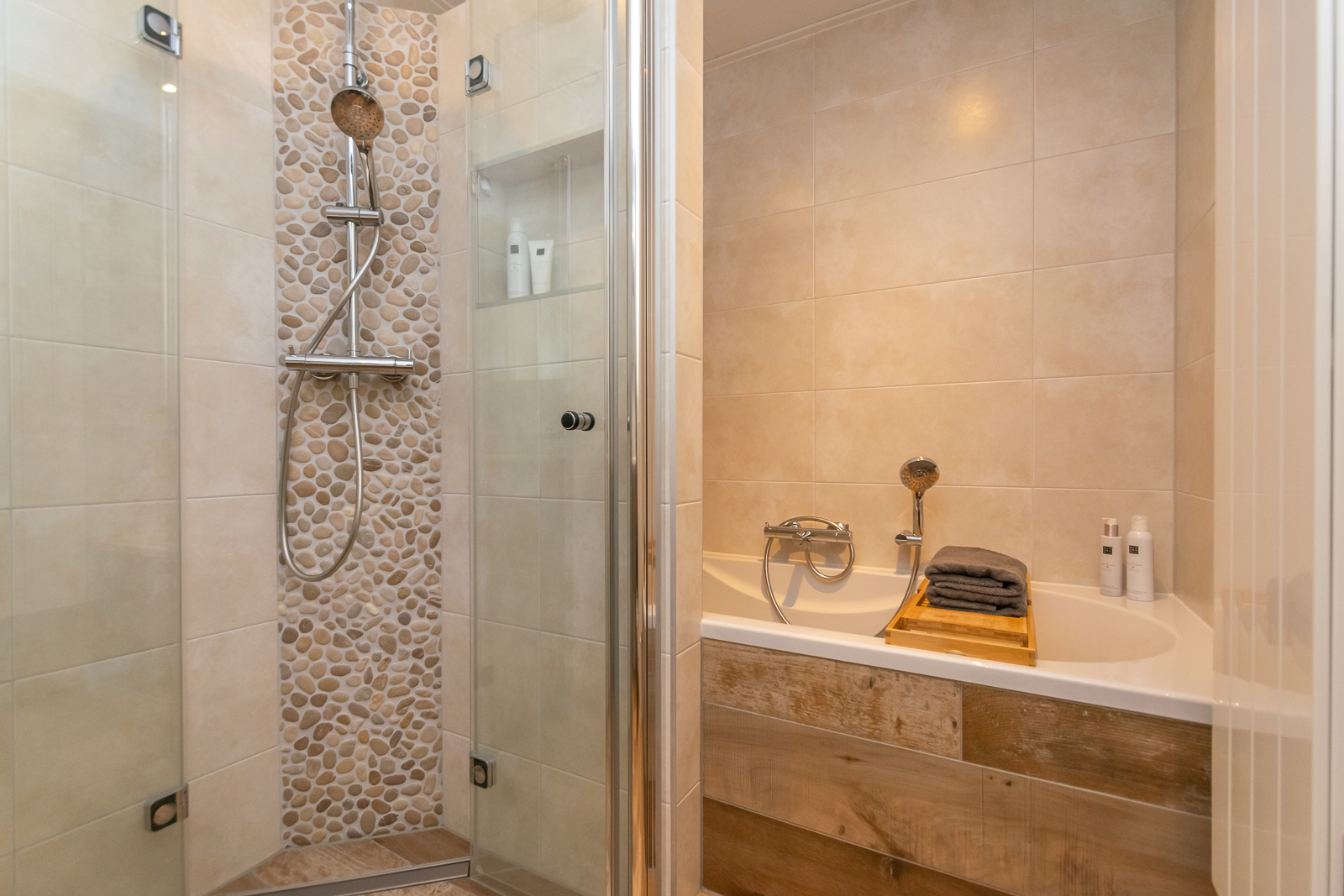 Overloop met trapopgang naar de 2e verdieping, 3 slaapkamers (allen met rolluiken), separaat toilet en een vernieuwde badkamer (2021) met dubbele badkamermeubel, ligbad en inloopdouche.