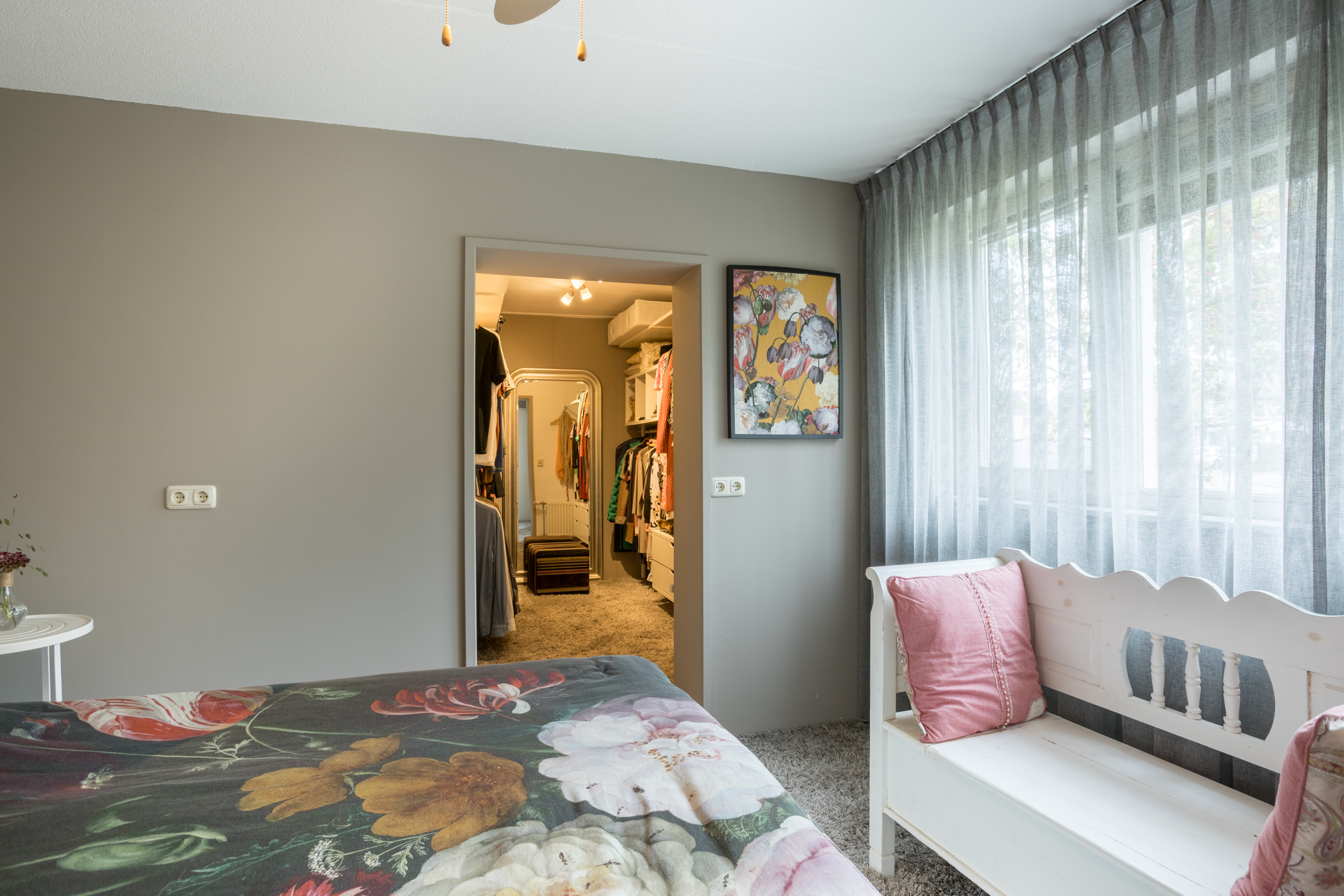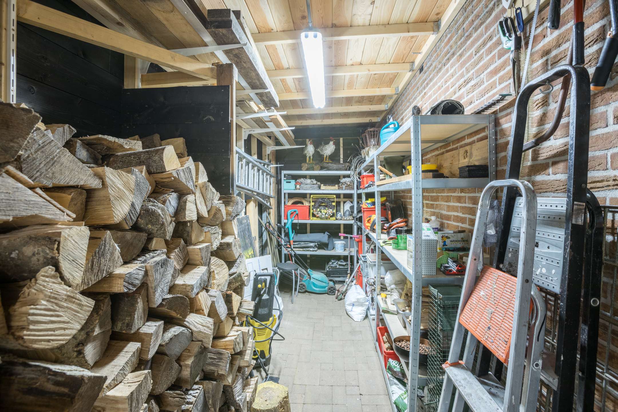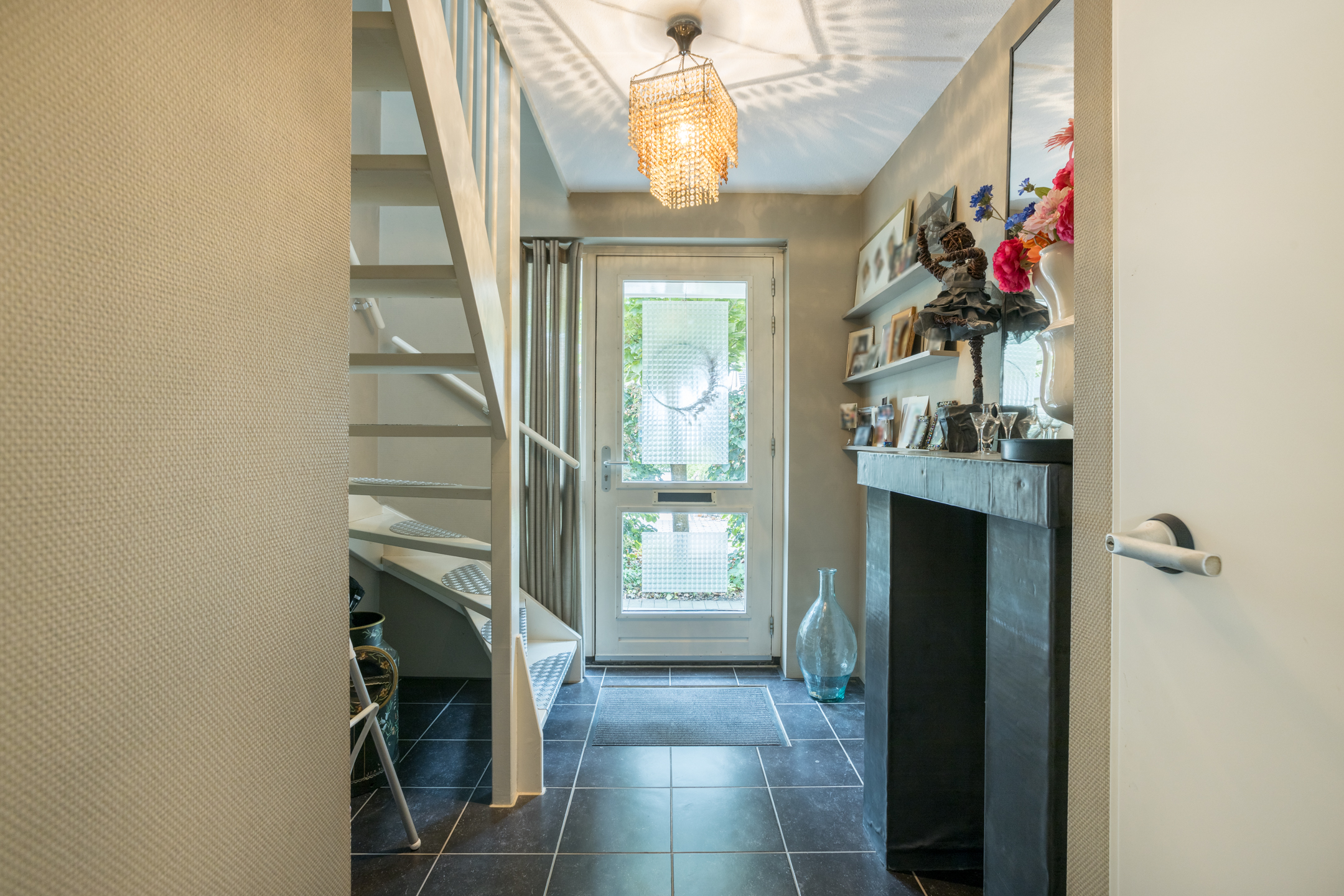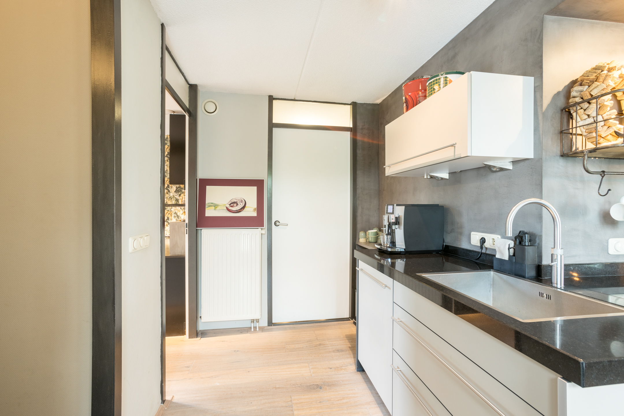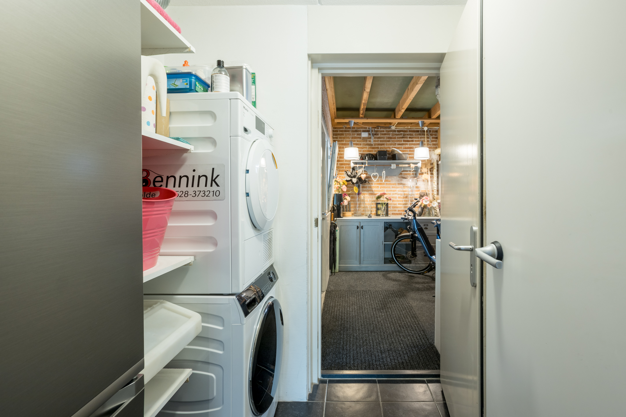 Entree met verzwaarde meterkast, toilet en trapopgang, woonkamer met erker, houtenvloer (toplaag) en sfeervolle houtkachel, open keuken met alle wenselijk inbouwapparatuur en dubbele deuren naar overdekt terras, slaapkamer met ruime walk in closet en badkamer ensuite met dubbelbadkamermeubel, inloopdouche en toilet, slaapkamer/kantoor en een bijkeuken met witgoedaansluitingen en een doorgang naar de berging.