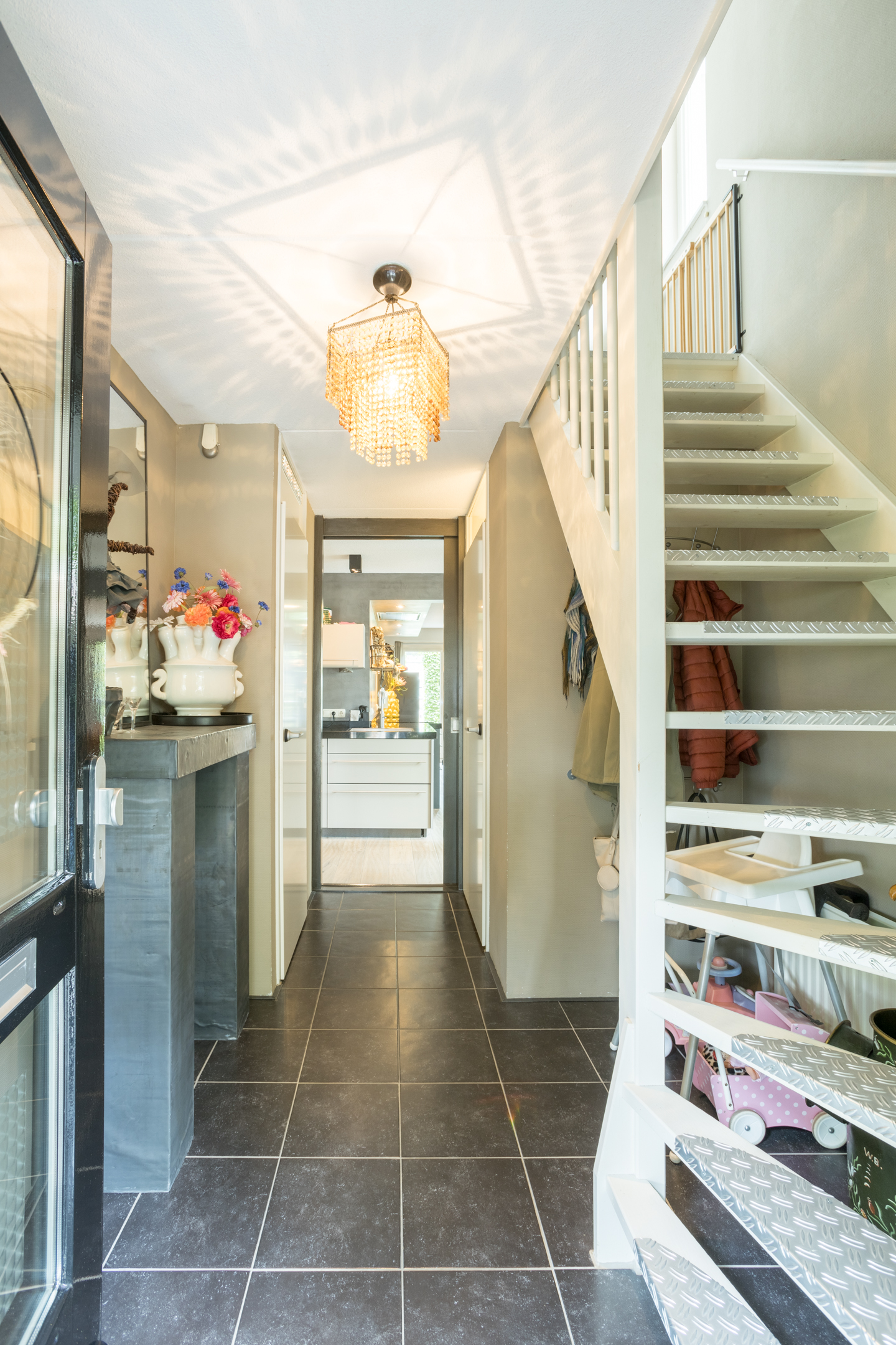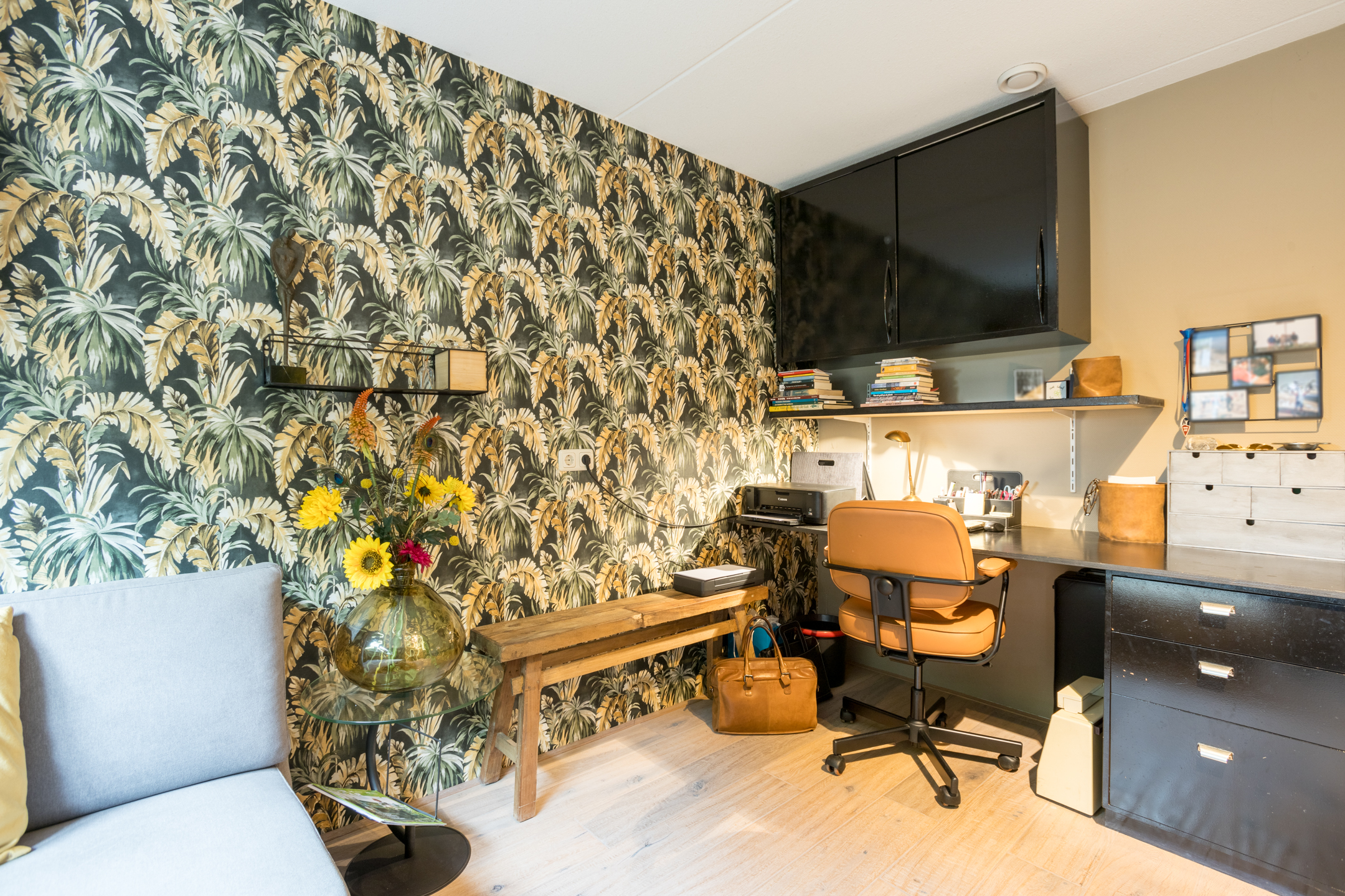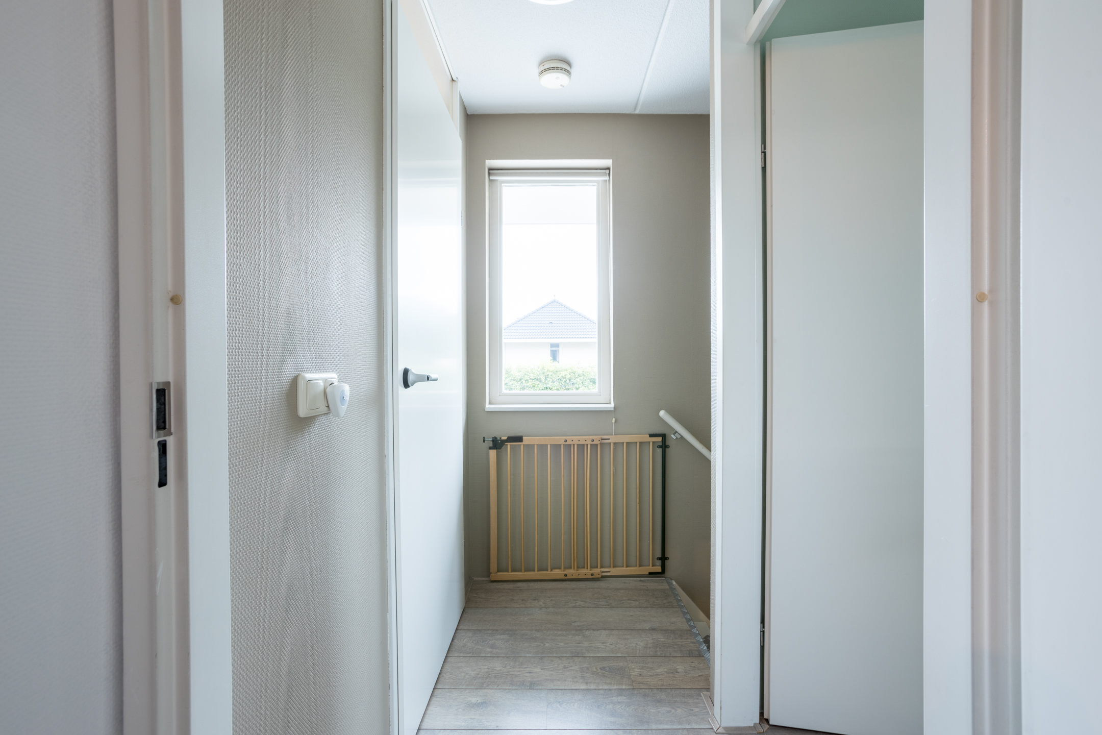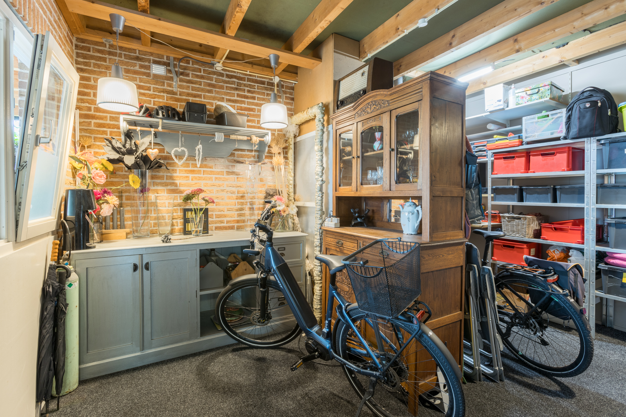 Entree met verzwaarde meterkast, toilet en trapopgang, woonkamer met erker, houtenvloer (toplaag) en sfeervolle houtkachel, open keuken met alle wenselijk inbouwapparatuur en dubbele deuren naar overdekt terras, slaapkamer met ruime walk in closet en badkamer ensuite met dubbelbadkamermeubel, inloopdouche en toilet, slaapkamer/kantoor en een bijkeuken met witgoedaansluitingen en een doorgang naar de berging.