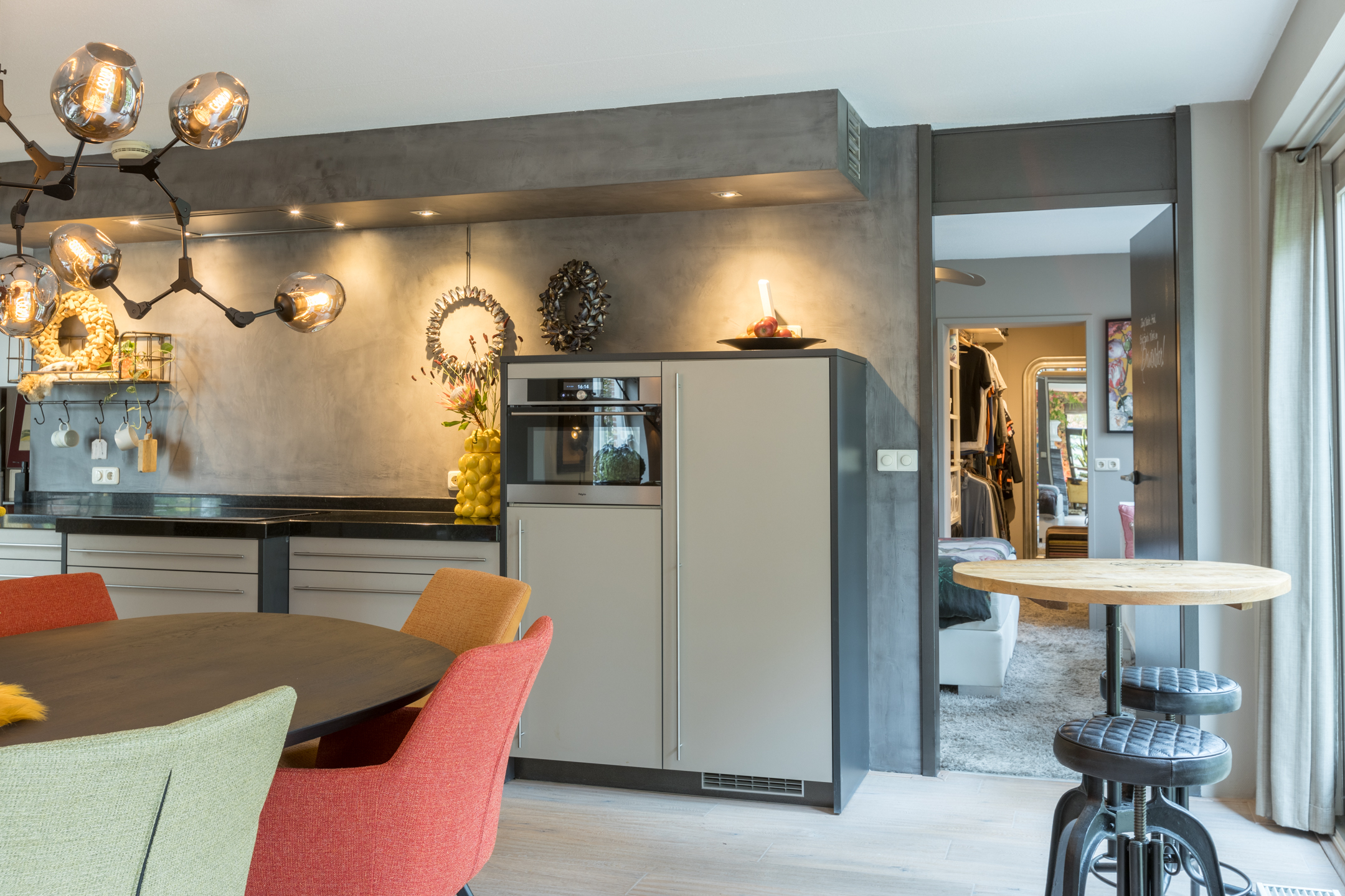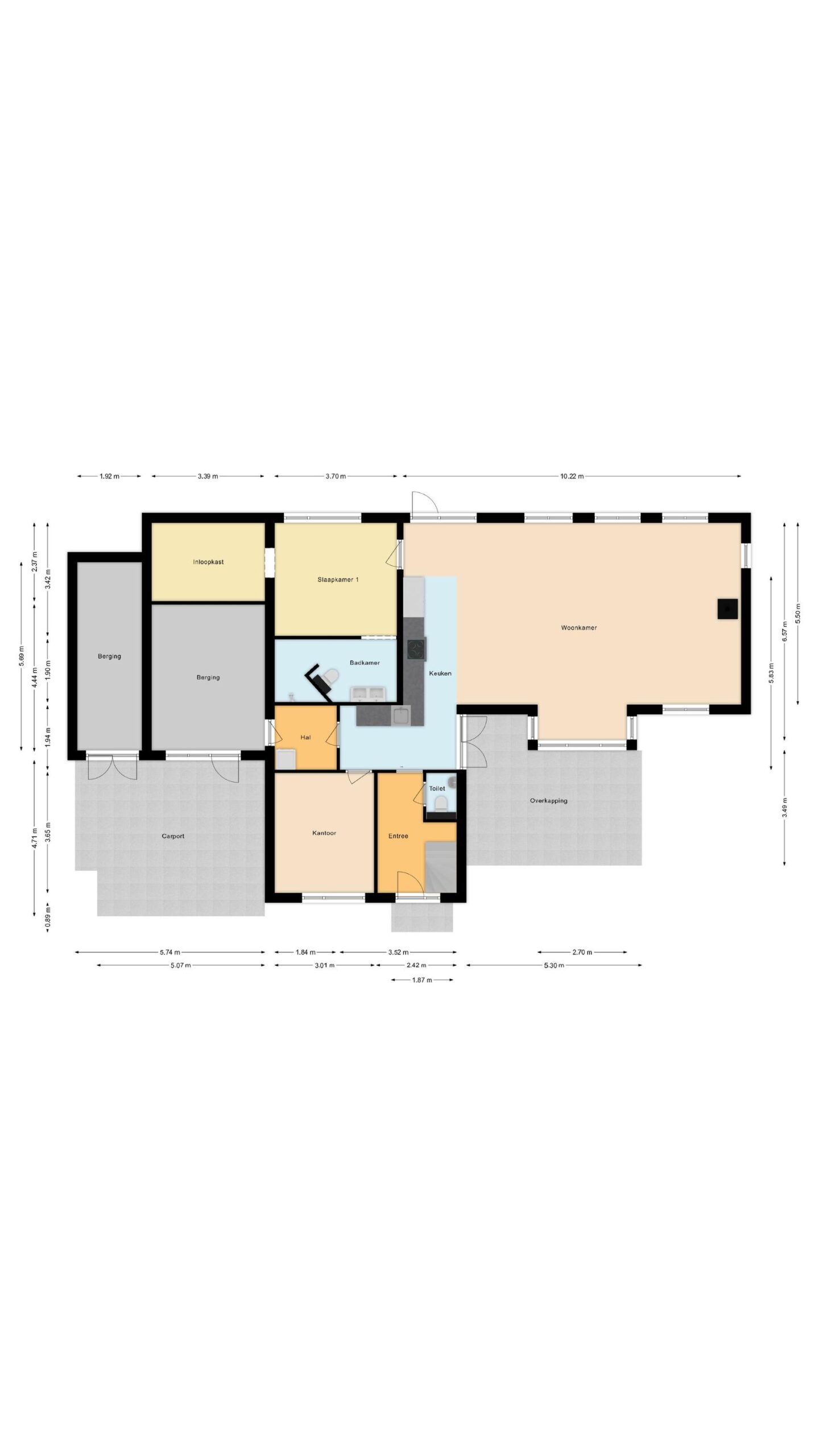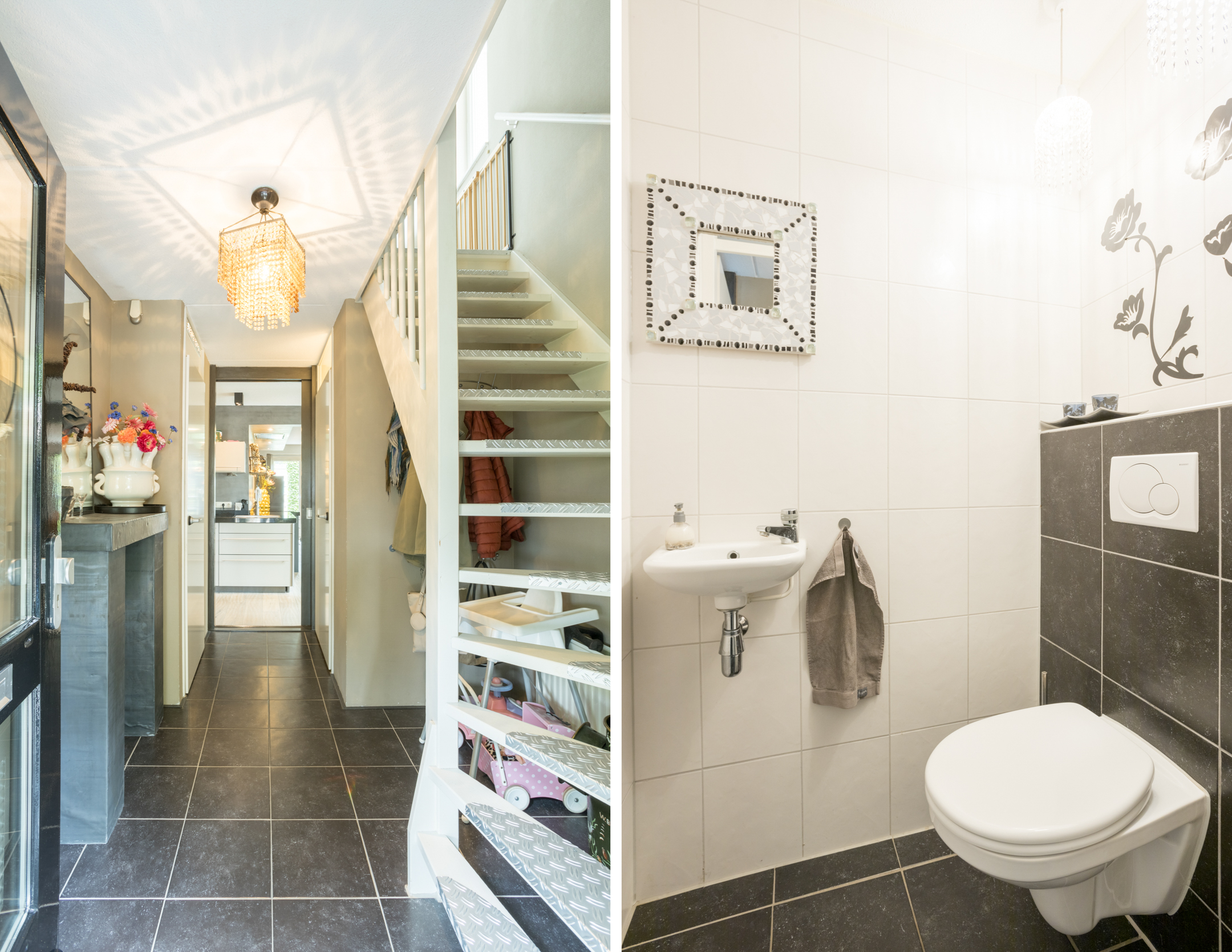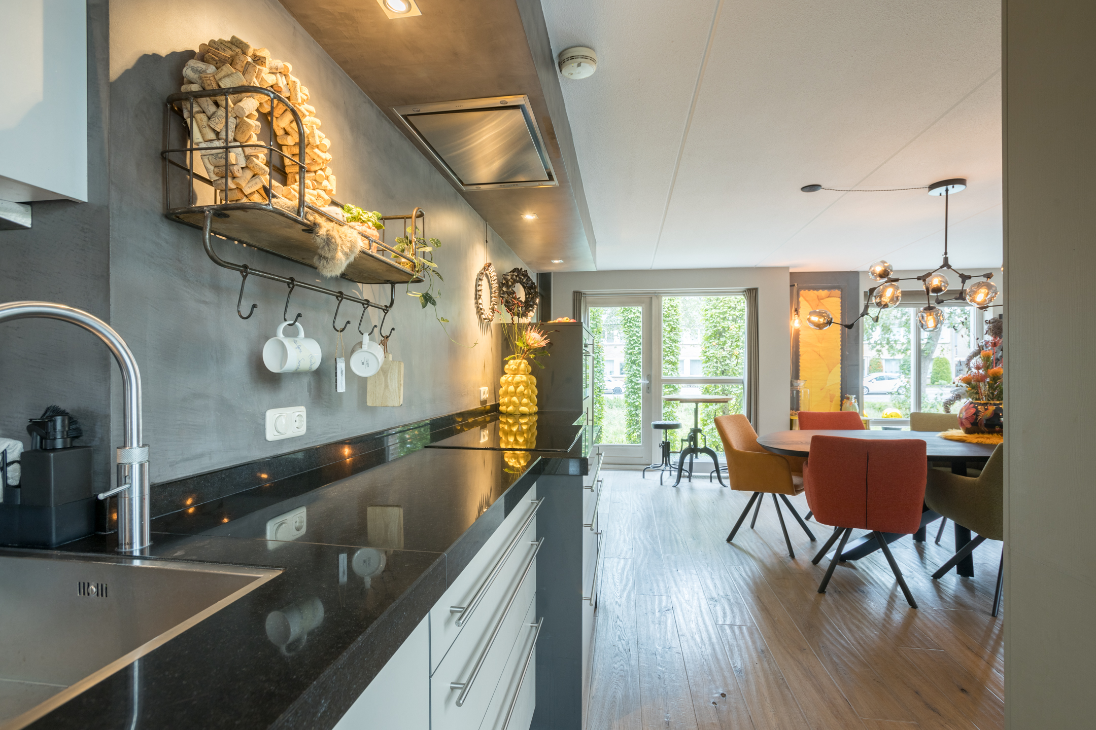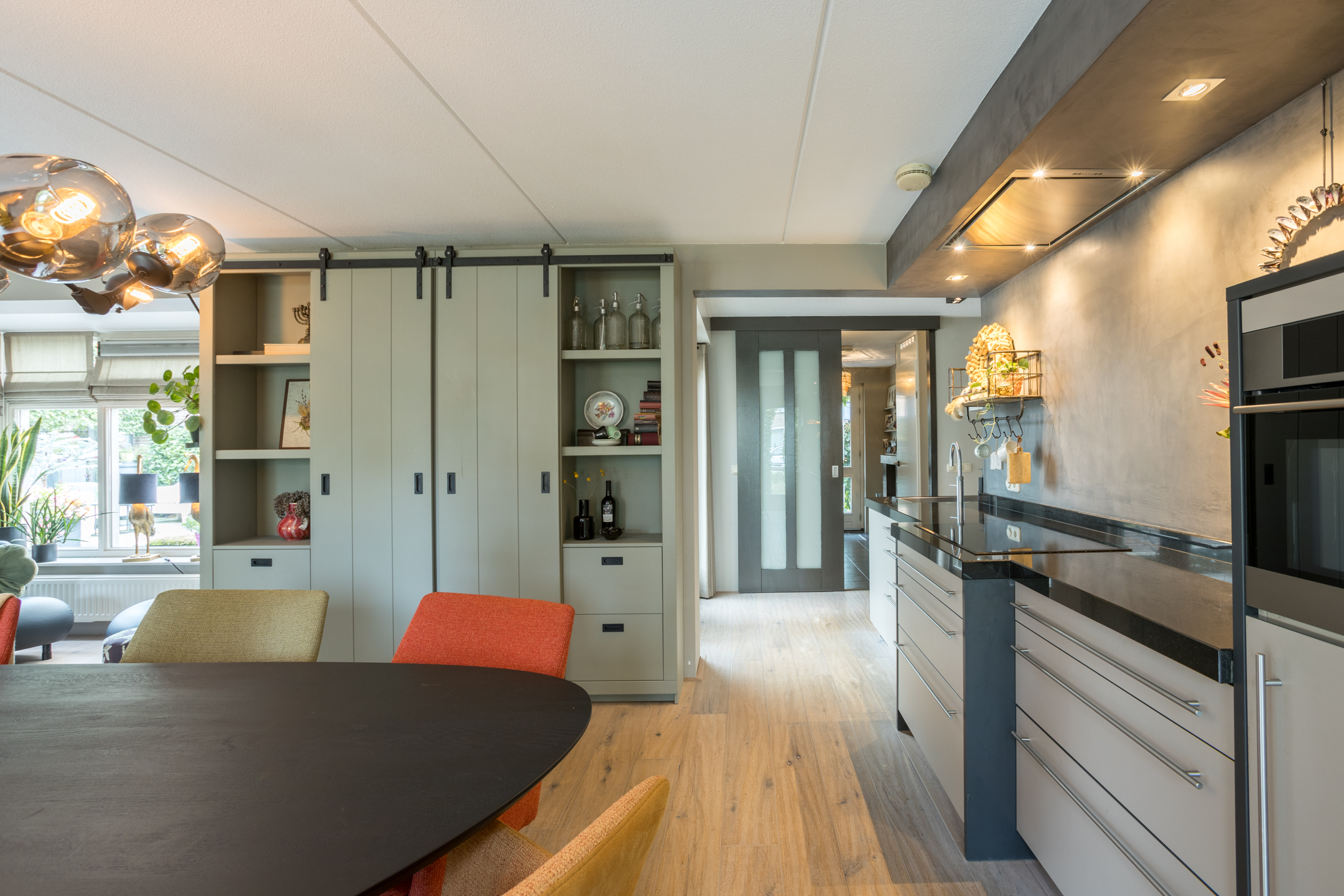 Entree met verzwaarde meterkast, toilet en trapopgang, woonkamer met erker, houtenvloer (toplaag) en sfeervolle houtkachel, open keuken met alle wenselijk inbouwapparatuur en dubbele deuren naar overdekt terras, slaapkamer met ruime walk in closet en badkamer ensuite met dubbelbadkamermeubel, inloopdouche en toilet, slaapkamer/kantoor en een bijkeuken met witgoedaansluitingen en een doorgang naar de berging.