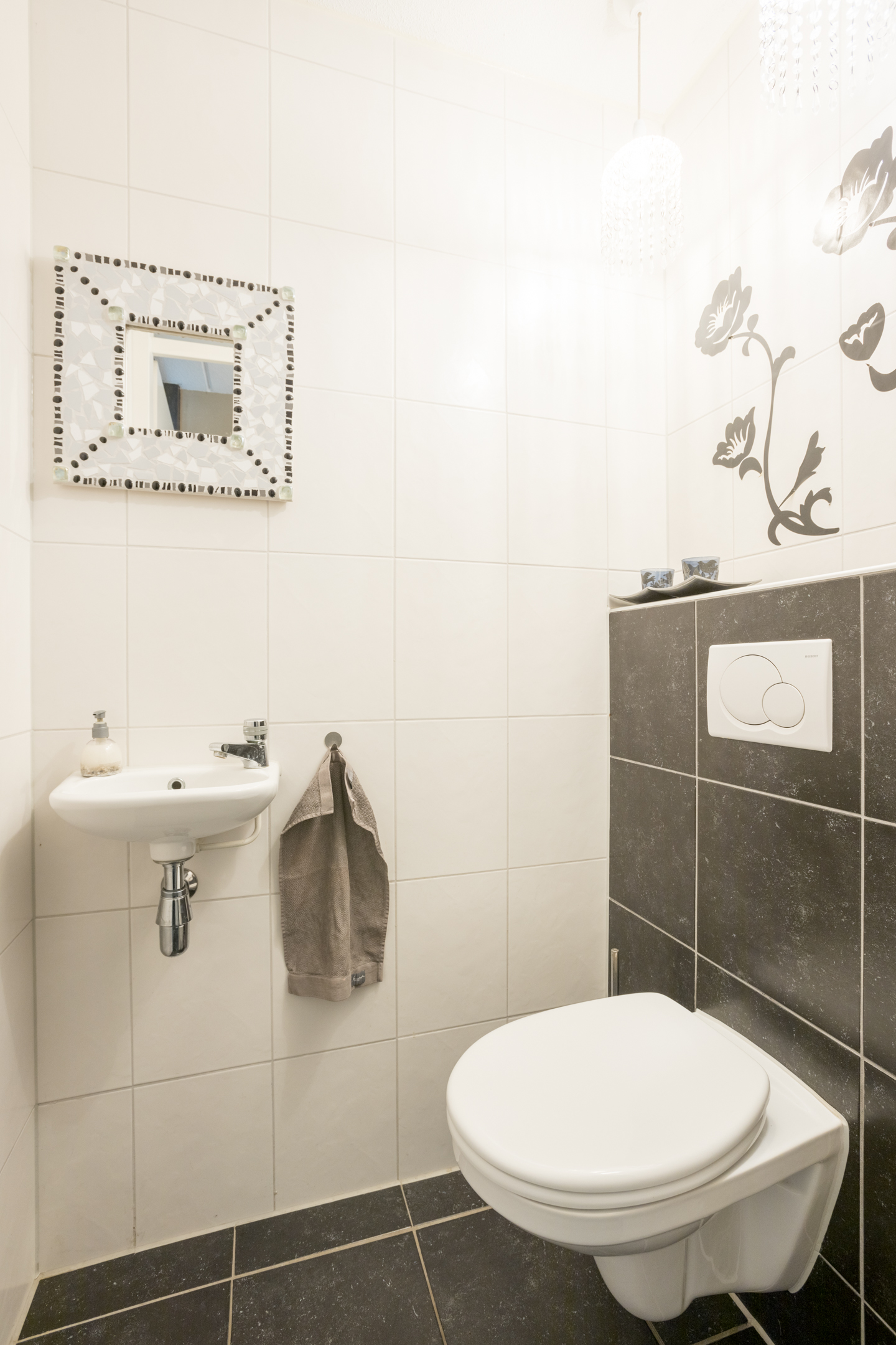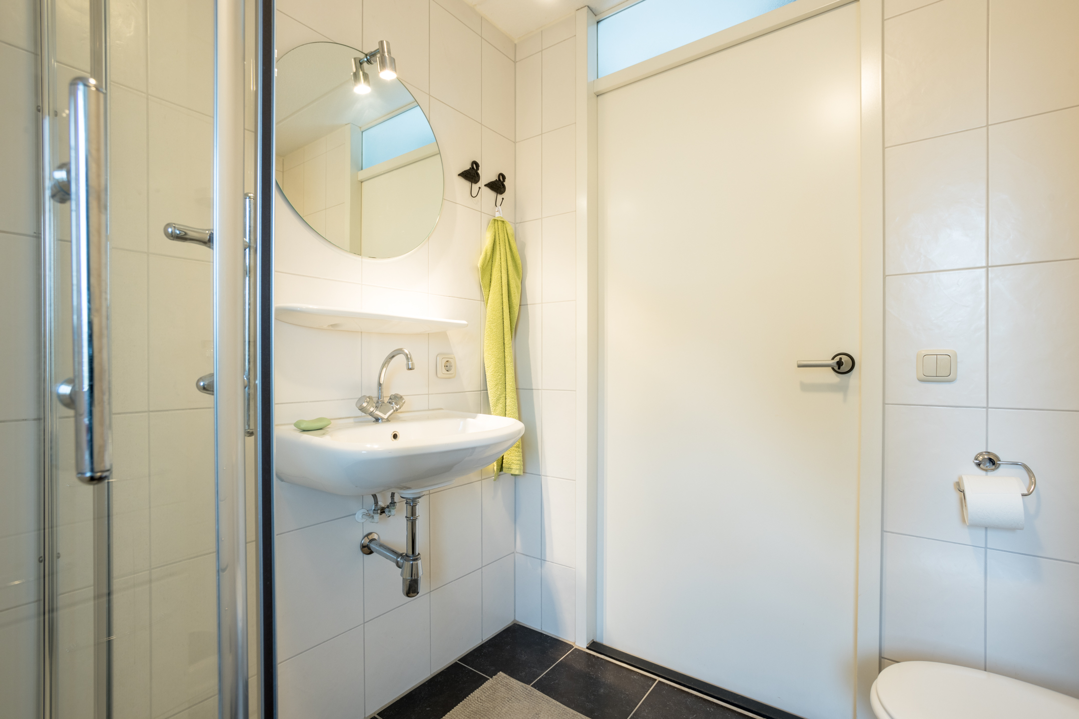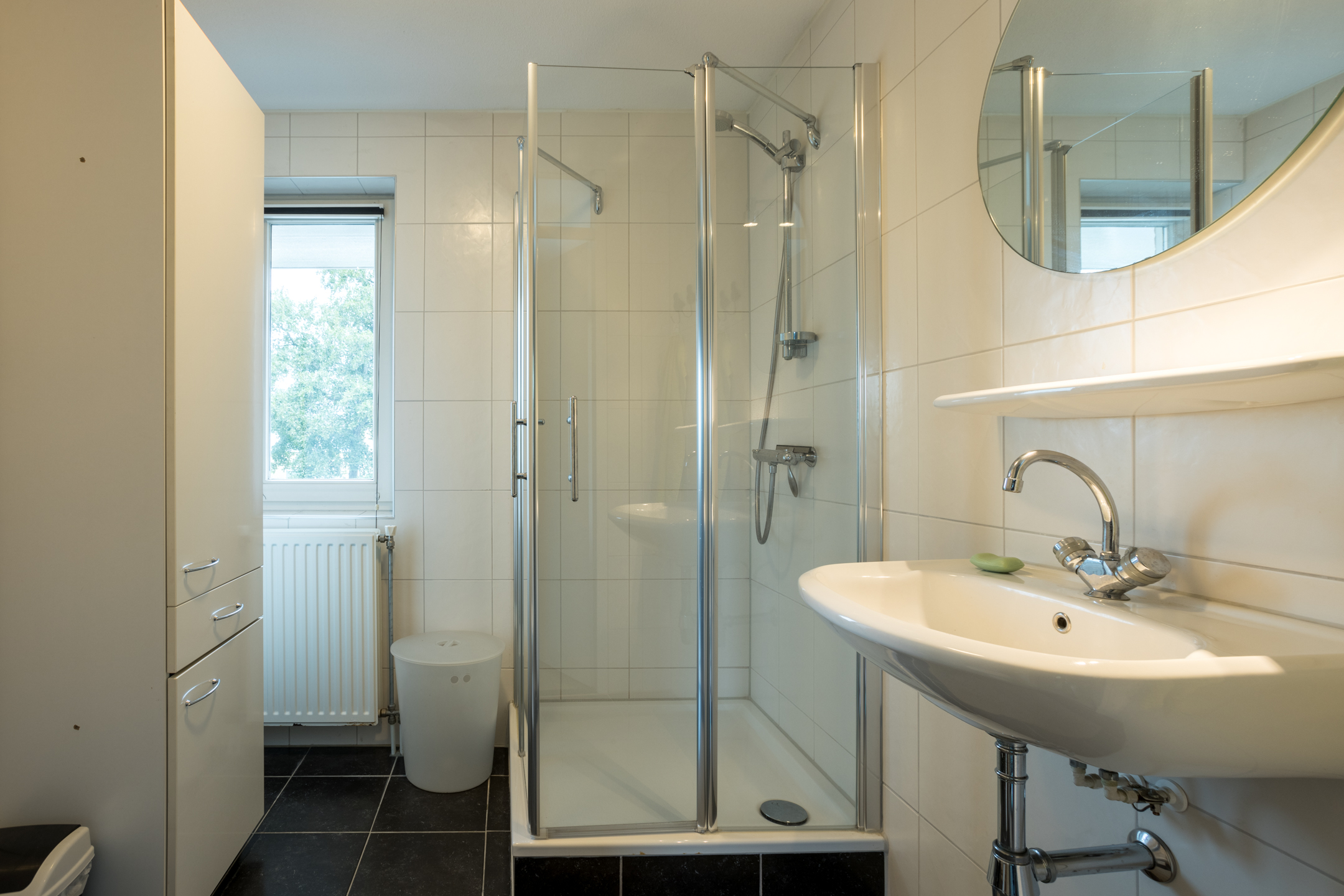 Overloop, 2 slaapkamers en een badkamer met douche, wastafel en toilet.