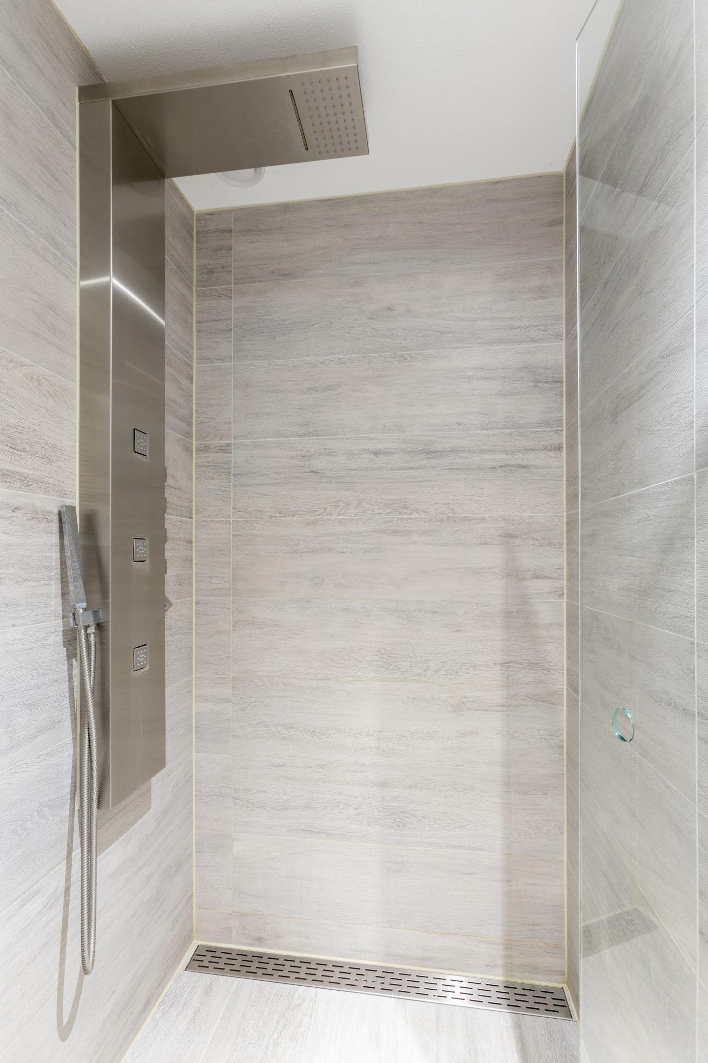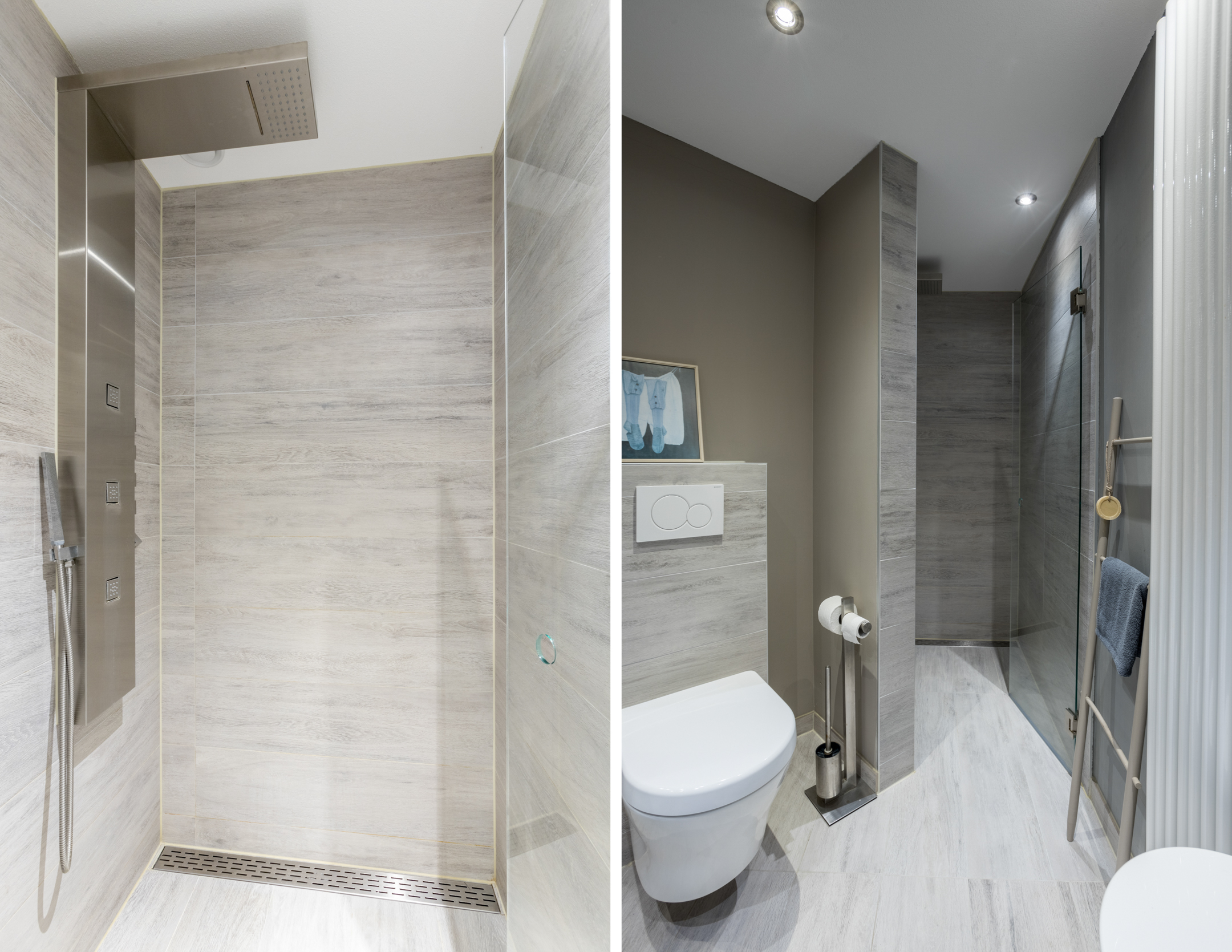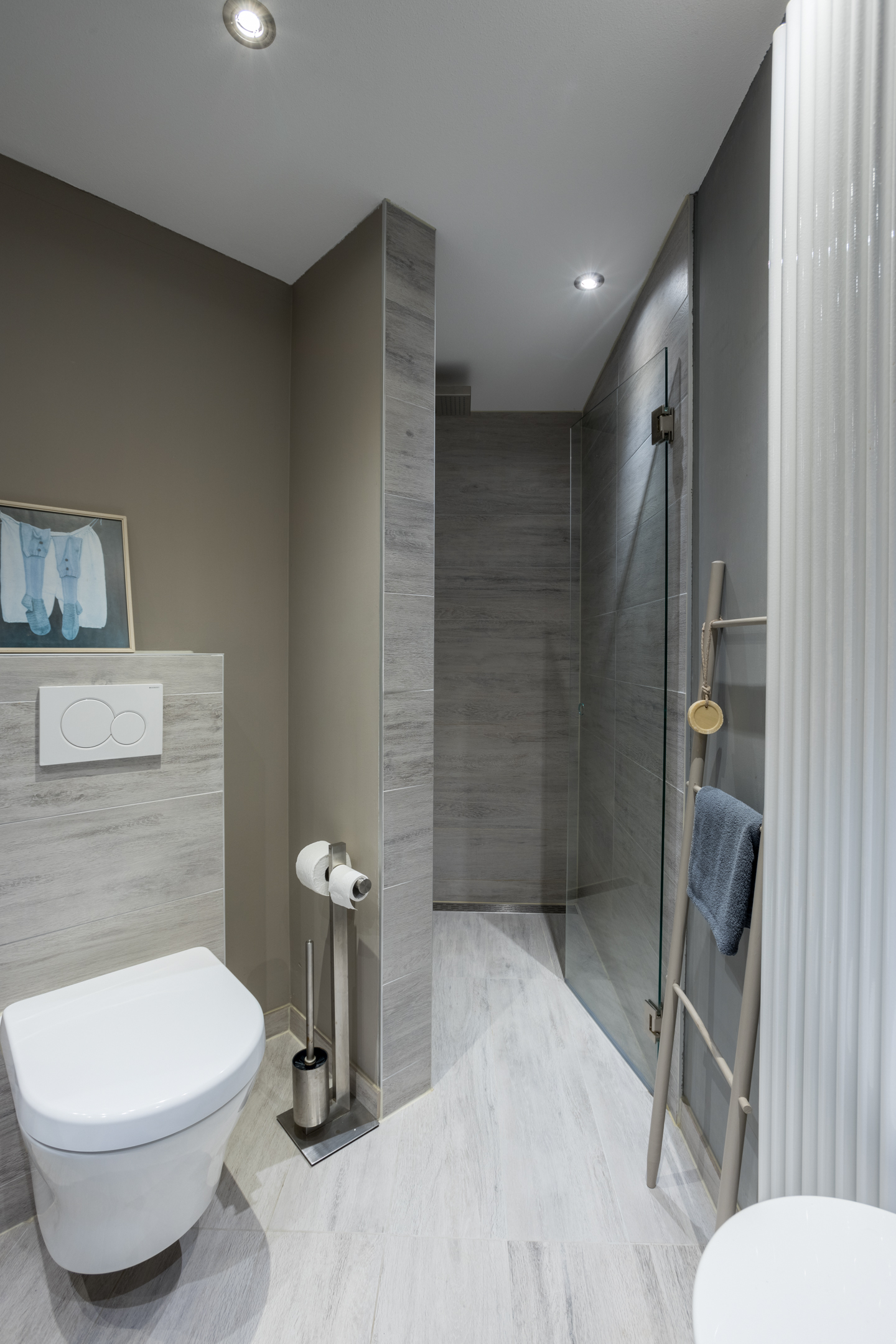 Overloop, 2 slaapkamers en een badkamer met douche, wastafel en toilet.