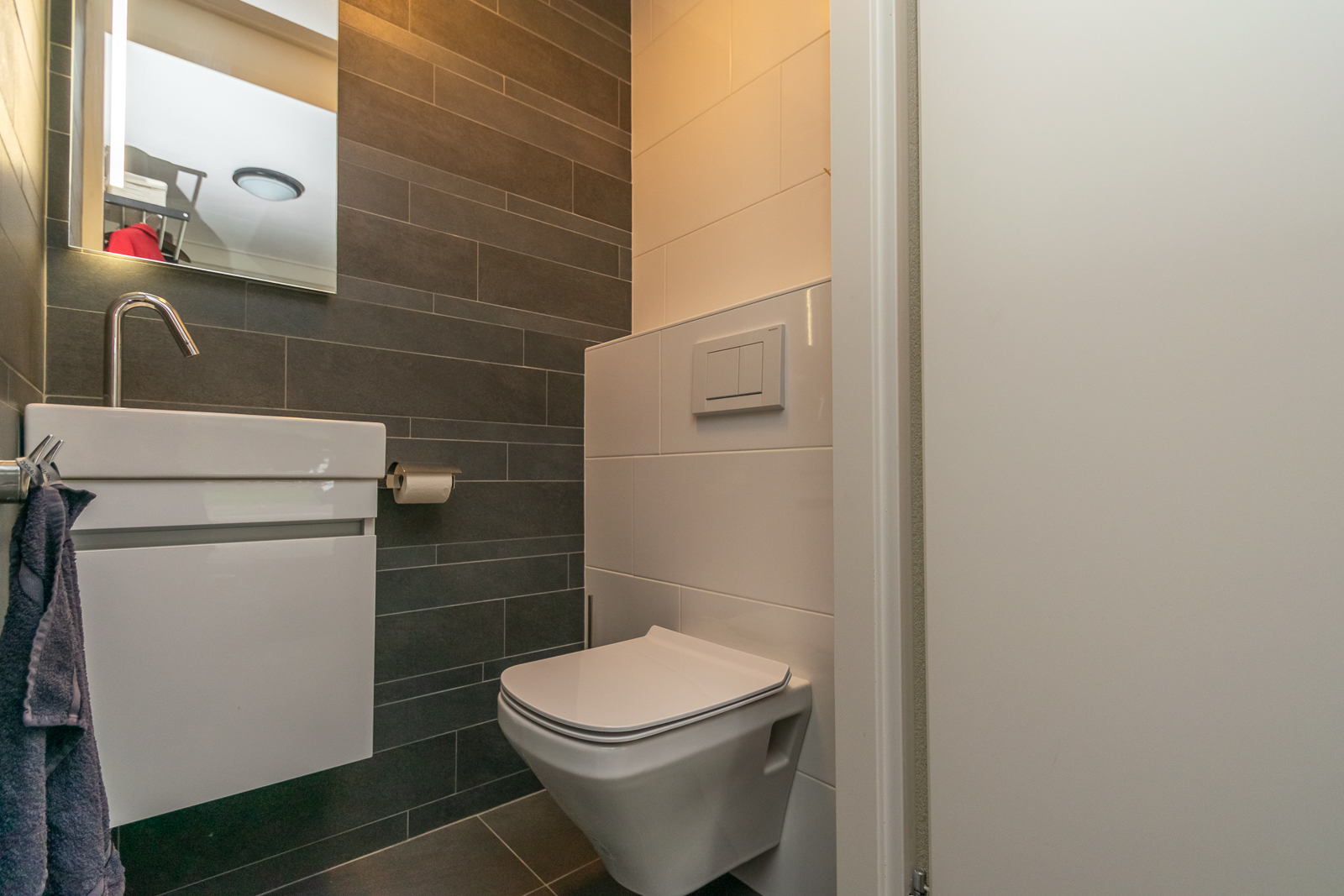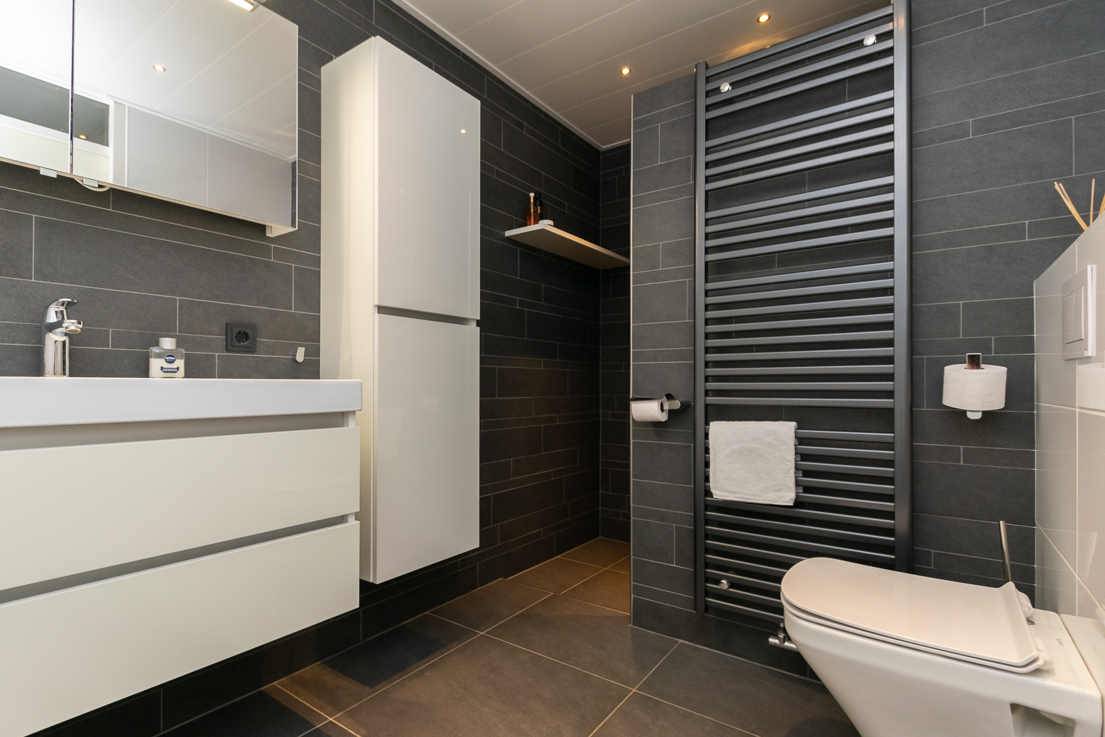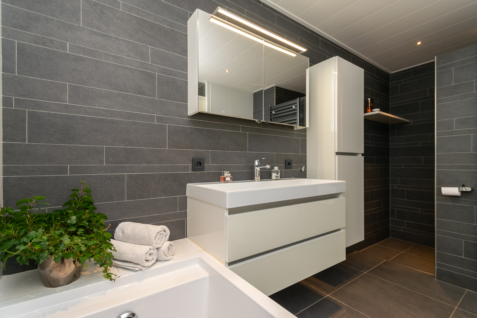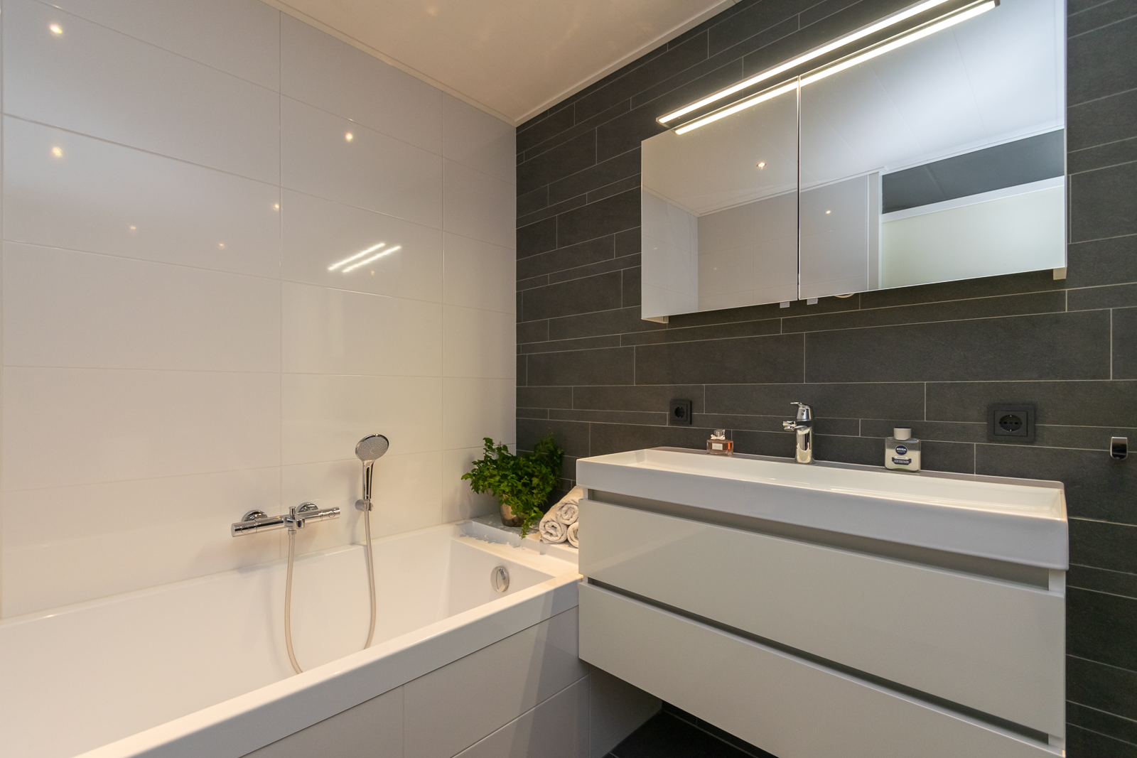 Overloop, 3 slaapkamers waarvan de ouderslaapkamer met een inloopkast en een royale vernieuwde badkamer met ligbad, inloopdouche, badkamermeubel en 2e toilet.