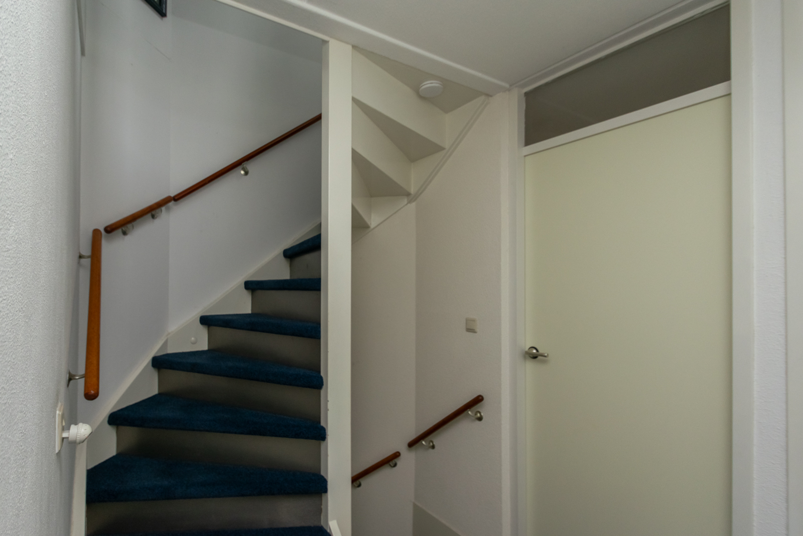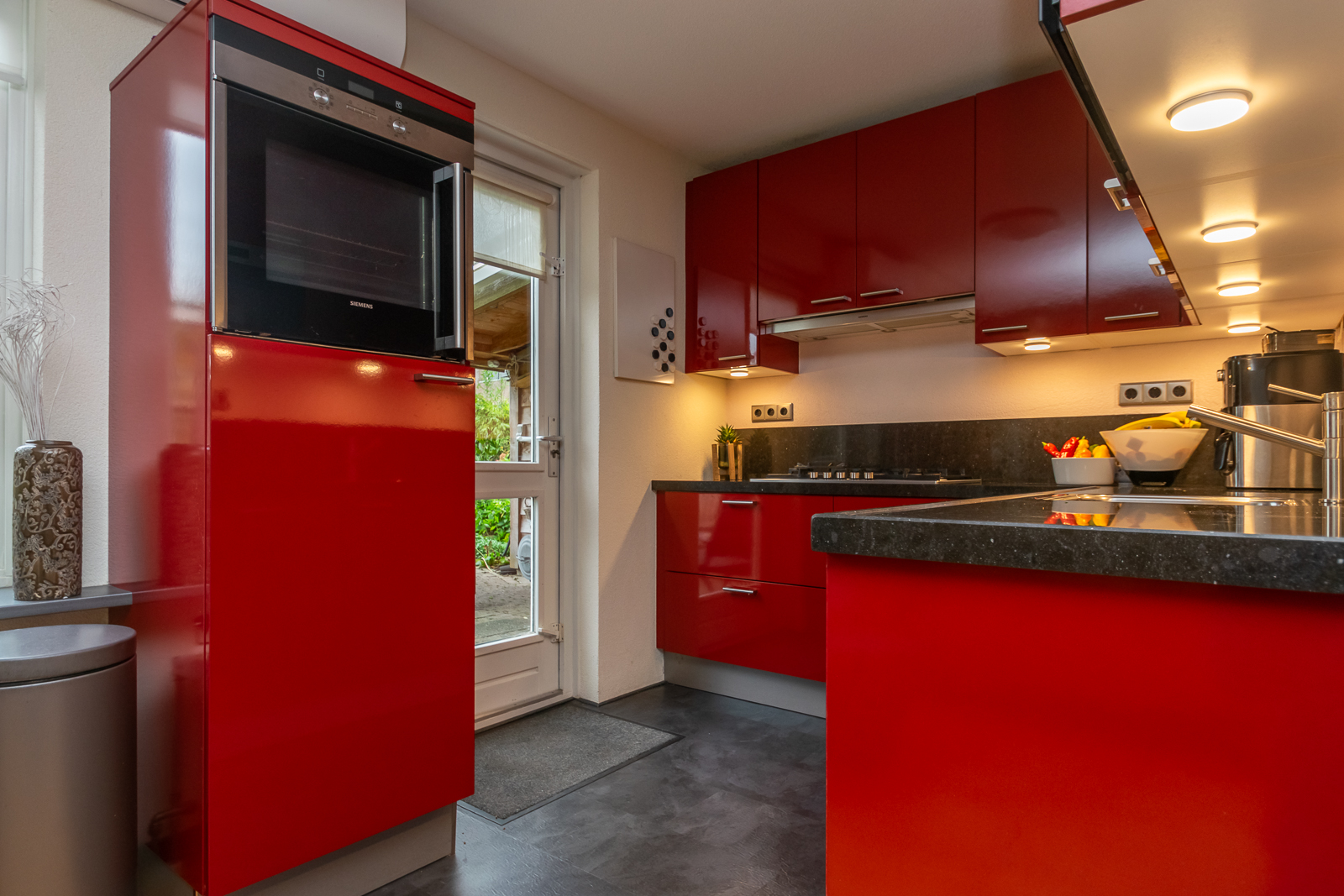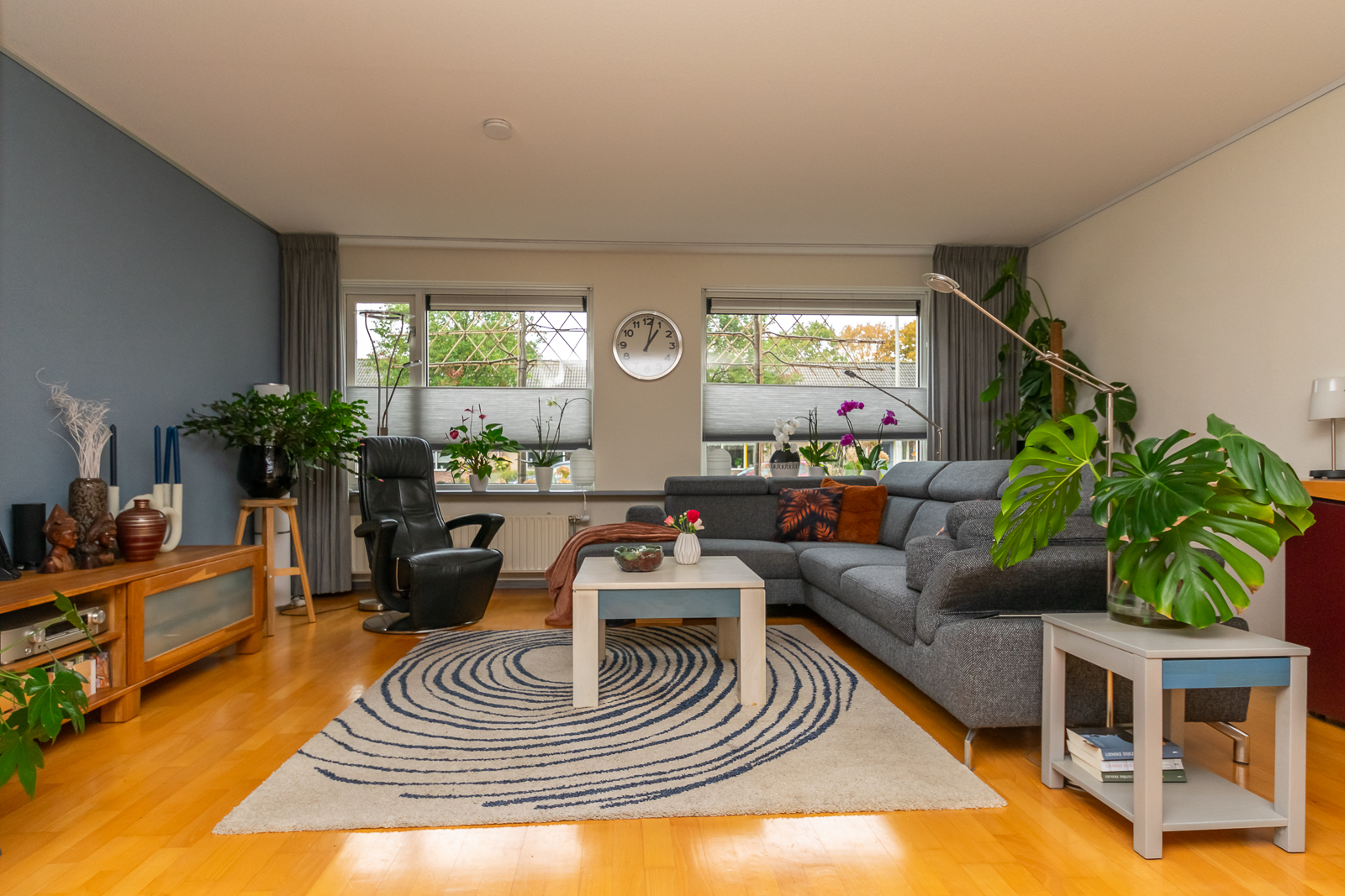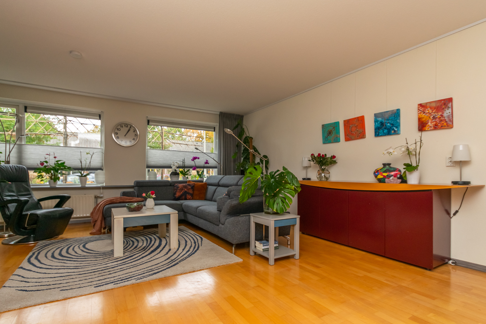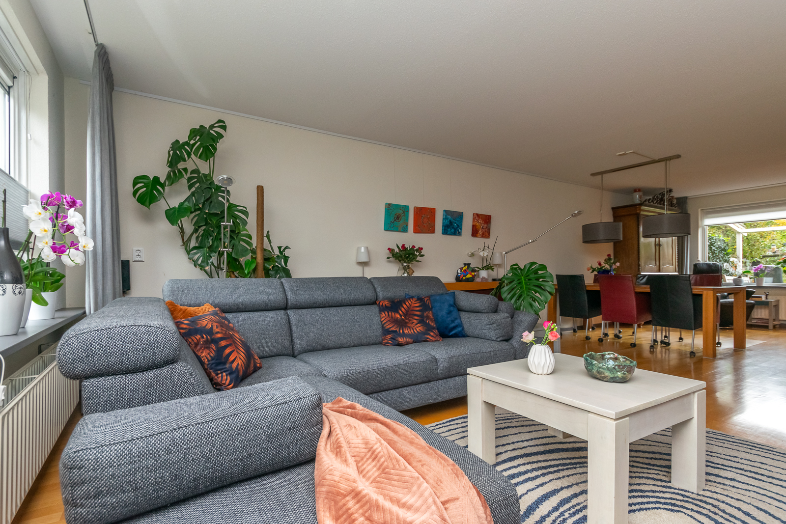 Entree met vernieuwd toilet en doorgang naar de garage met koud en warm stromend water en extra elektragroep. Zeer ruime woonkamer met trapkast, beuken lamellenparket en open keuken (2016) met alle wenselijke inbouwapparatuur van Siemens en een composietblad.
