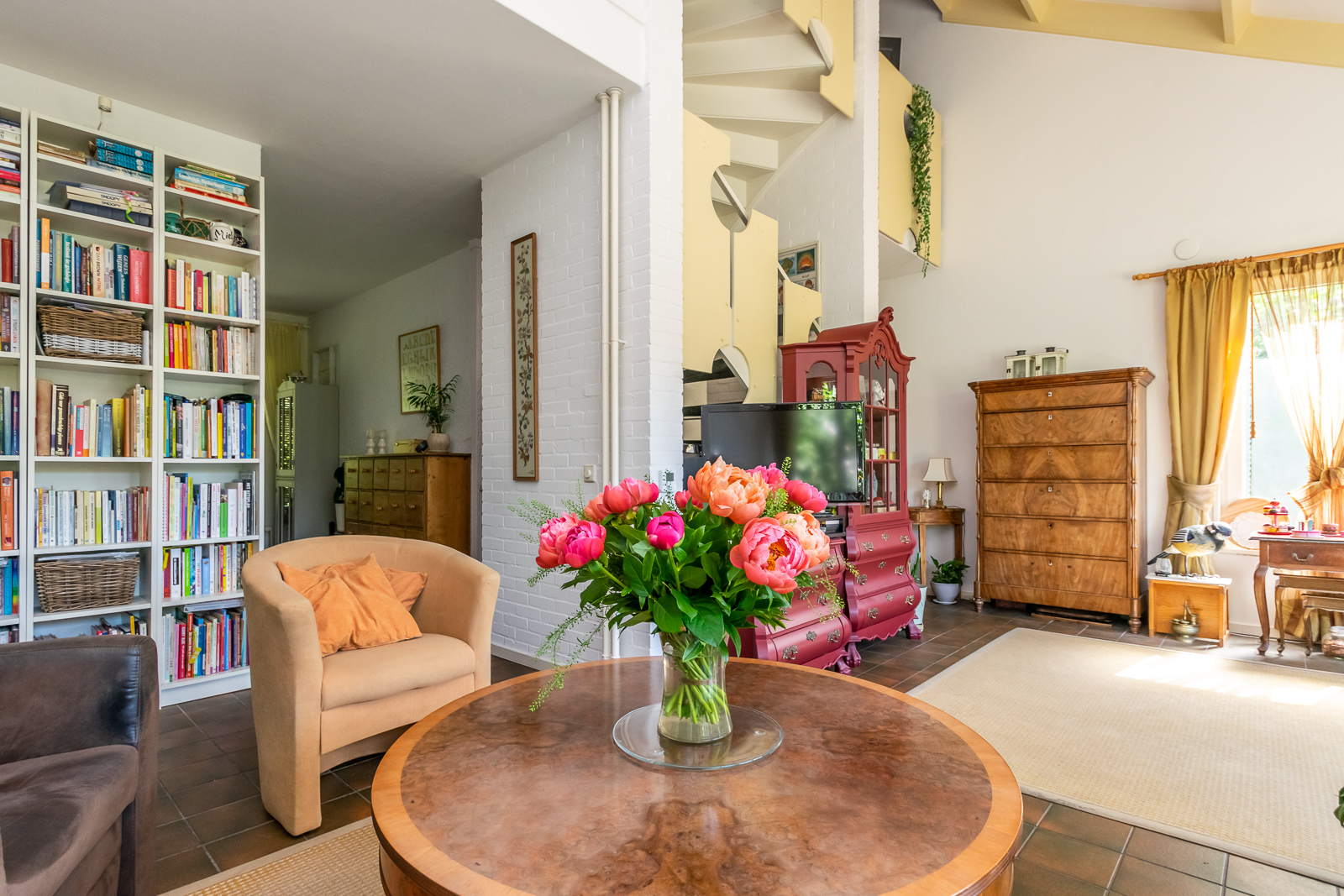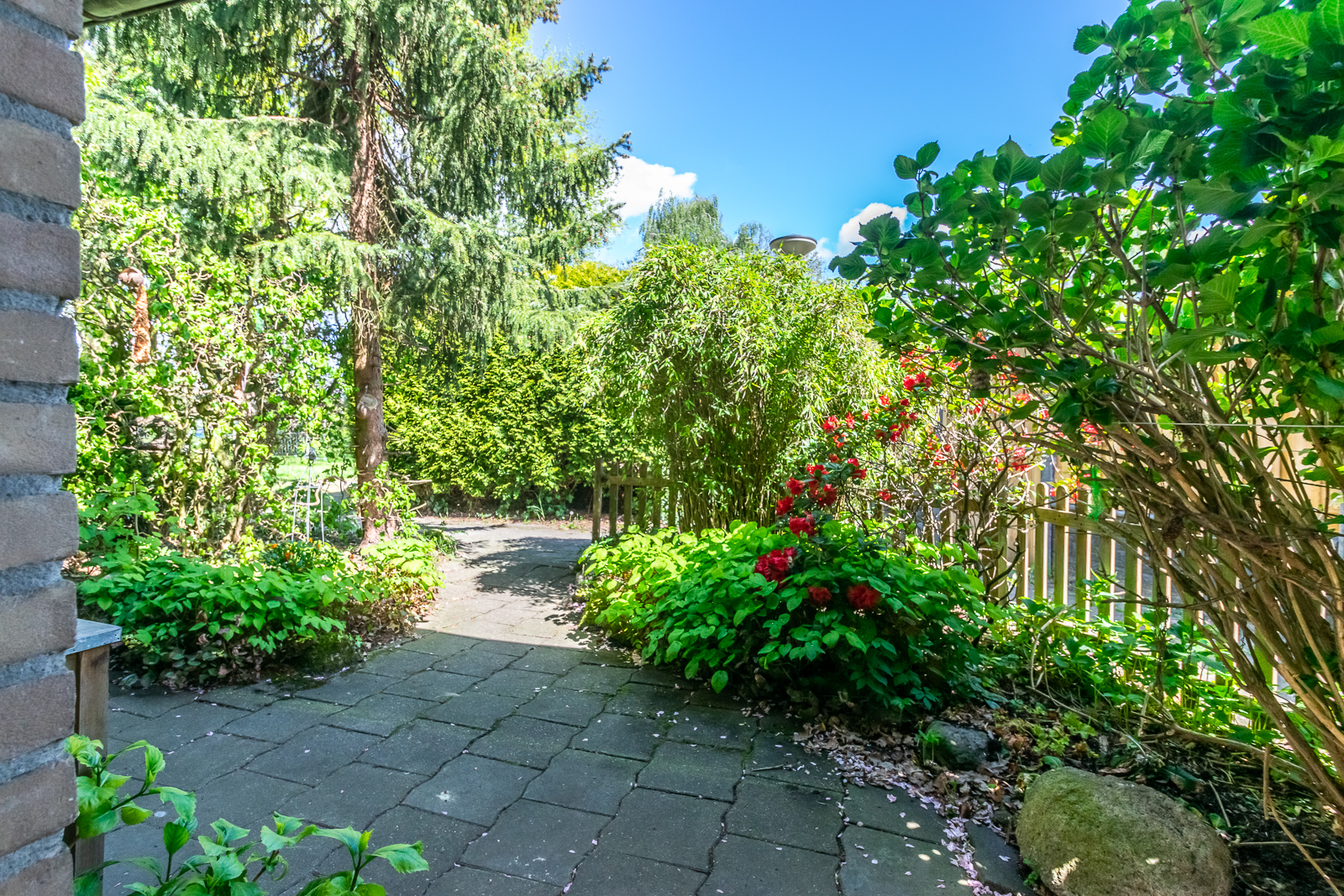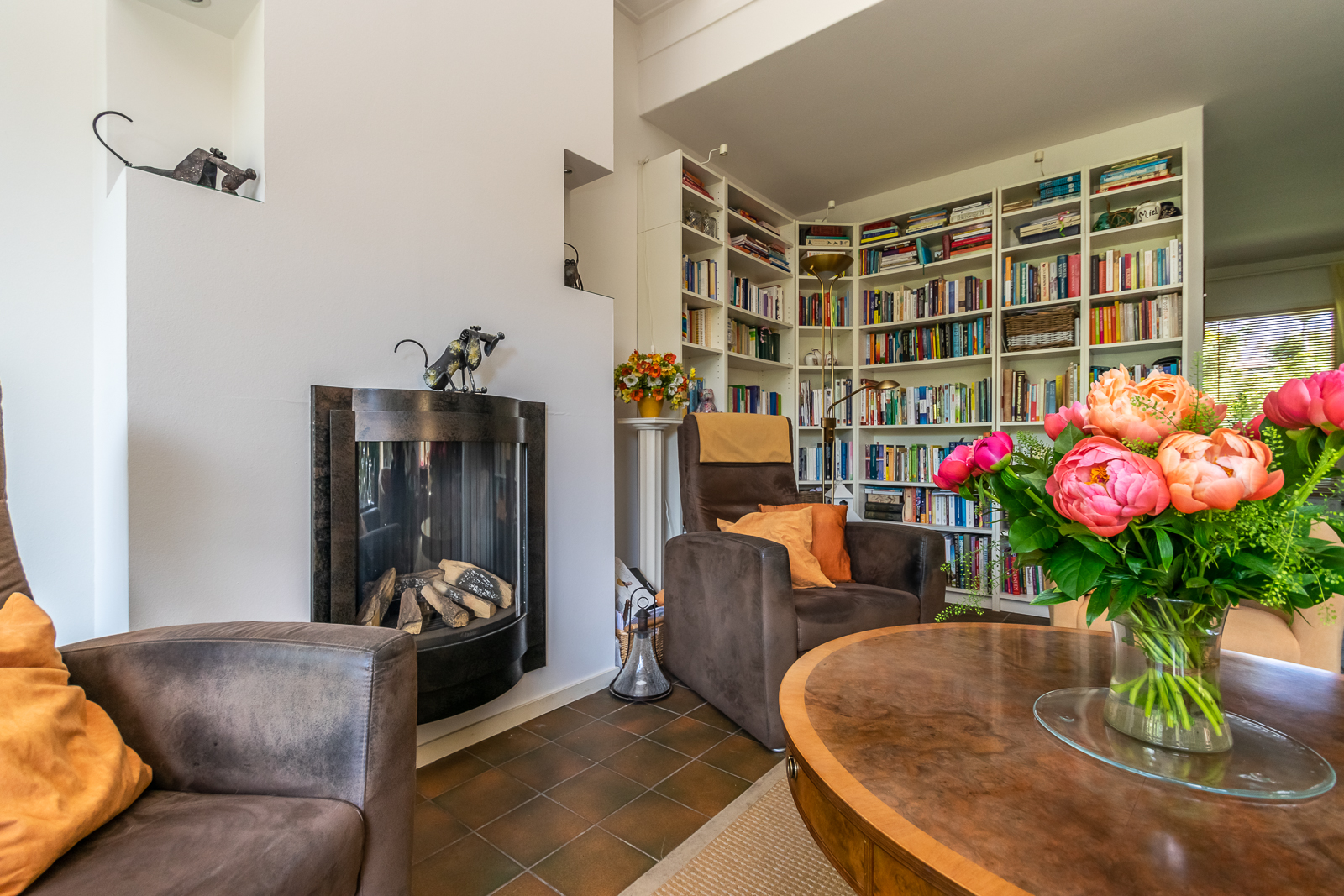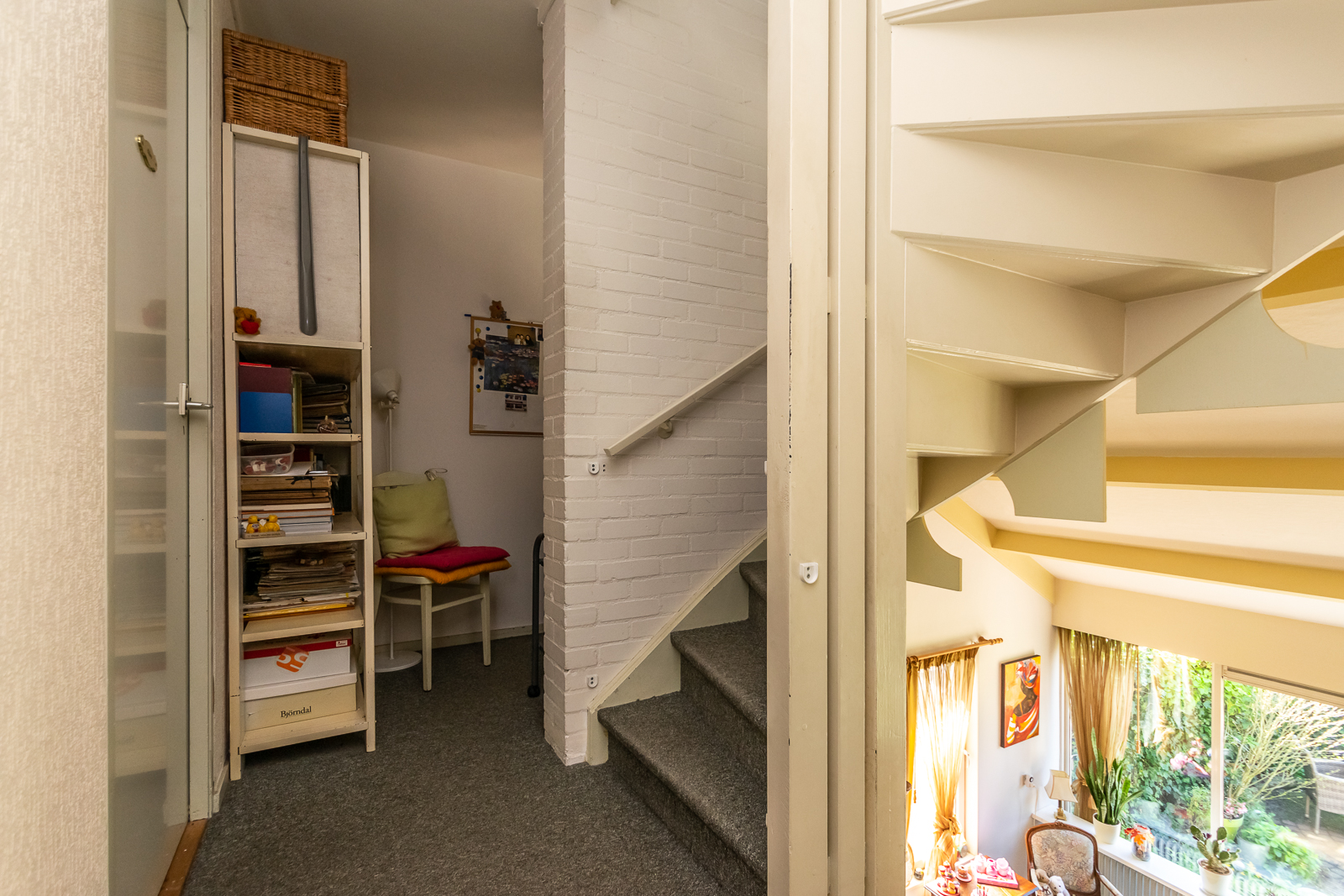 Hal, entree met toilet, meterkast, wasruimte, tuingerichte woonkamer met speelse trapopgang en hobbyhoek, sfeervolle gashaard en een half open keuken met een keramische kookplaat, oven, keukenboiler, koelkast en diepvries.